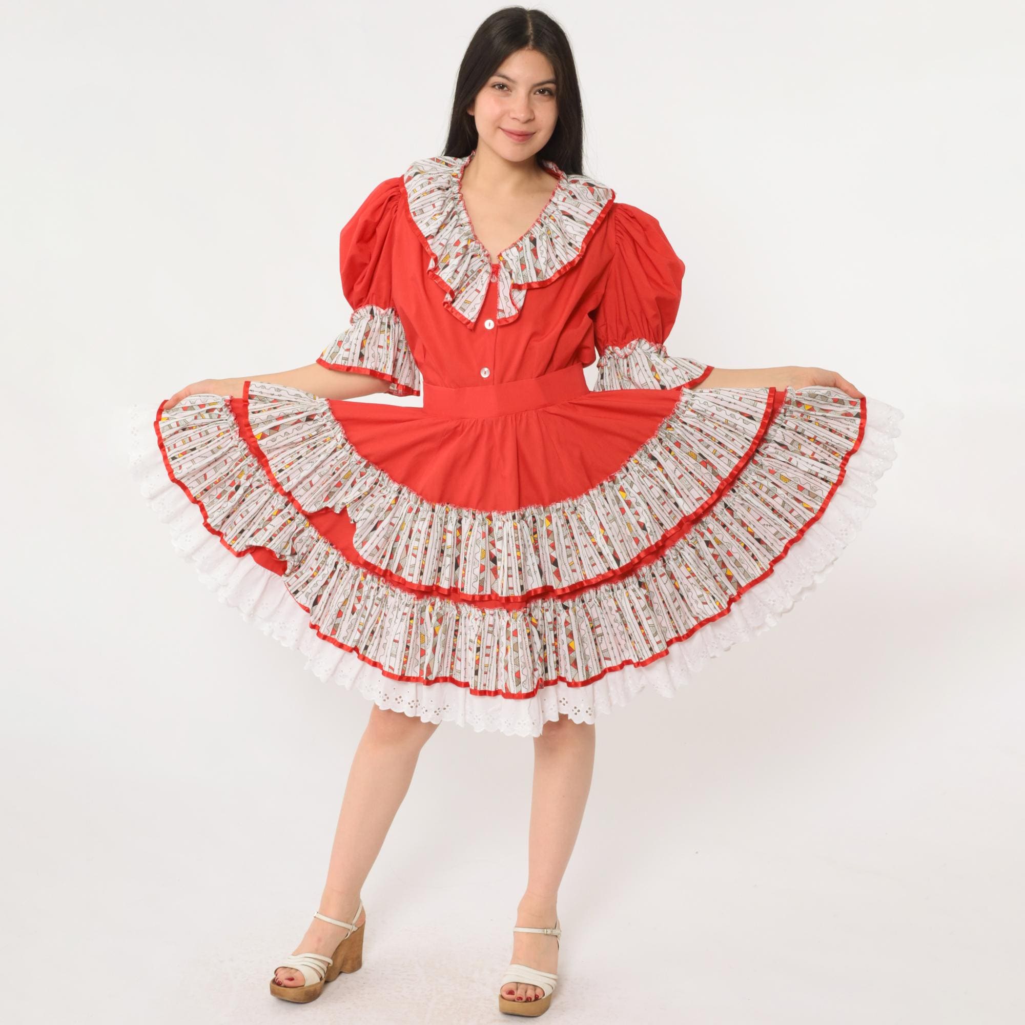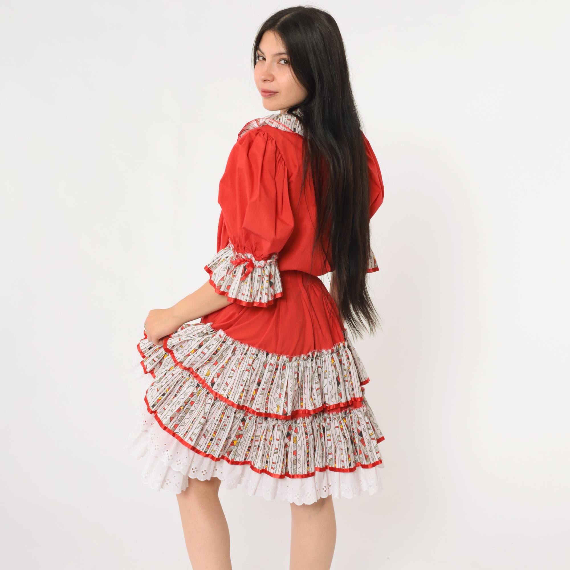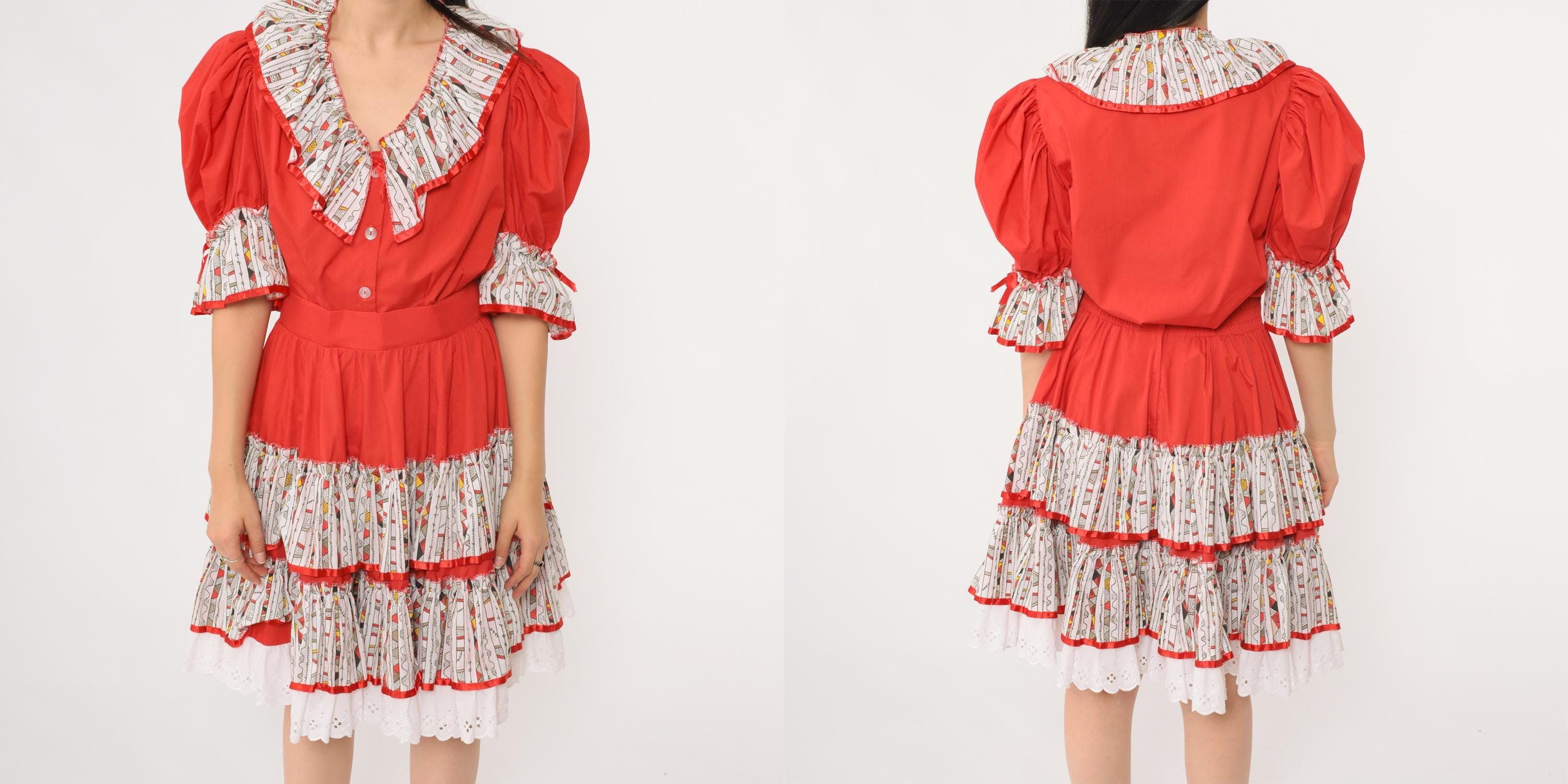 Vintage 80s two piece set featuring a bold red puff sleeve top and matching full skirt. The top has a deep ruffle collar with button front closure, elastic sleeve cuffs, and contrast ruffle trim in a white geometric printed fabric. The matching skirt has a full tiered silhouette with layers of ruffled trim in the same contrast print, finished with white eyelet lace at the hem. Includes a fitted waistband and side zip closure.