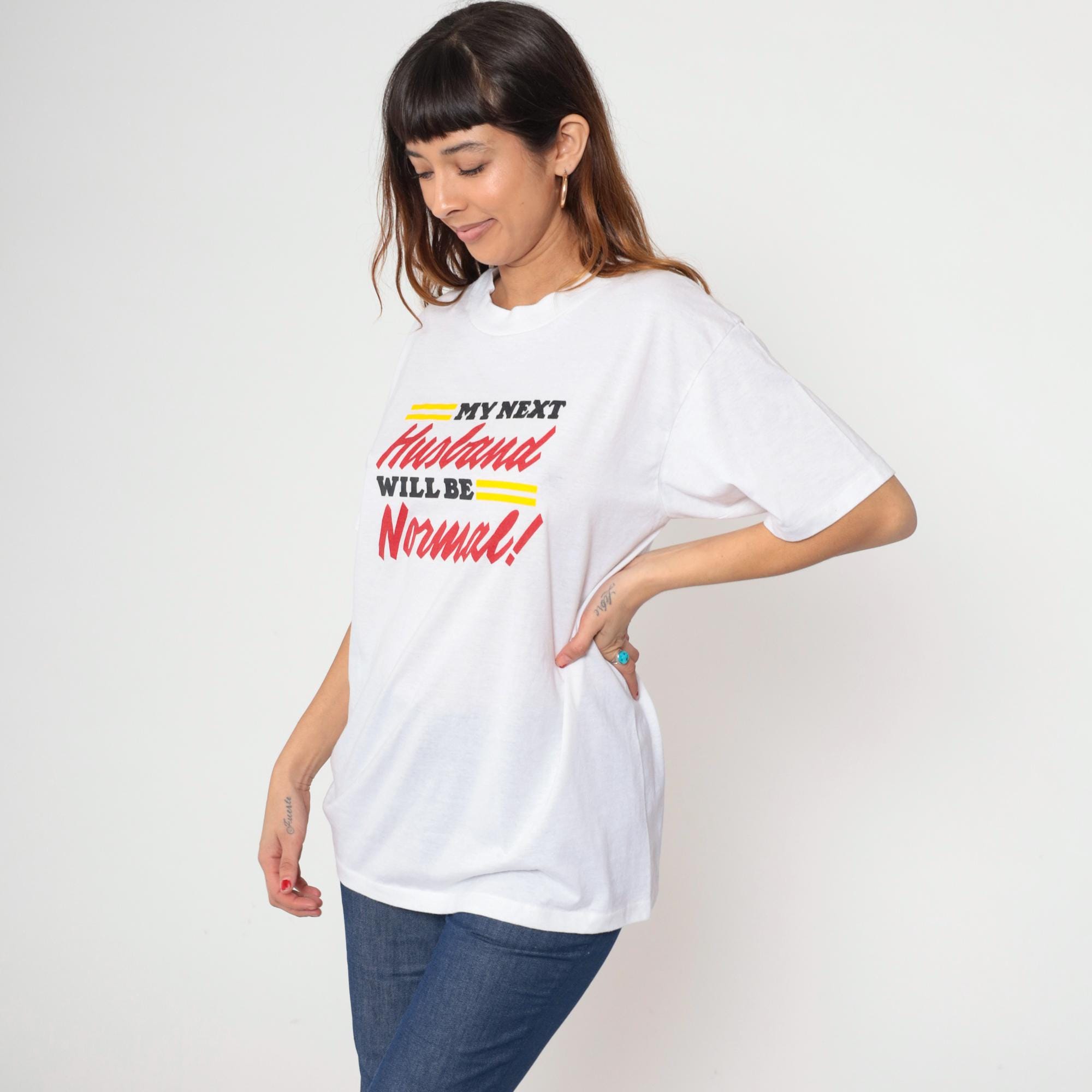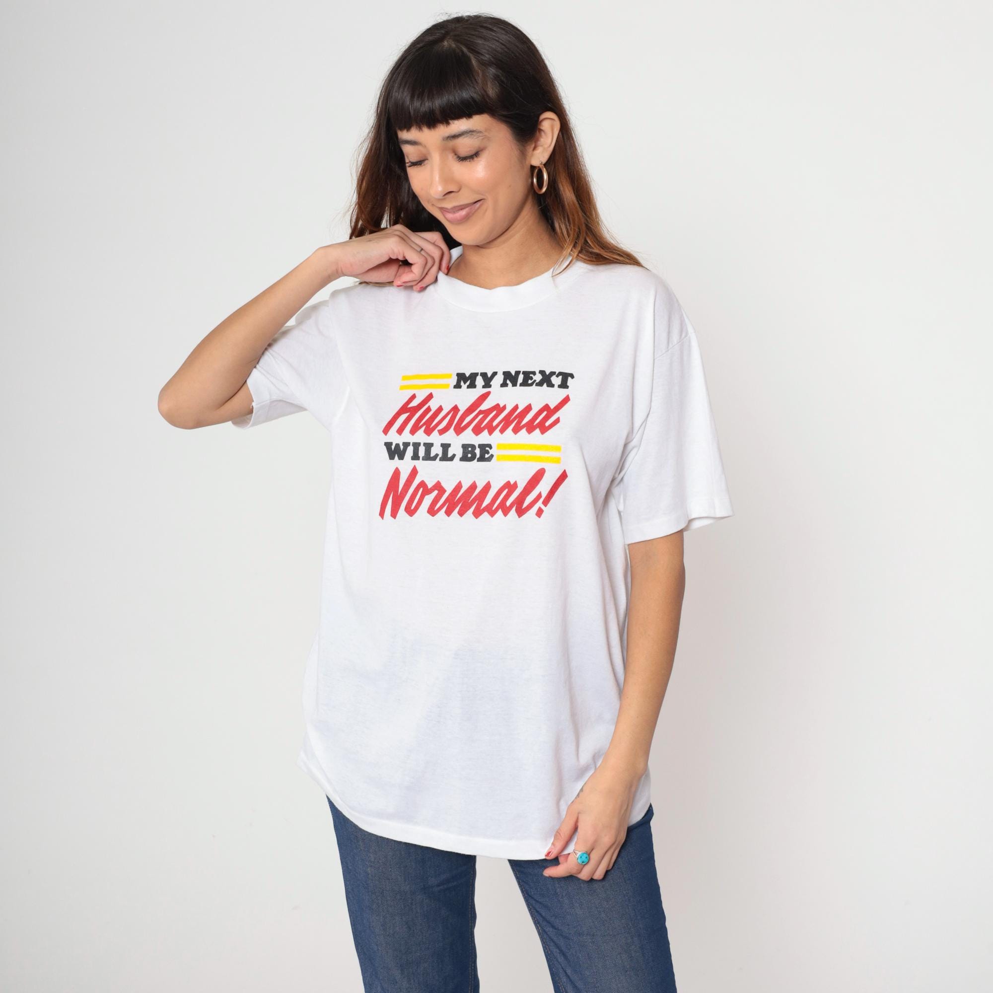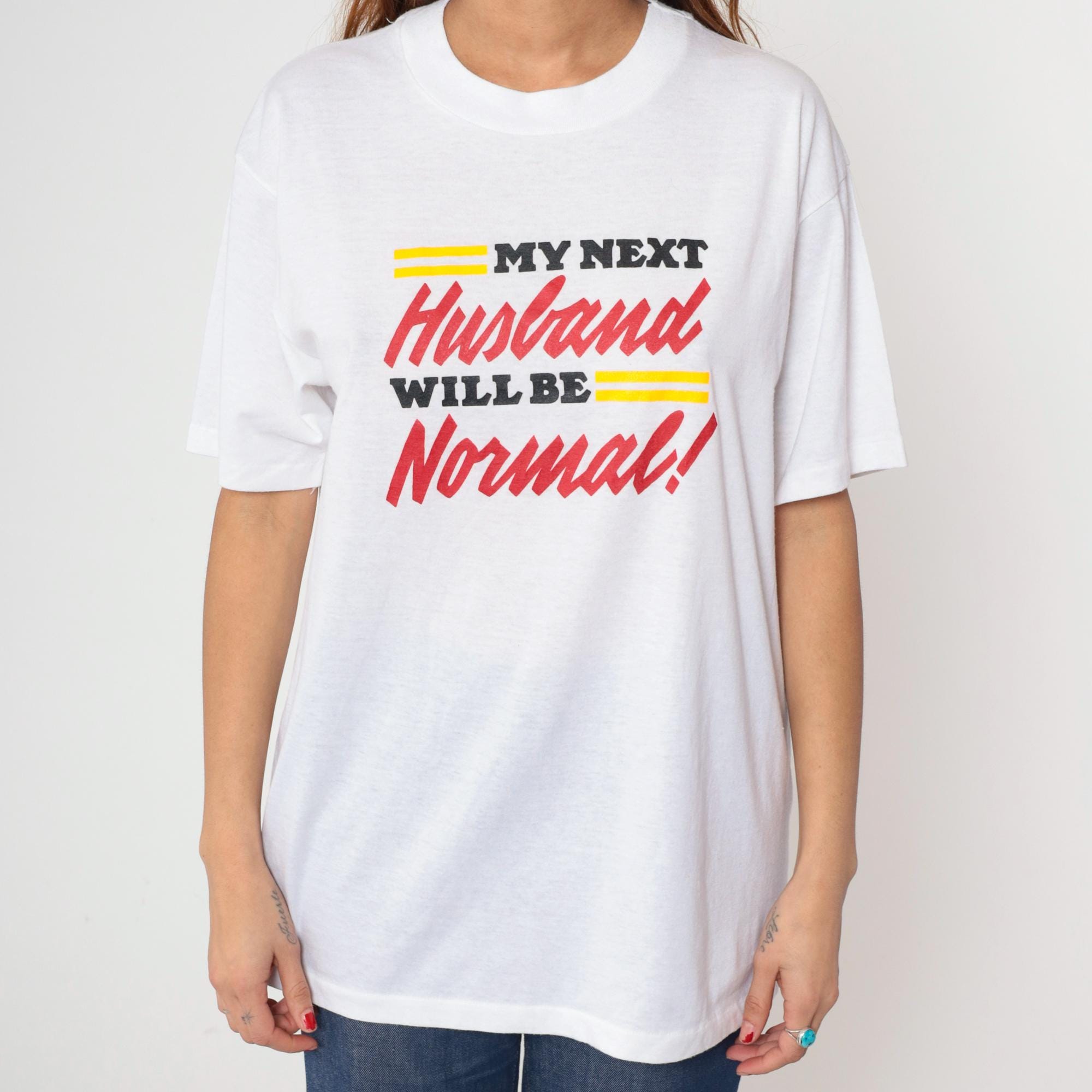White cotton blend t-shirt featuring bold red and yellow graphic that reads "MY NEXT HUSBAND WILL BE NORMAL!" Oversized, relaxed fit with crew neck and short sleeves.