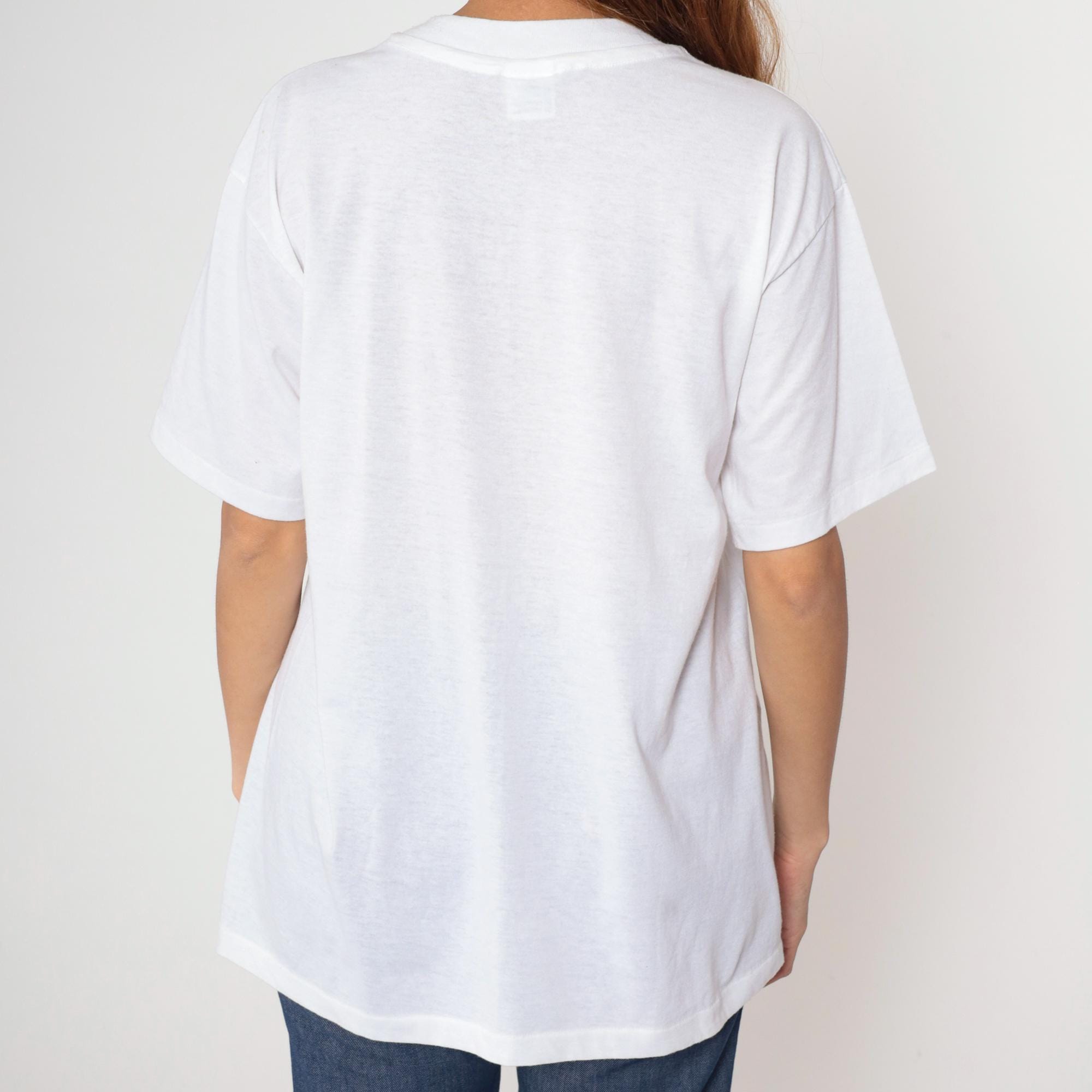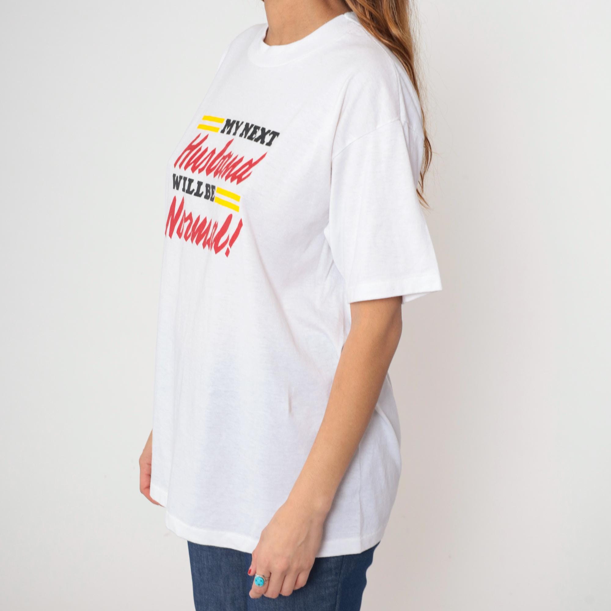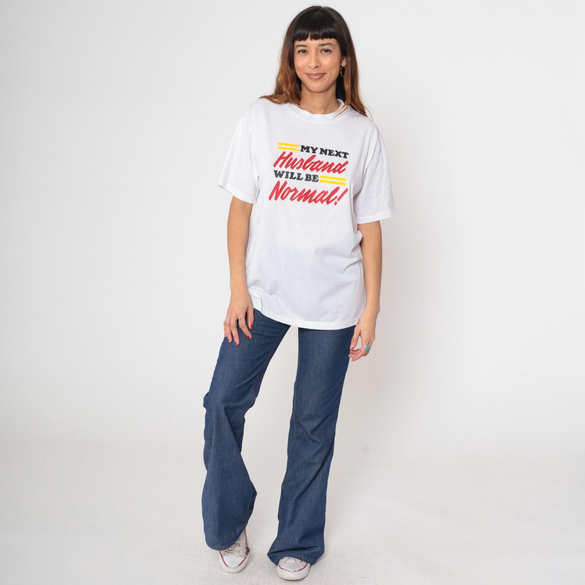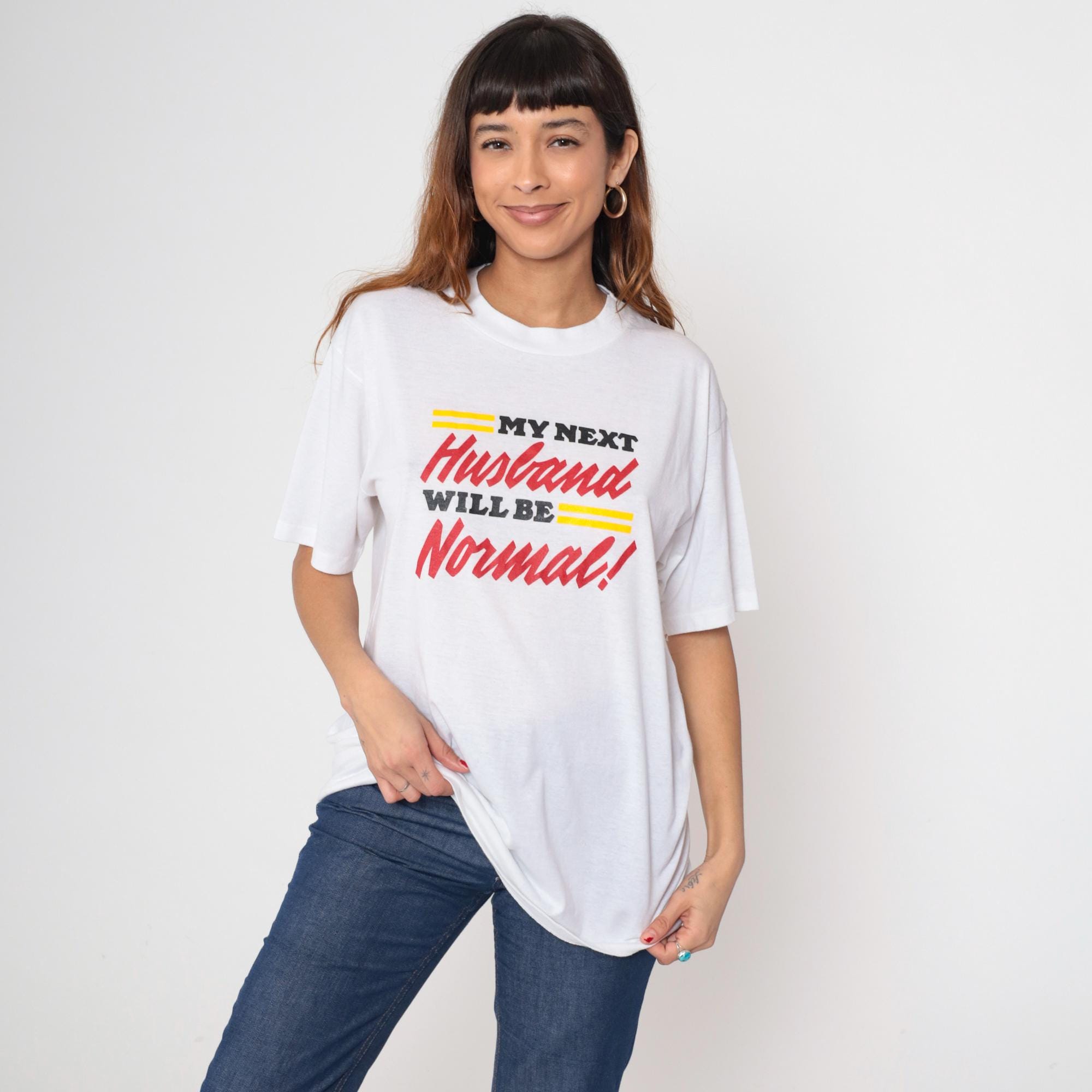 White cotton blend t-shirt featuring bold red and yellow graphic that reads "MY NEXT HUSBAND WILL BE NORMAL!" Oversized, relaxed fit with crew neck and short sleeves.
