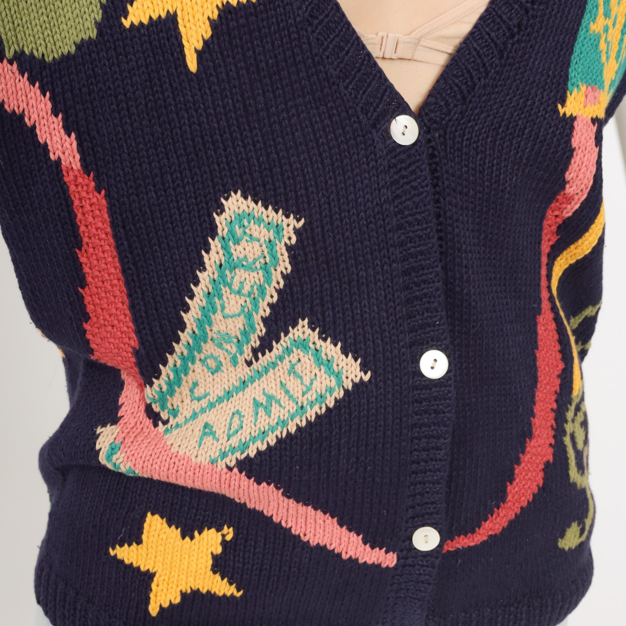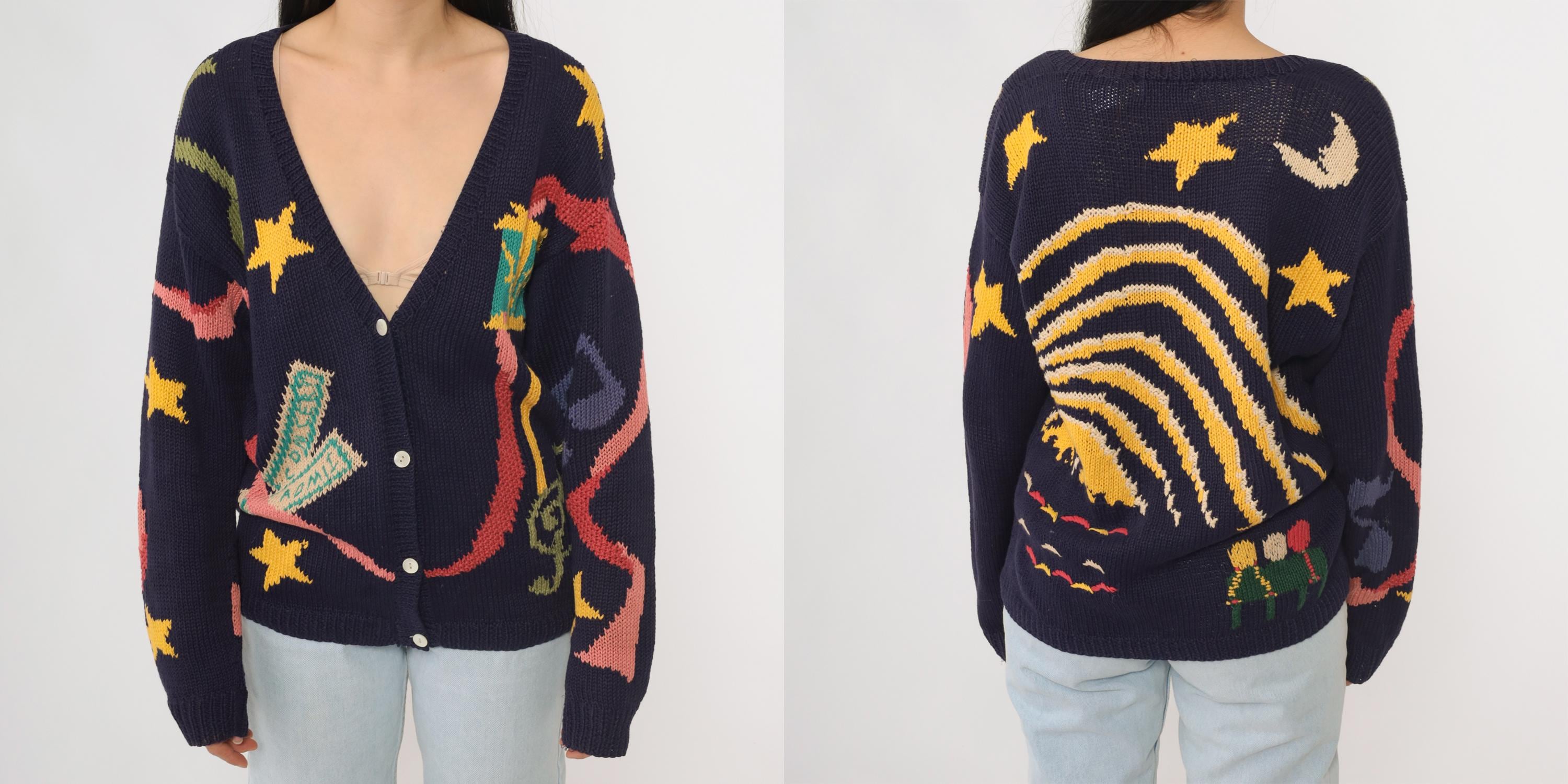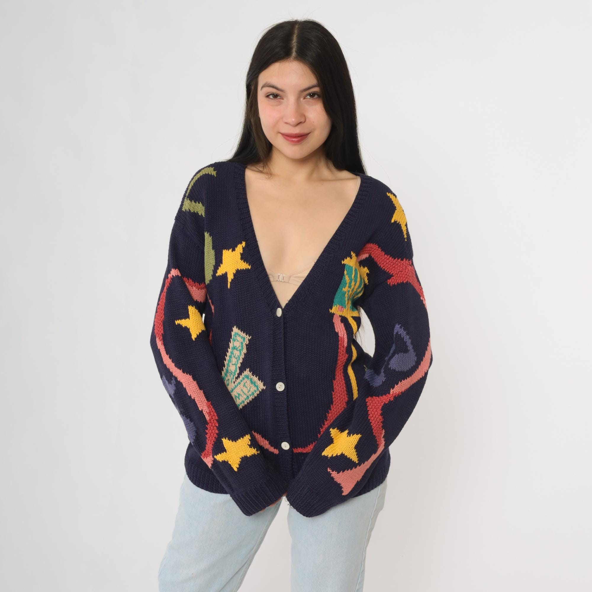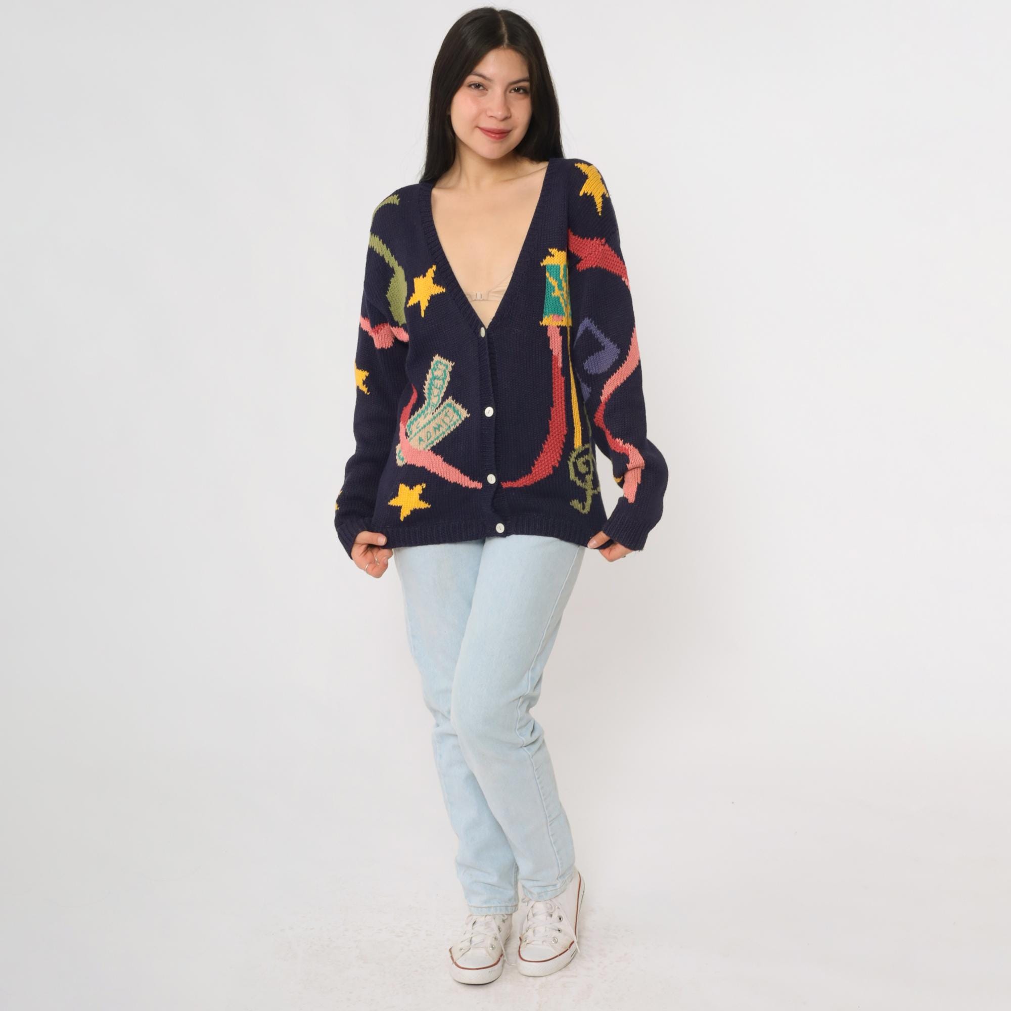Vintage 90s Carroll Reed navy blue cardigan sweater featuring a bold abstract knit pattern with stars, musical notes, cosmic motifs, and colorful designs in red, yellow, and green. Constructed from a ramie and cotton blend, this sweater has a button front closure, long sleeves, and a relaxed fit.