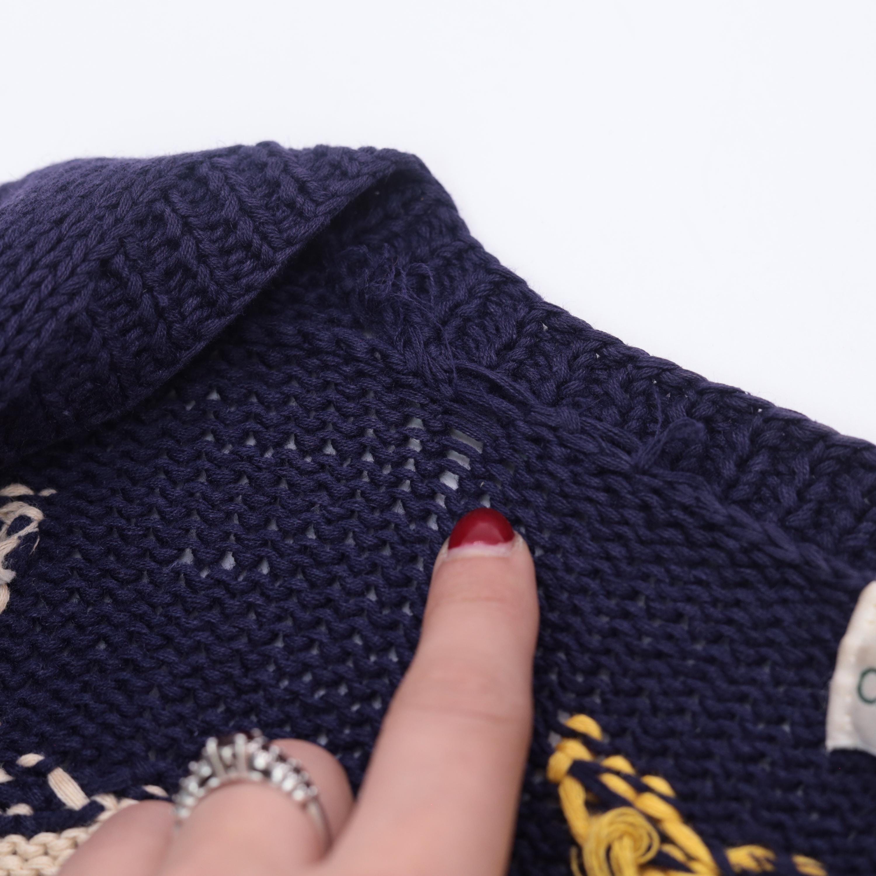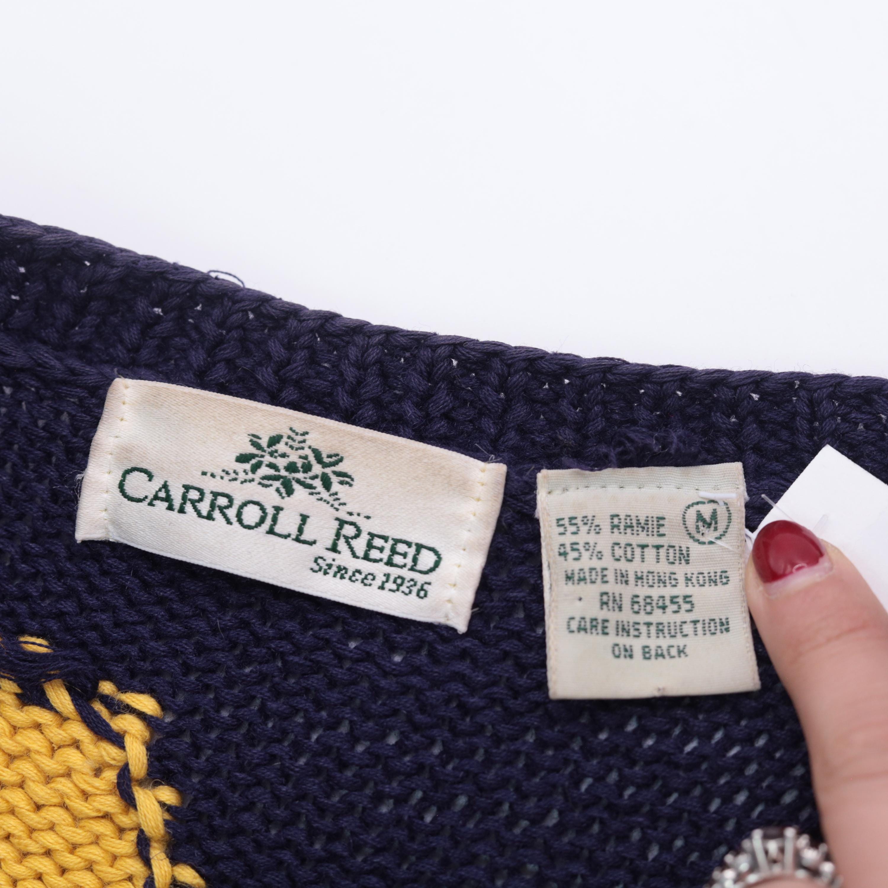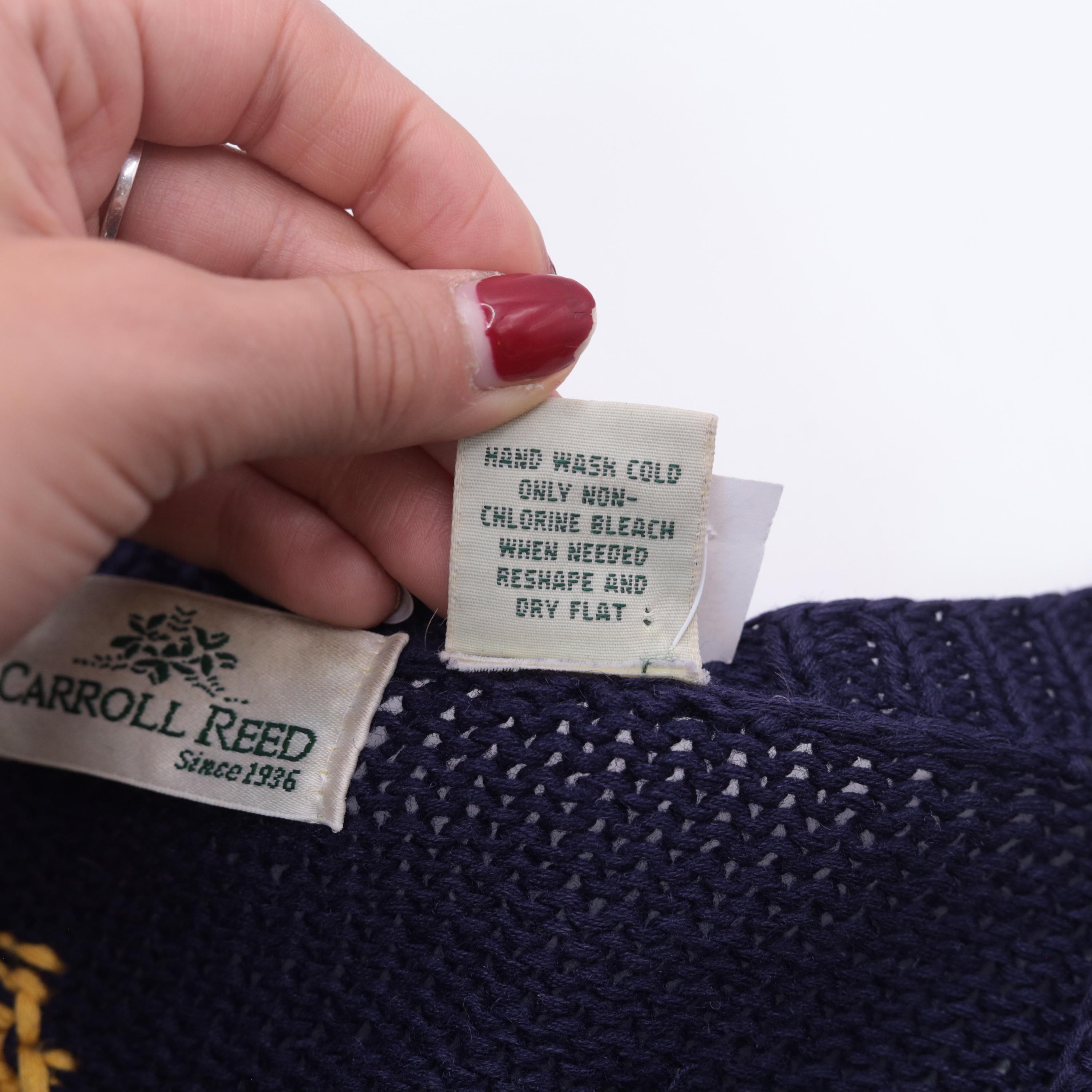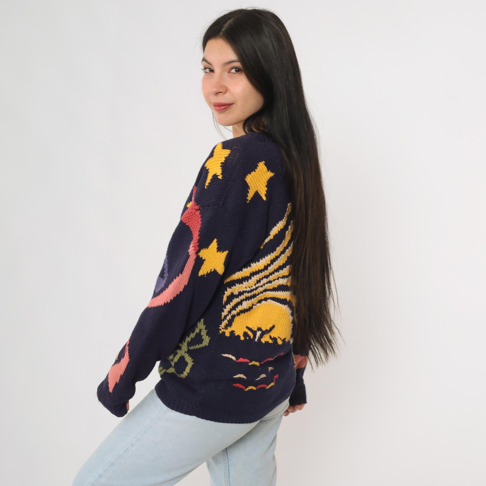 Vintage 90s Carroll Reed navy blue cardigan sweater featuring a bold abstract knit pattern with stars, musical notes, cosmic motifs, and colorful designs in red, yellow, and green. Constructed from a ramie and cotton blend, this sweater has a button front closure, long sleeves, and a relaxed fit.