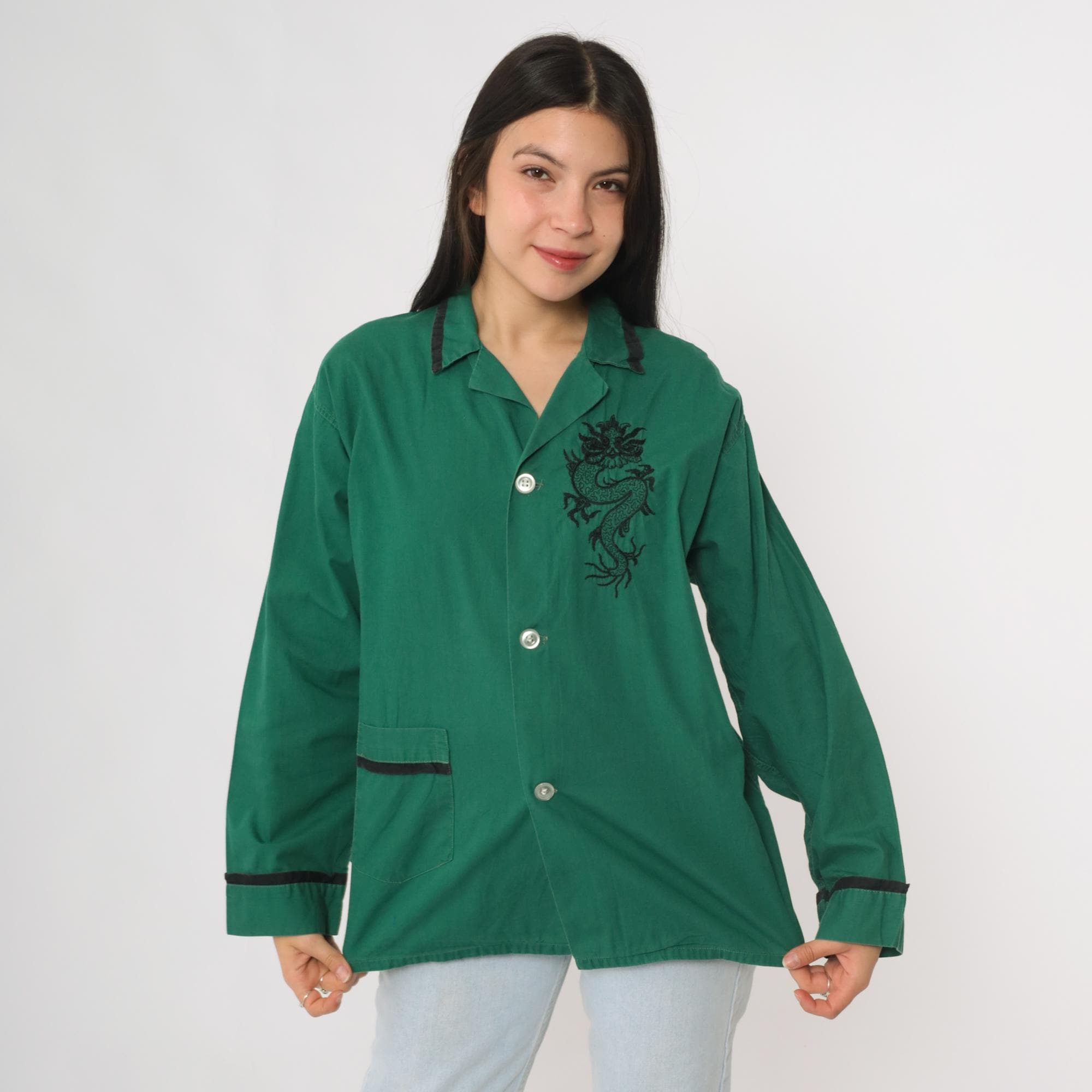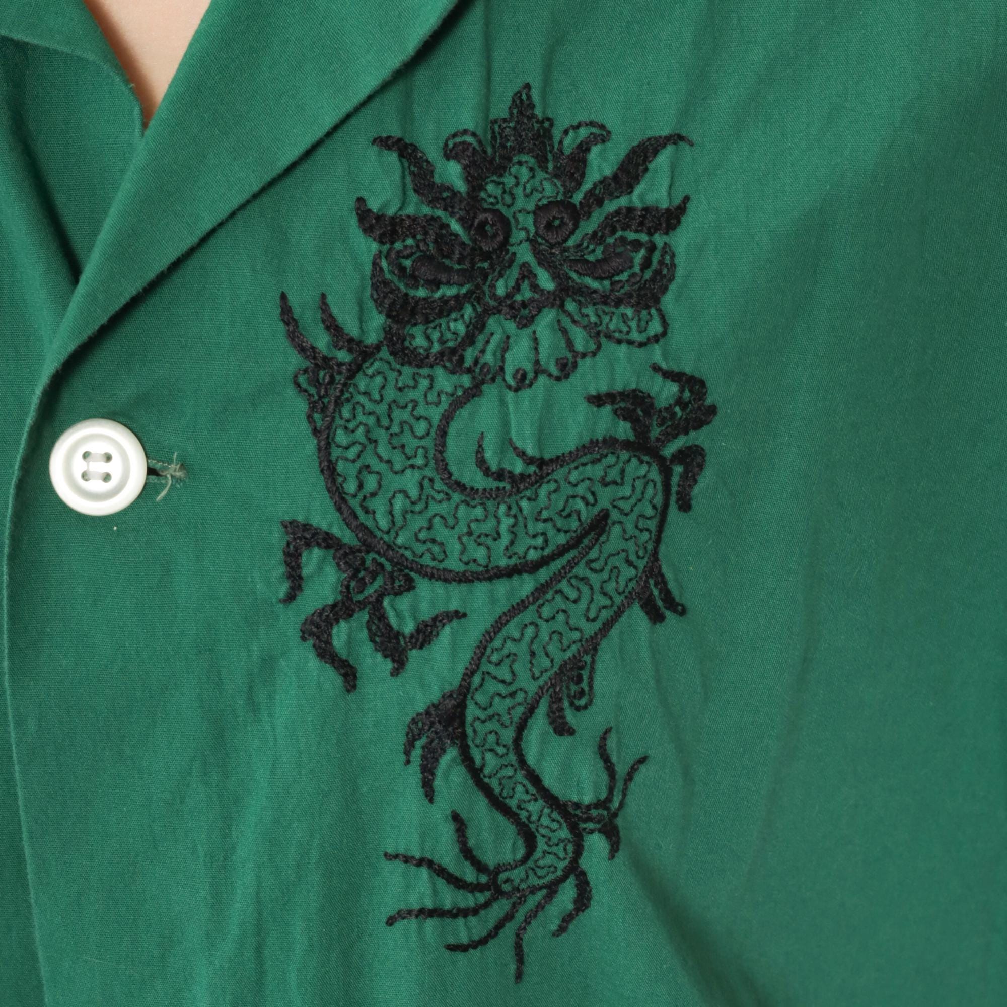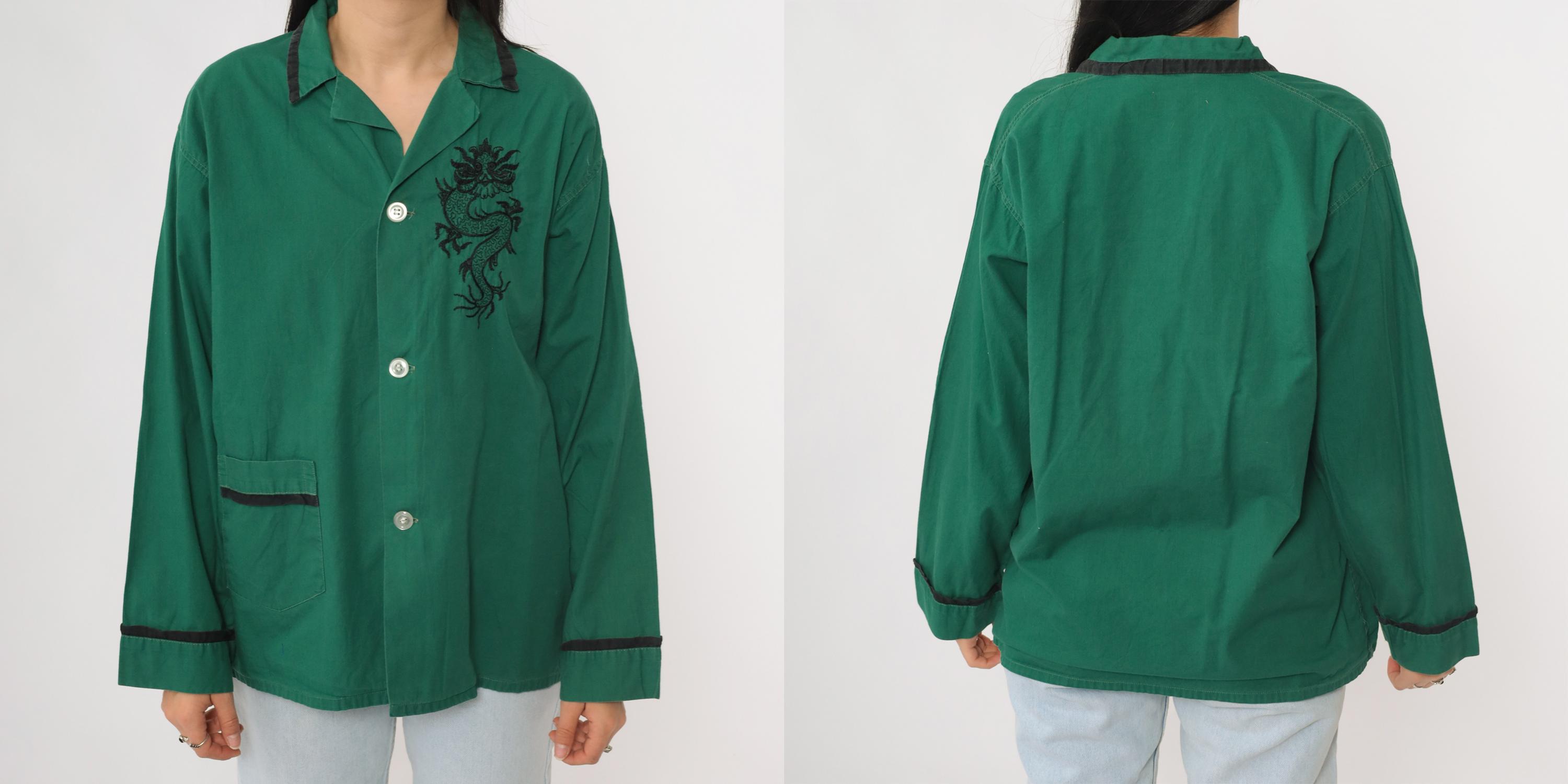 Vintage 70s green cotton button up shirt featuring black embroidered dragon detail on the chest. Designed with a collared neckline, button front, long sleeves, and a single pocket with contrast trim. Finished with matching trim at the cuffs and collar. Lightweight and relaxed fit with a pajama style cut.
