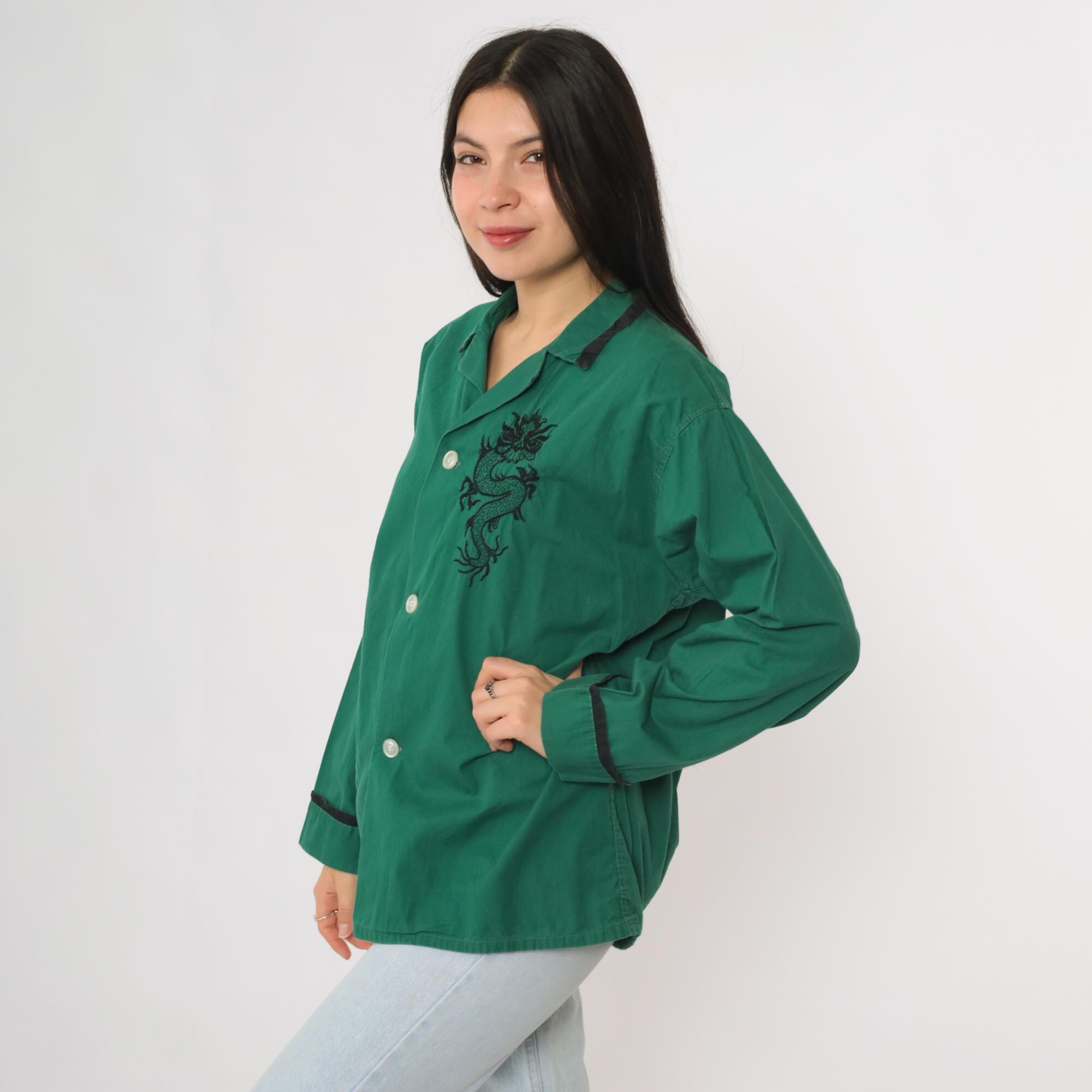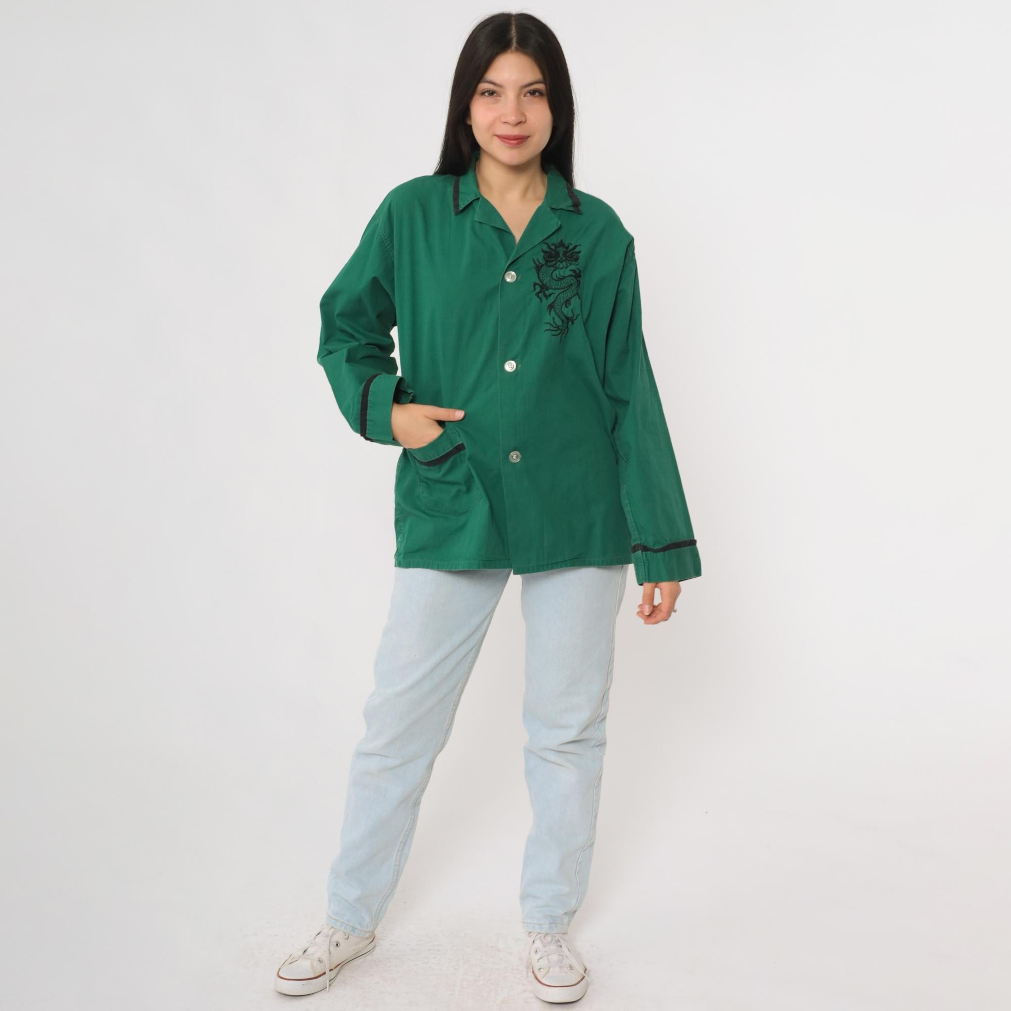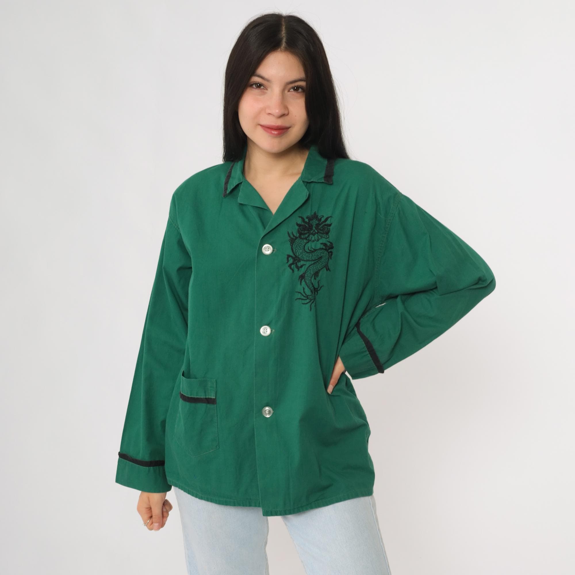 Vintage 70s green cotton button up shirt featuring black embroidered dragon detail on the chest. Designed with a collared neckline, button front, long sleeves, and a single pocket with contrast trim. Finished with matching trim at the cuffs and collar. Lightweight and relaxed fit with a pajama style cut.