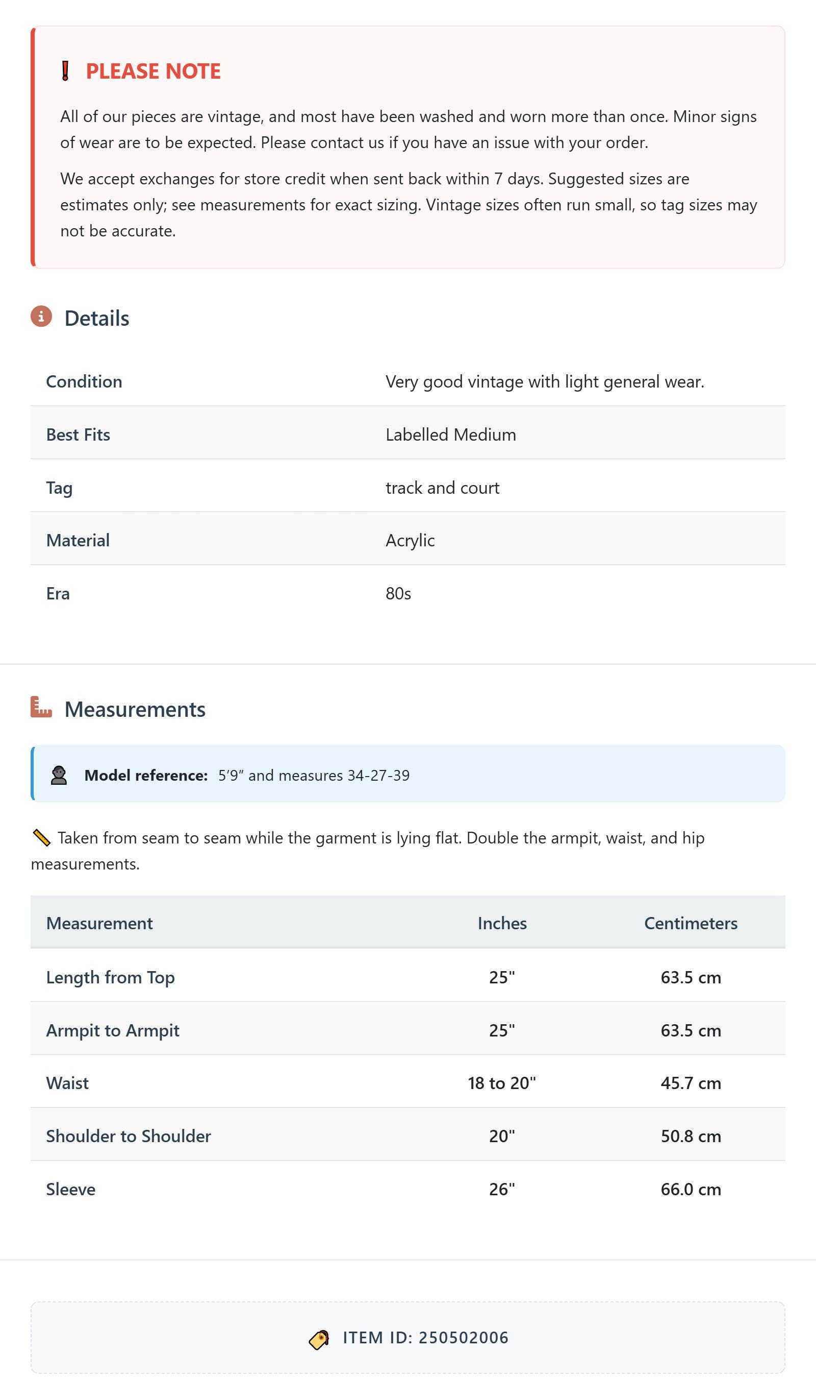 All of our pieces are vintage, and most have been washed and worn more than once. Minor signs of wear are to be expected. Please contact us if you have an issue with your order. We accept exchanges for store credit when sent back within 7 days.