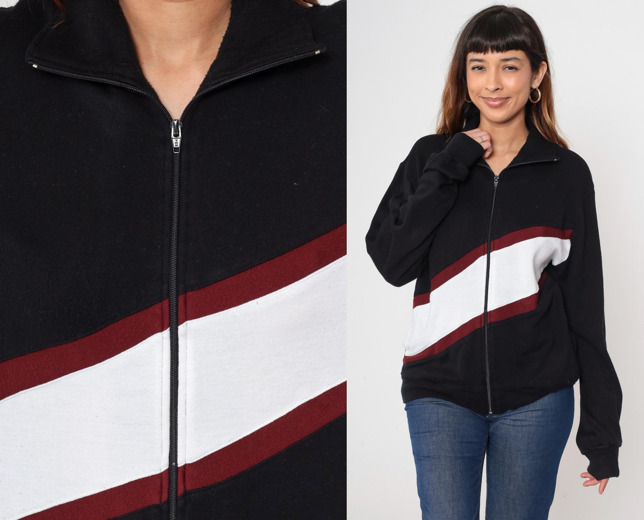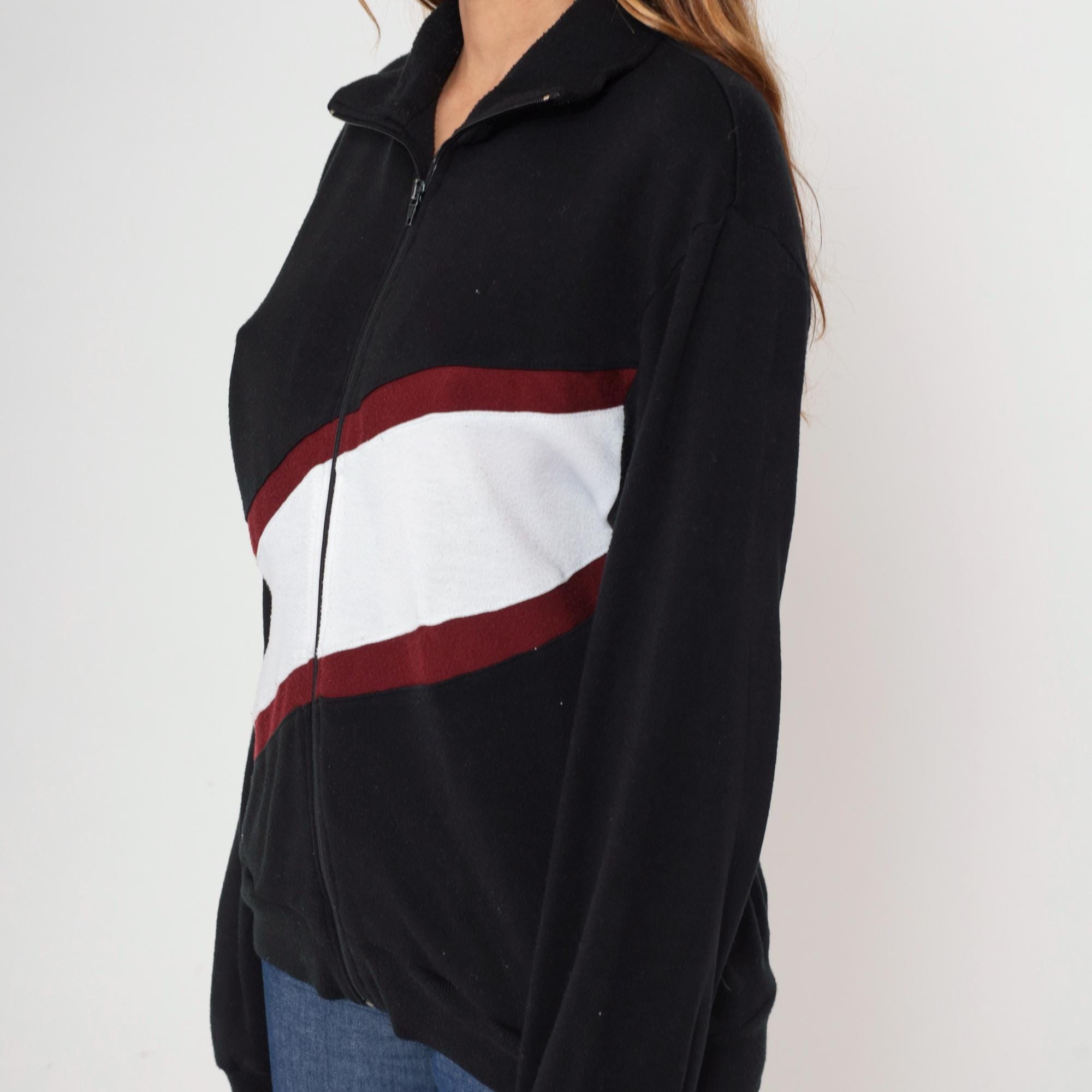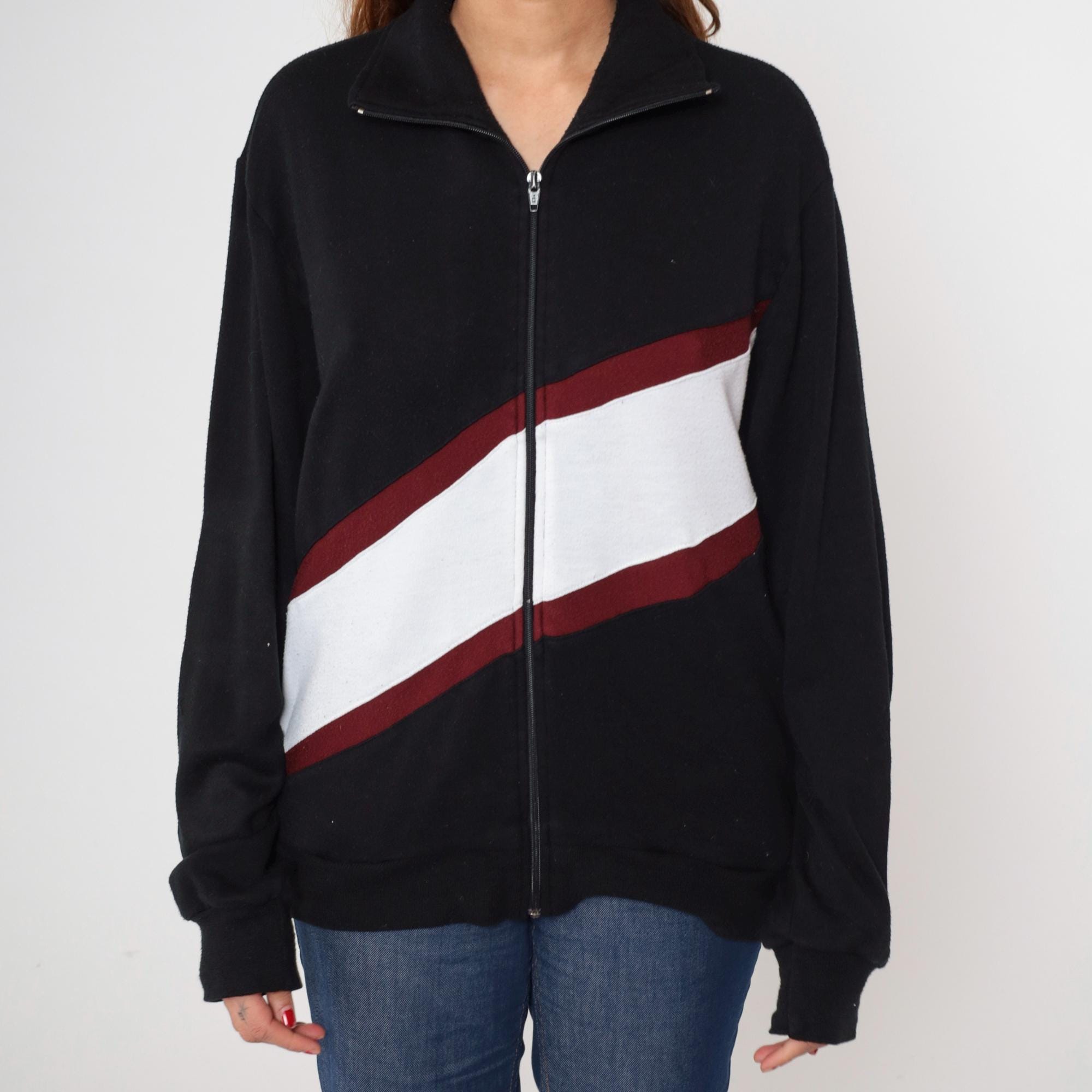 Black acrylic track jacket featuring bold red and white diagonal color block design across the front. Full zip front with mock neck collar and ribbed cuffs/waistband. Track and Court brand.