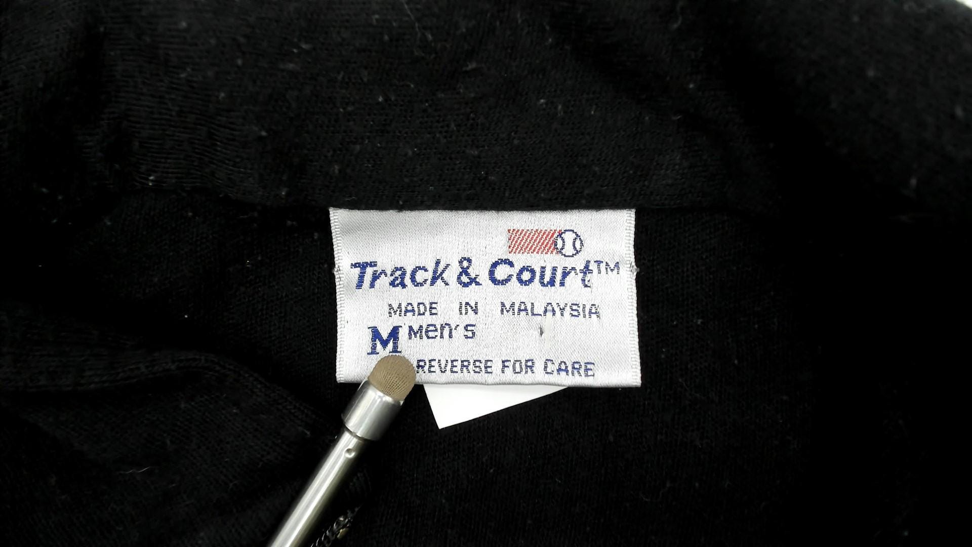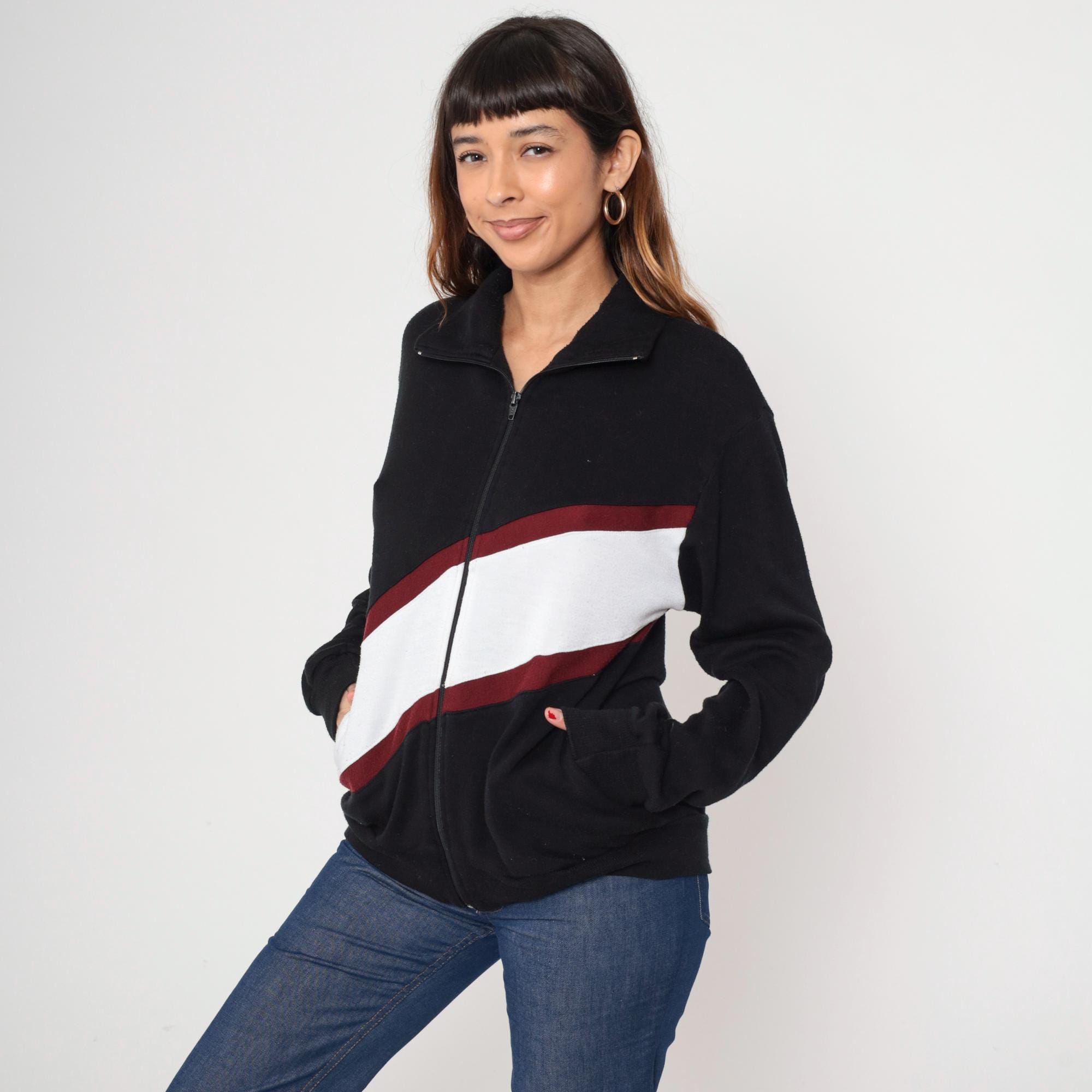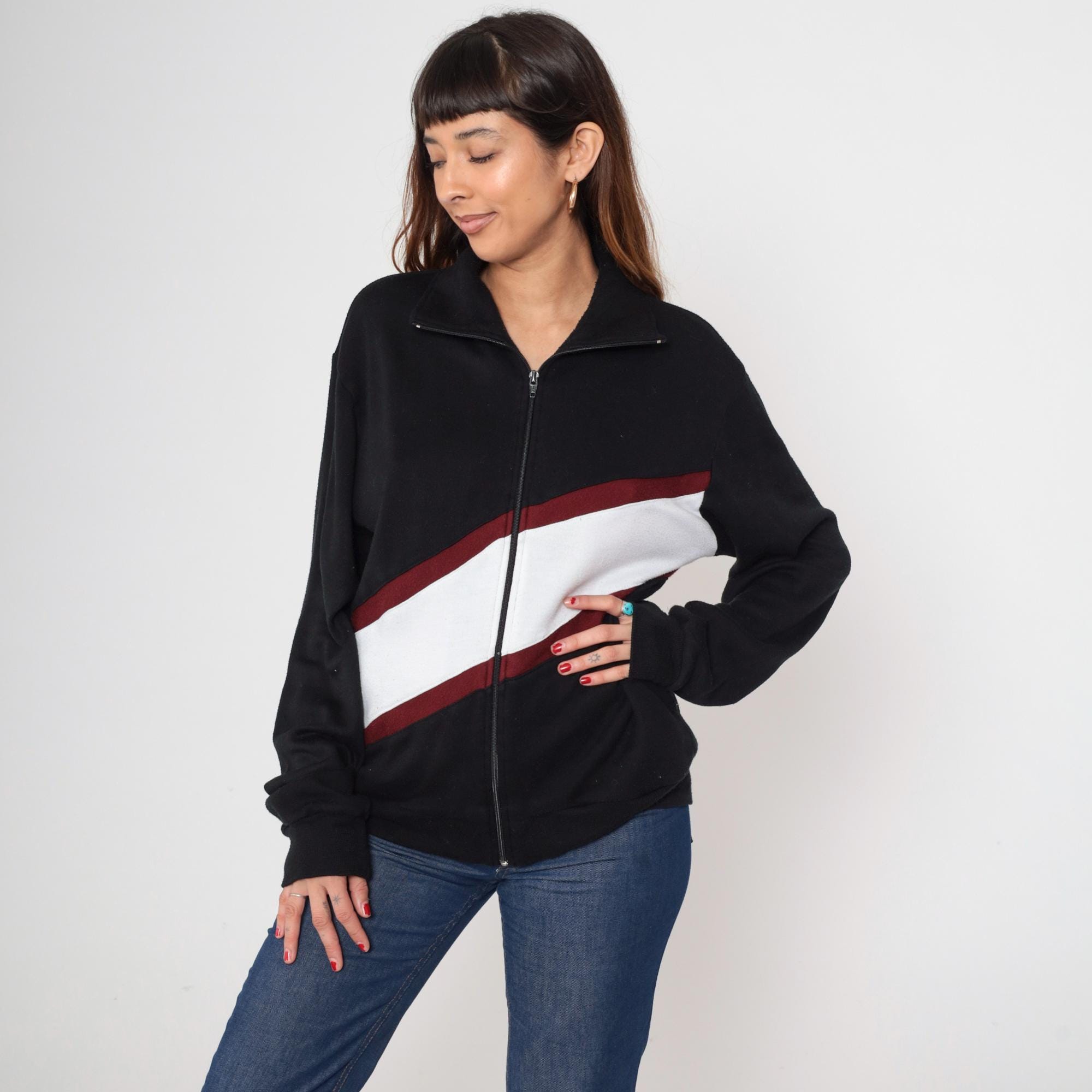 Black acrylic track jacket featuring bold red and white diagonal color block design across the front. Full zip front with mock neck collar and ribbed cuffs/waistband. Track and Court brand.