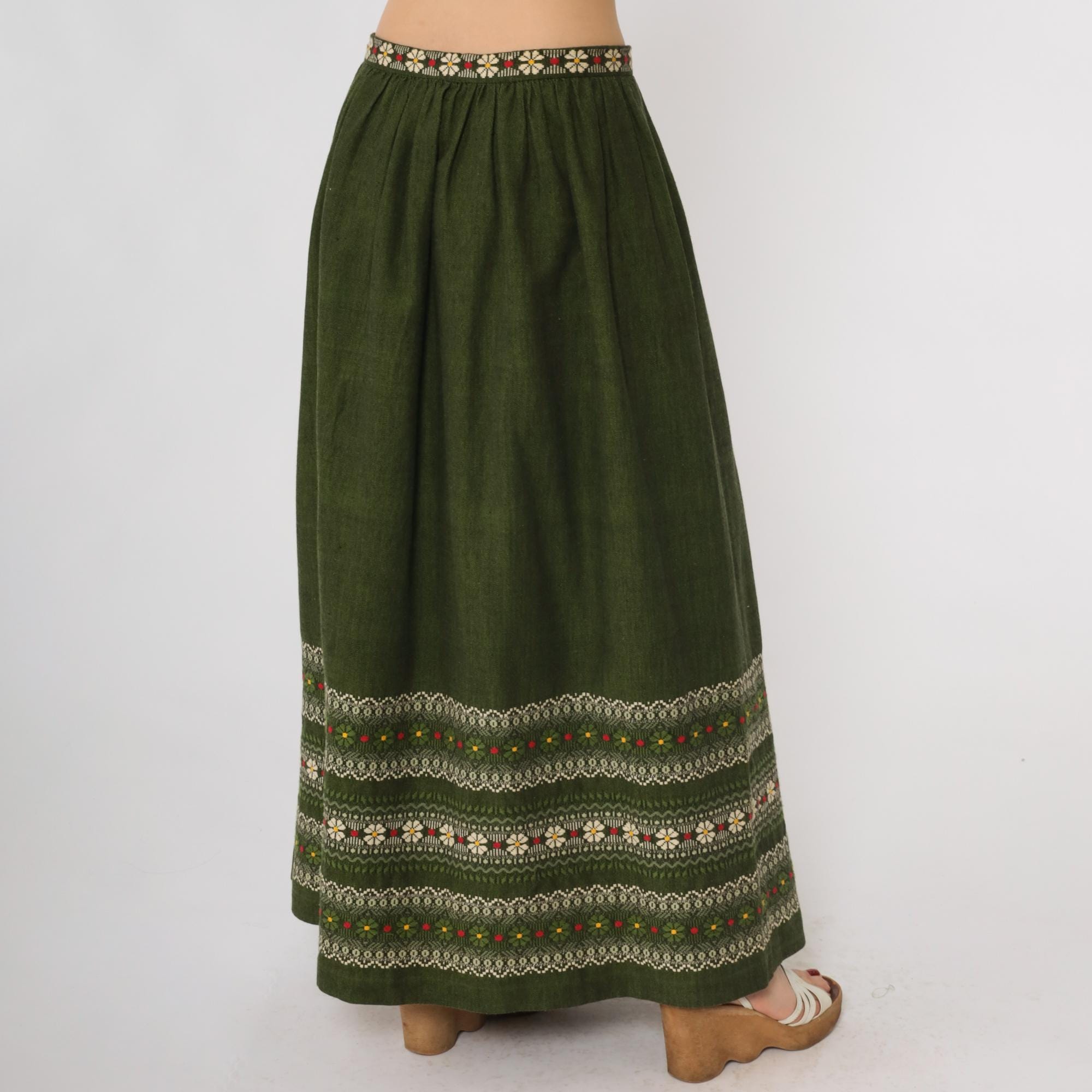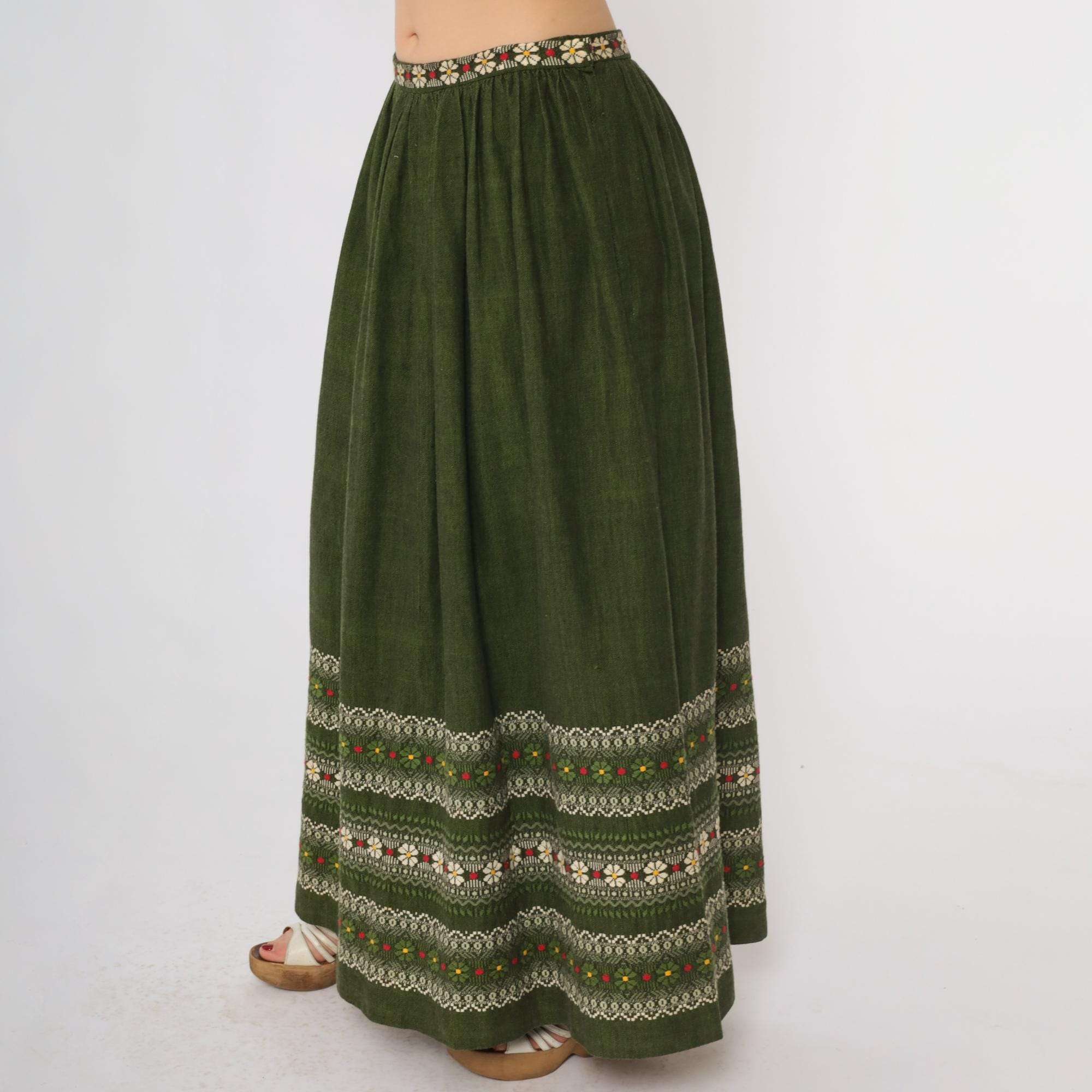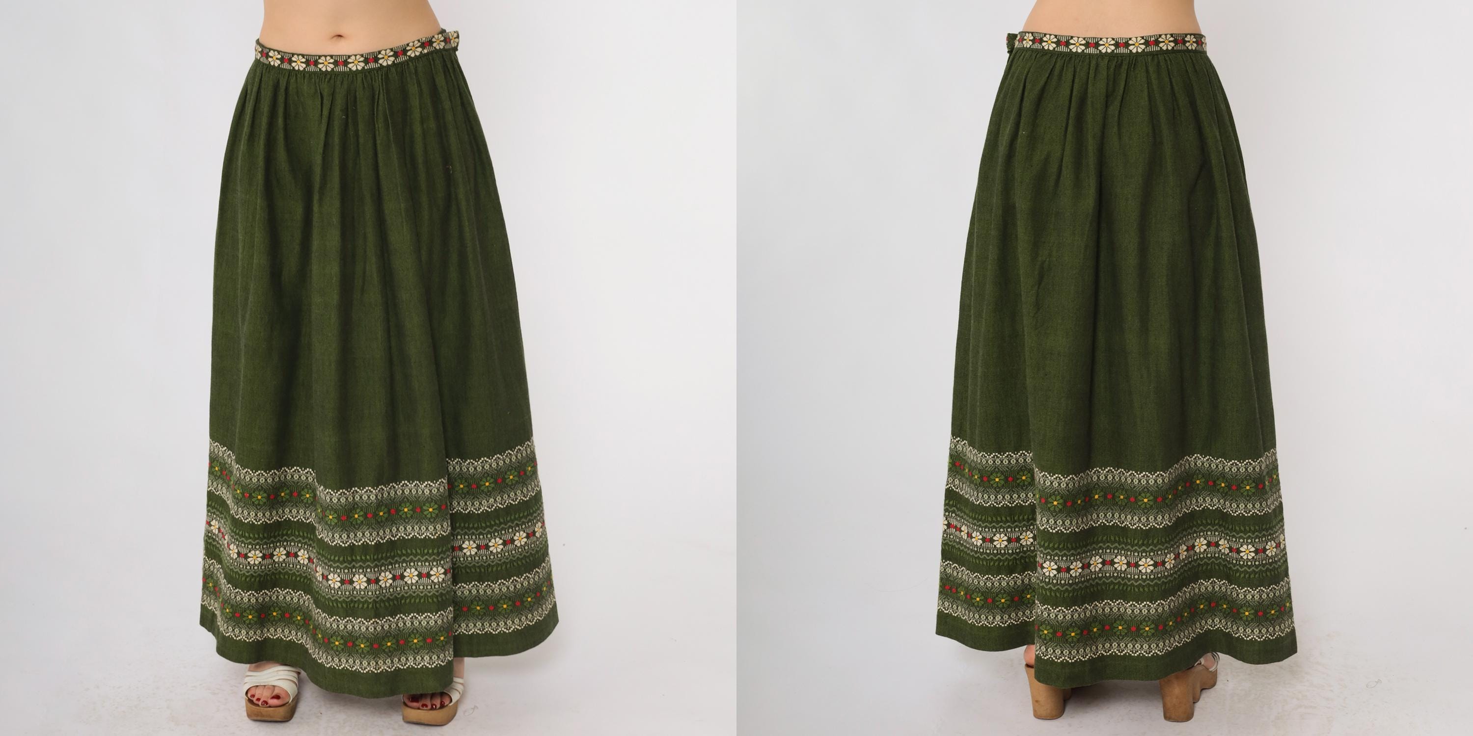 Vintage 60s olive green prairie skirt featuring floral embroidered trim along the waistband and hem. Designed in a bohemian folk style, this maxi length skirt has a gathered waist with a flowing silhouette.