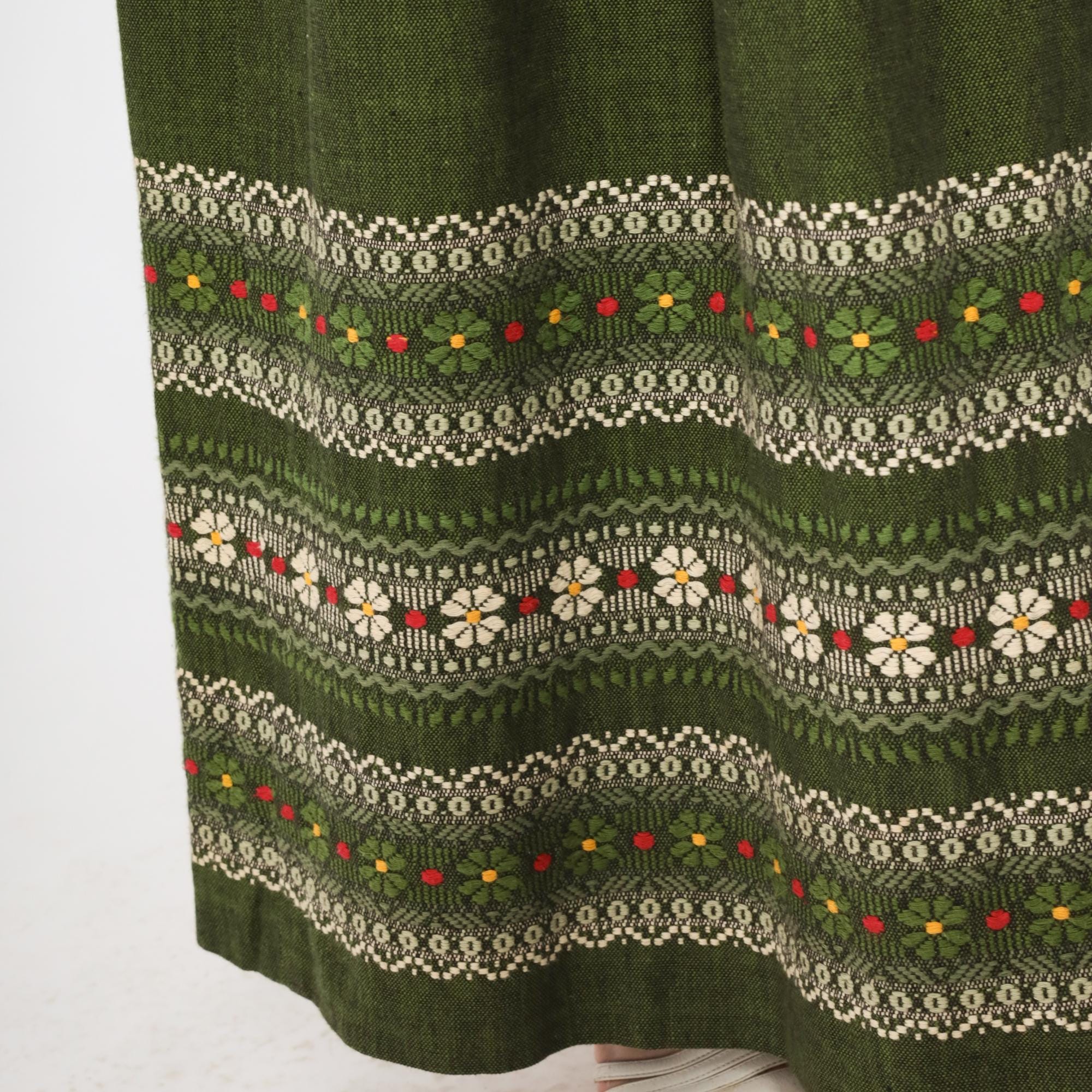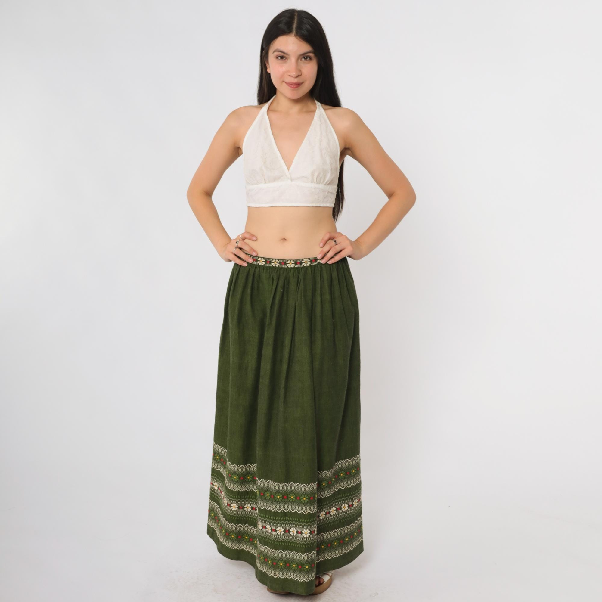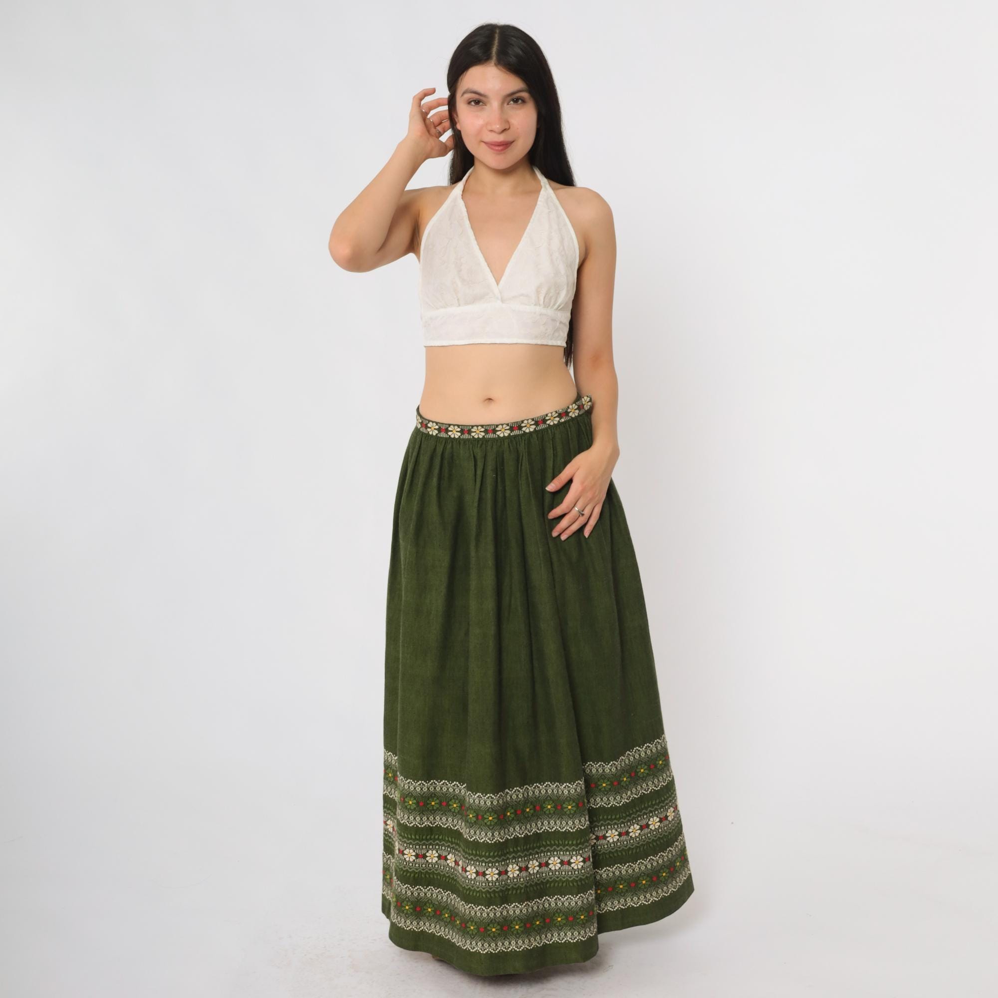 Vintage 60s olive green prairie skirt featuring floral embroidered trim along the waistband and hem. Designed in a bohemian folk style, this maxi length skirt has a gathered waist with a flowing silhouette.