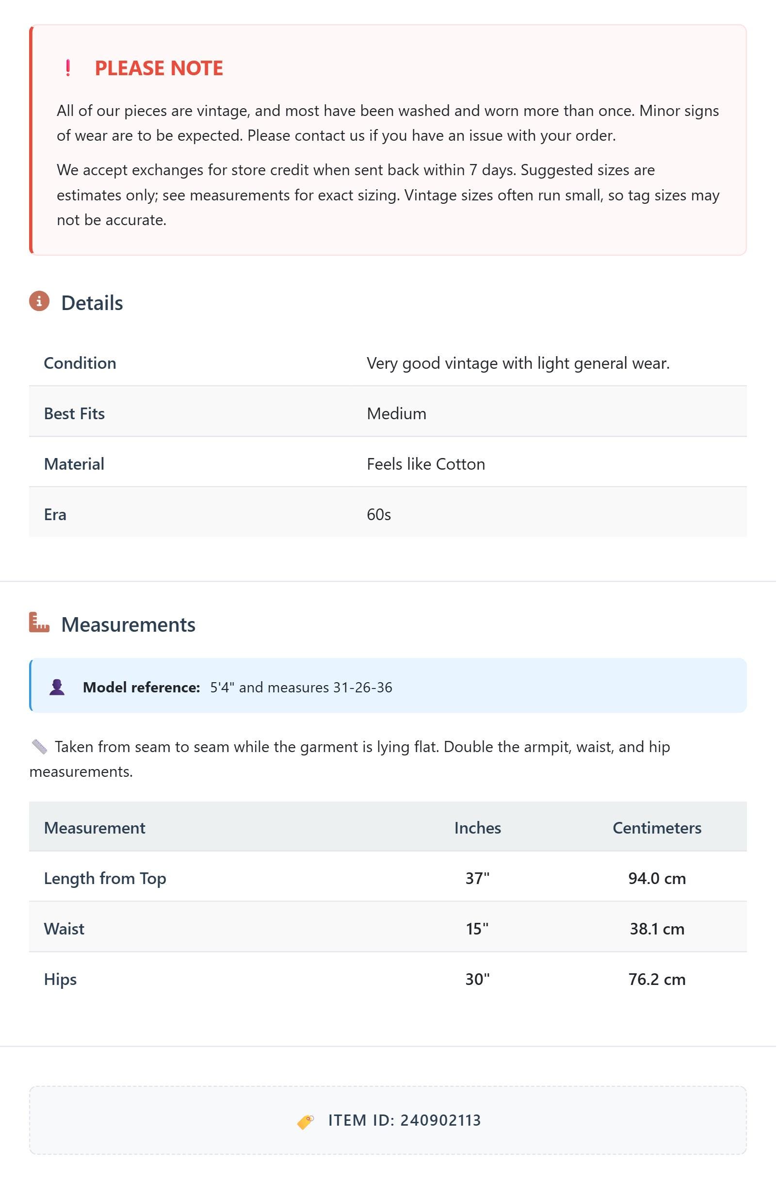 Suggested sizes are estimates only; see measurements for exact sizing. Vintage sizes often run small, so tag sizes may not be accurate.