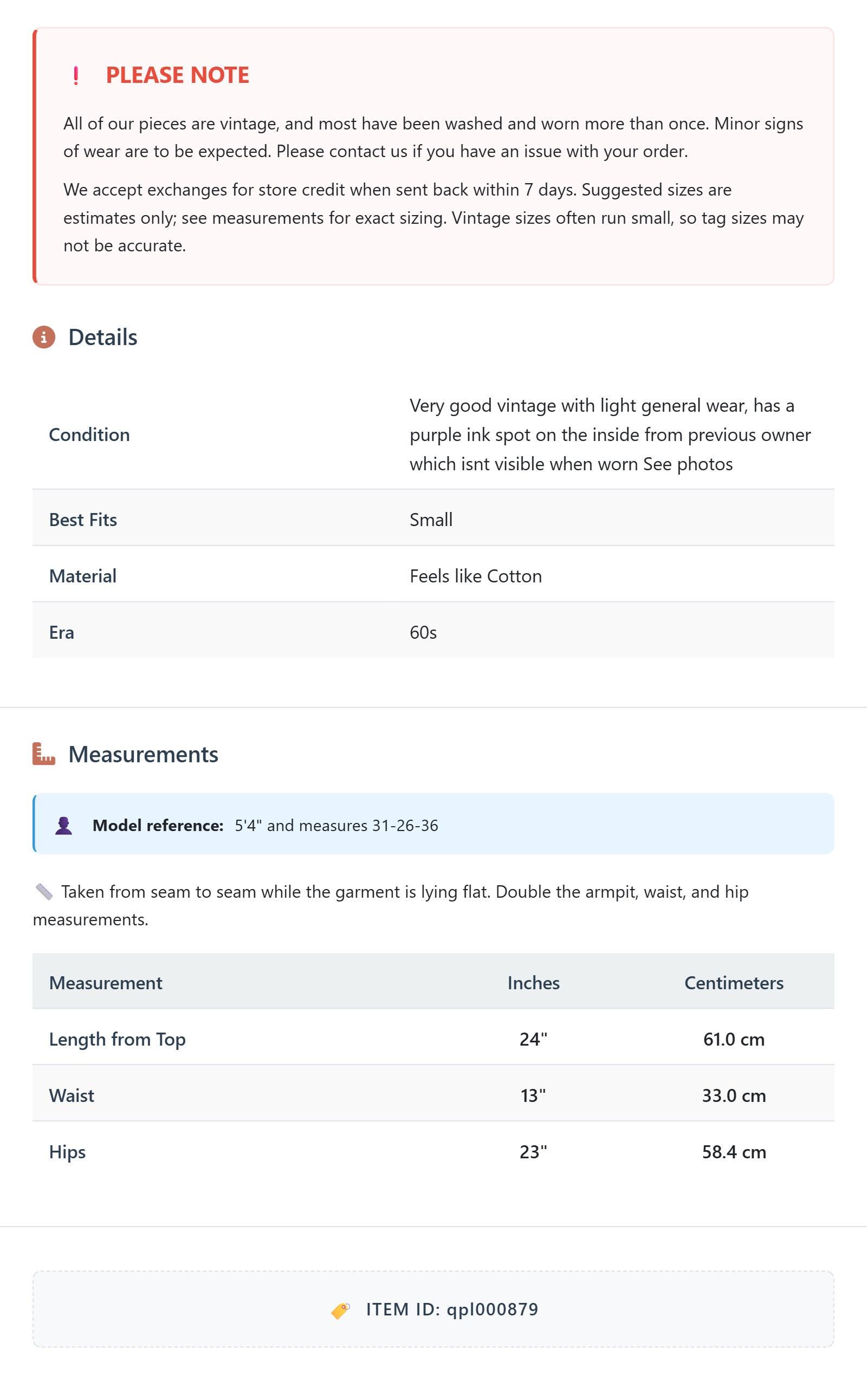 All of our pieces are vintage, and most have been washed and worn more than once. Minor signs of wear are to be expected. Please contact us if you have an issue with your order. We accept exchanges for store credit when sent back within 7 days.