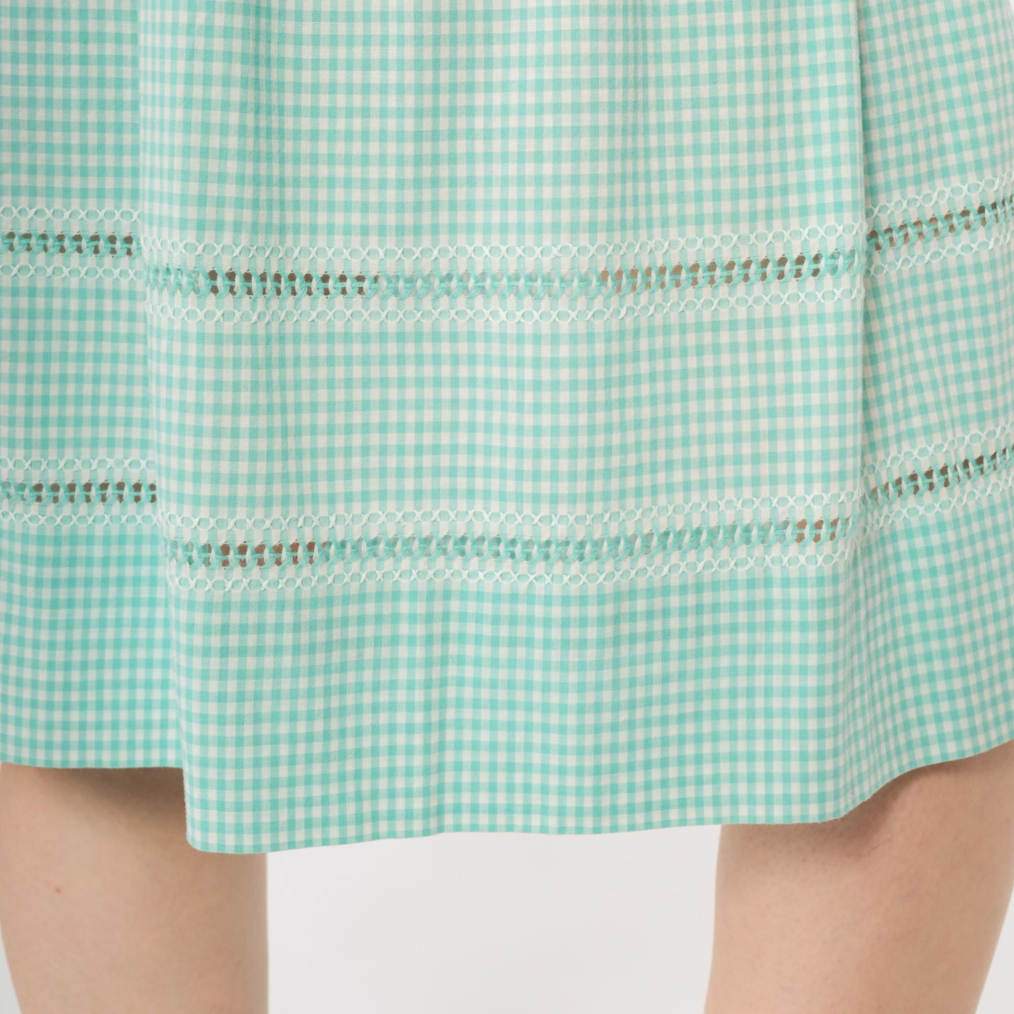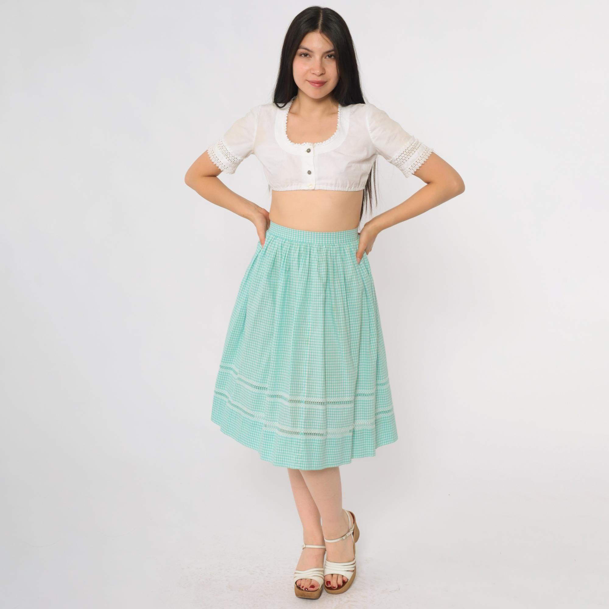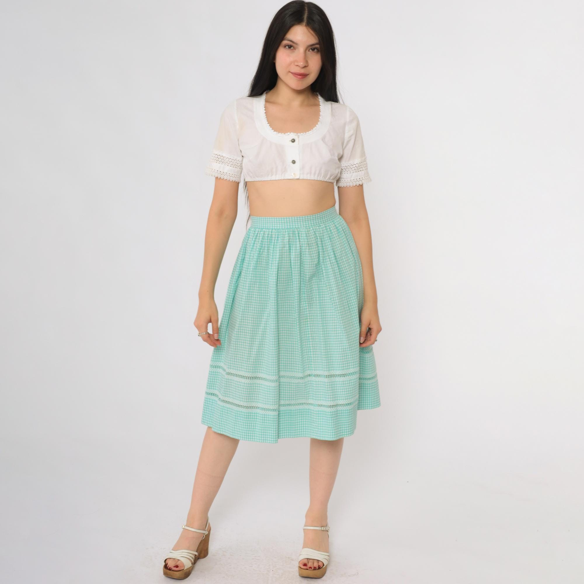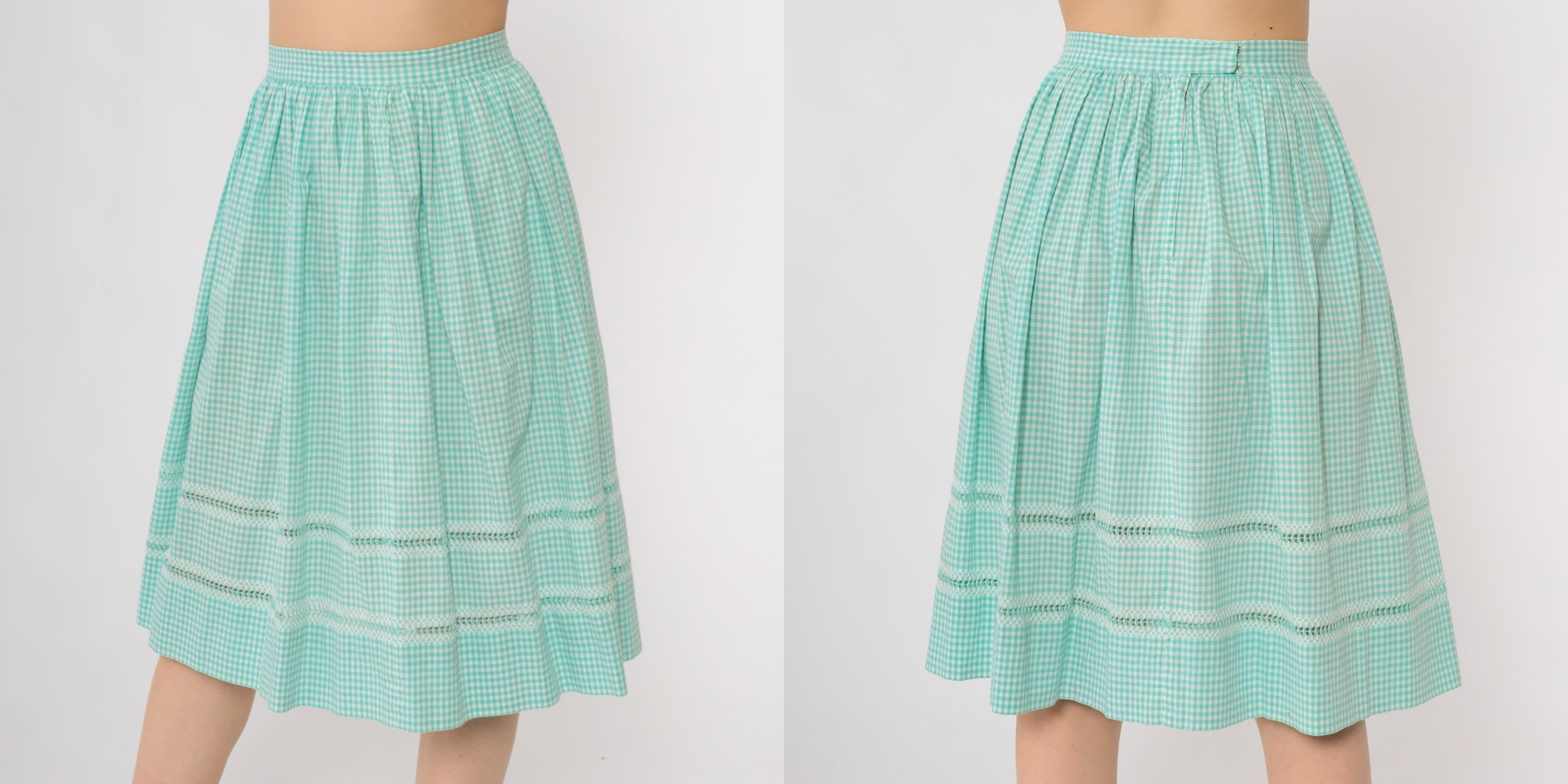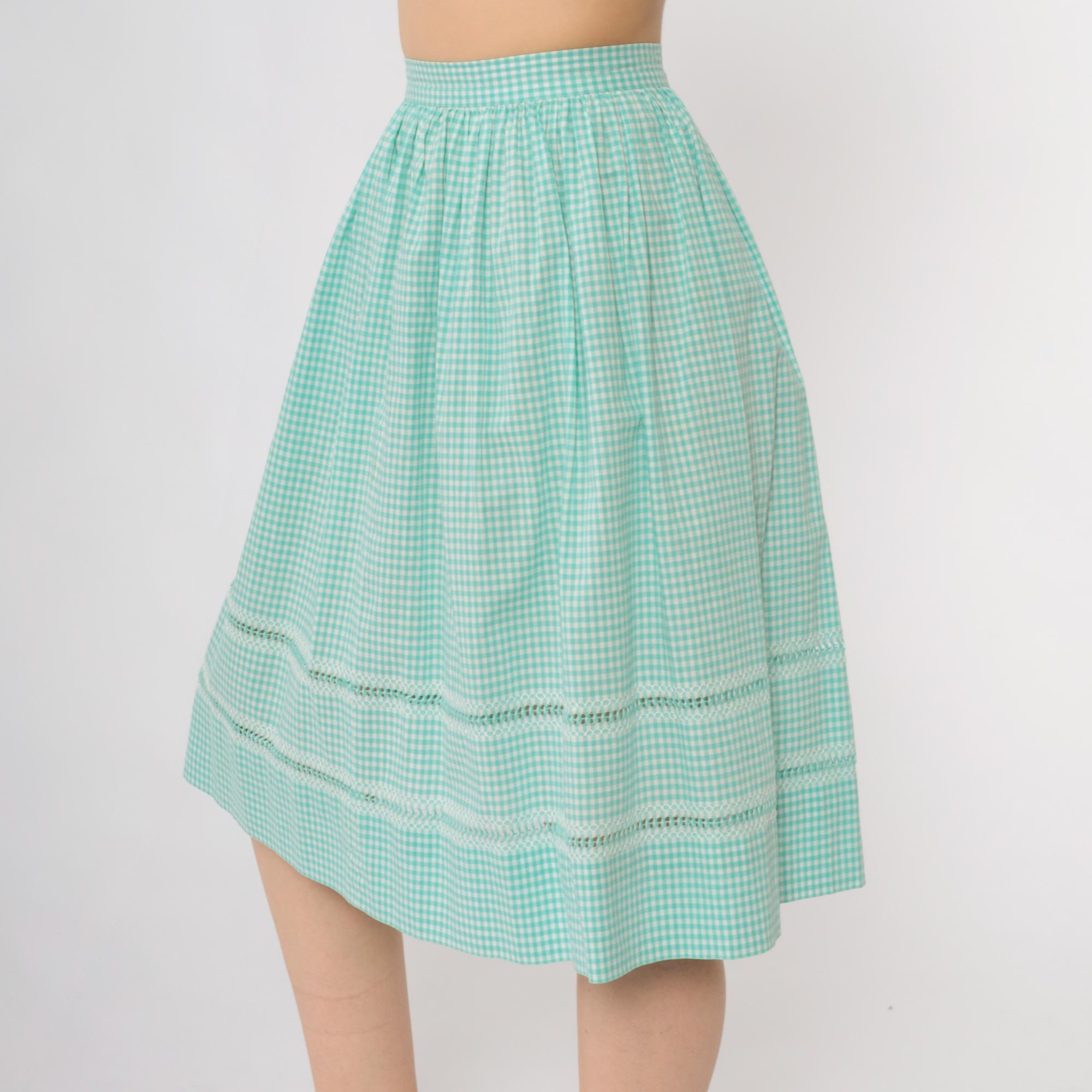 Vintage 60s mint green gingham skirt featuring a high waist and full A-line silhouette. The skirt includes delicate white crochet lace inserts circling the hemline, giving it a prairie-inspired touch.