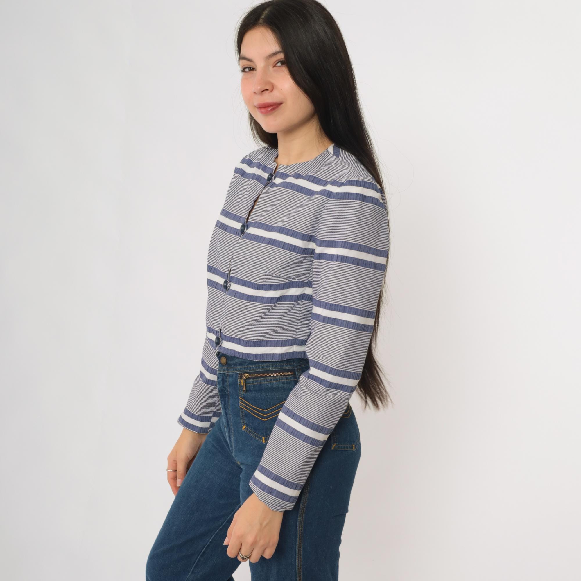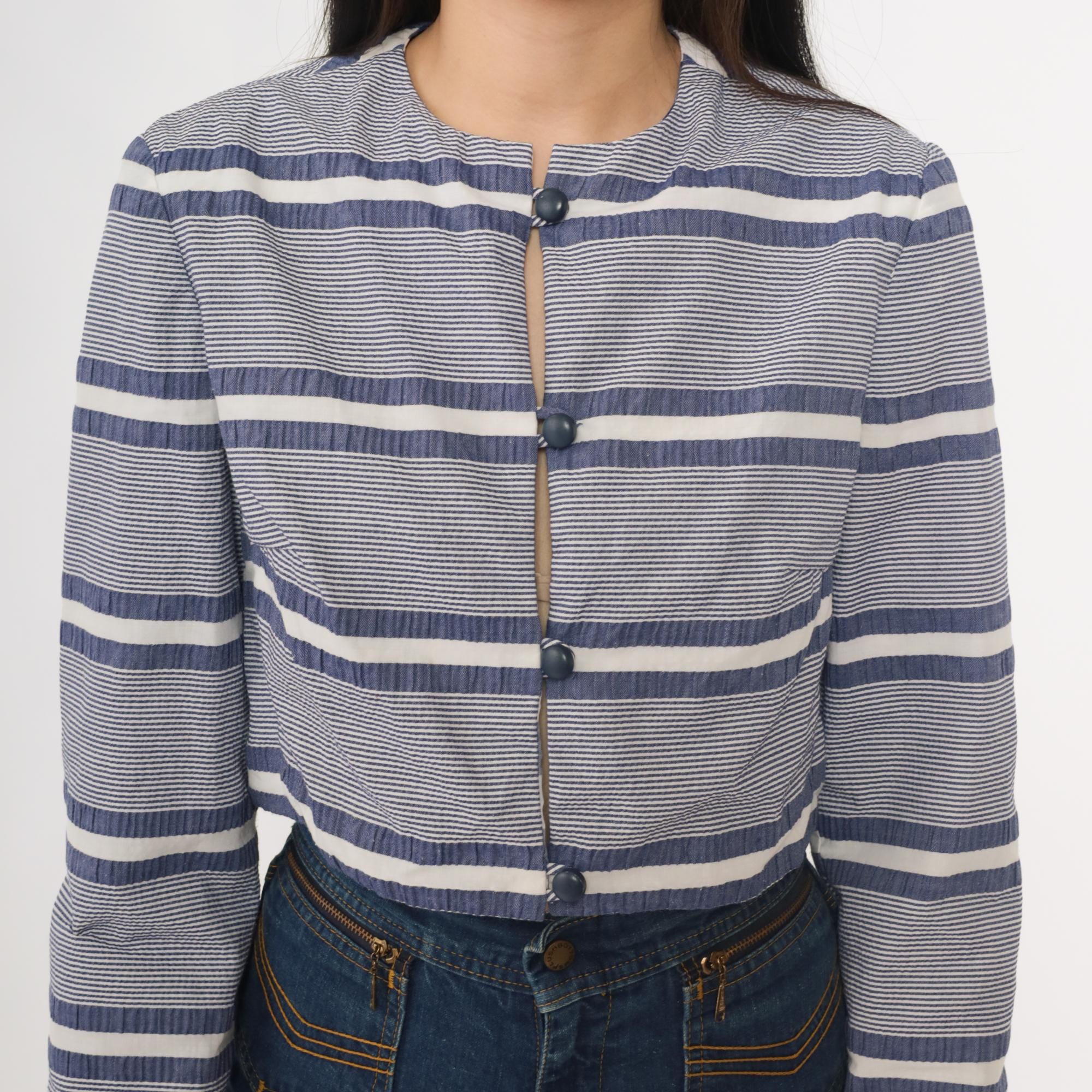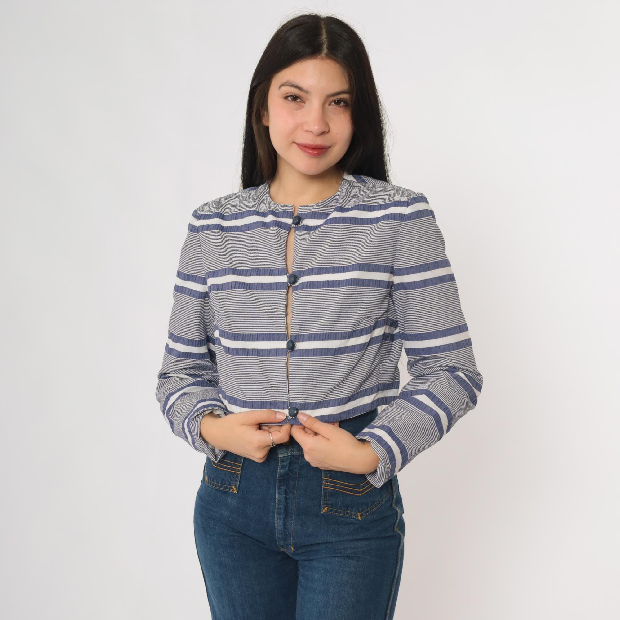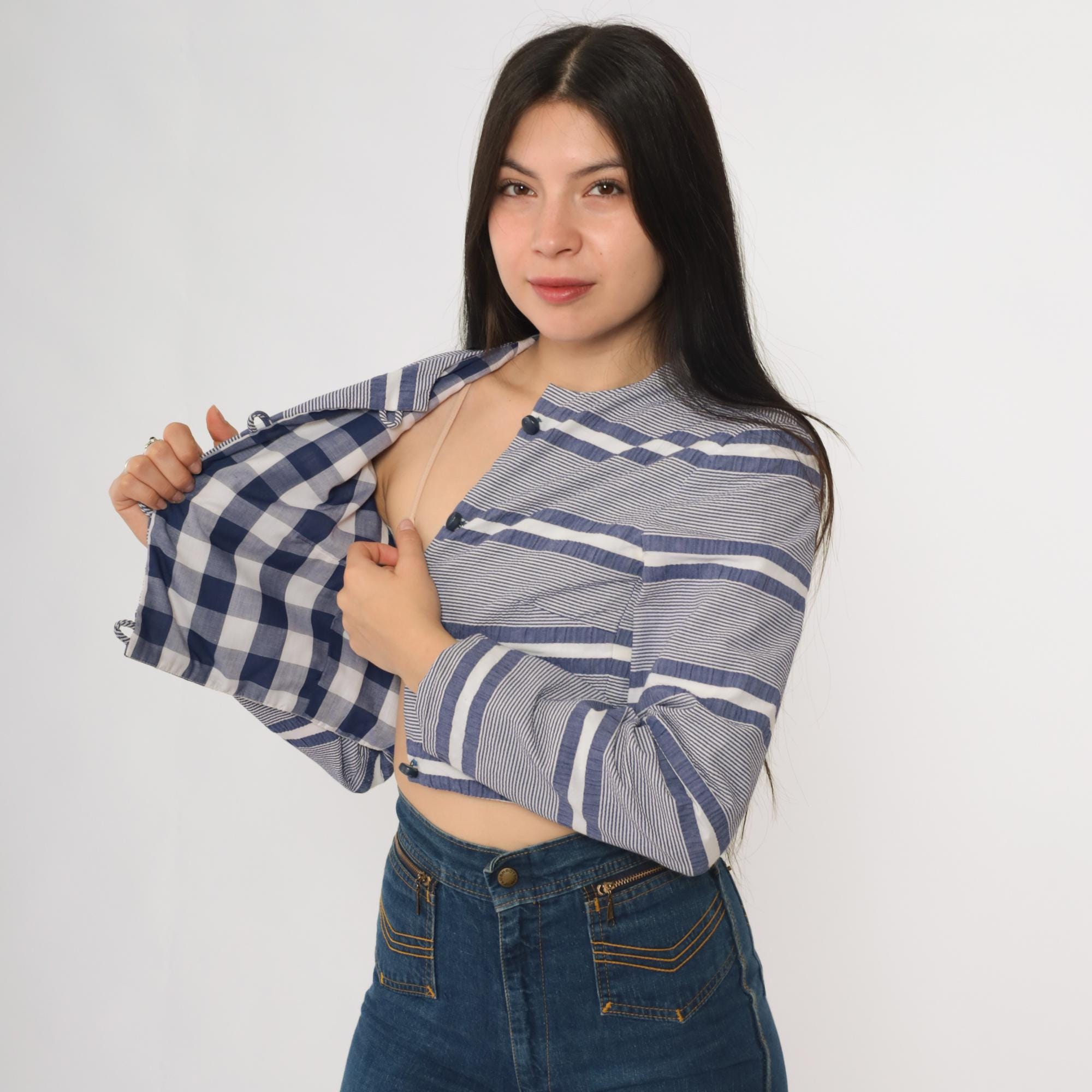 Vintage 80s cropped jacket by Gavi in navy blue and white stripes. Features a boxy cropped cut, long sleeves, a band collar neckline, and button front closure with matching blue buttons. Lightweight fabric with a contrasting gingham check interior.