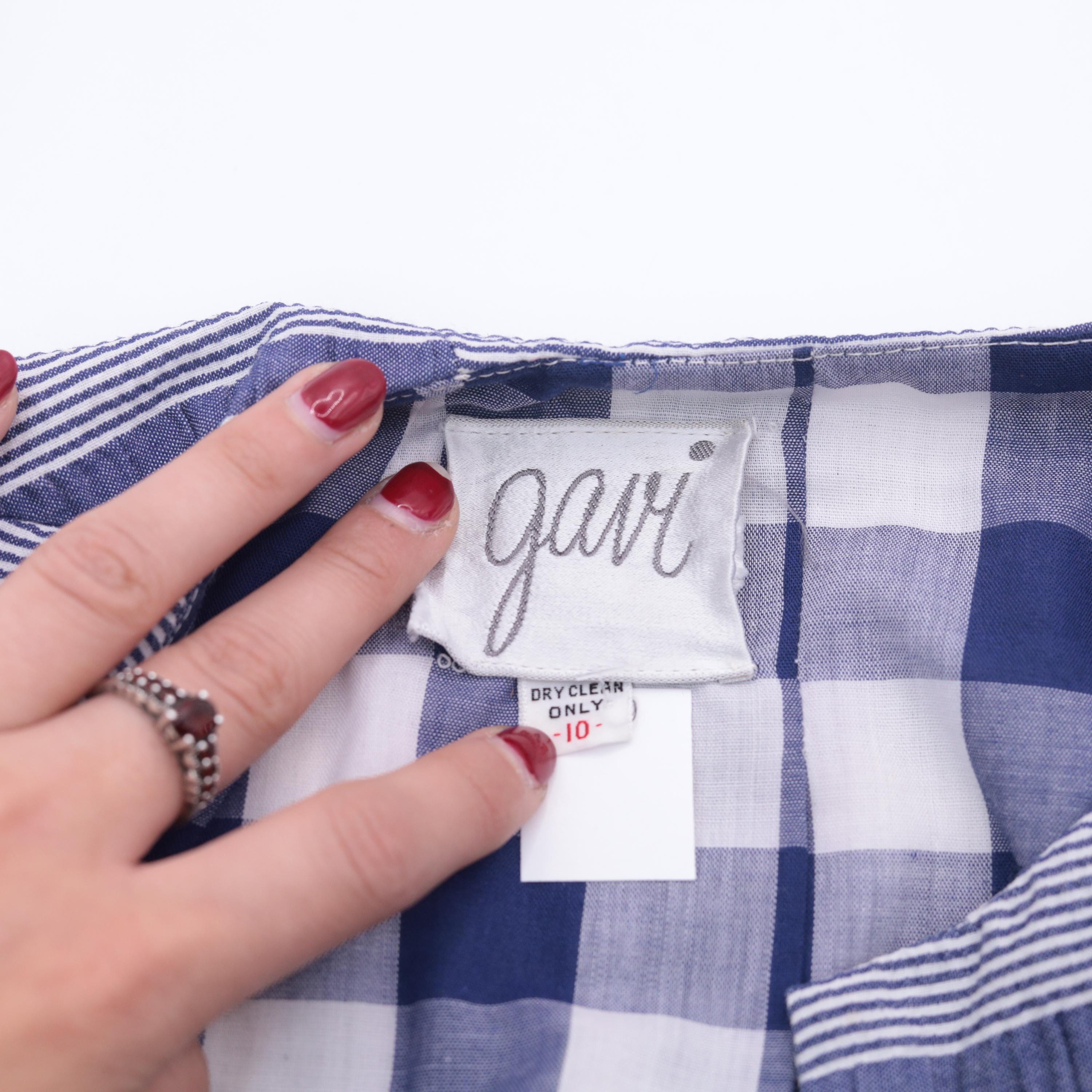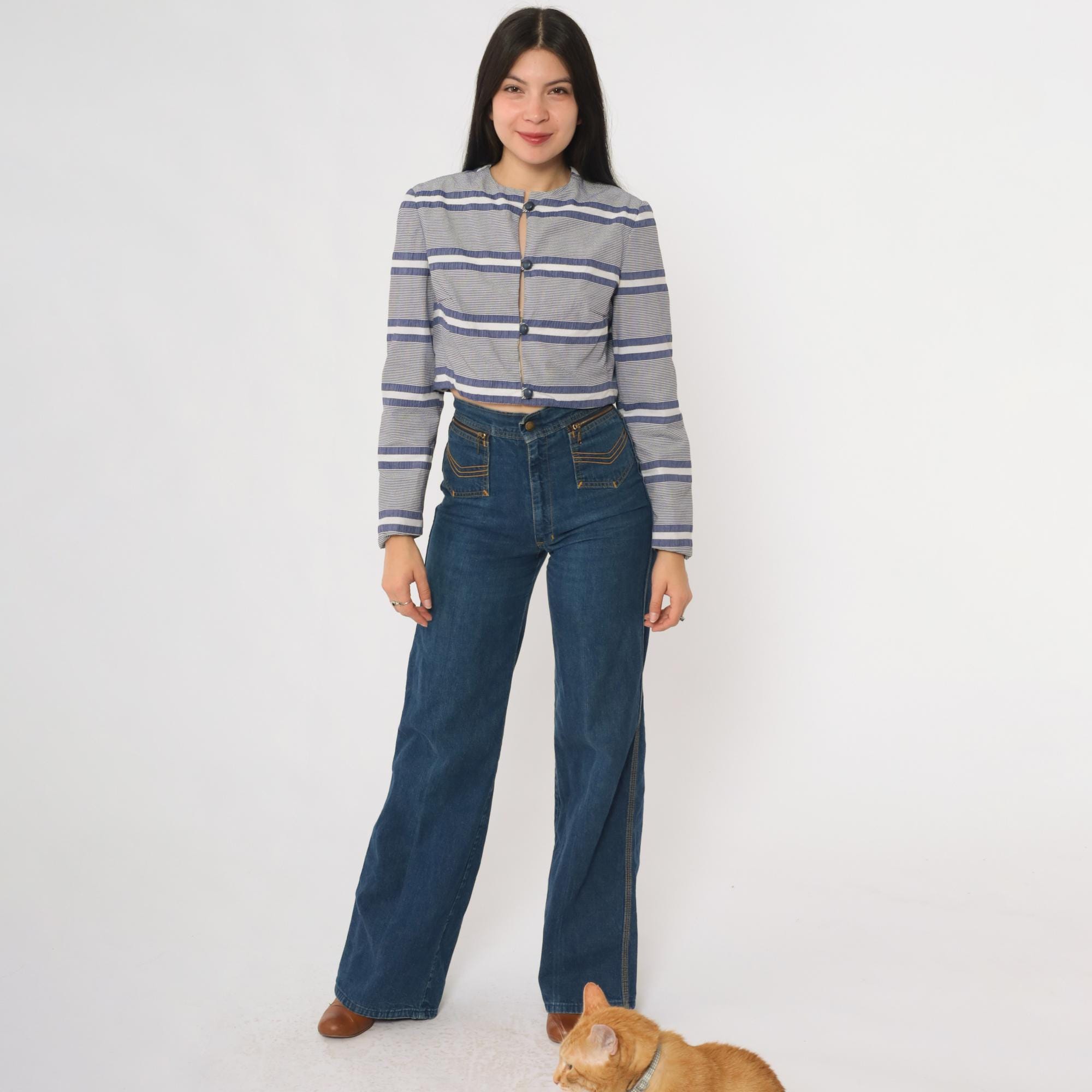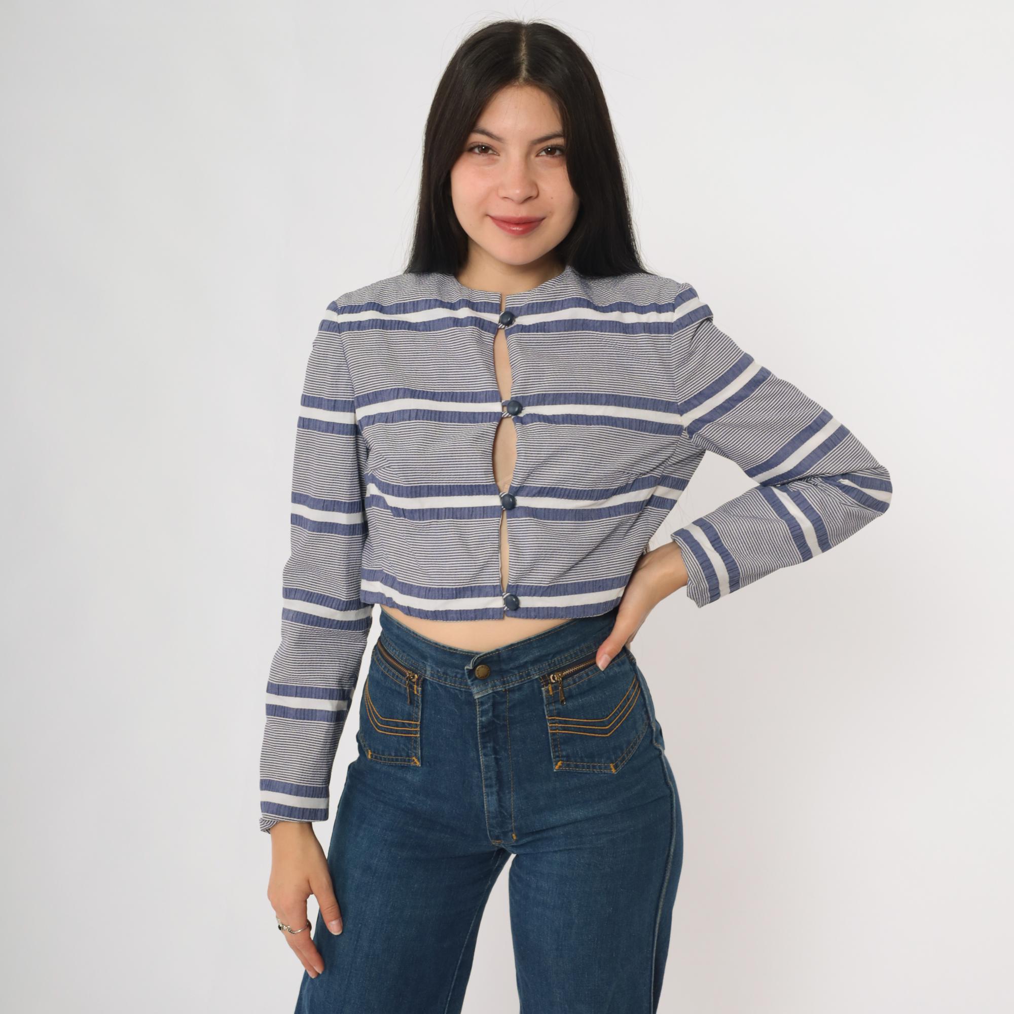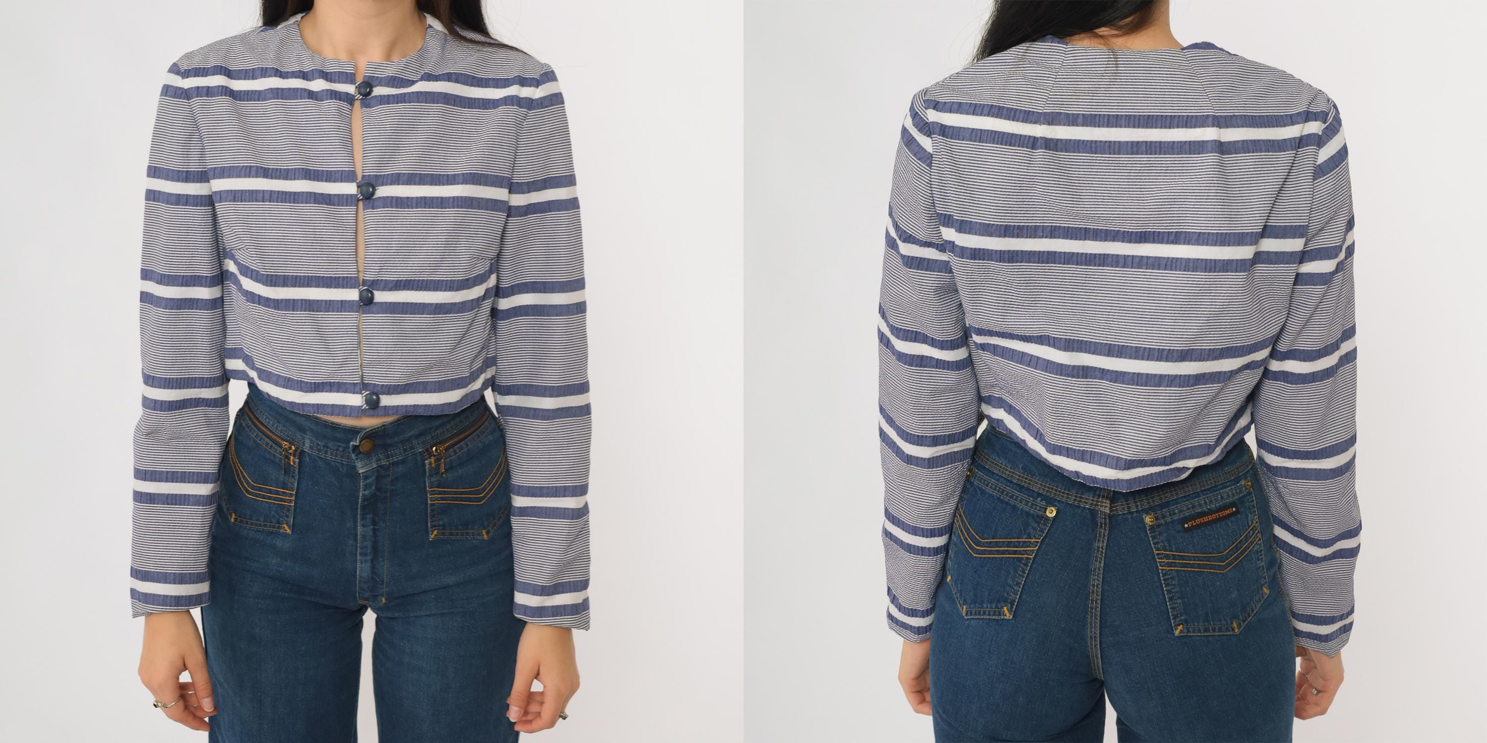 Vintage 80s cropped jacket by Gavi in navy blue and white stripes. Features a boxy cropped cut, long sleeves, a band collar neckline, and button front closure with matching blue buttons. Lightweight fabric with a contrasting gingham check interior.