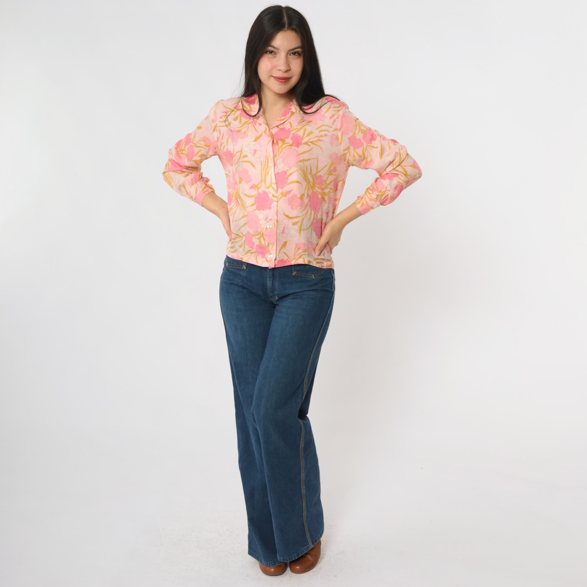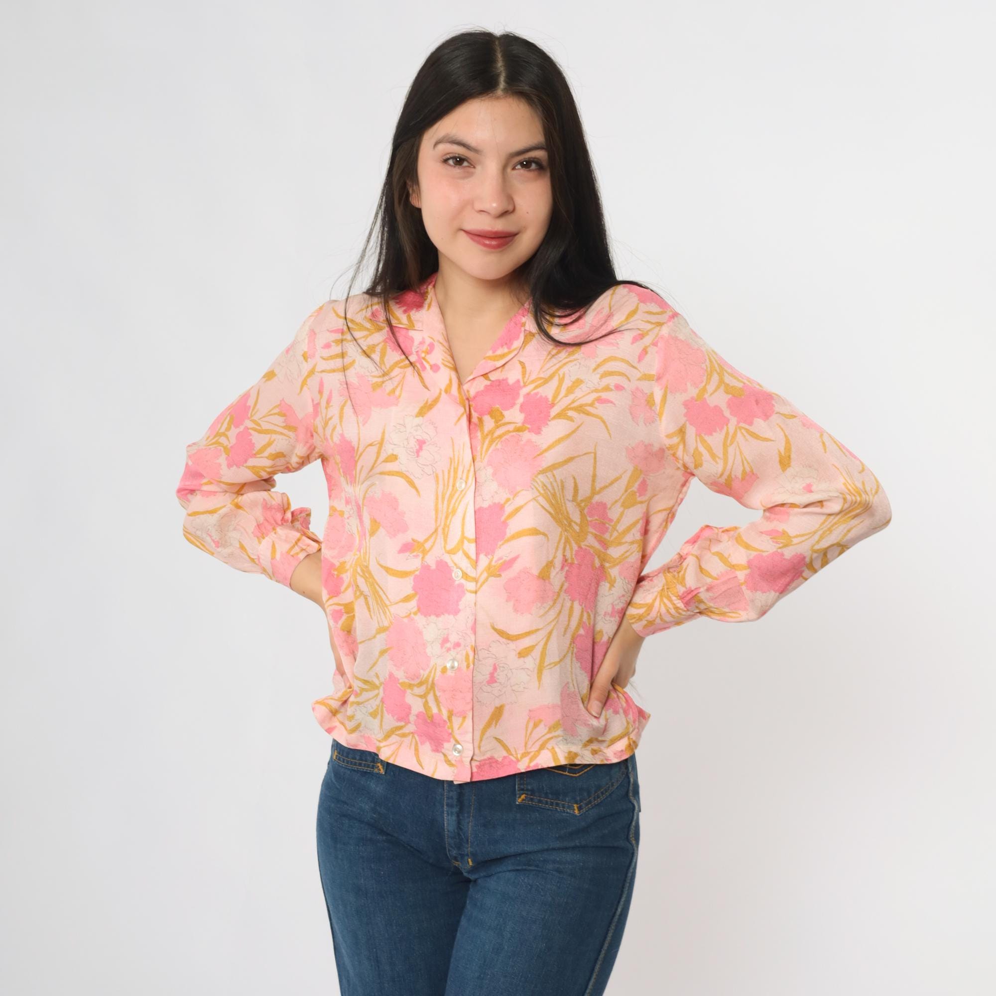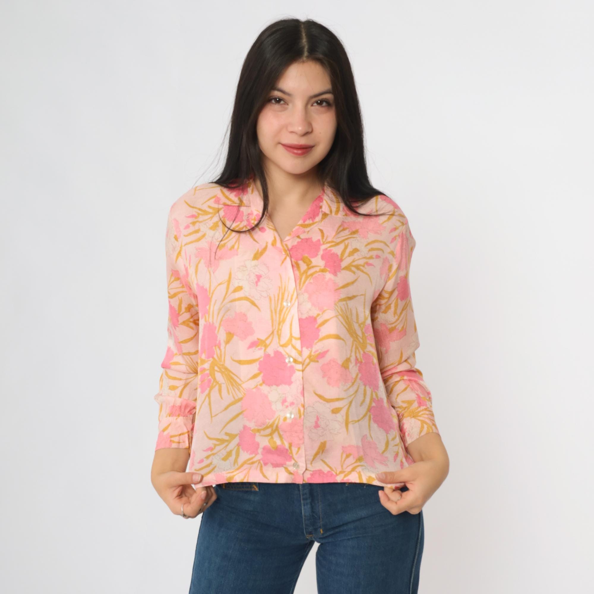 Vintage 60s blouse in a sheer nylon fabric with a pink and yellow floral print. Features a pointed collar, button front closure, and long sleeves with button cuffs. Lightweight construction with a slightly sheer finish, ideal for layering.