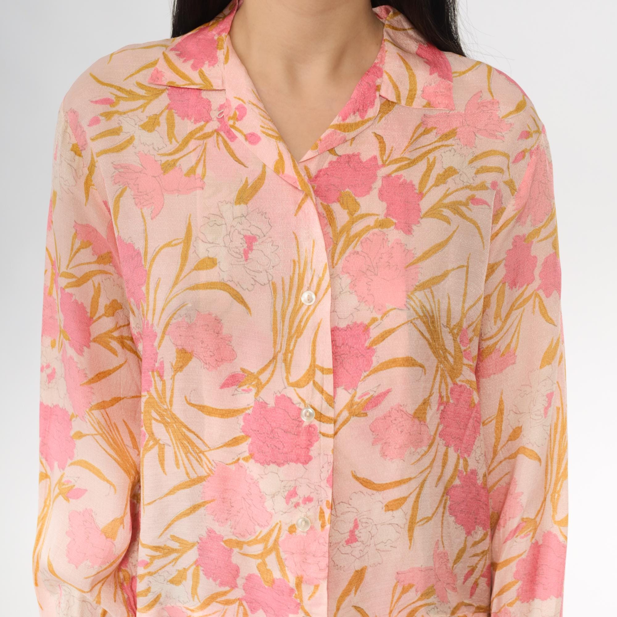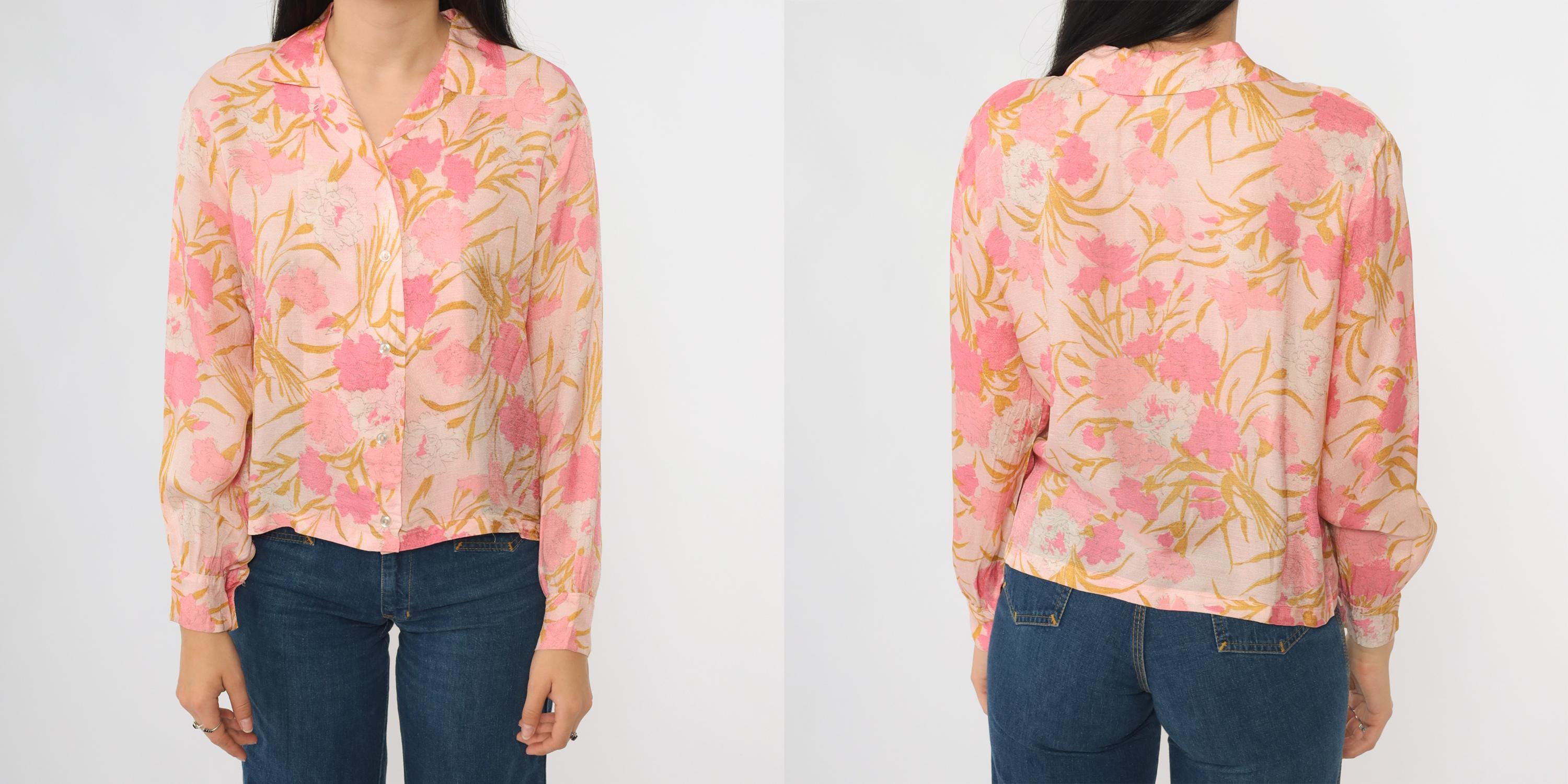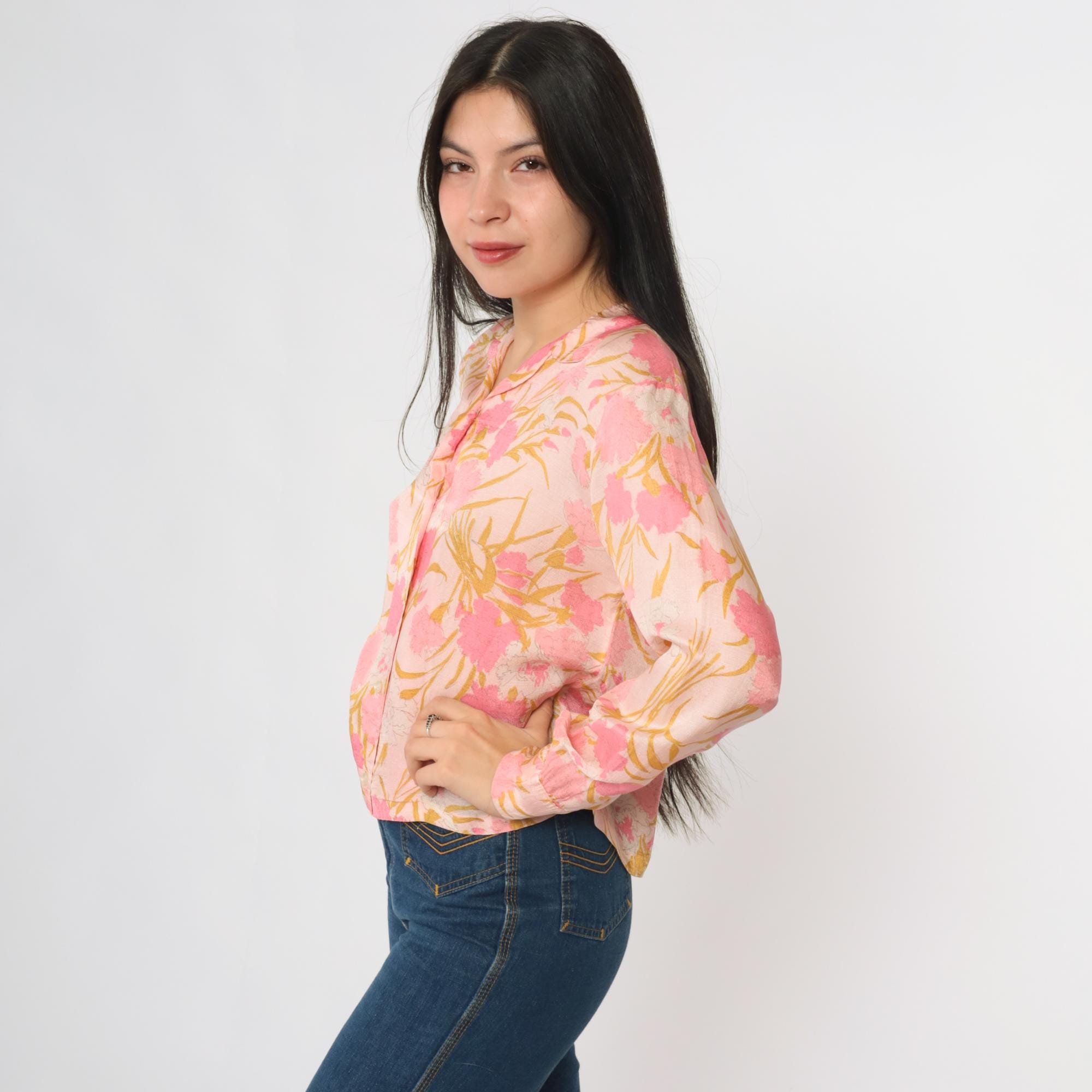 Vintage 60s blouse in a sheer nylon fabric with a pink and yellow floral print. Features a pointed collar, button front closure, and long sleeves with button cuffs. Lightweight construction with a slightly sheer finish, ideal for layering.