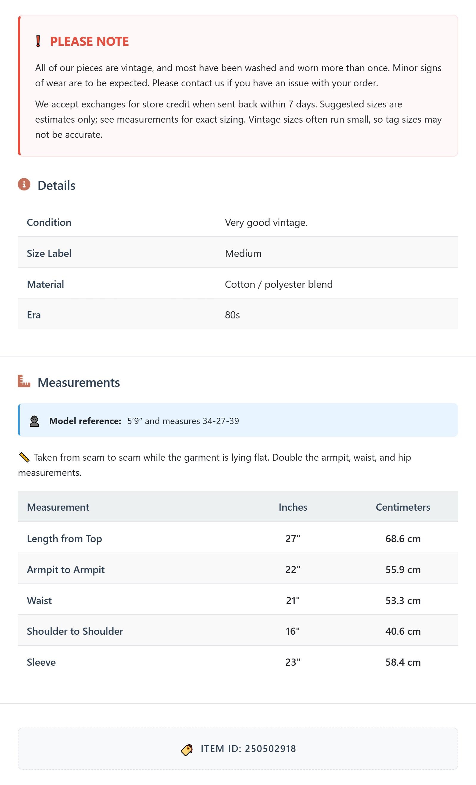 Suggested sizes are estimates only; see measurements for exact sizing. Vintage sizes often run small, so tag sizes may not be accurate.
