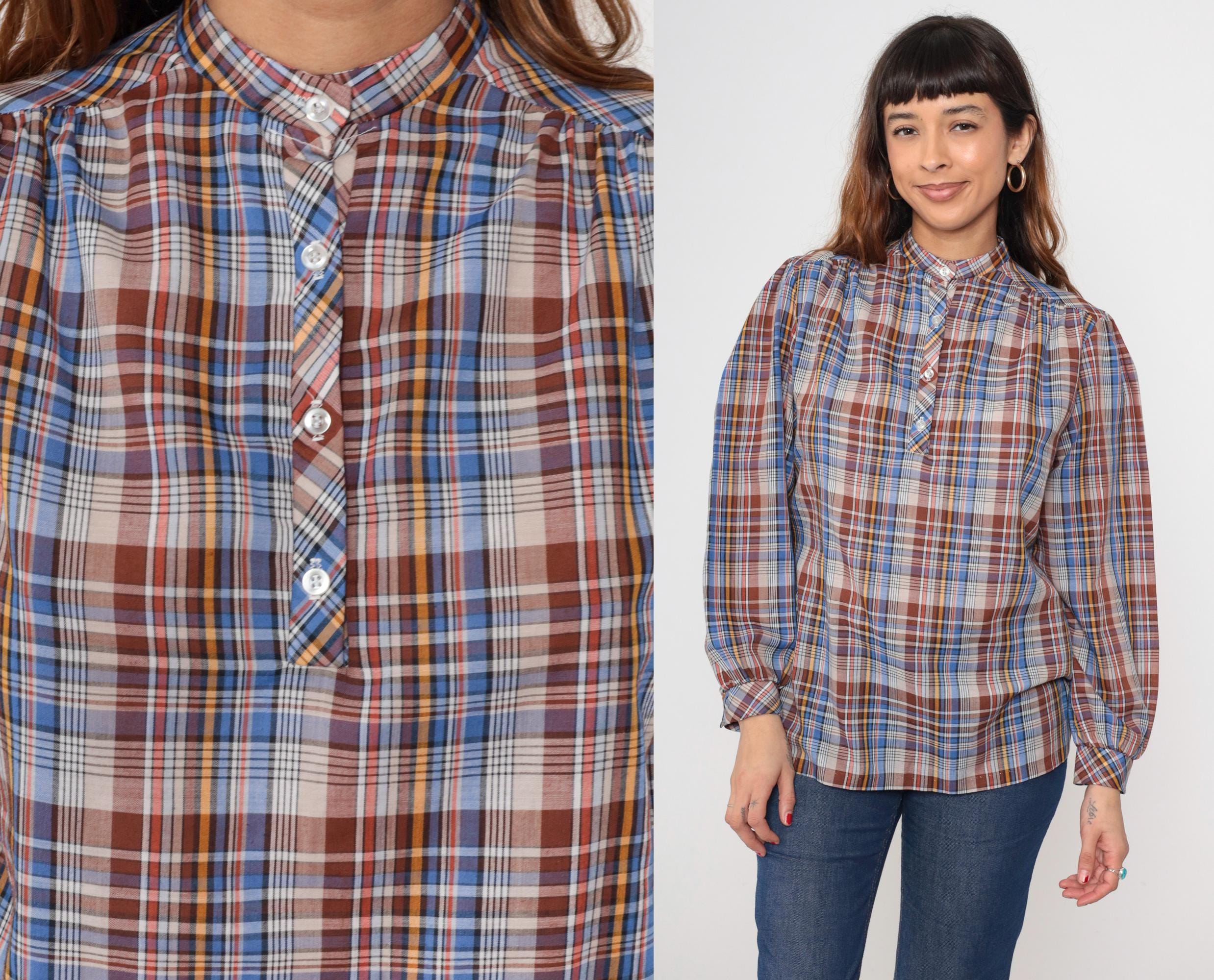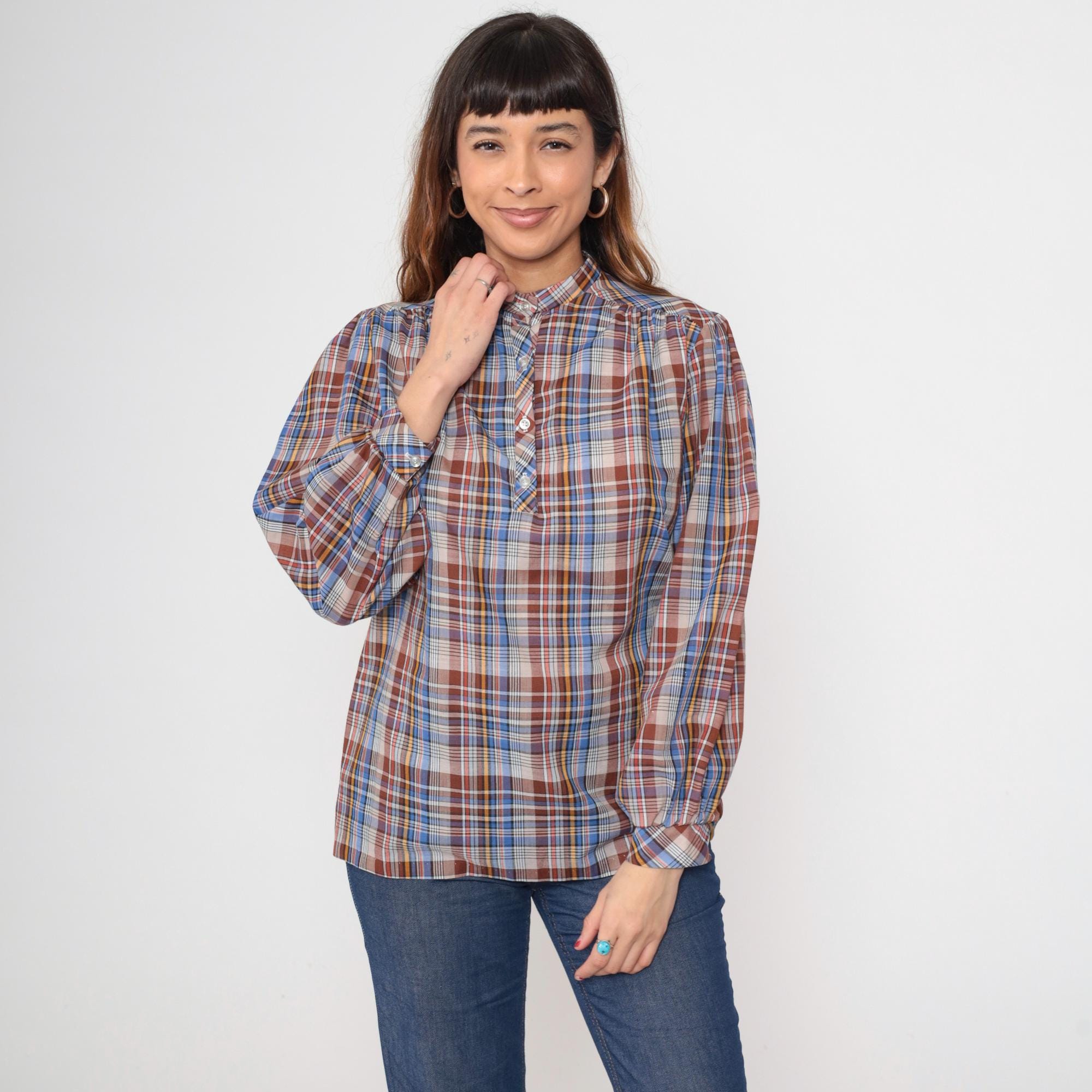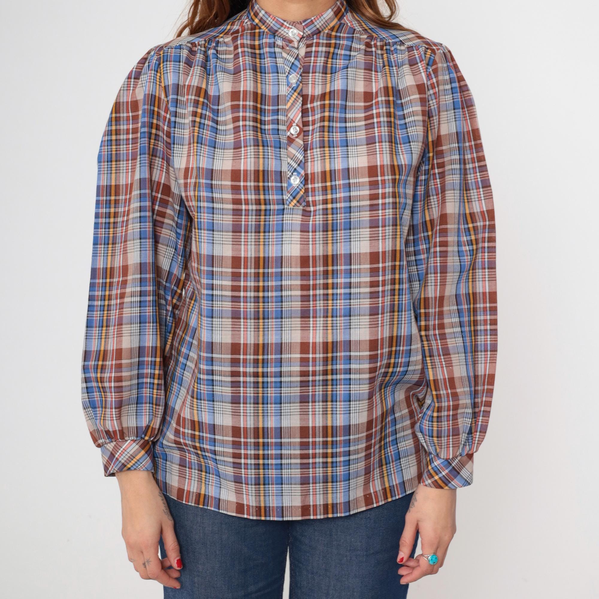 Brown, blue and yellow plaid cotton blend pullover shirt featuring a distinctive mandarin collar with partial button front placket. Generous puff sleeves with gathered shoulders and buttoned cuffs. Relaxed silhouette with slight gathering at the yoke.