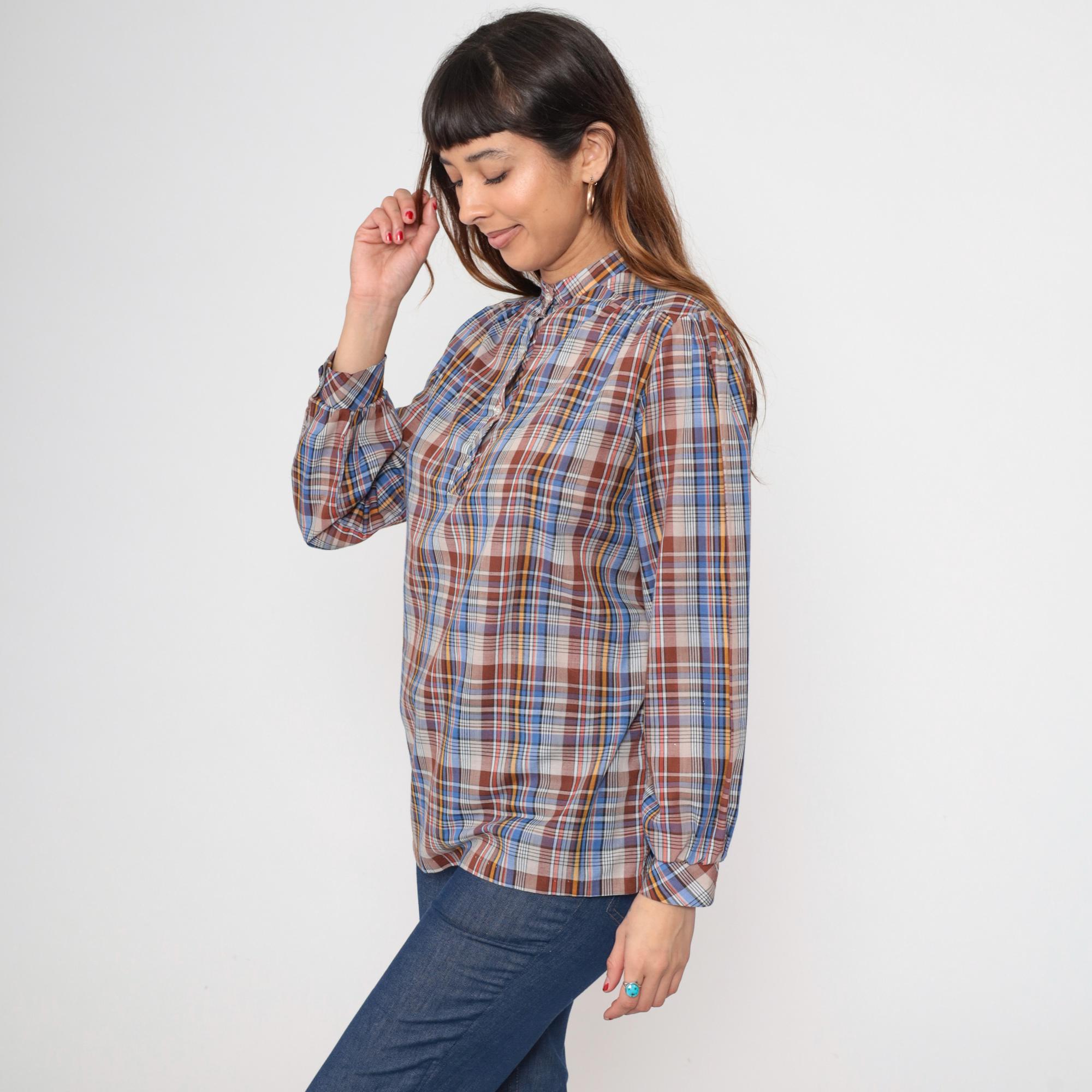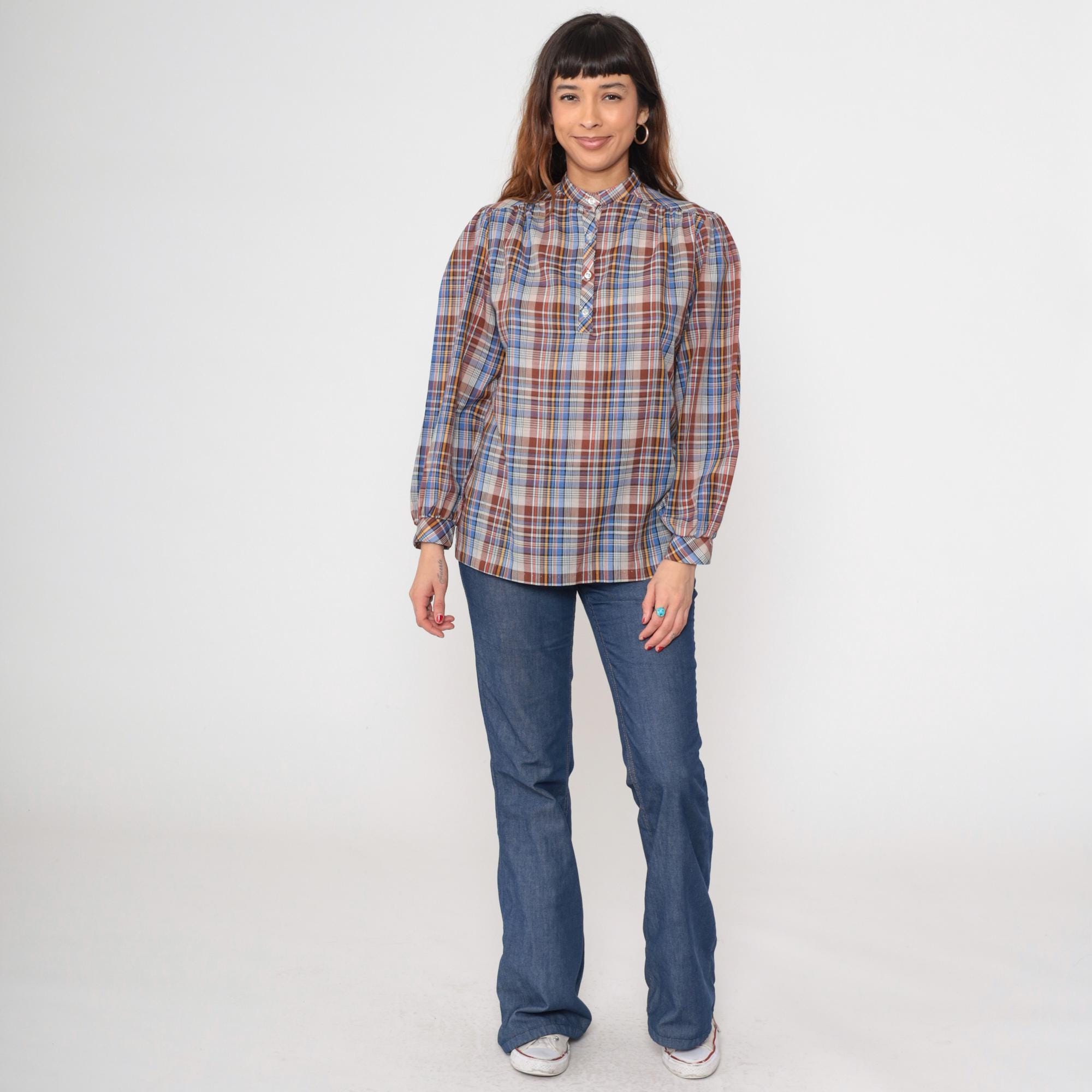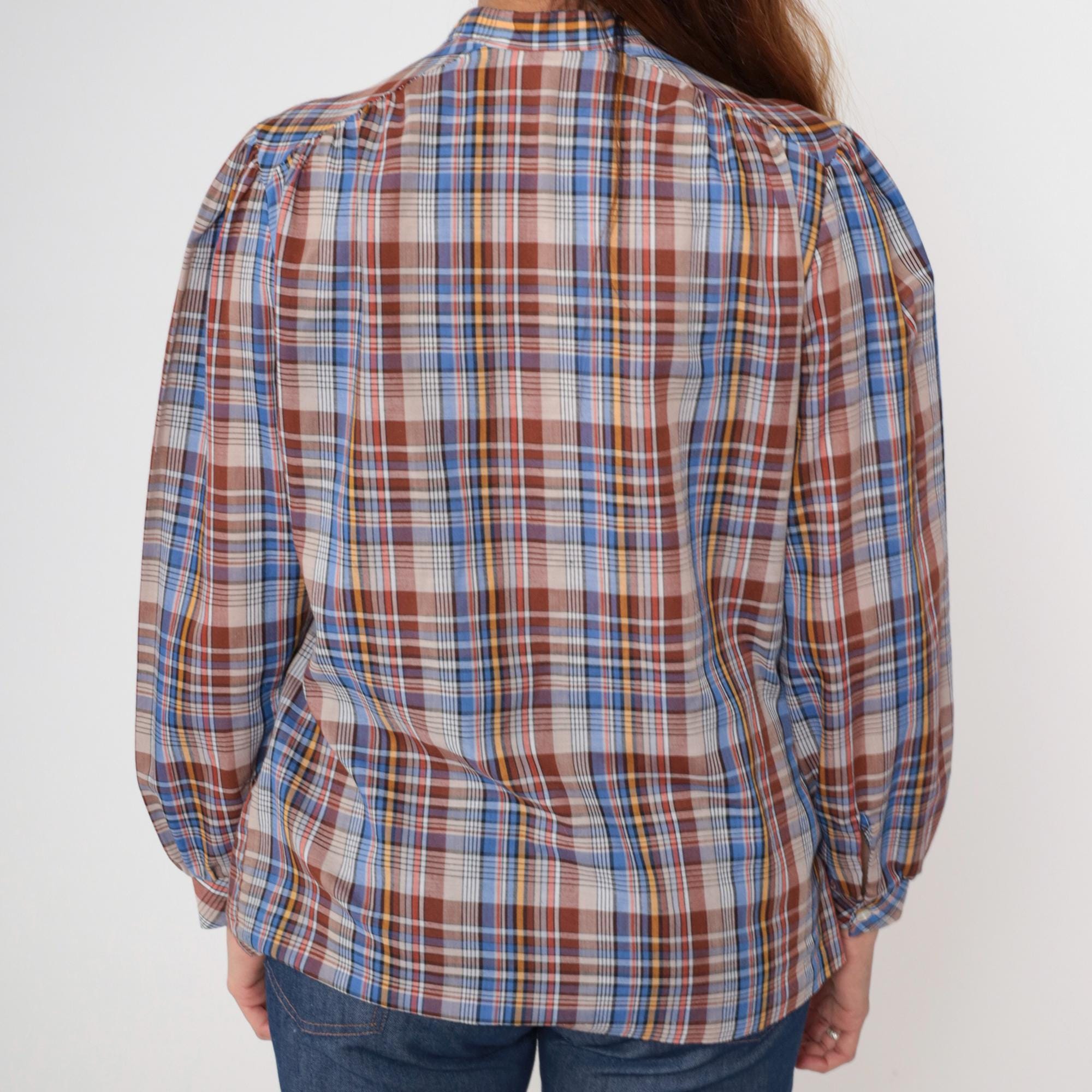 Brown, blue and yellow plaid cotton blend pullover shirt featuring a distinctive mandarin collar with partial button front placket. Generous puff sleeves with gathered shoulders and buttoned cuffs. Relaxed silhouette with slight gathering at the yoke.