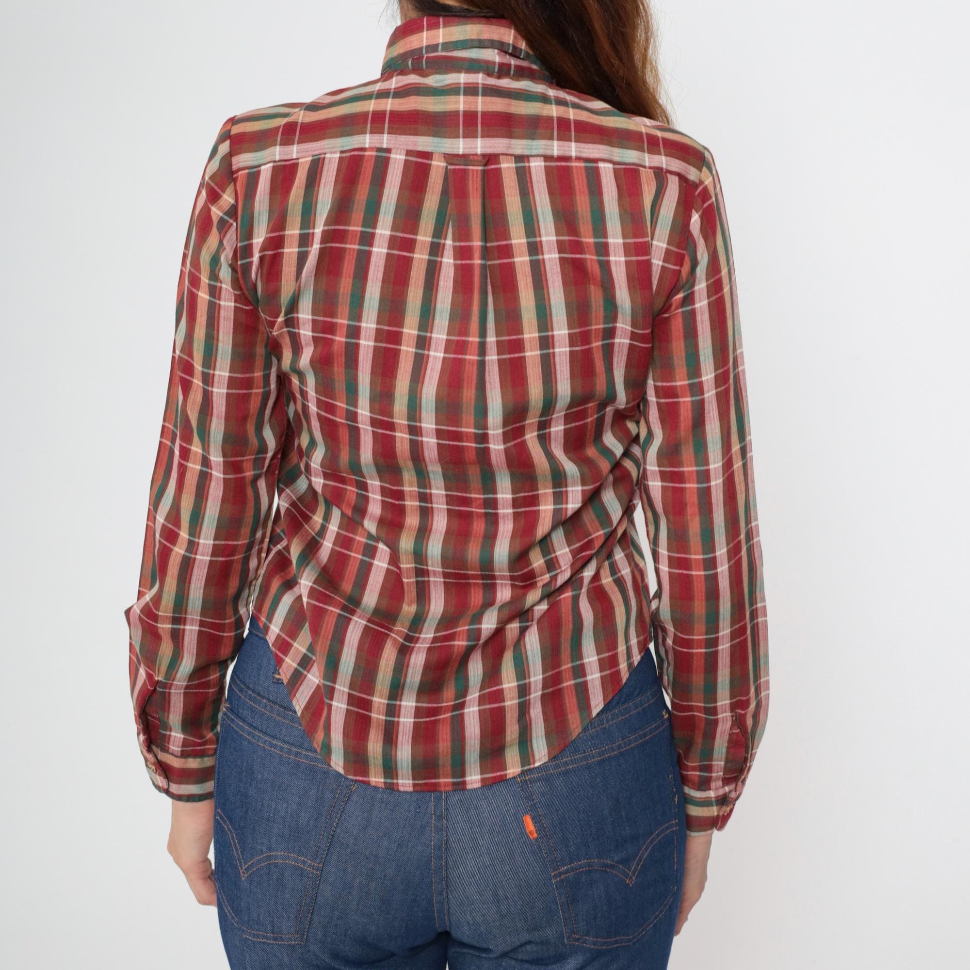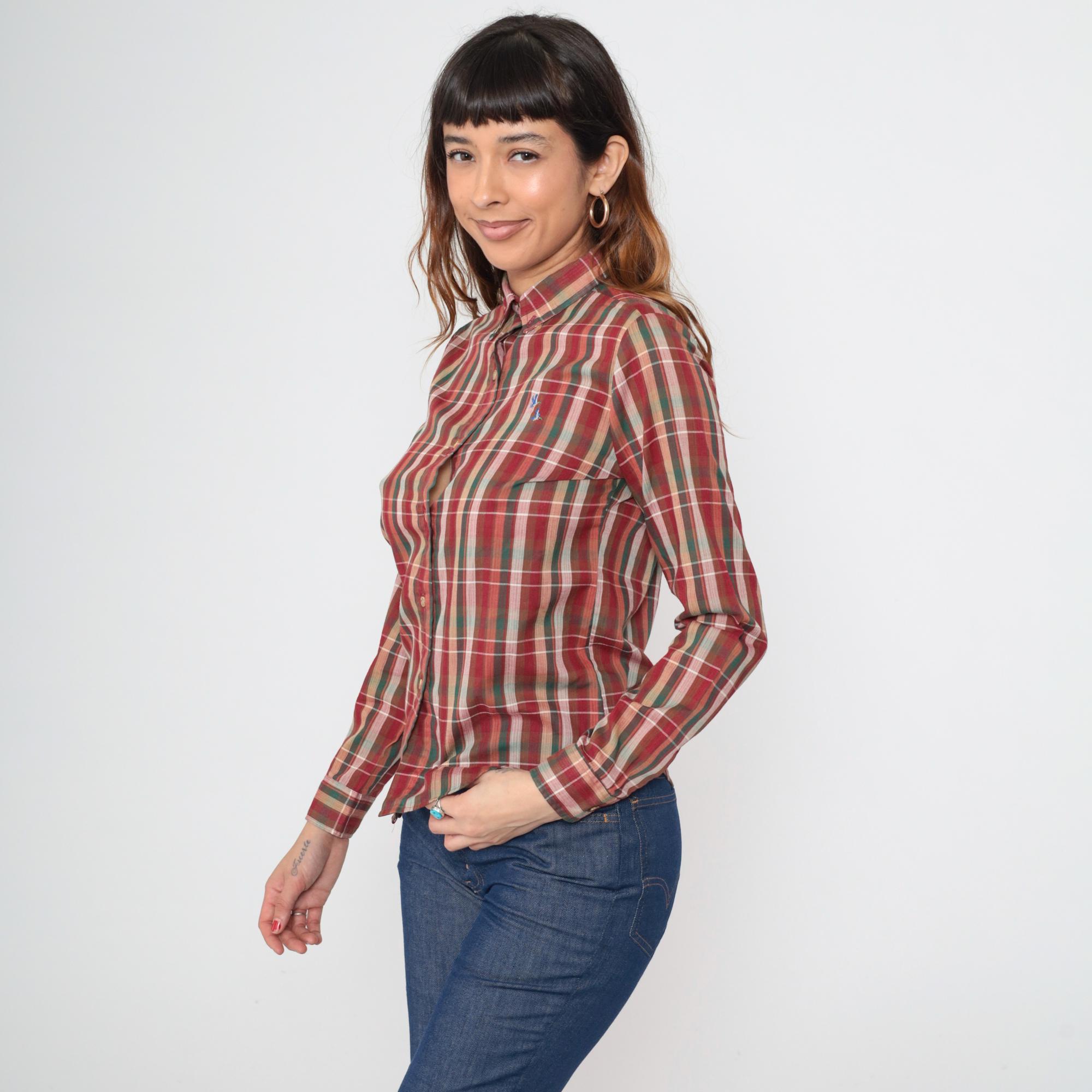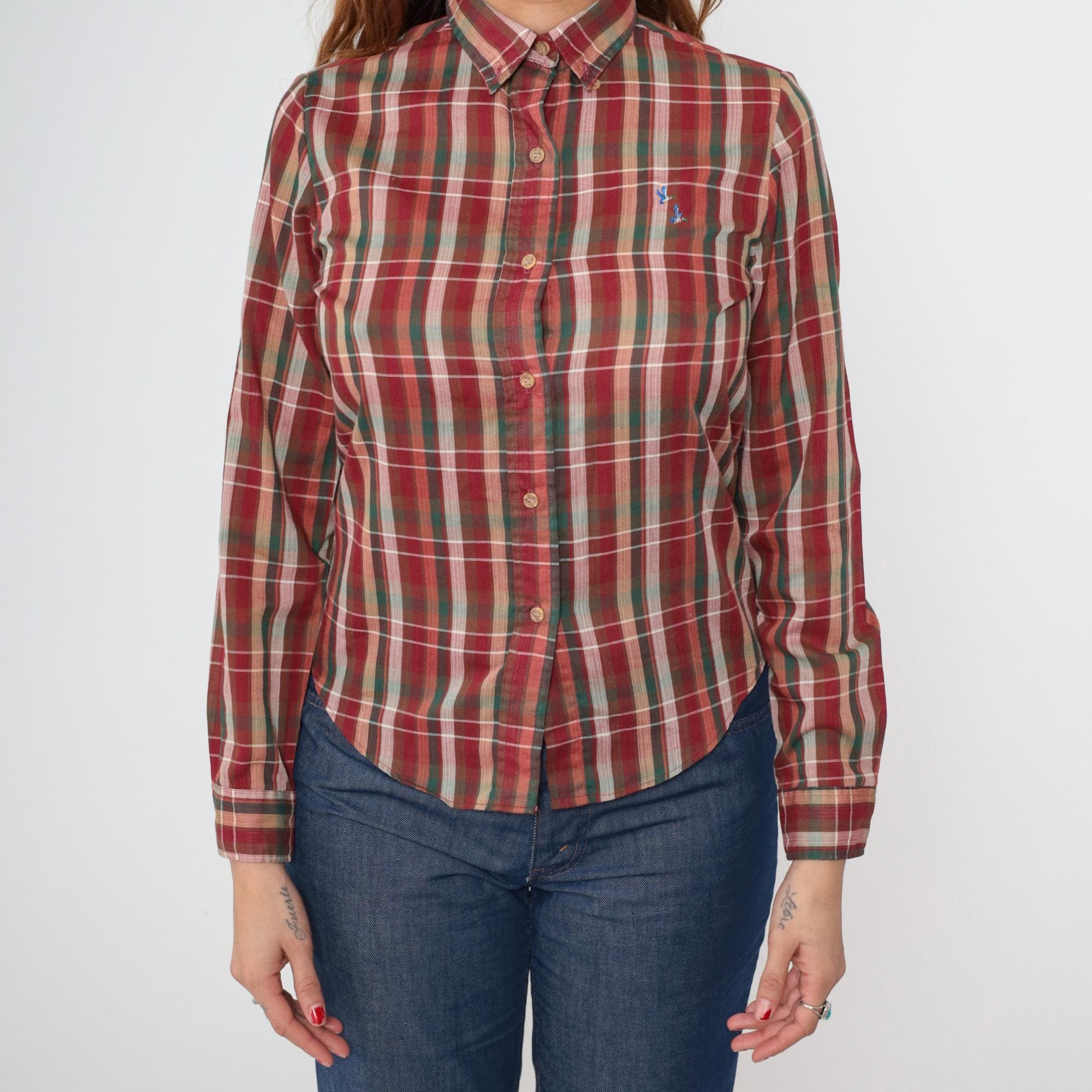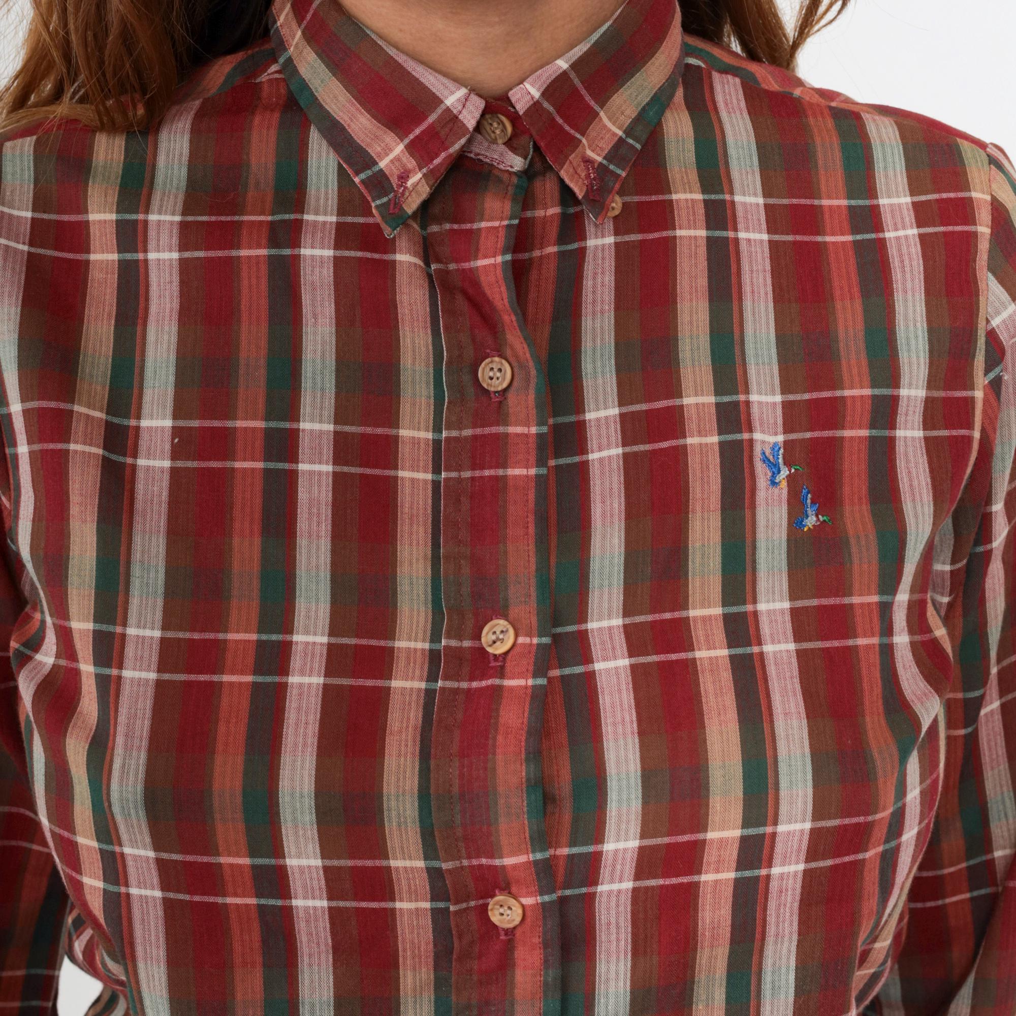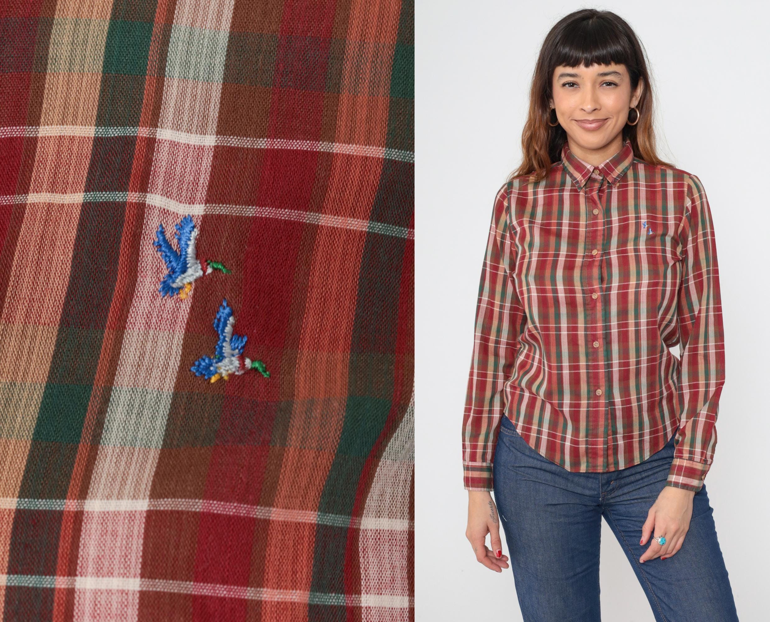 Red and green plaid cotton blend button-down shirt featuring blue embroidered mallard ducks on the chest. Classic button-down collar and full button front. Long sleeves with button cuffs.