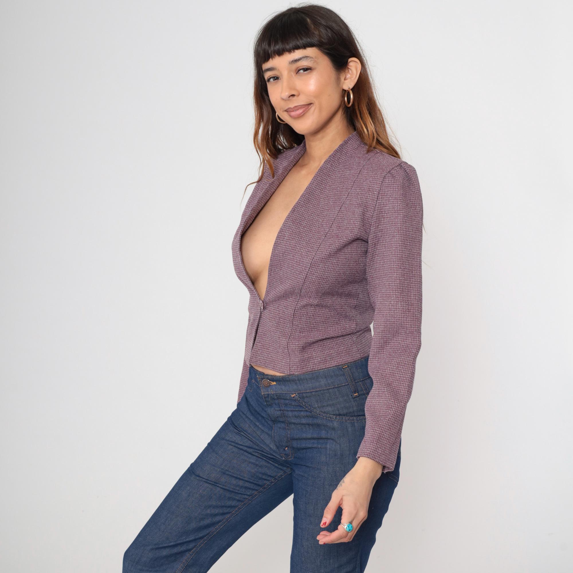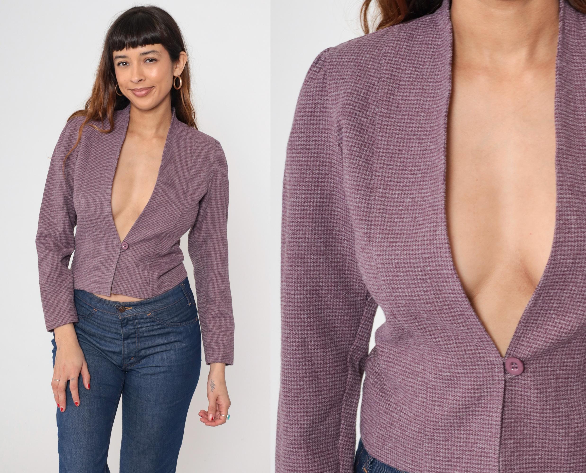 Mauve lilac textured blazer featuring dramatic plunge neckline with single button closure. Cropped length with fitted waist silhouette.