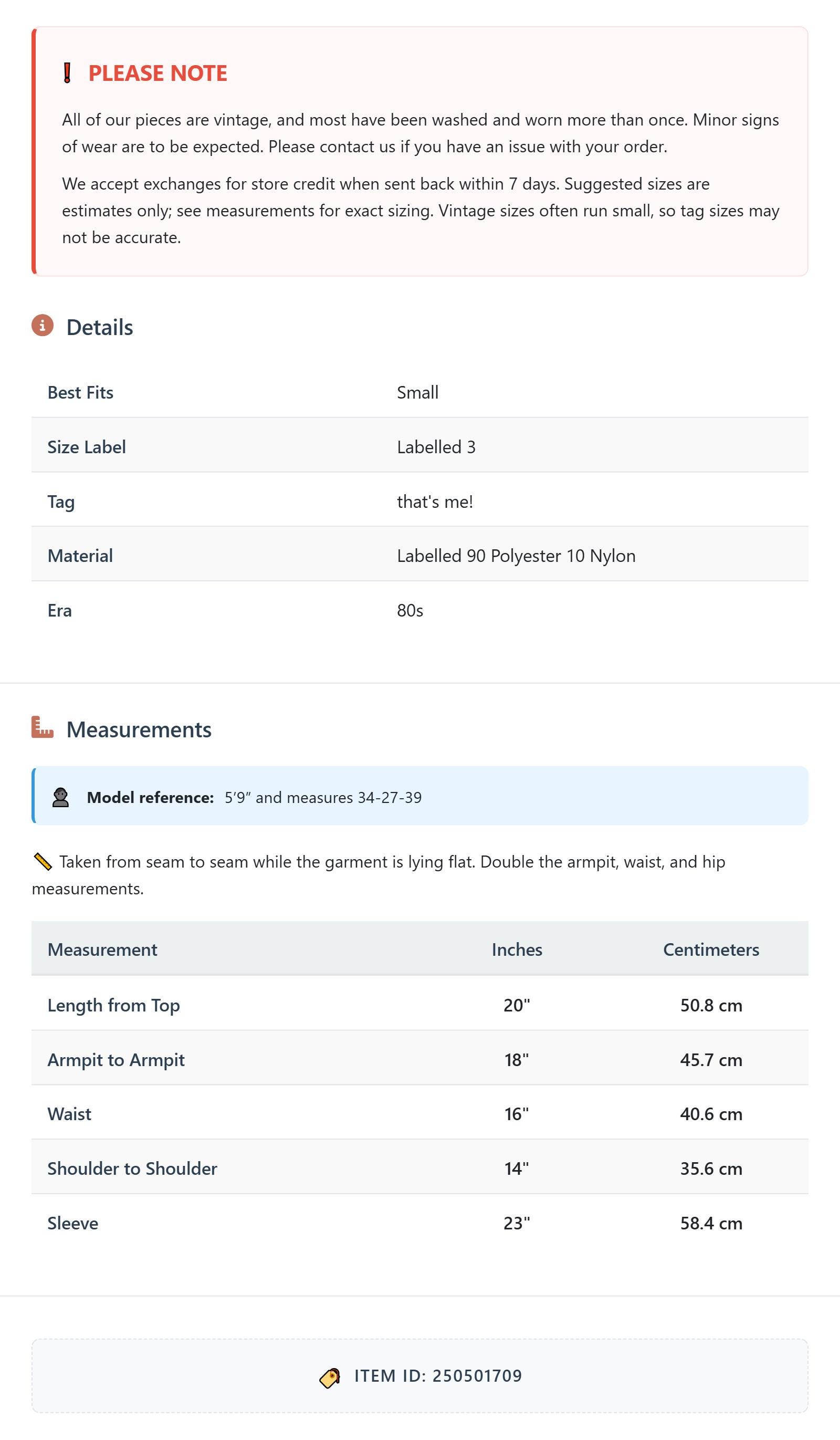 All of our pieces are vintage, and most have been washed and worn more than once. Minor signs of wear are to be expected. Please contact us if you have an issue with your order. We accept exchanges for store credit when sent back within 7 days.