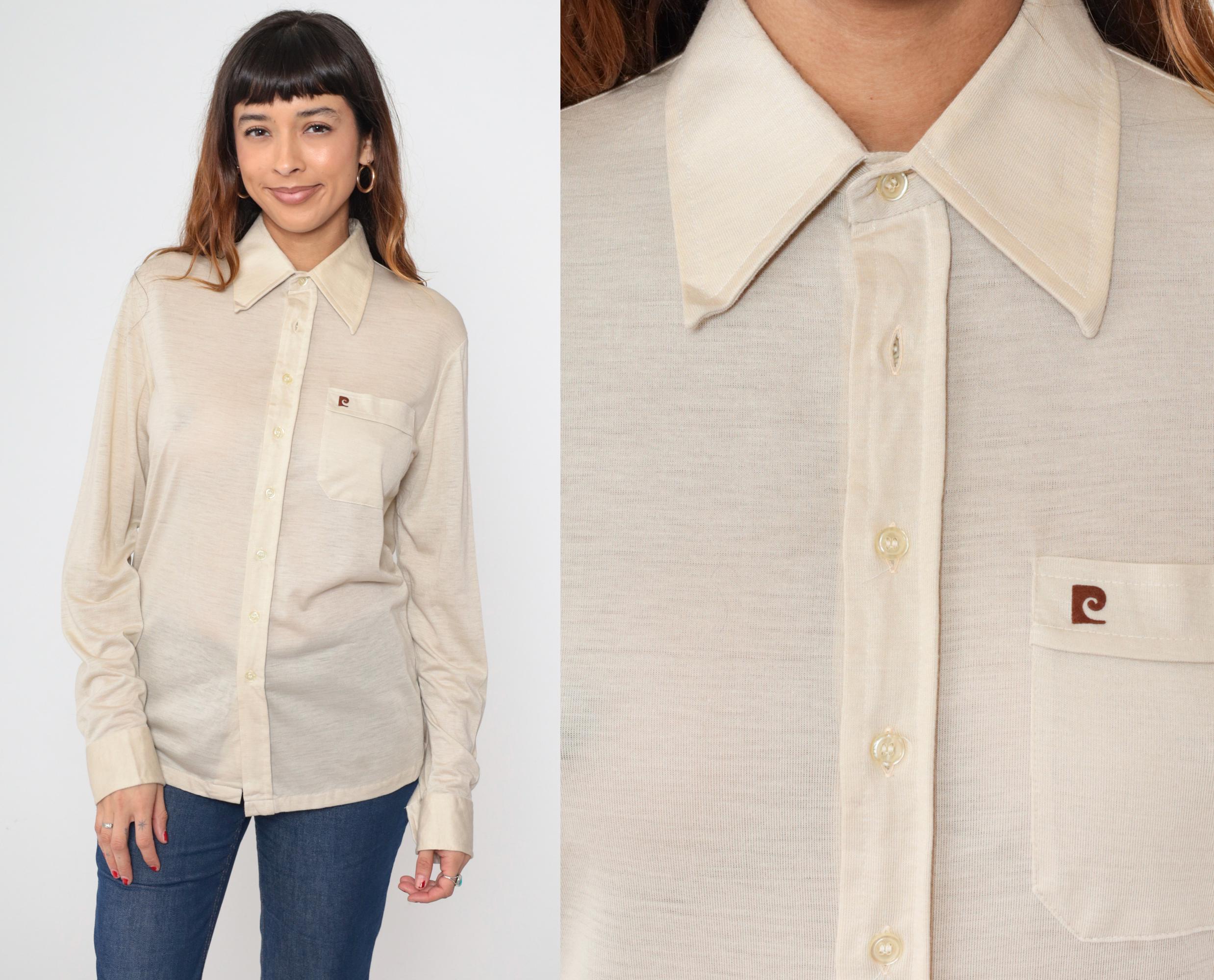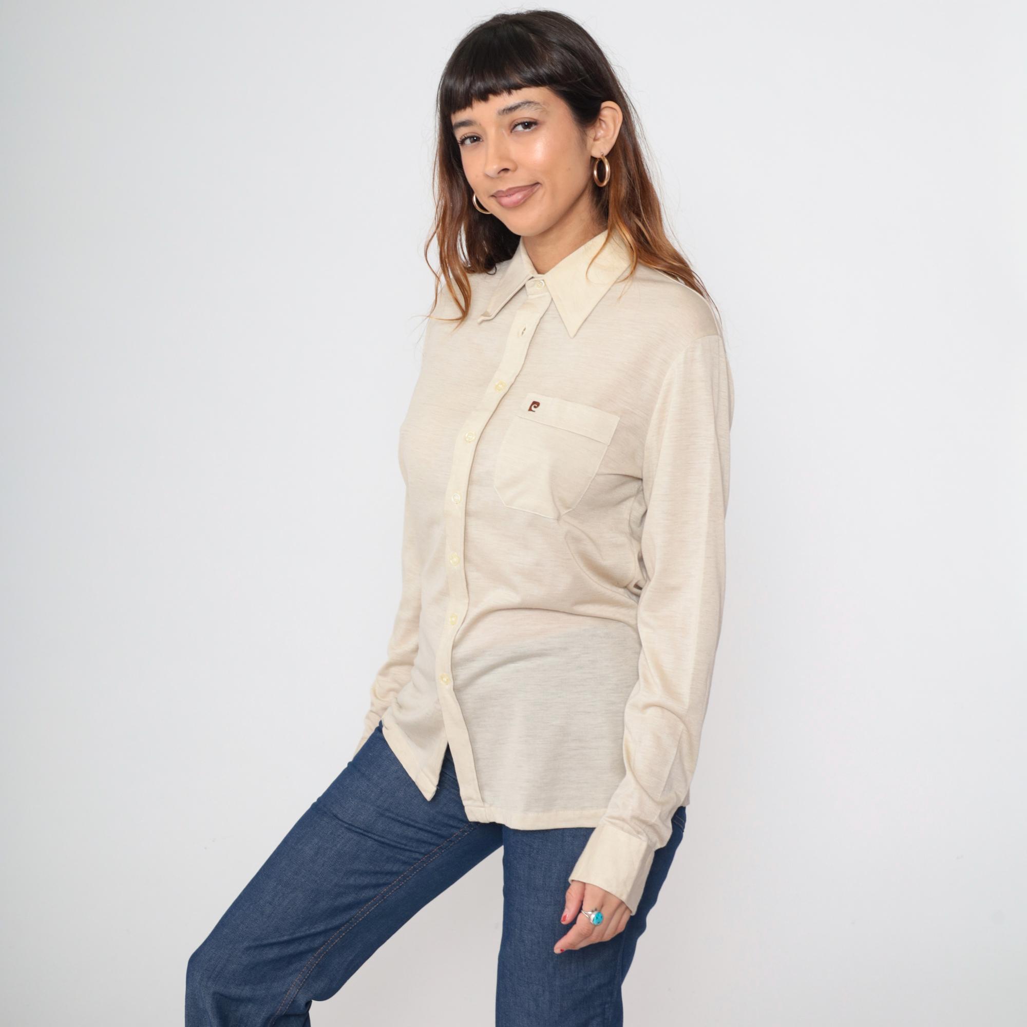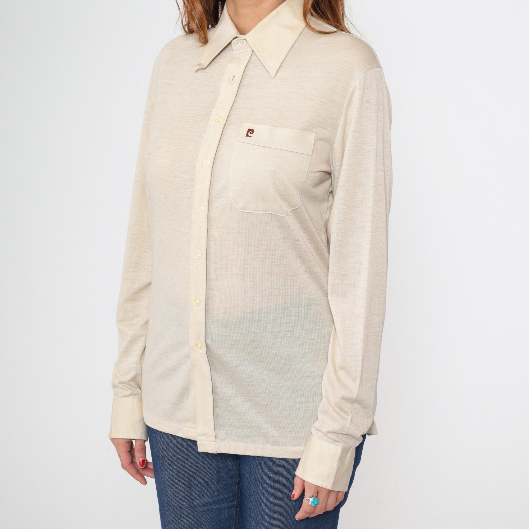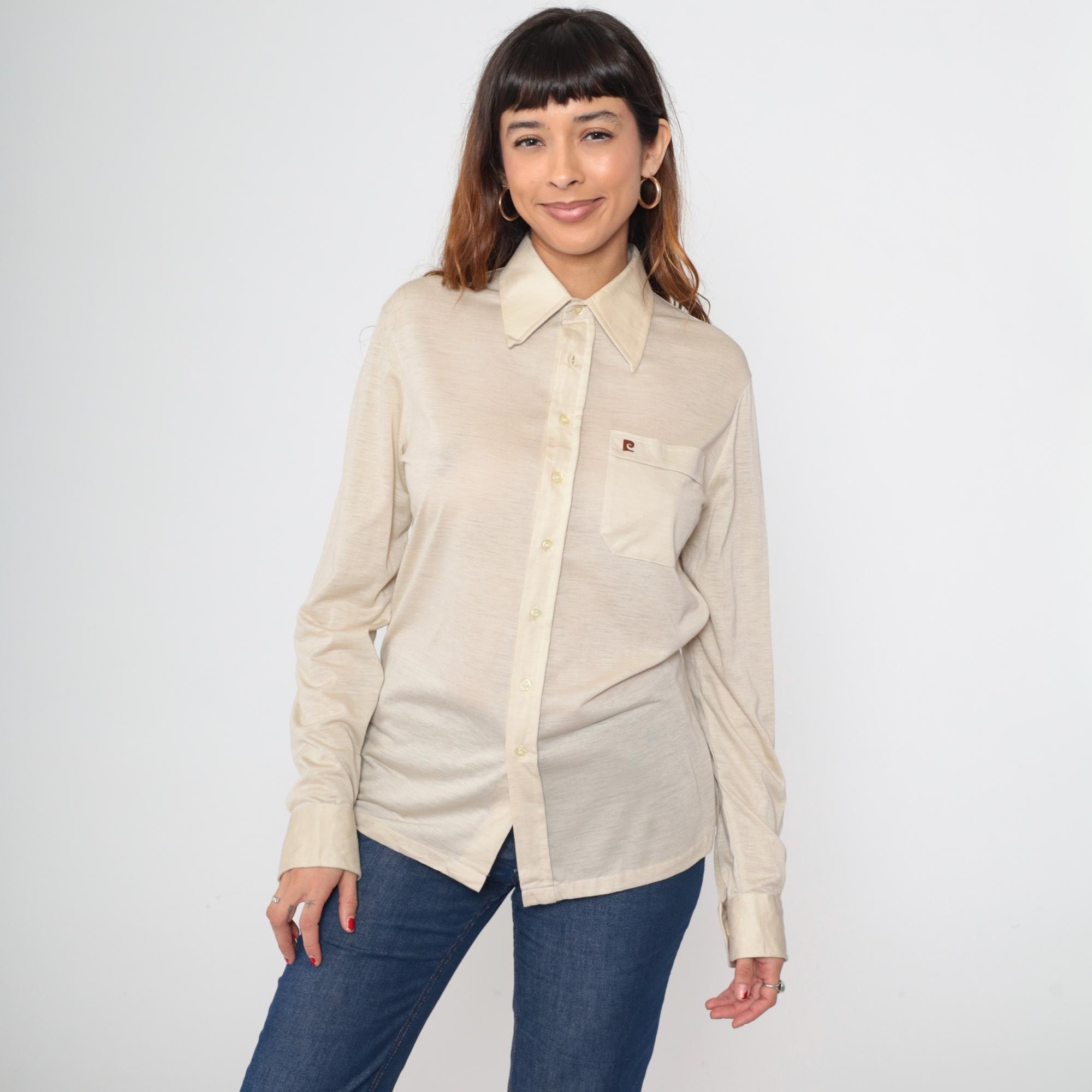 Vintage 80s Pierre Cardin shirt in beige with a pointed collar and long sleeves. Features a front button closure and single chest pocket with logo detail.