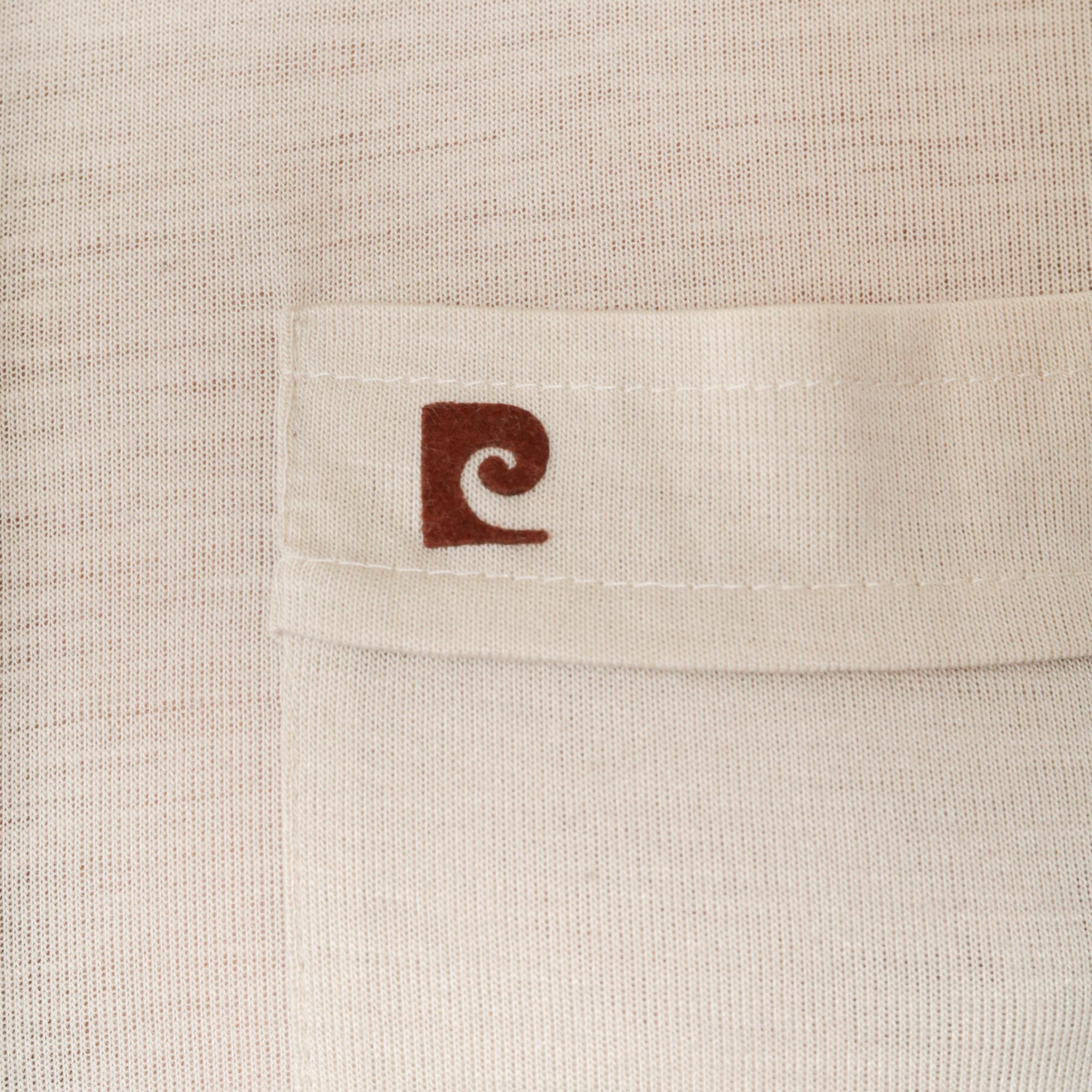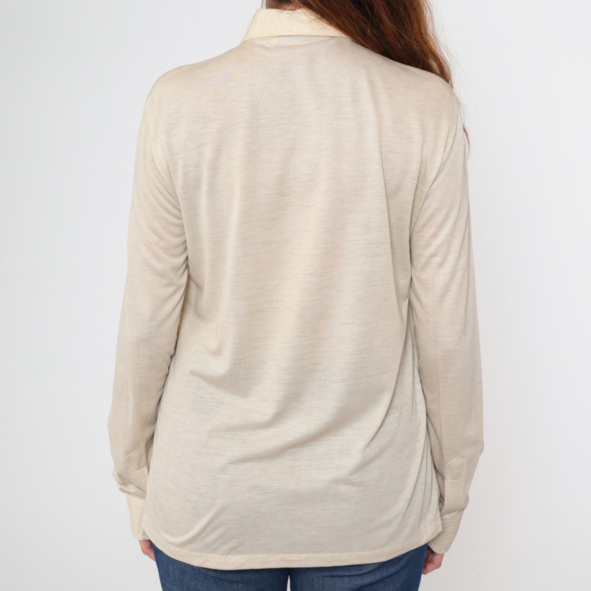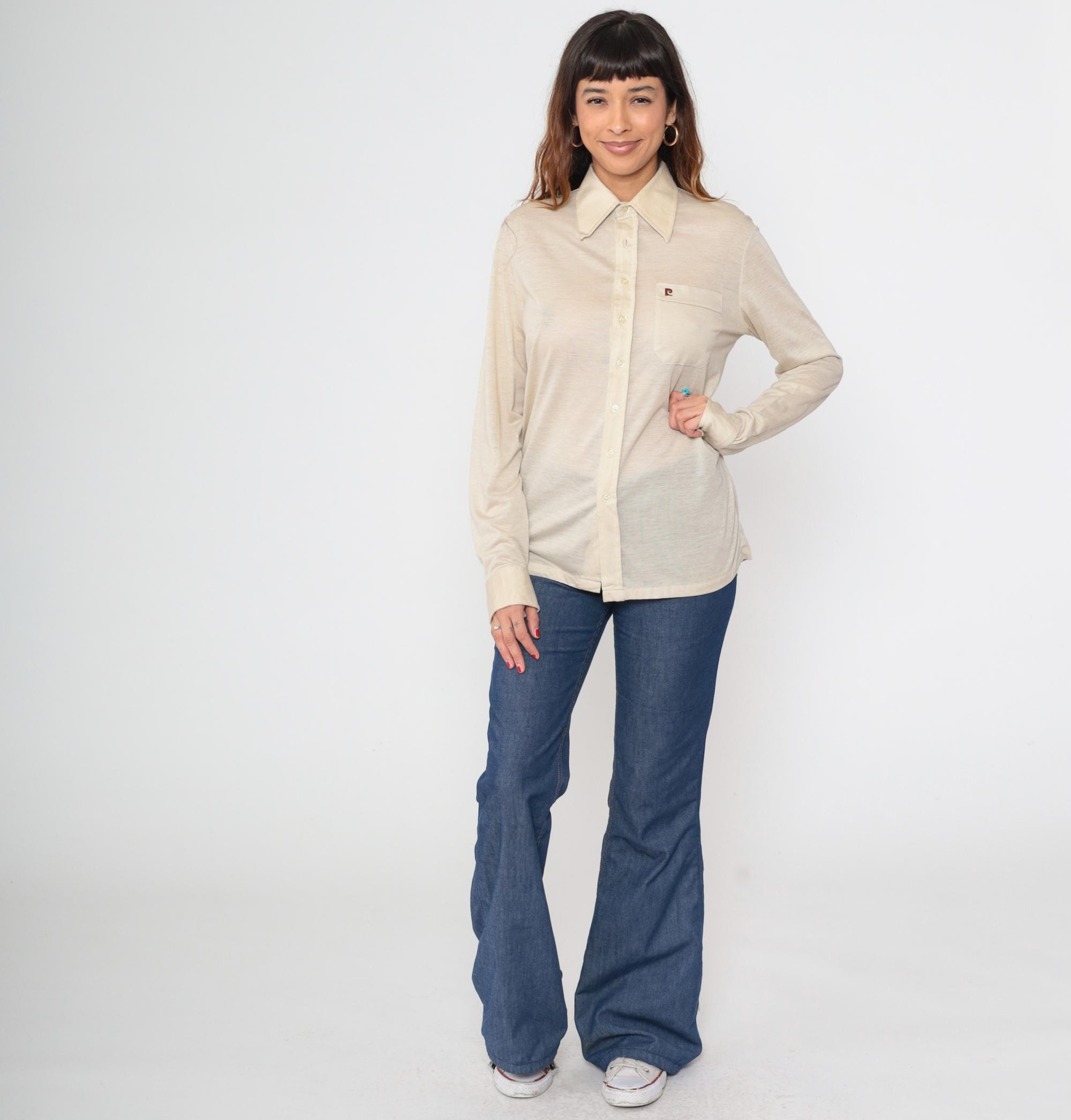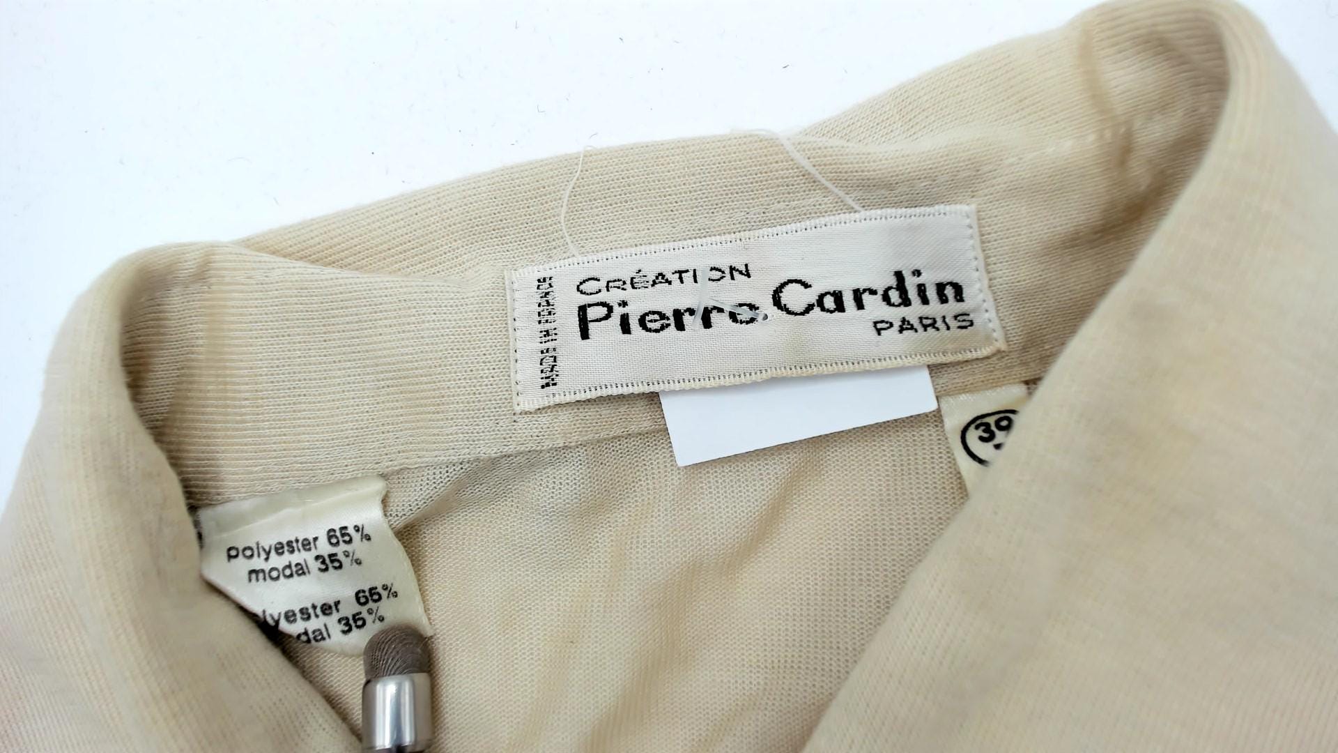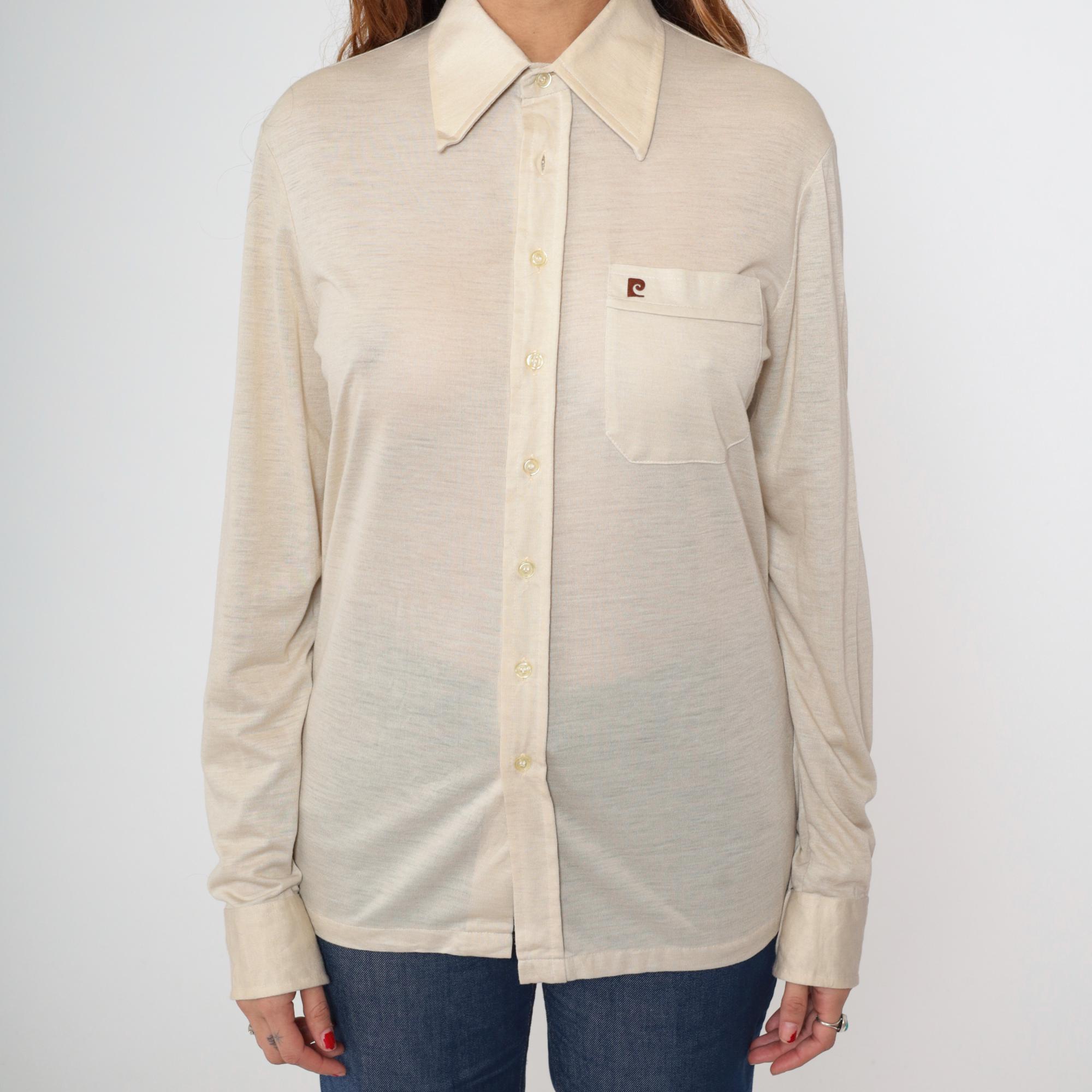 Vintage 80s Pierre Cardin shirt in beige with a pointed collar and long sleeves. Features a front button closure and single chest pocket with logo detail.