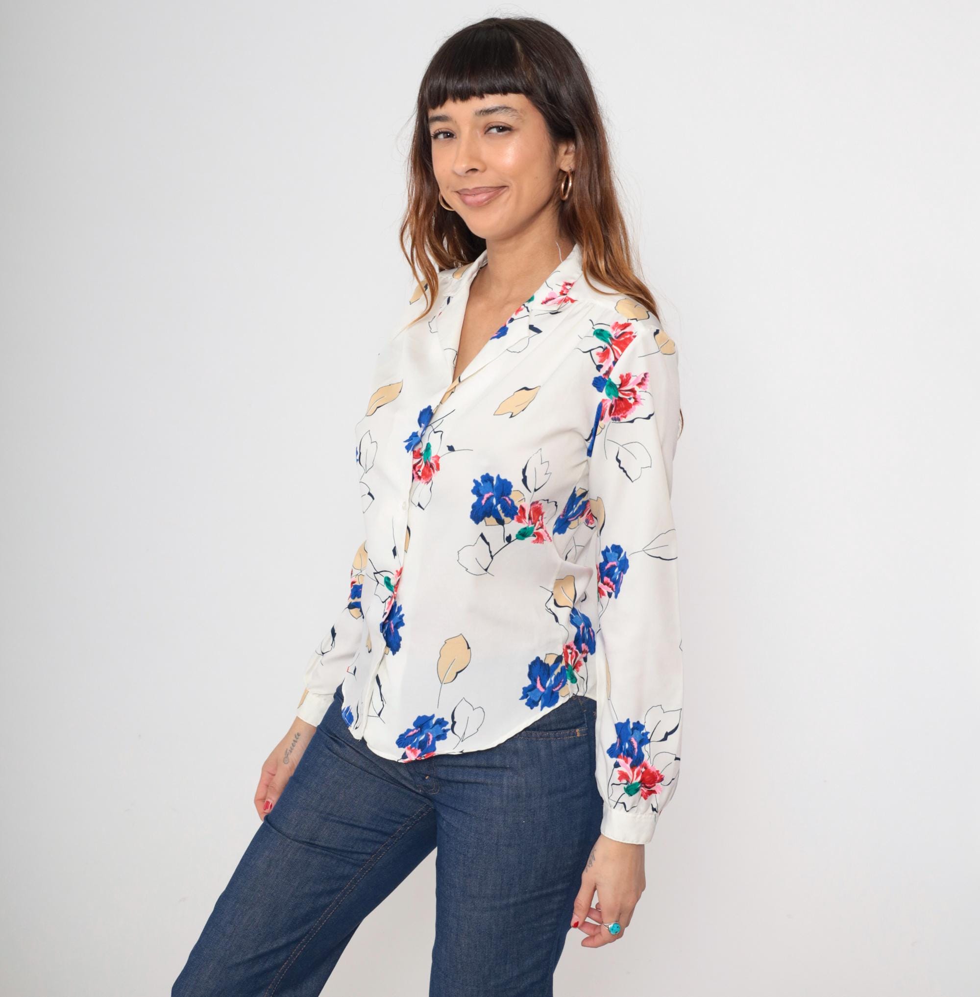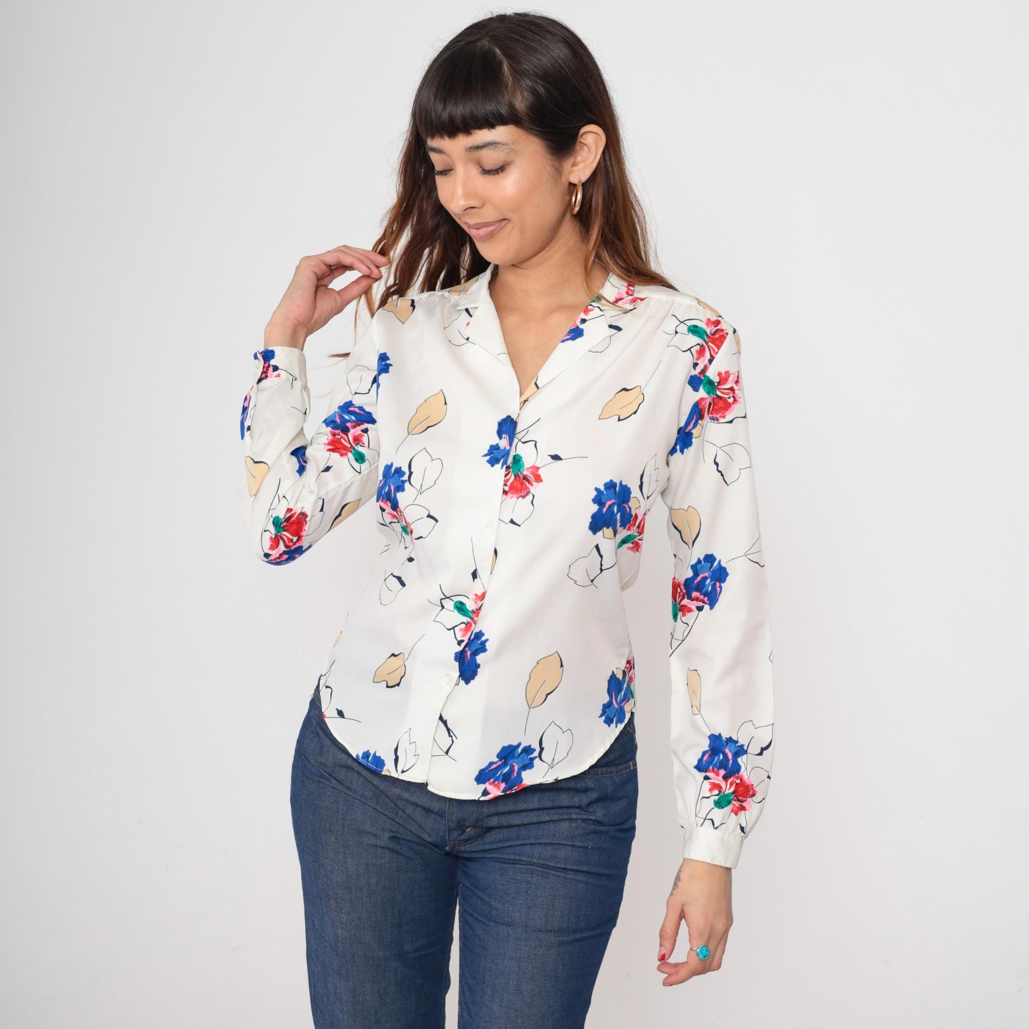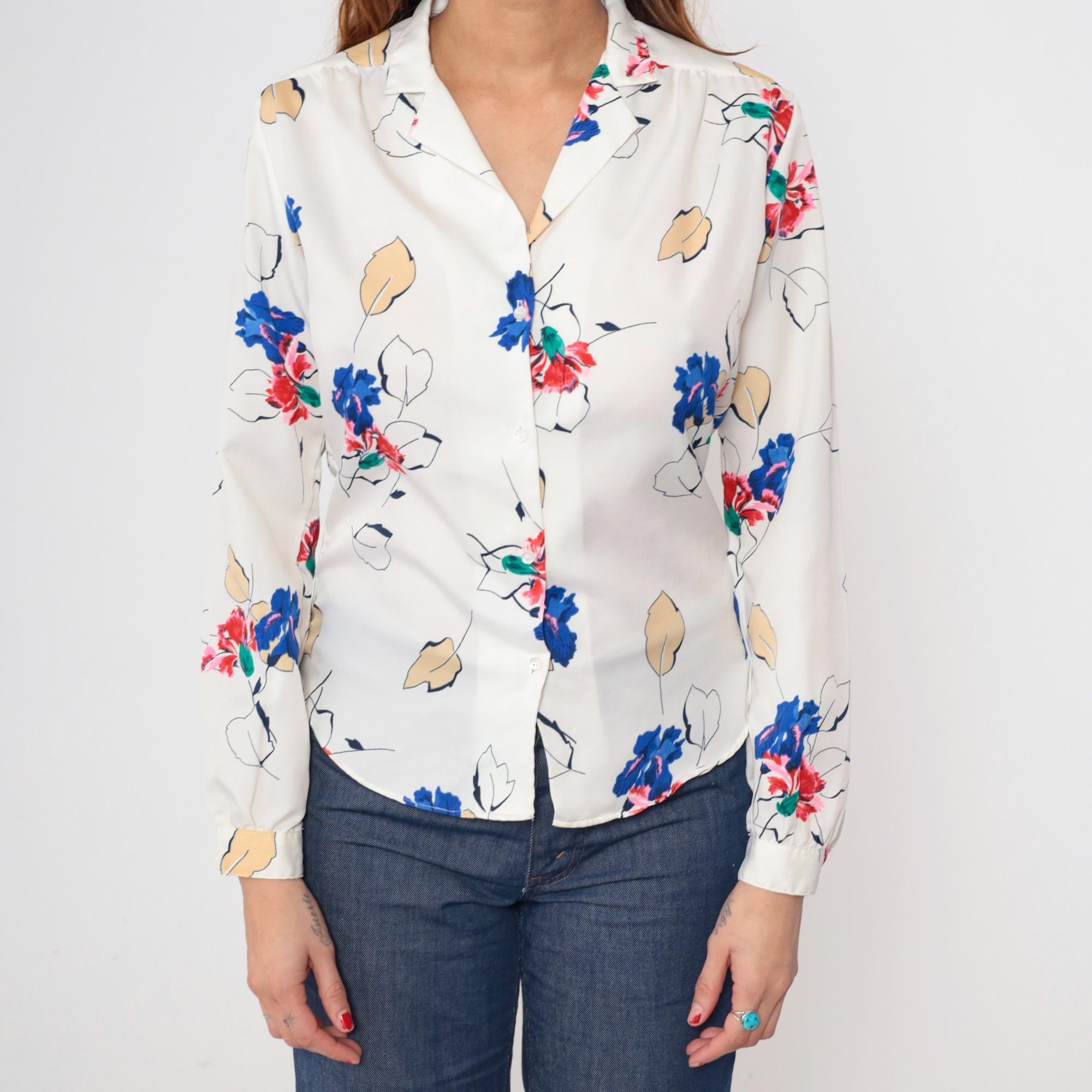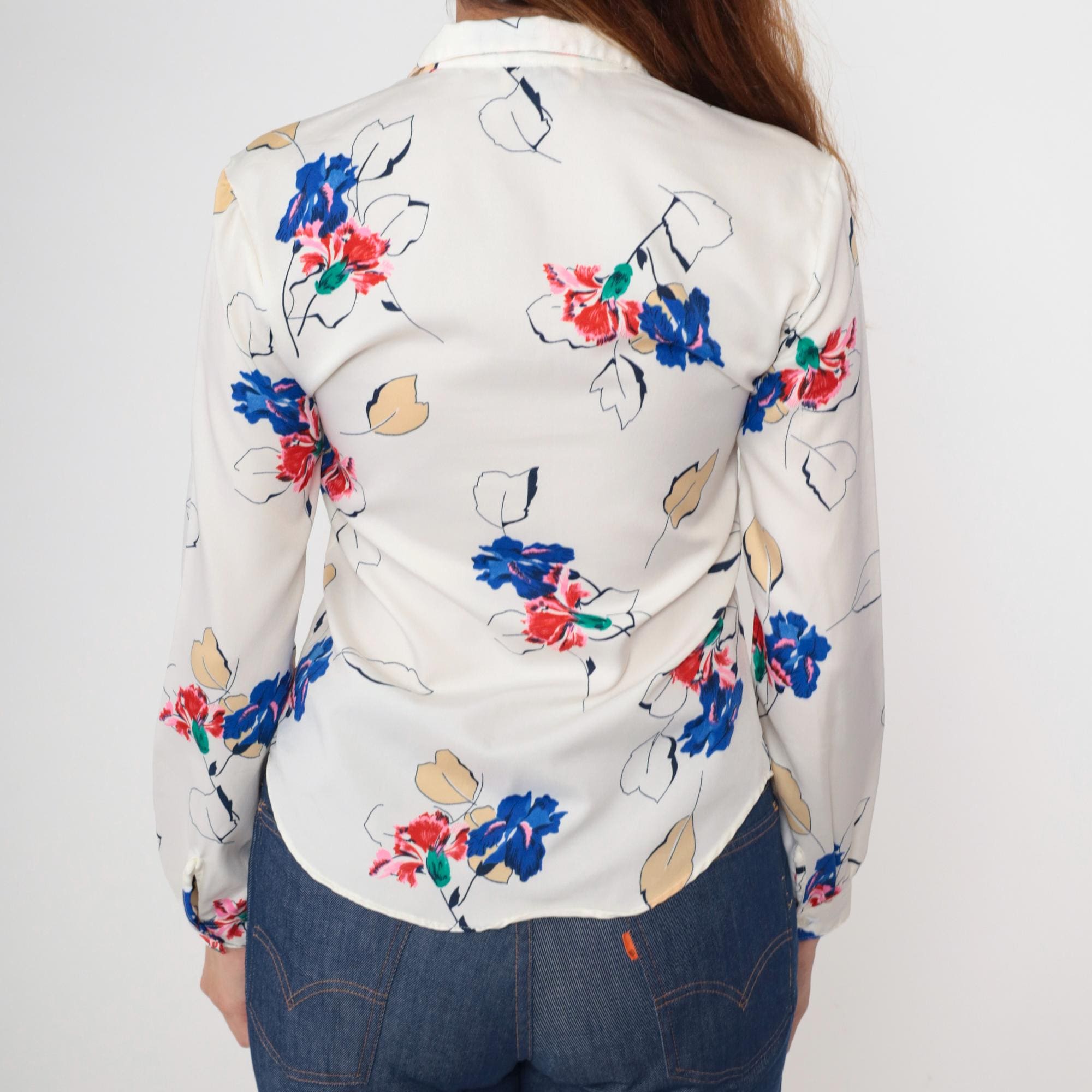 Vintage 70s button up shirt features a white base with bold red, blue, and yellow floral abstract print. Designed with a collared neckline, long sleeves, and button front closure.