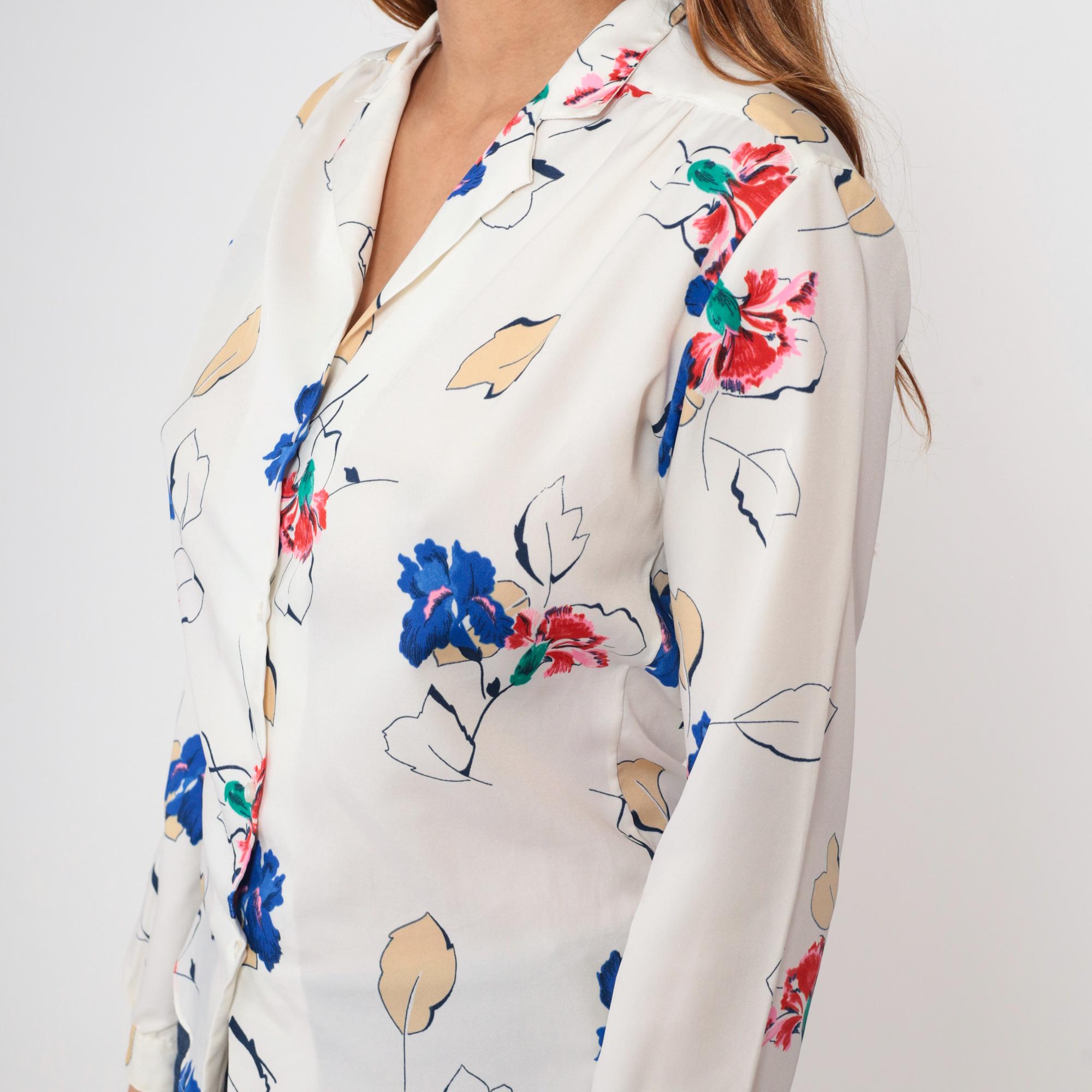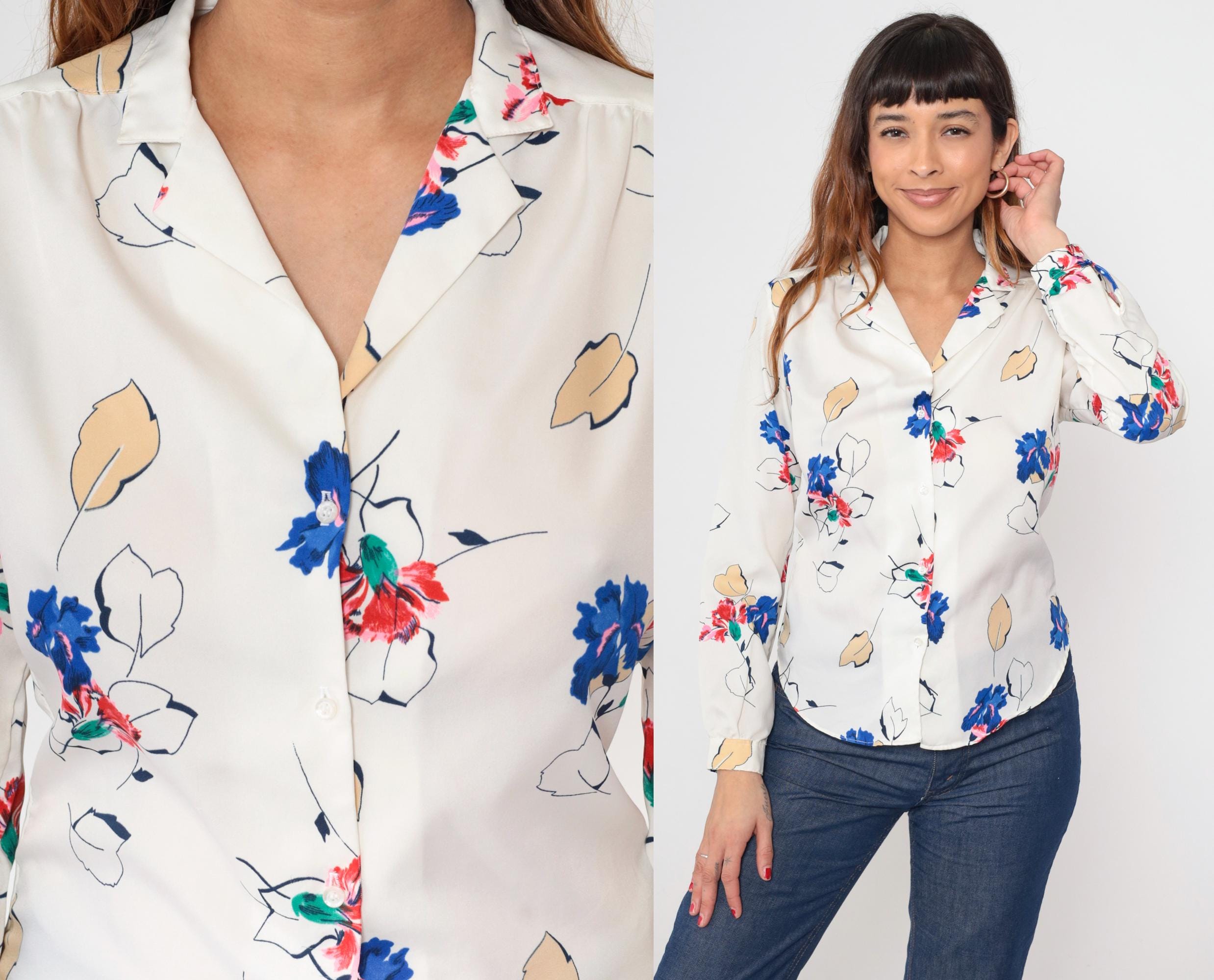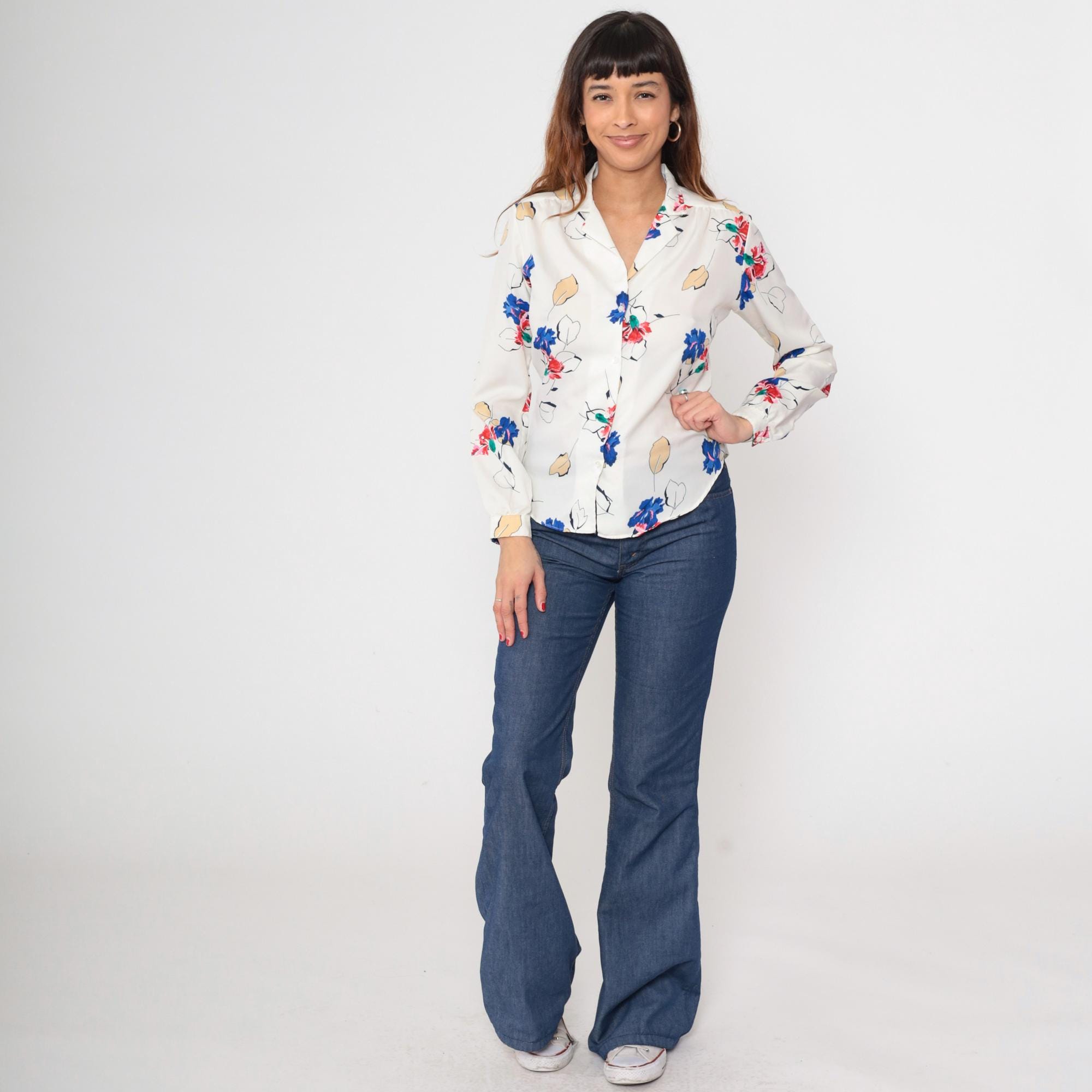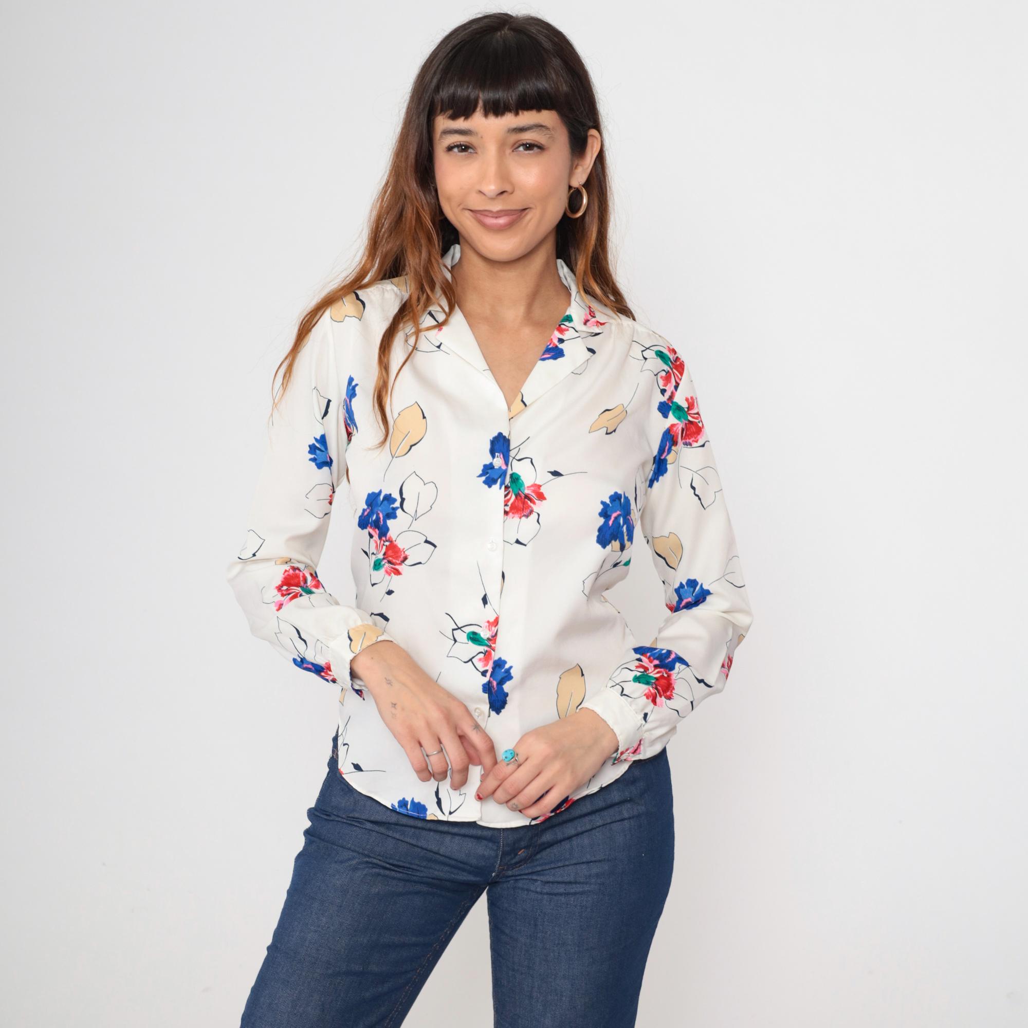 Vintage 70s button up shirt features a white base with bold red, blue, and yellow floral abstract print. Designed with a collared neckline, long sleeves, and button front closure.