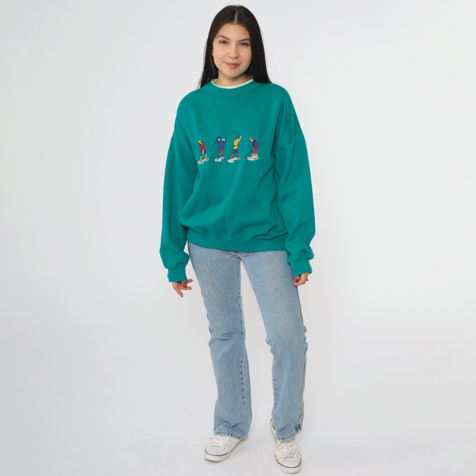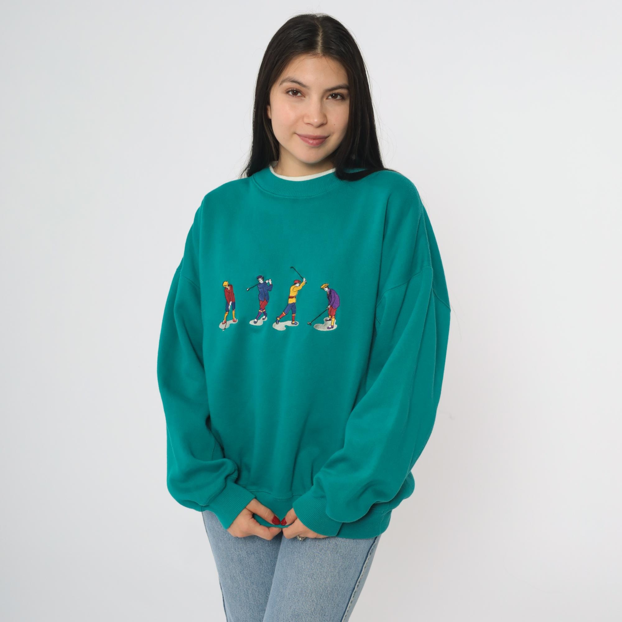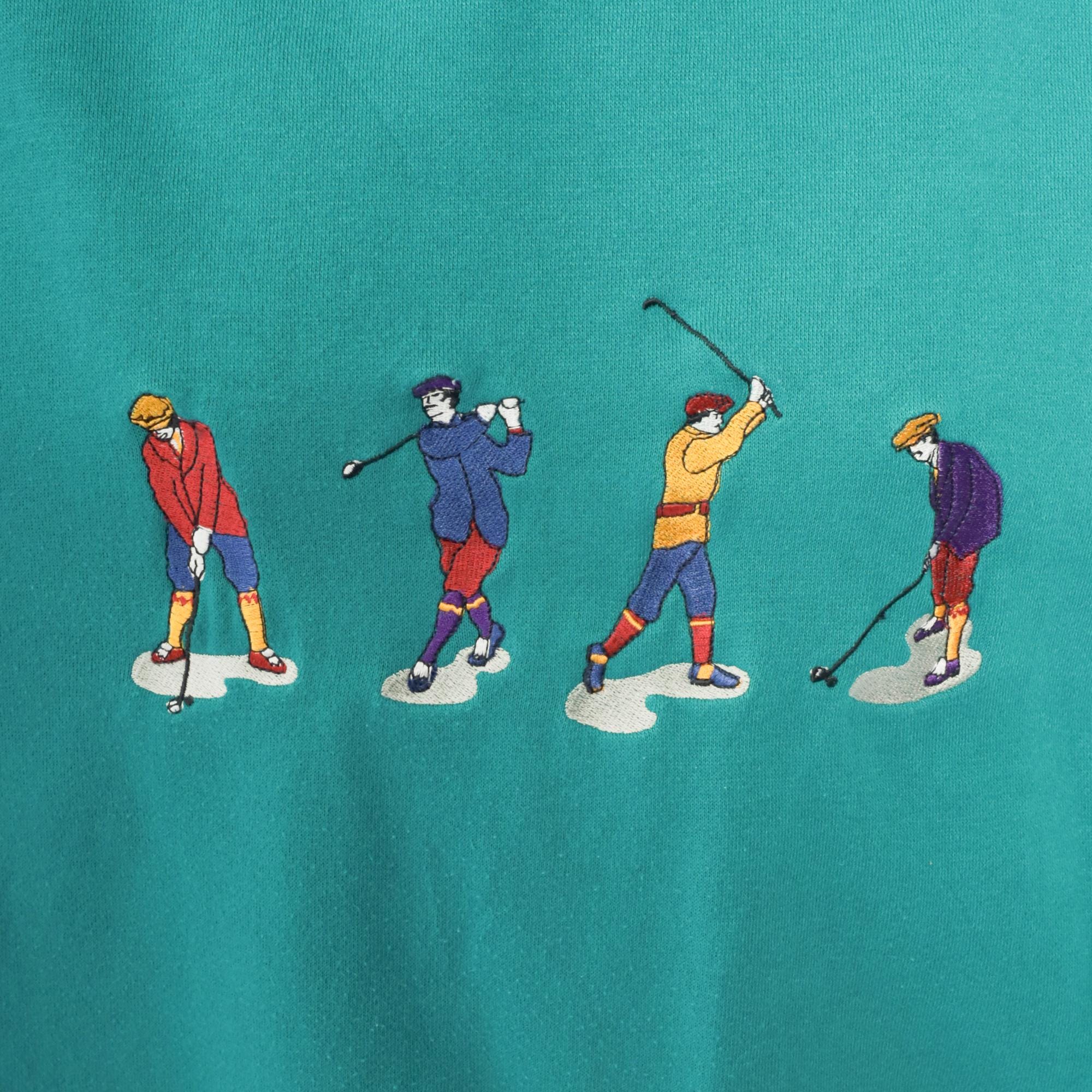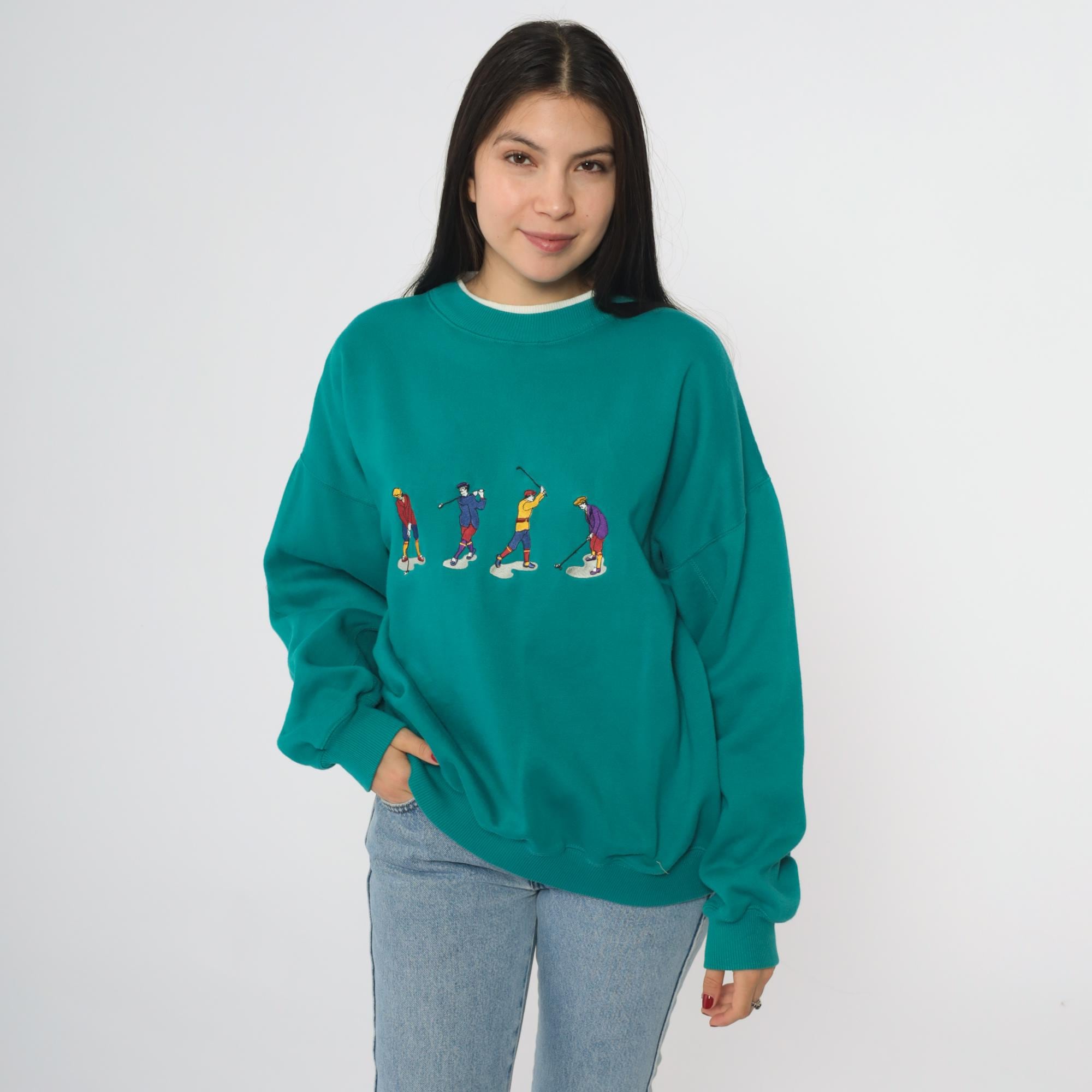 Vintage 90s Claybrooke Sport golf sweatshirt in teal green featuring embroidered golfer graphics across the chest. Designed with a classic crewneck, dropped shoulders, and long sleeves.