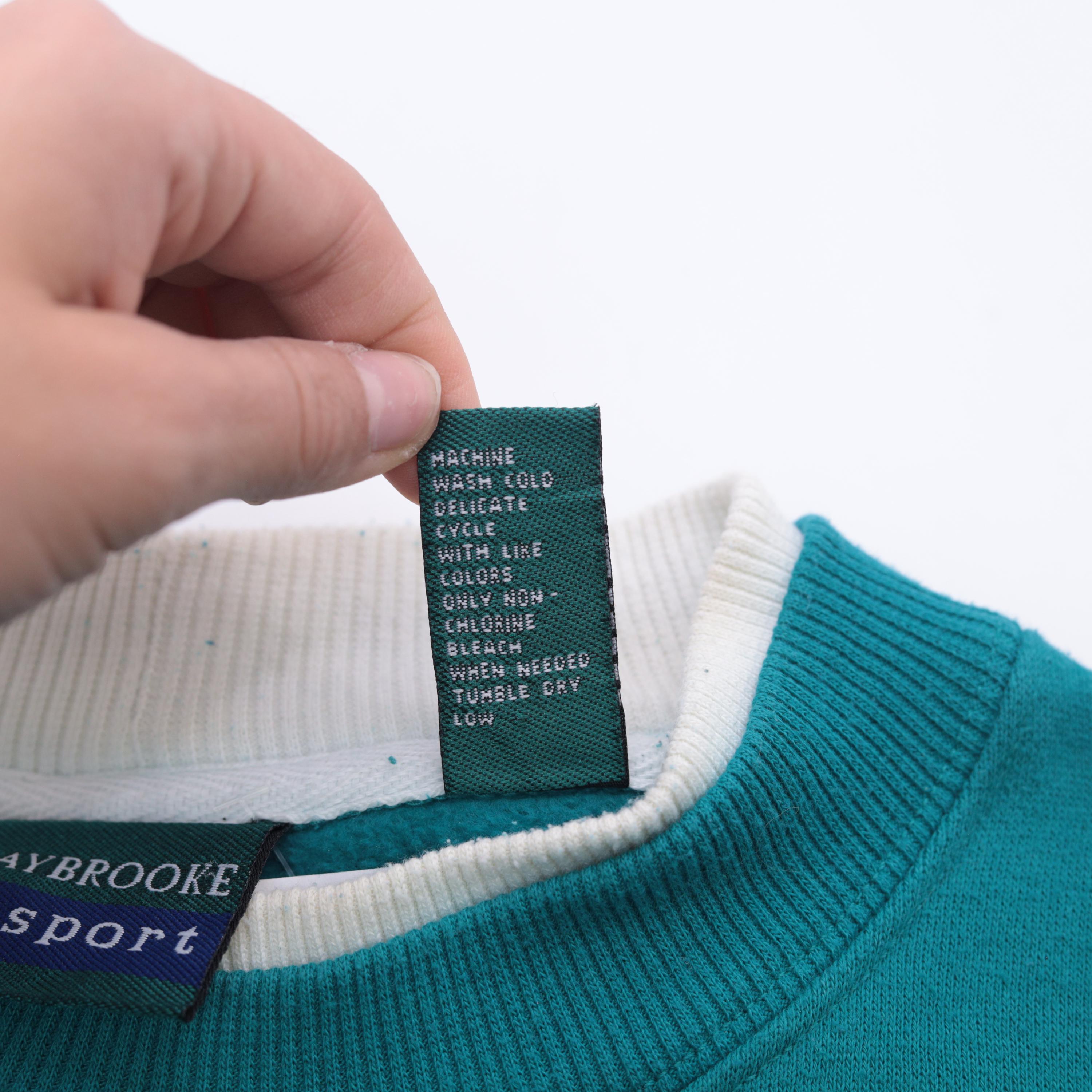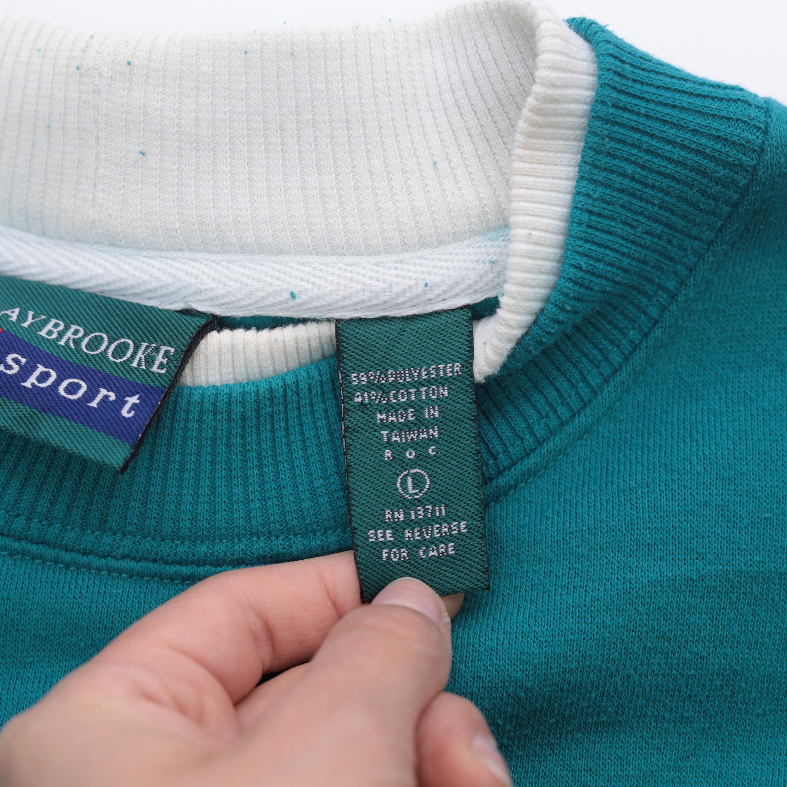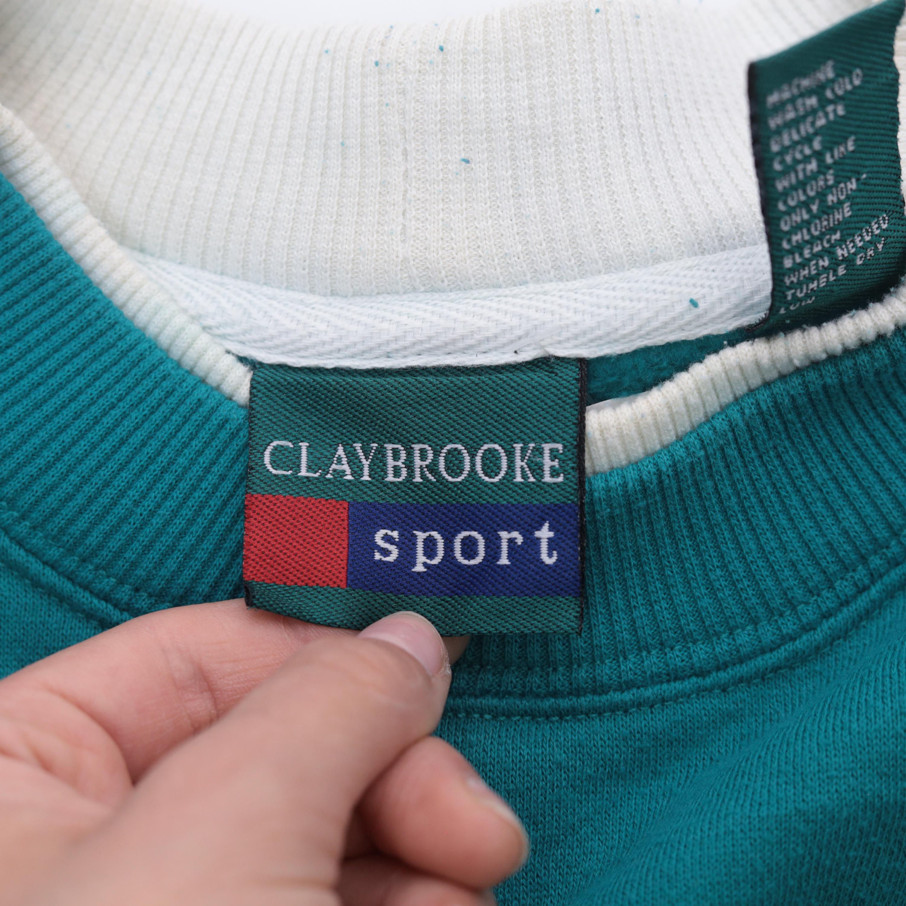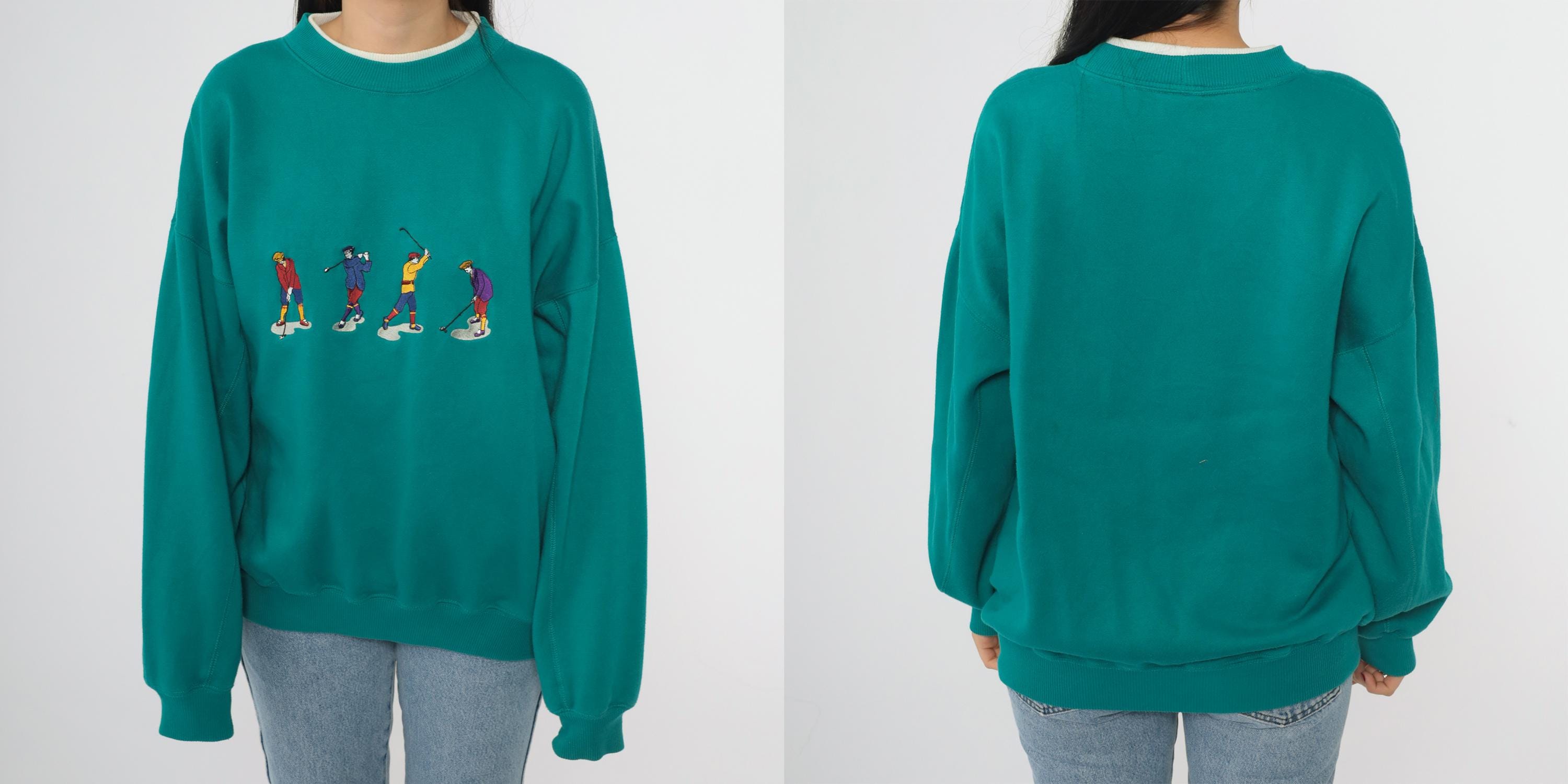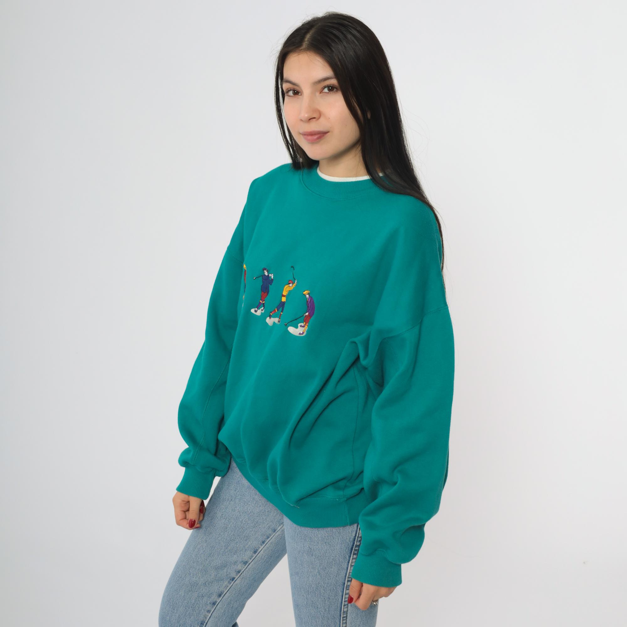 Vintage 90s Claybrooke Sport golf sweatshirt in teal green featuring embroidered golfer graphics across the chest. Designed with a classic crewneck, dropped shoulders, and long sleeves.