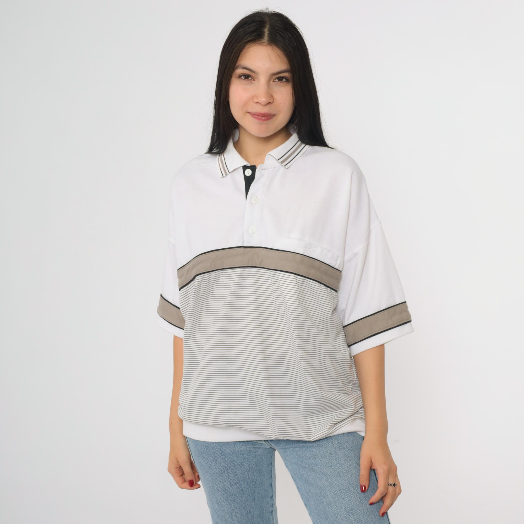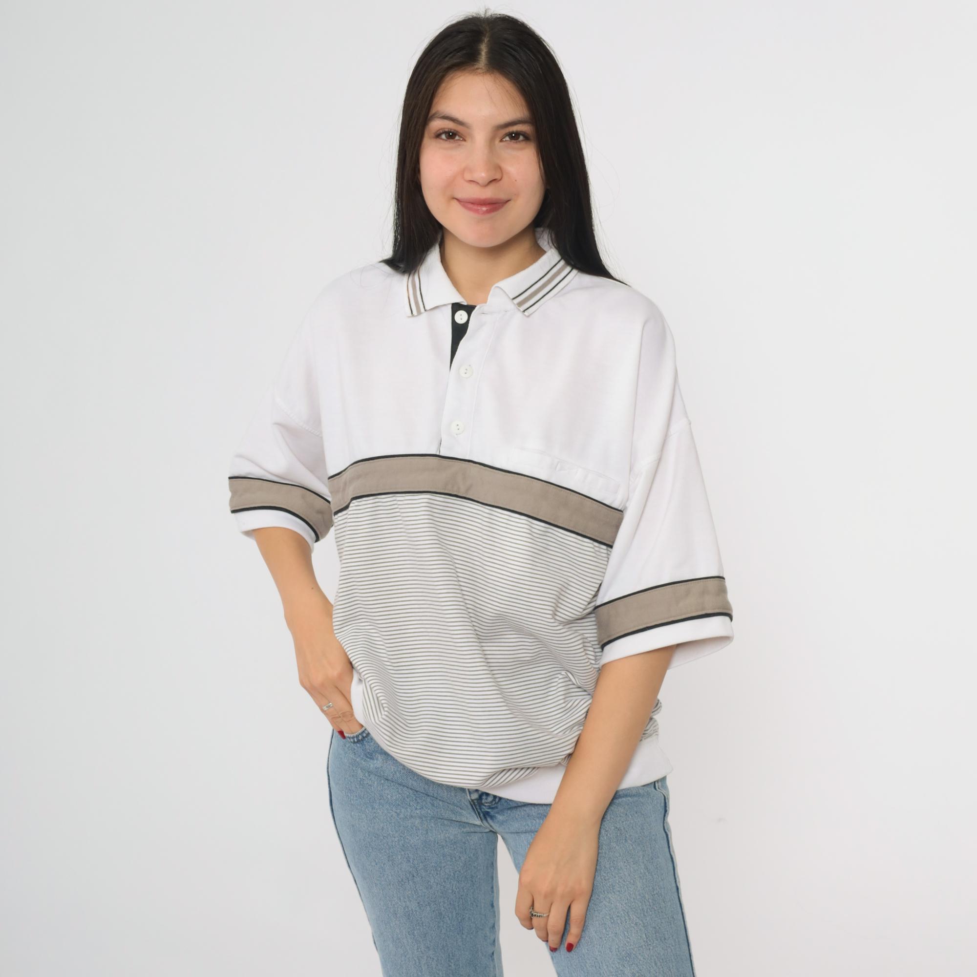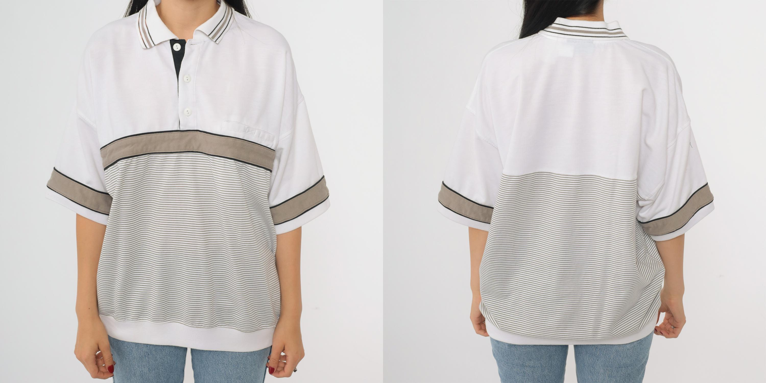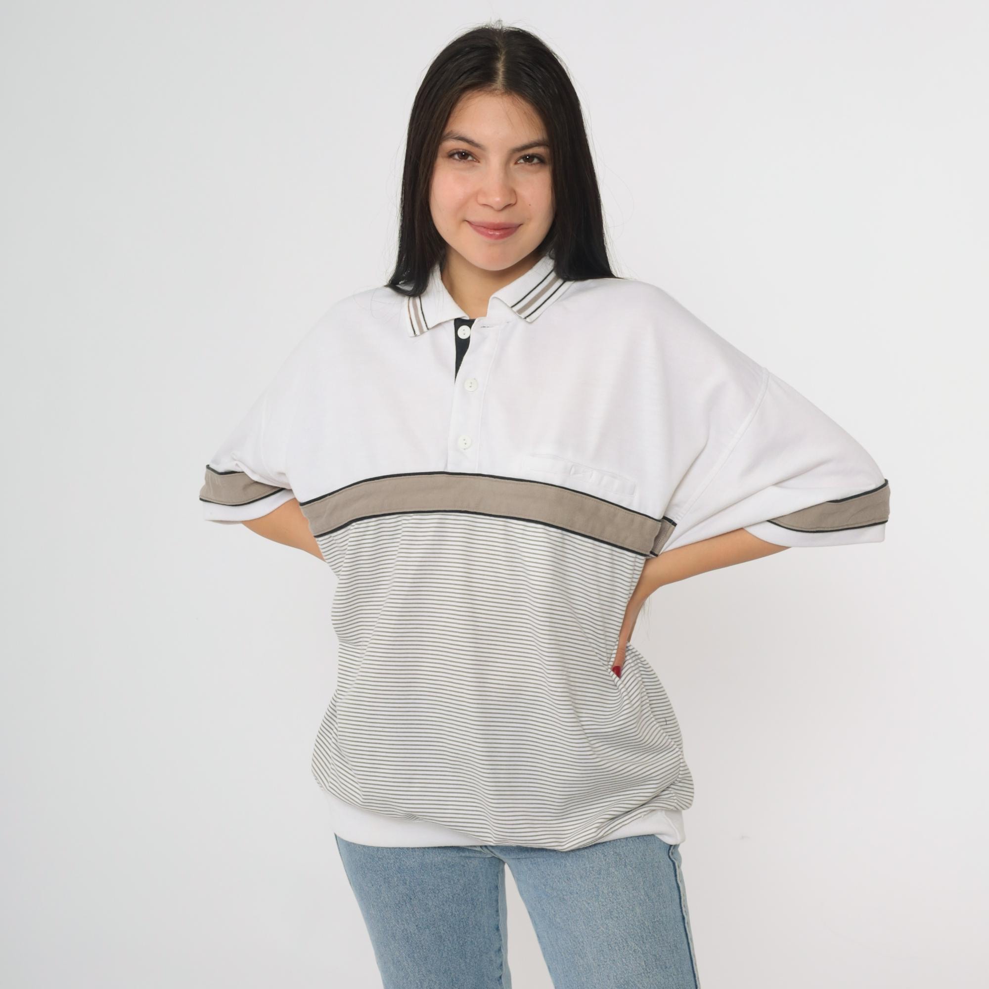 Vintage 90s Puritan polo shirt in white with taupe and black colorblock accents. Features a striped panel across the chest and sleeves, a three-button placket, short sleeves, and an oversized fit.