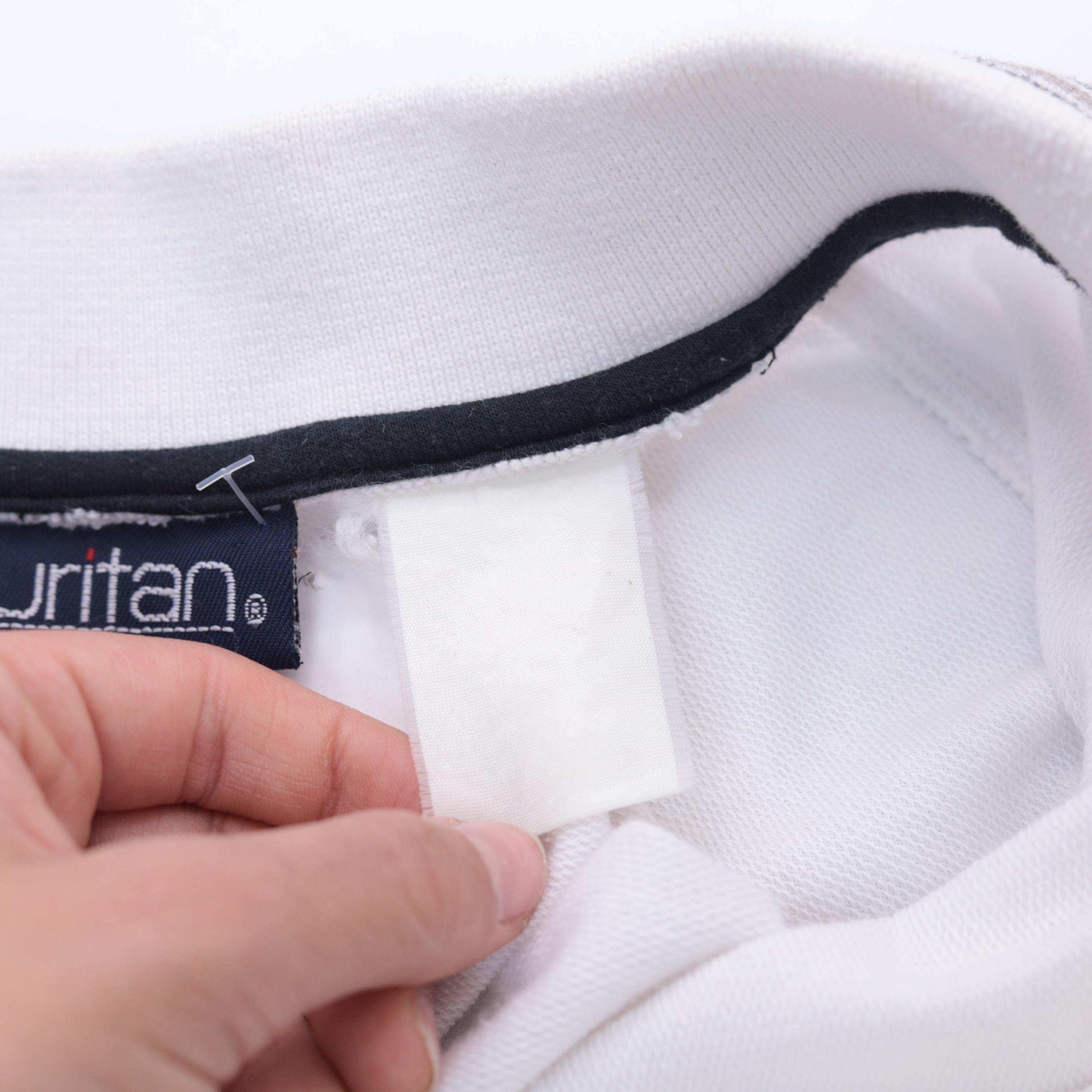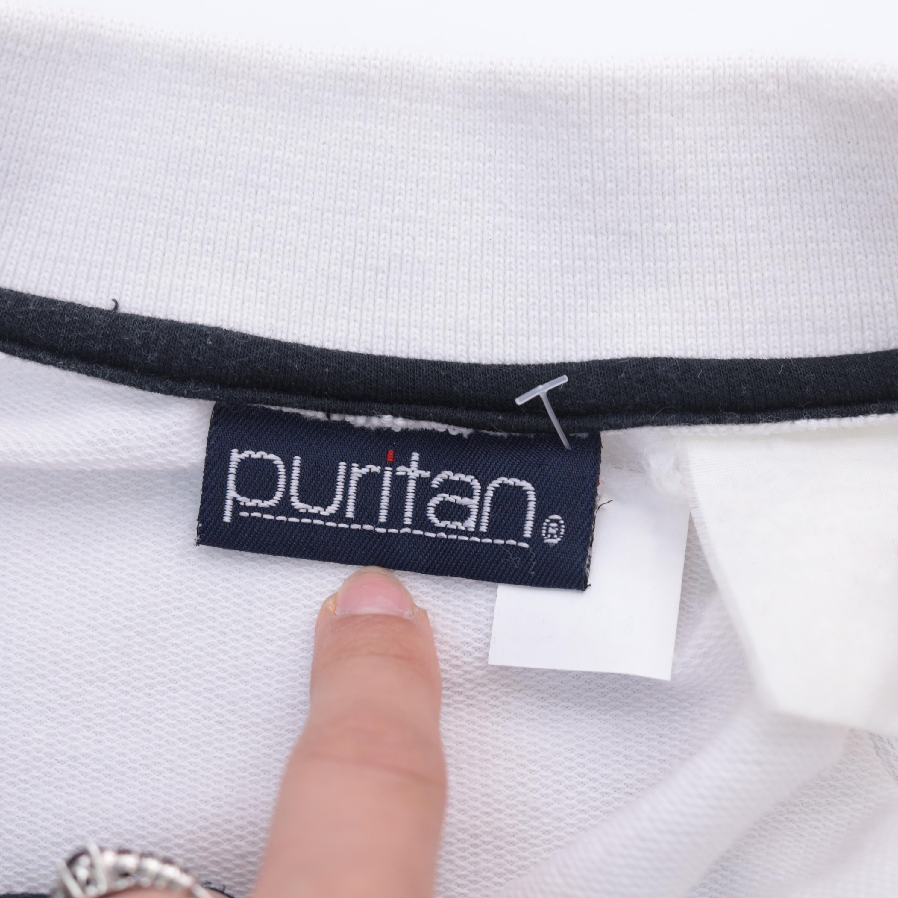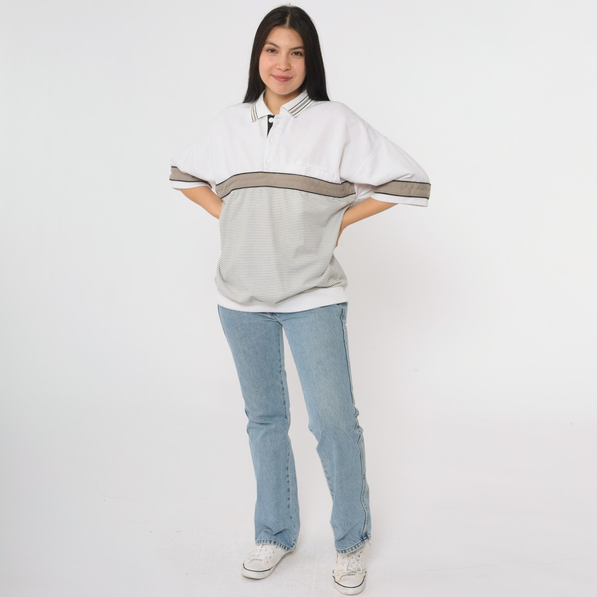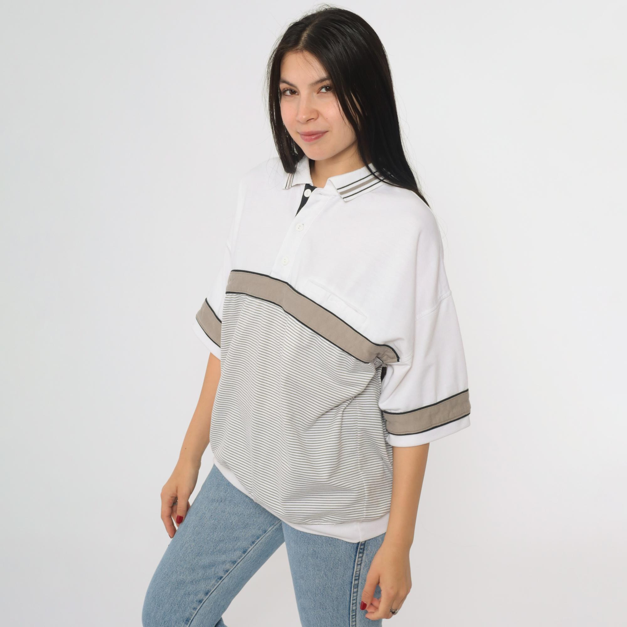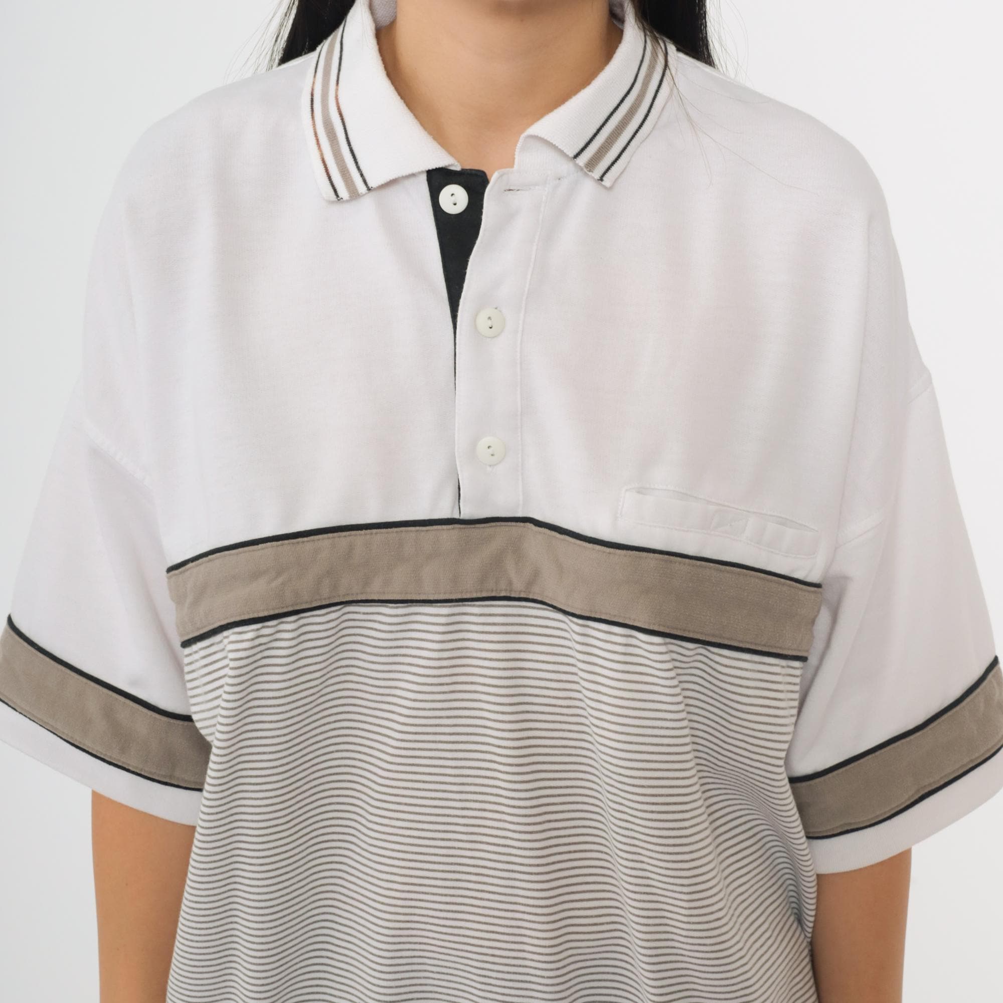 Vintage 90s Puritan polo shirt in white with taupe and black colorblock accents. Features a striped panel across the chest and sleeves, a three-button placket, short sleeves, and an oversized fit.