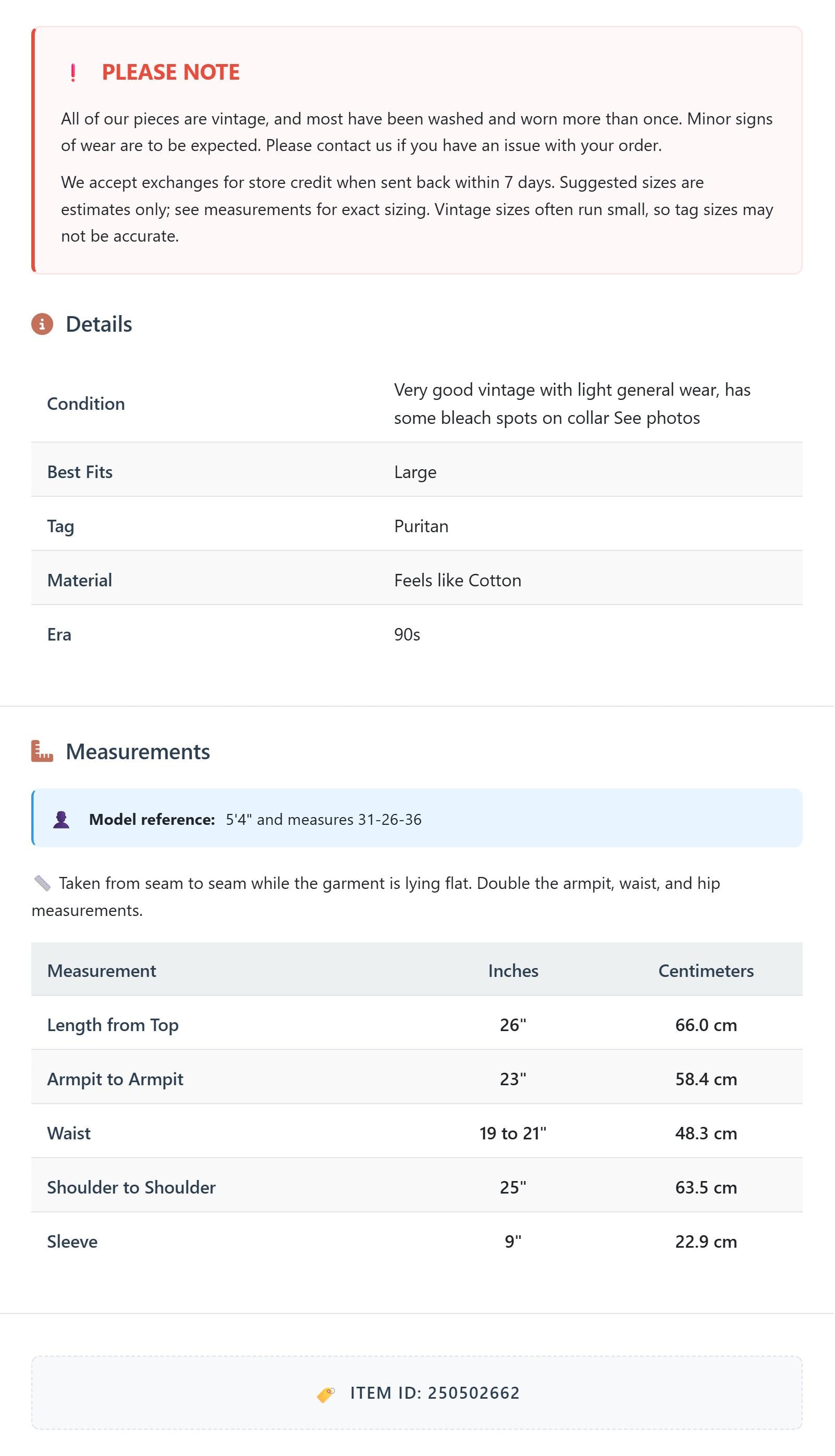 All of our pieces are vintage, and most have been washed and worn more than once. Minor signs of wear are to be expected. Please contact us if you have an issue with your order. We accept exchanges for store credit when sent back within 7 days.