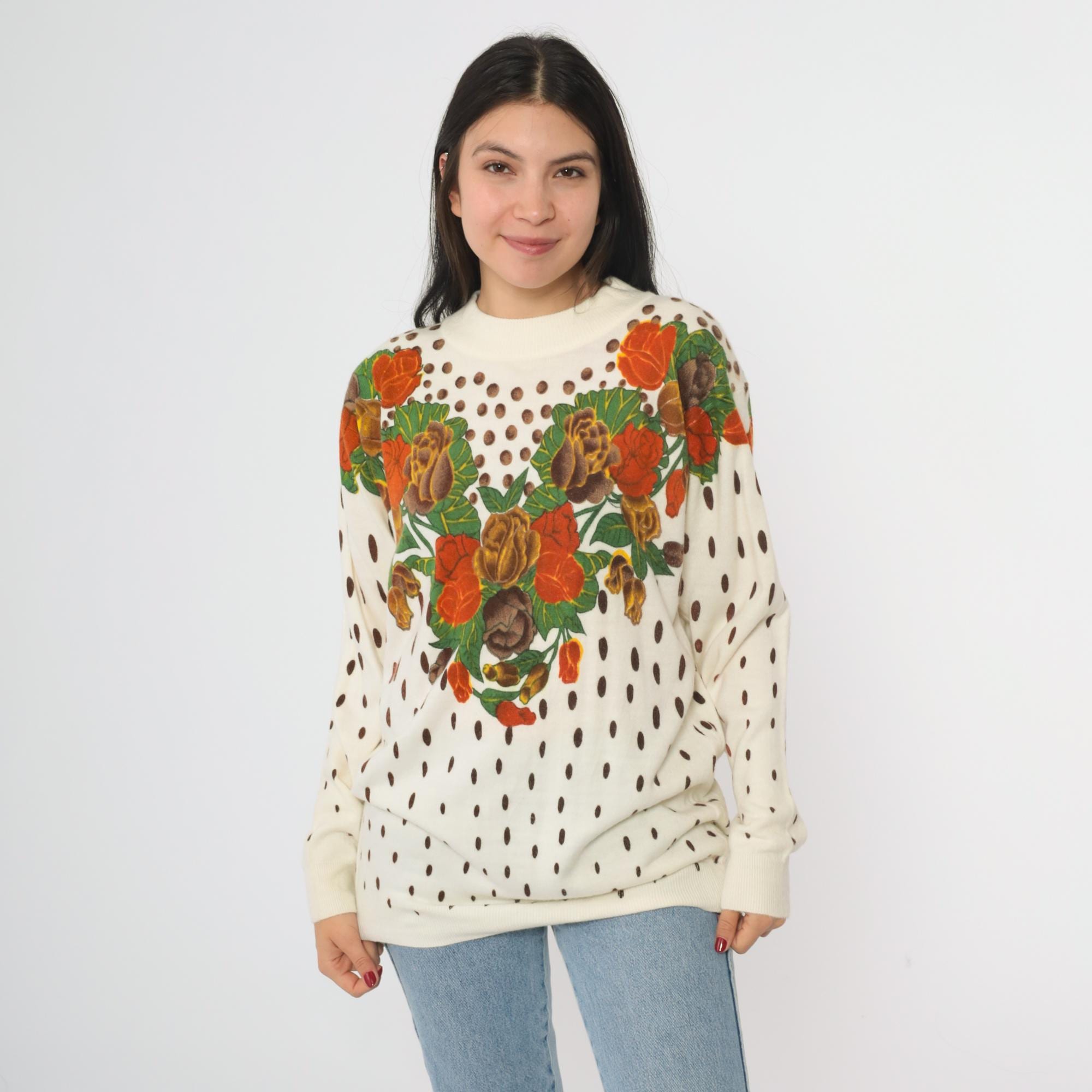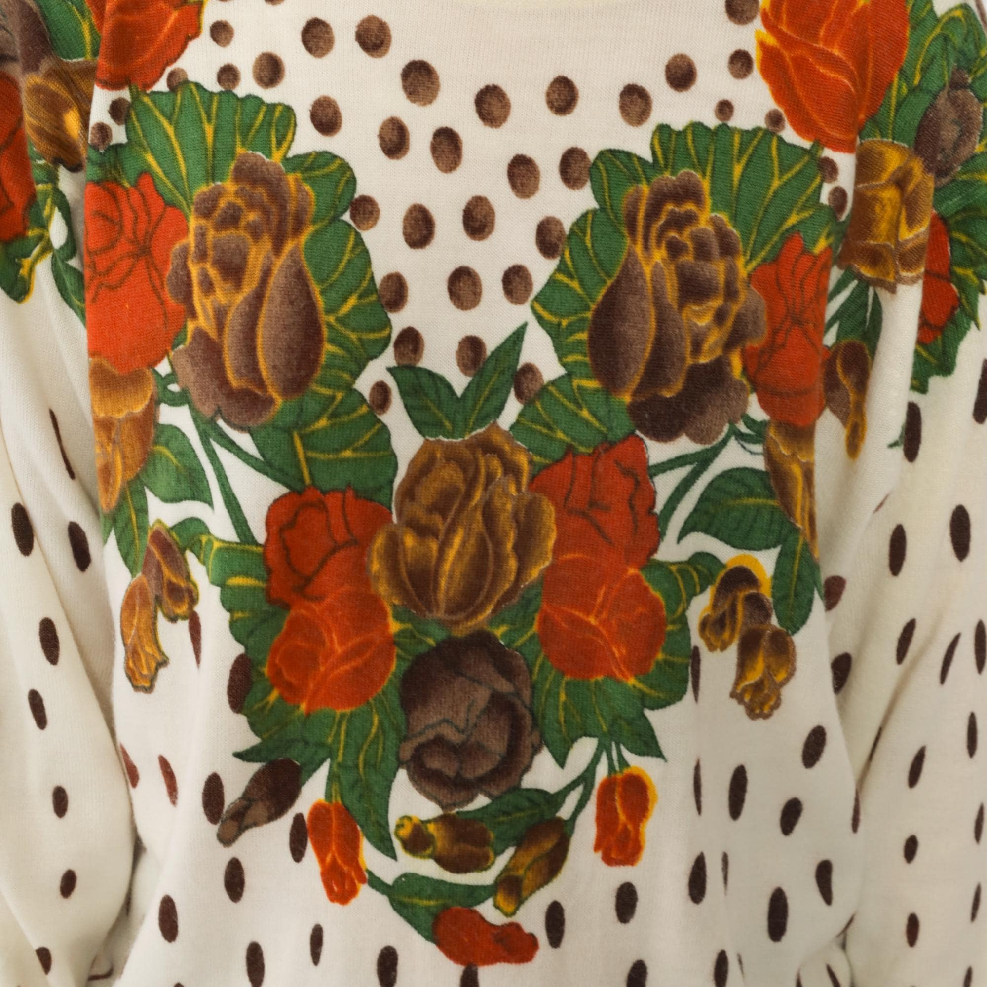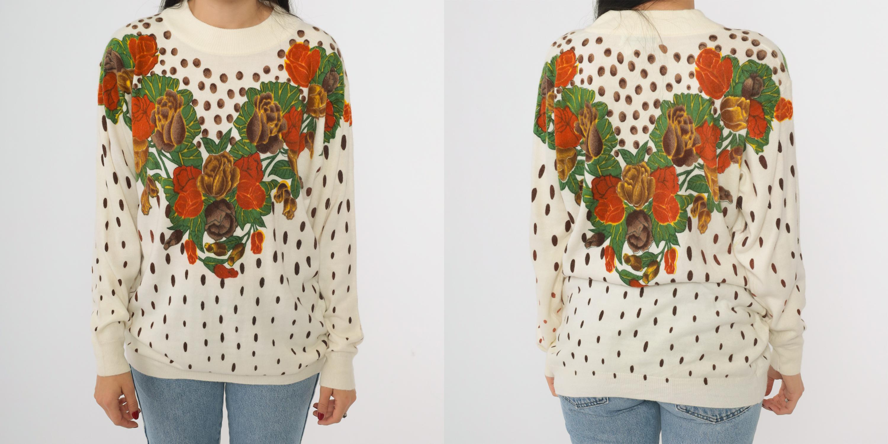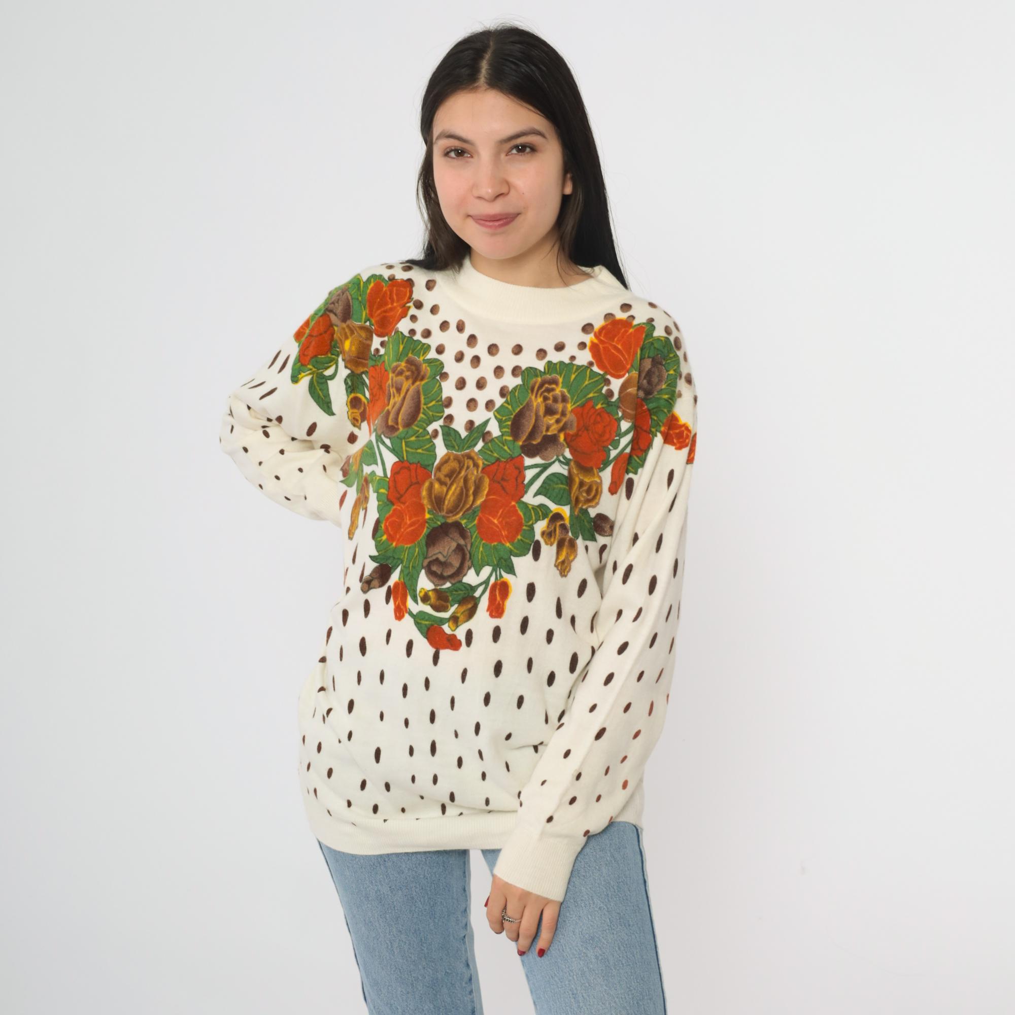 80s cream knit sweater from General brand. Features a distinctive heart-shaped floral arrangement across the chest with roses and tulips in orange, brown, yellow, and green. Brown polka dot pattern throughout the body and sleeves. Crew neckline with ribbed trim at neck, cuffs, and waistband.