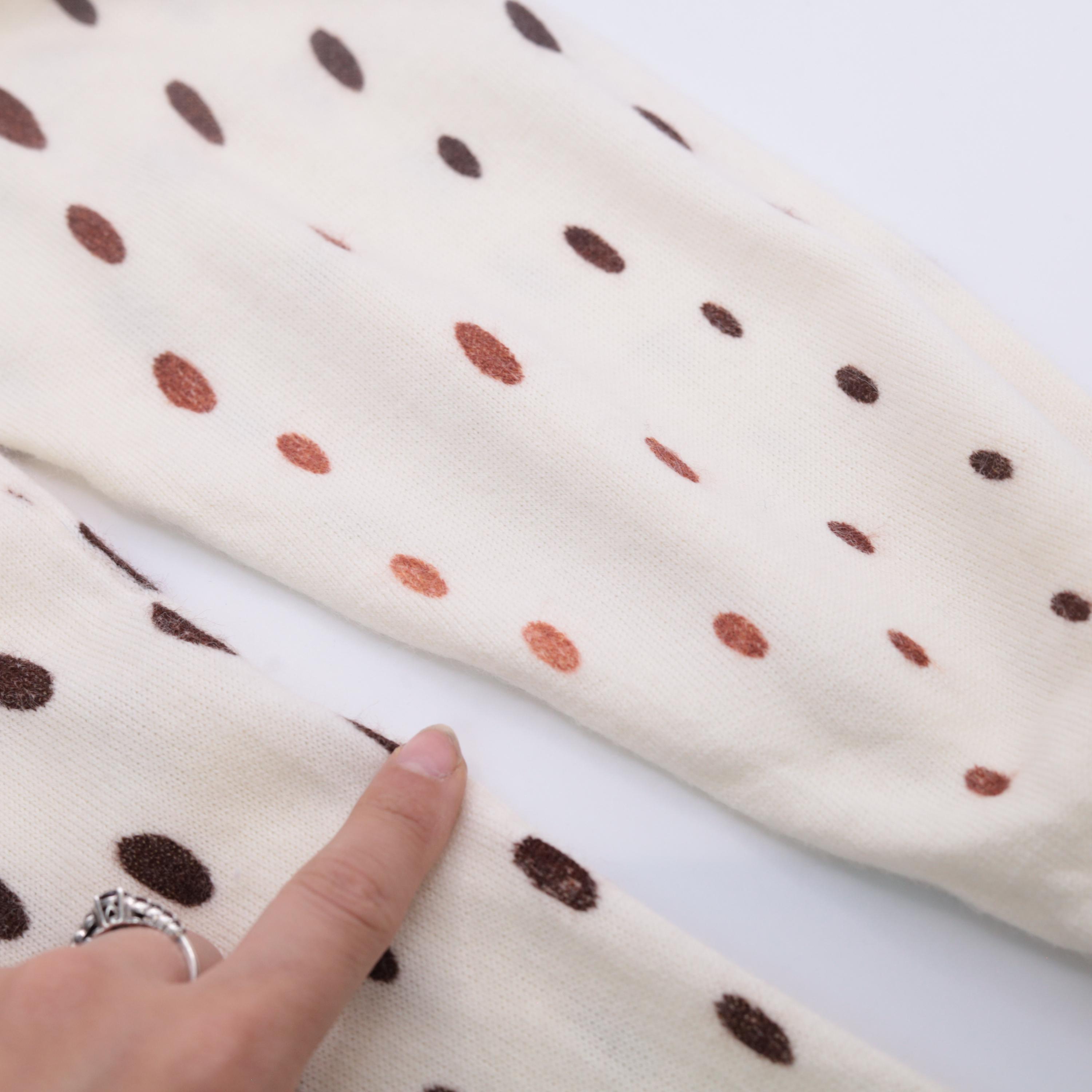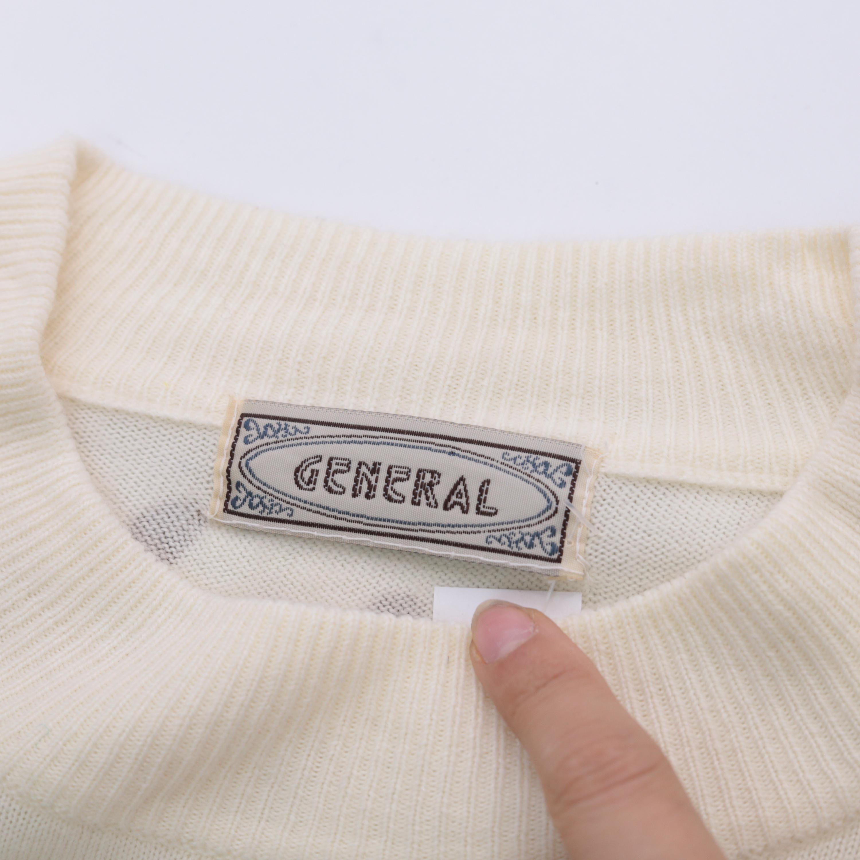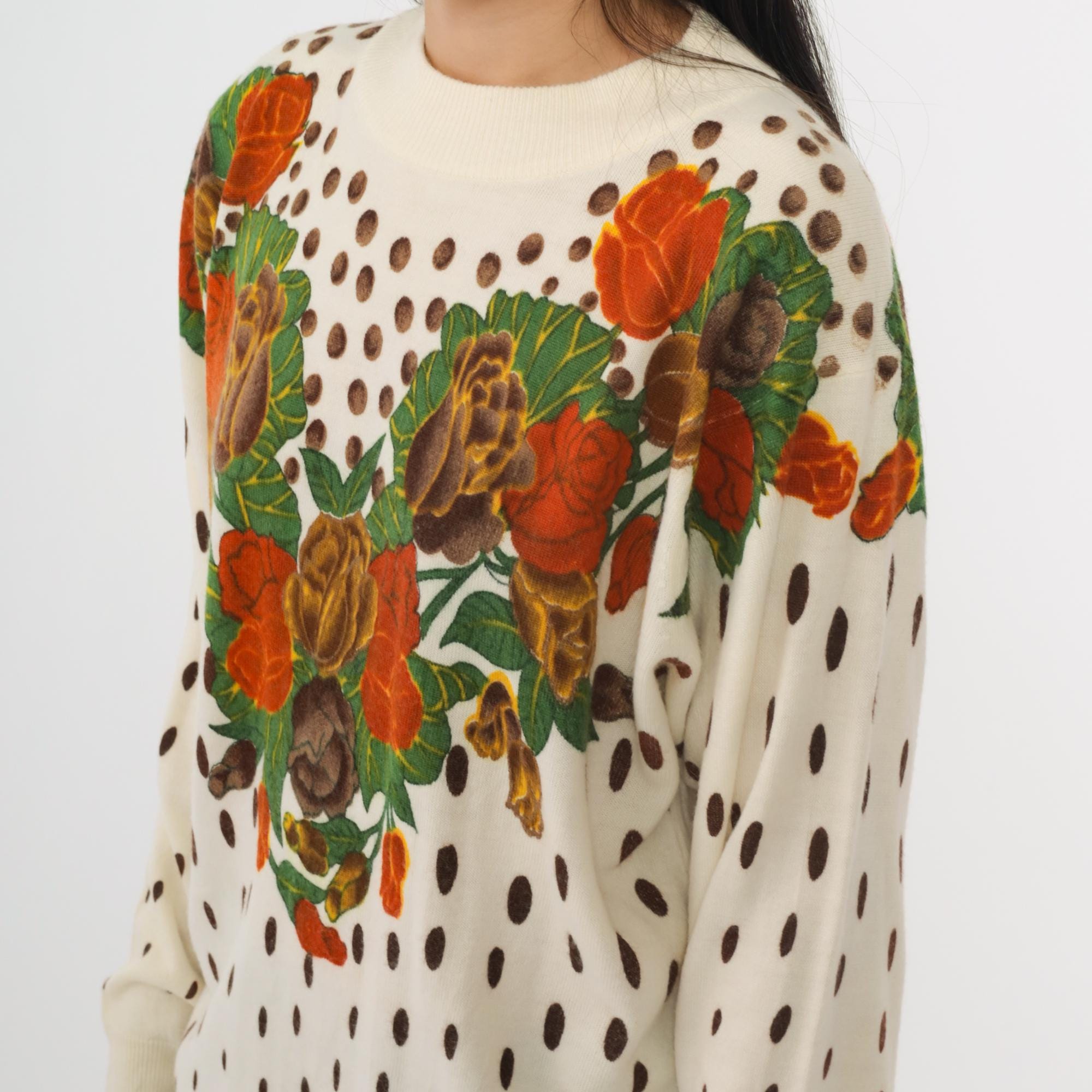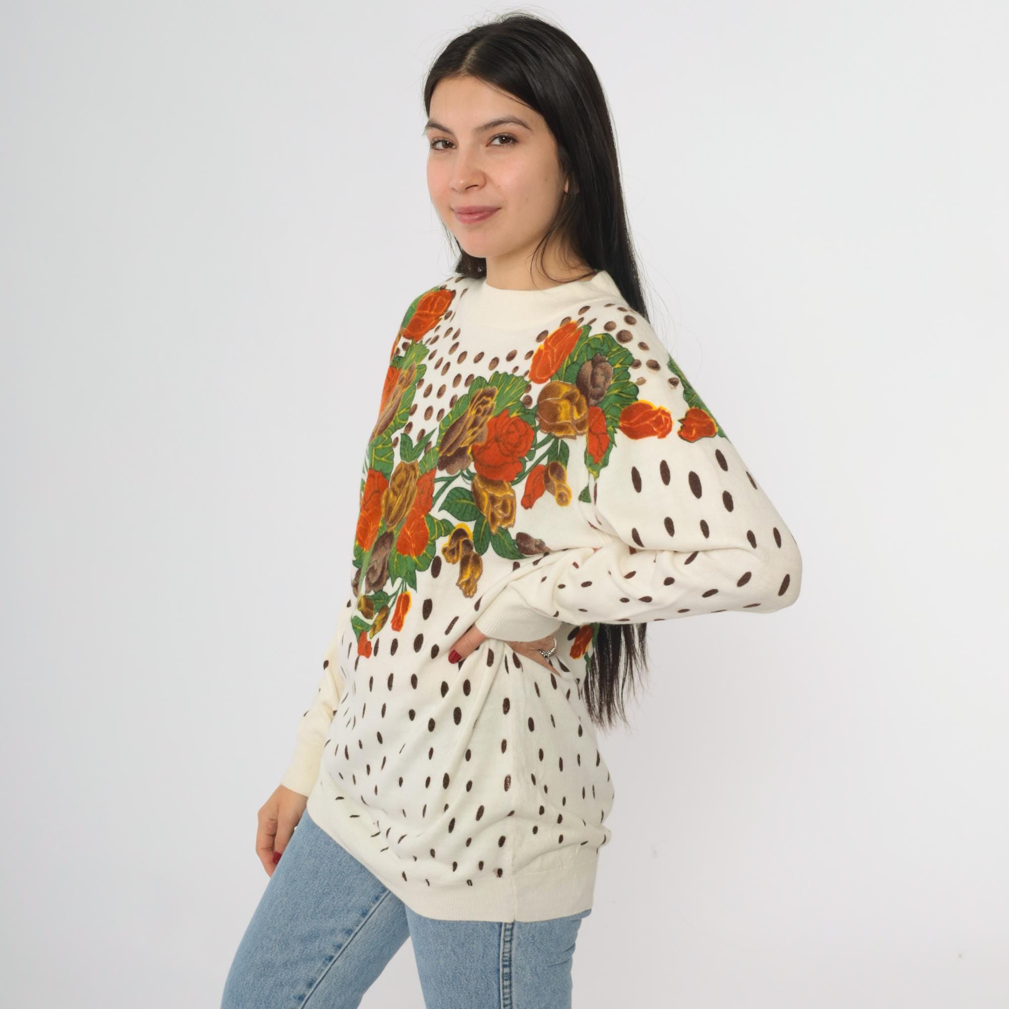 80s cream knit sweater from General brand. Features a distinctive heart-shaped floral arrangement across the chest with roses and tulips in orange, brown, yellow, and green. Brown polka dot pattern throughout the body and sleeves. Crew neckline with ribbed trim at neck, cuffs, and waistband.