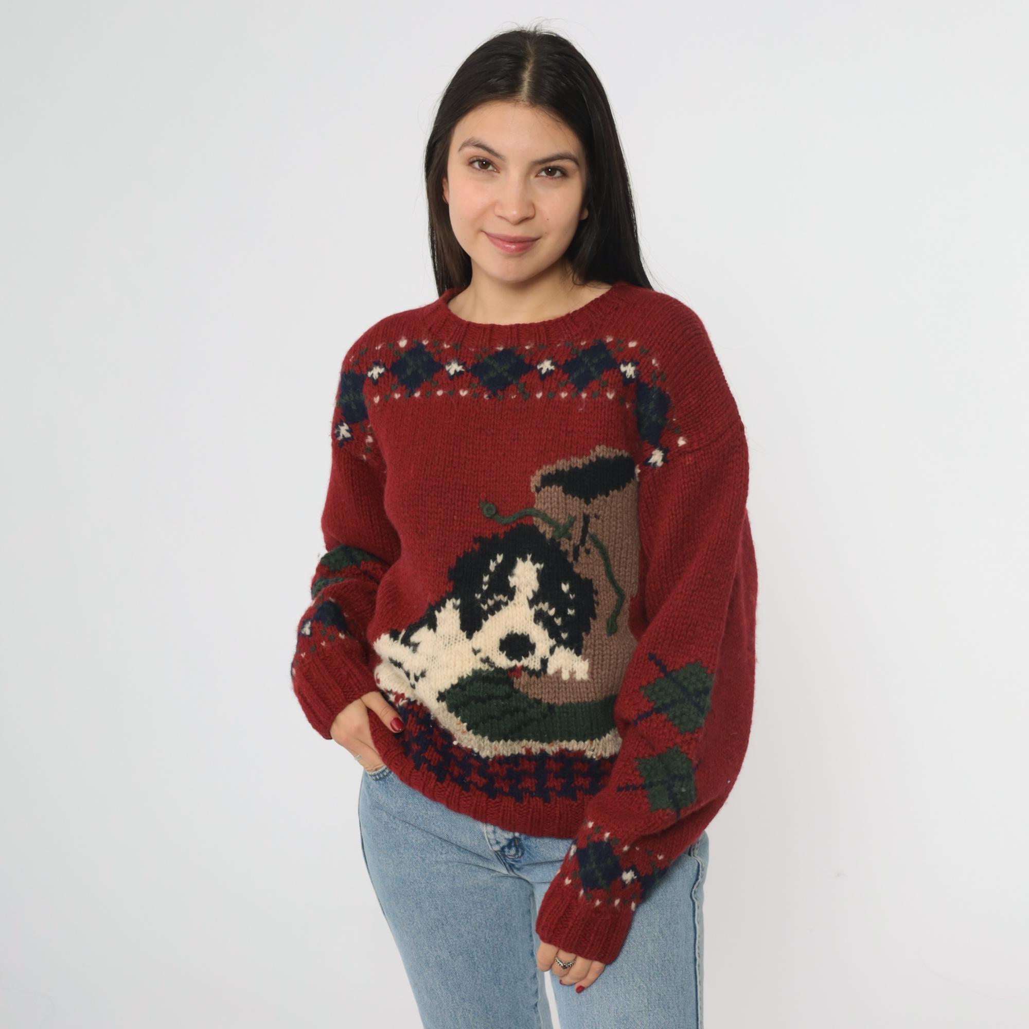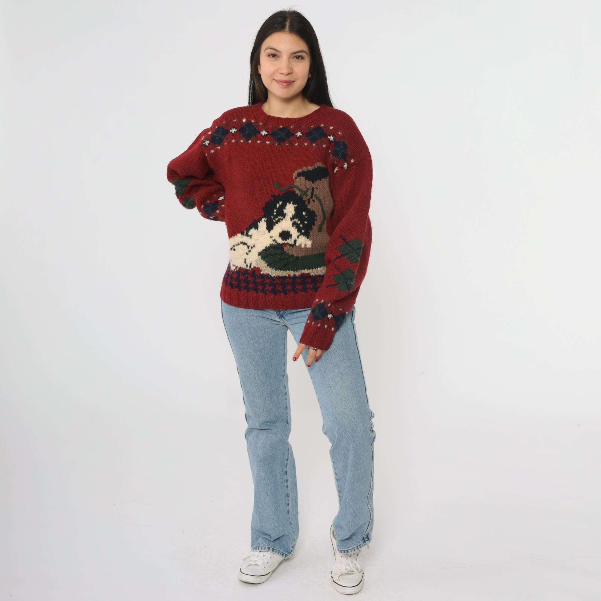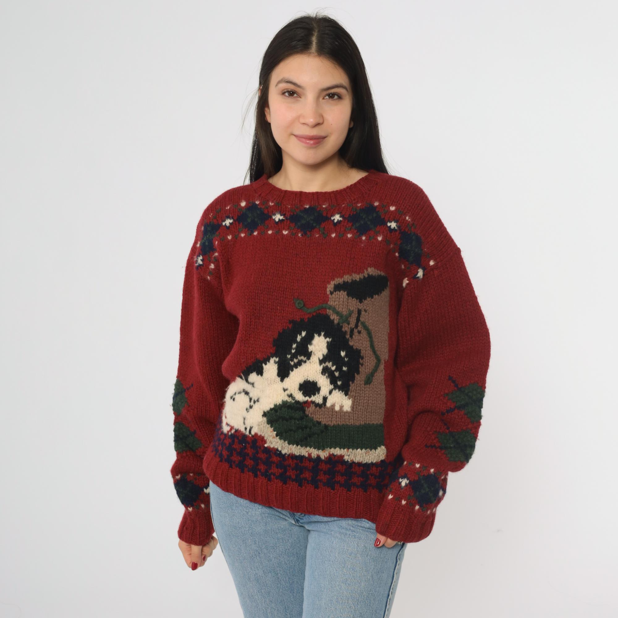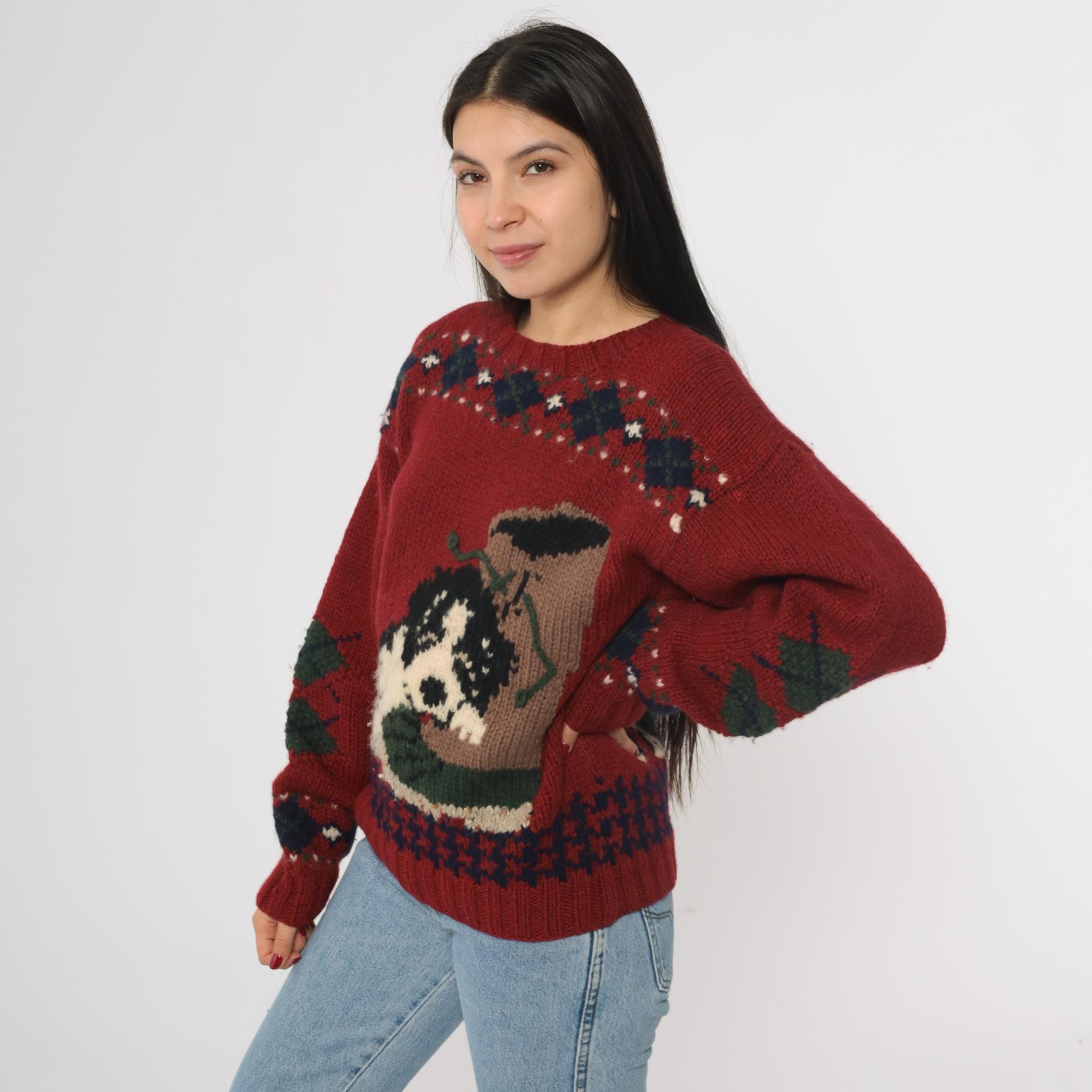 Vintage 80s Woolrich sweater in a deep red wool knit featuring a novelty graphic of a black and white puppy resting in a boot. This pullover includes argyle and Fair Isle patterning across the yoke and sleeves, long sleeves with ribbed cuffs, and a crew neckline.