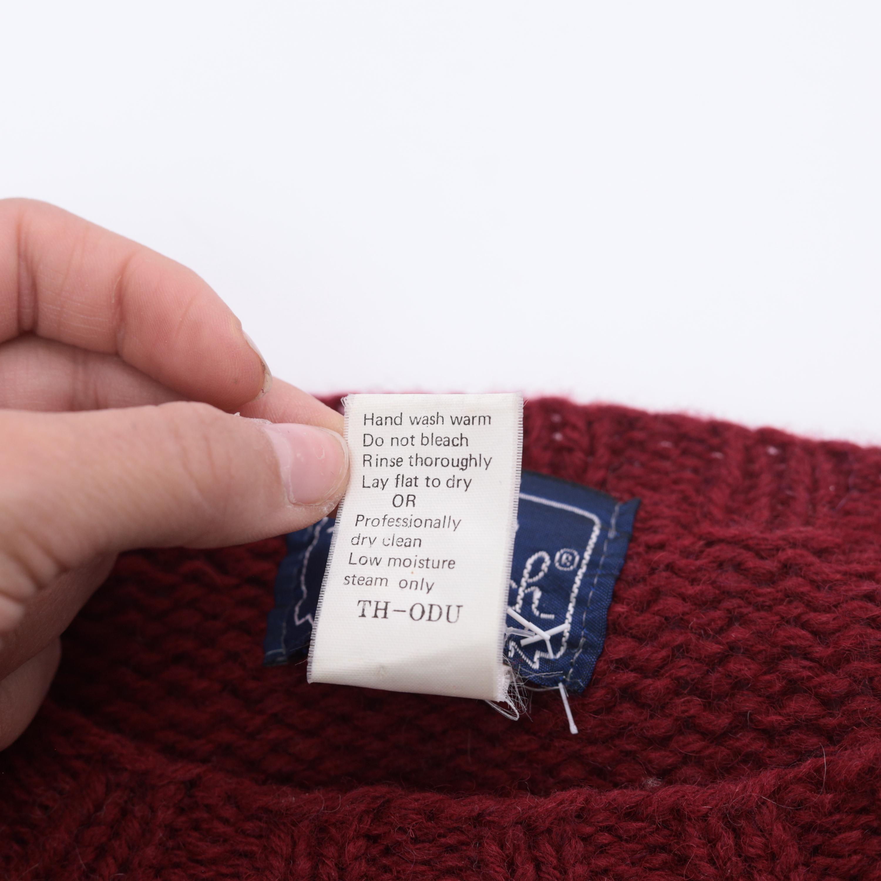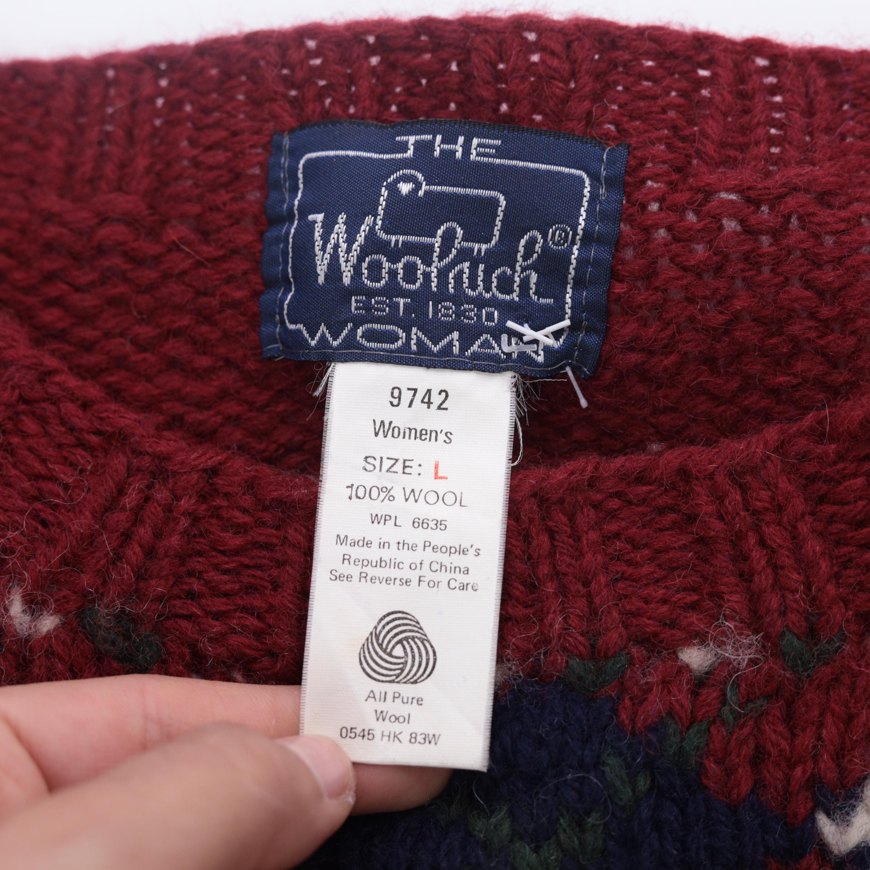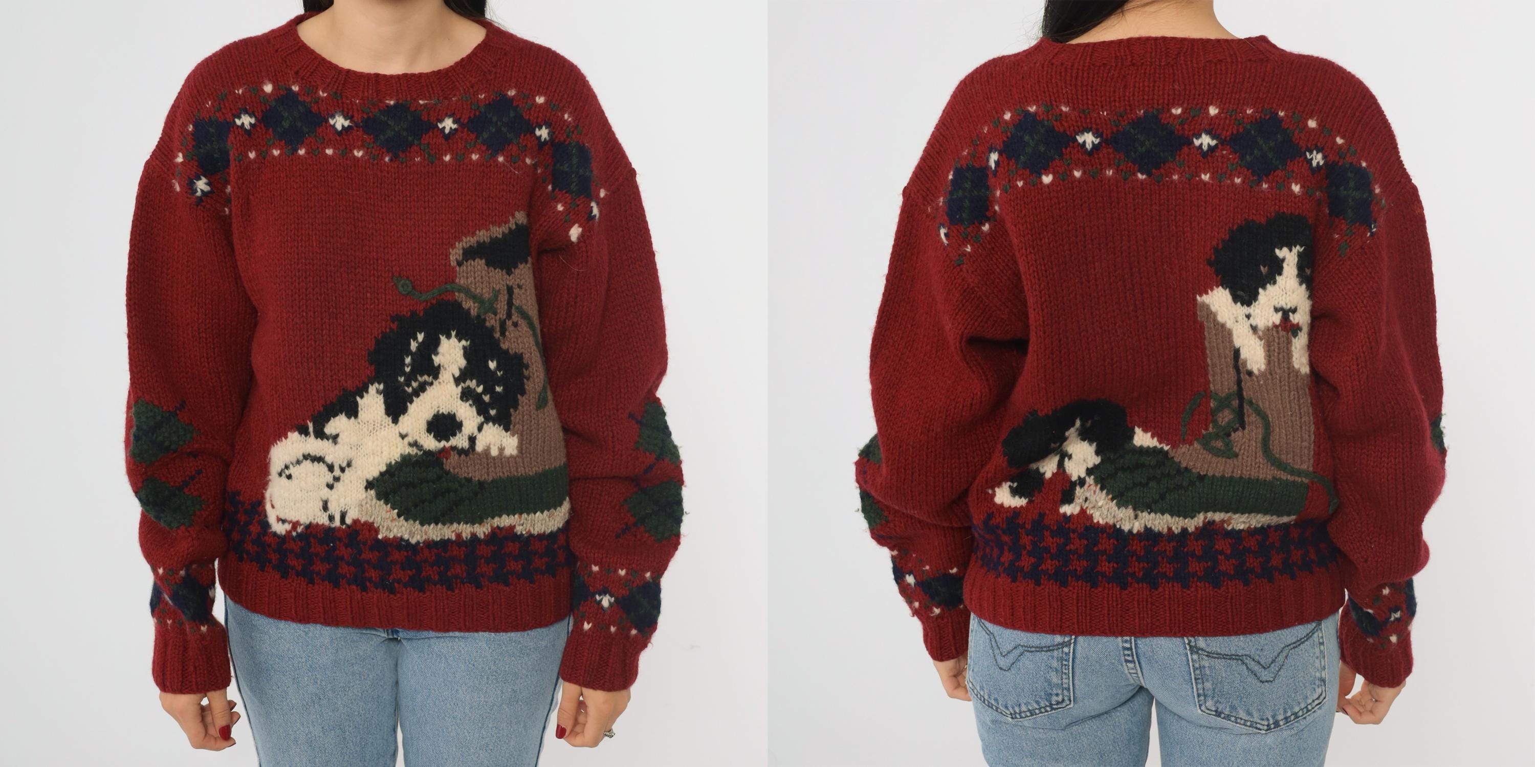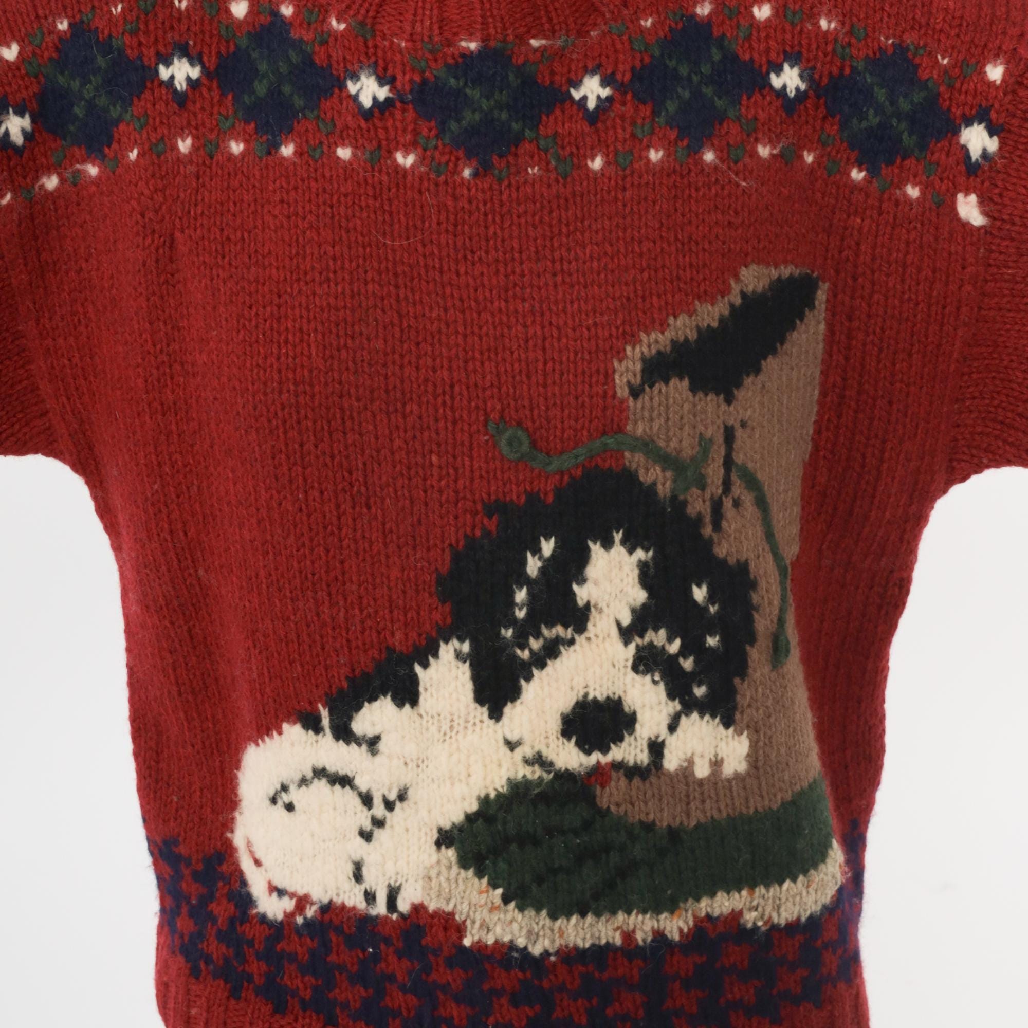 Vintage 80s Woolrich sweater in a deep red wool knit featuring a novelty graphic of a black and white puppy resting in a boot. This pullover includes argyle and Fair Isle patterning across the yoke and sleeves, long sleeves with ribbed cuffs, and a crew neckline.