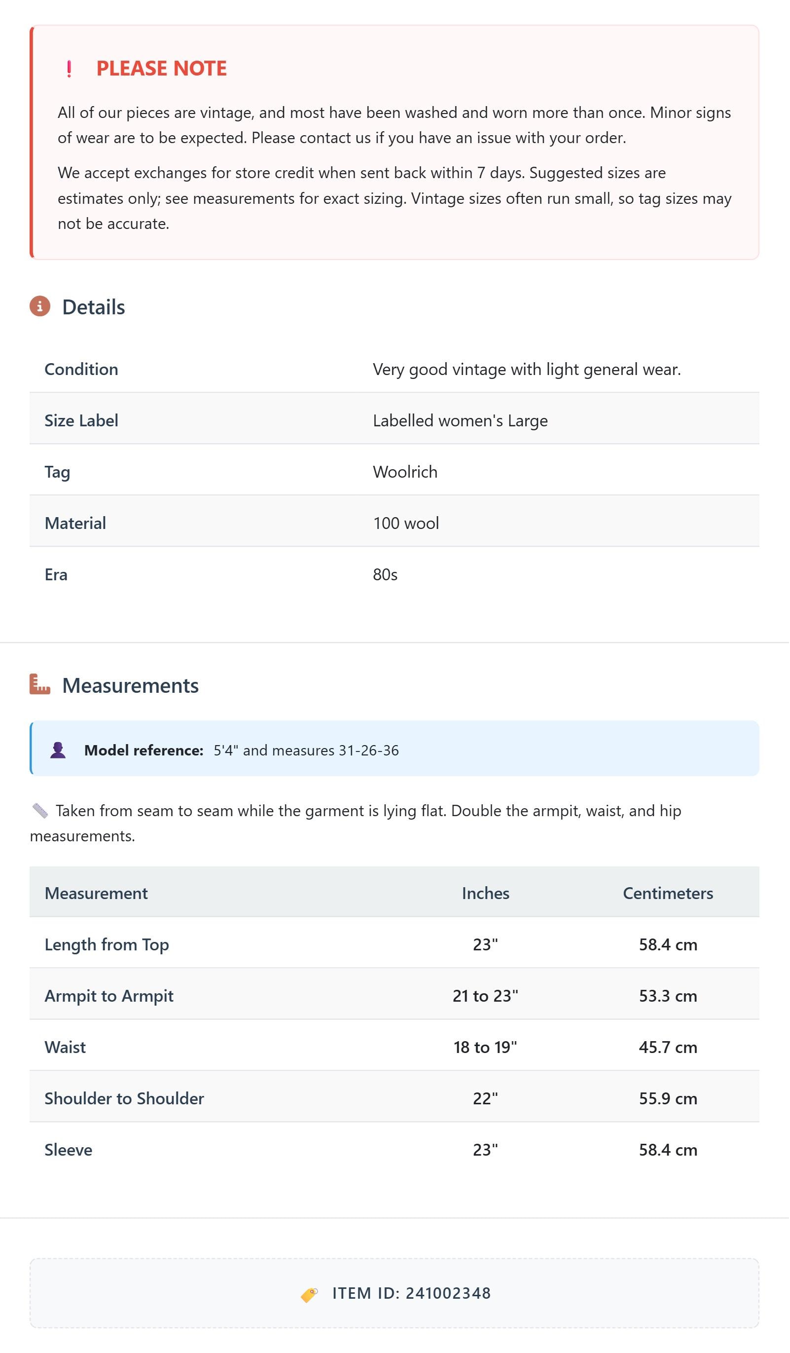 All of our pieces are vintage, and most have been washed and worn more than once. Minor signs of wear are to be expected. Please contact us if you have an issue with your order. We accept exchanges for store credit when sent back within 7 days.