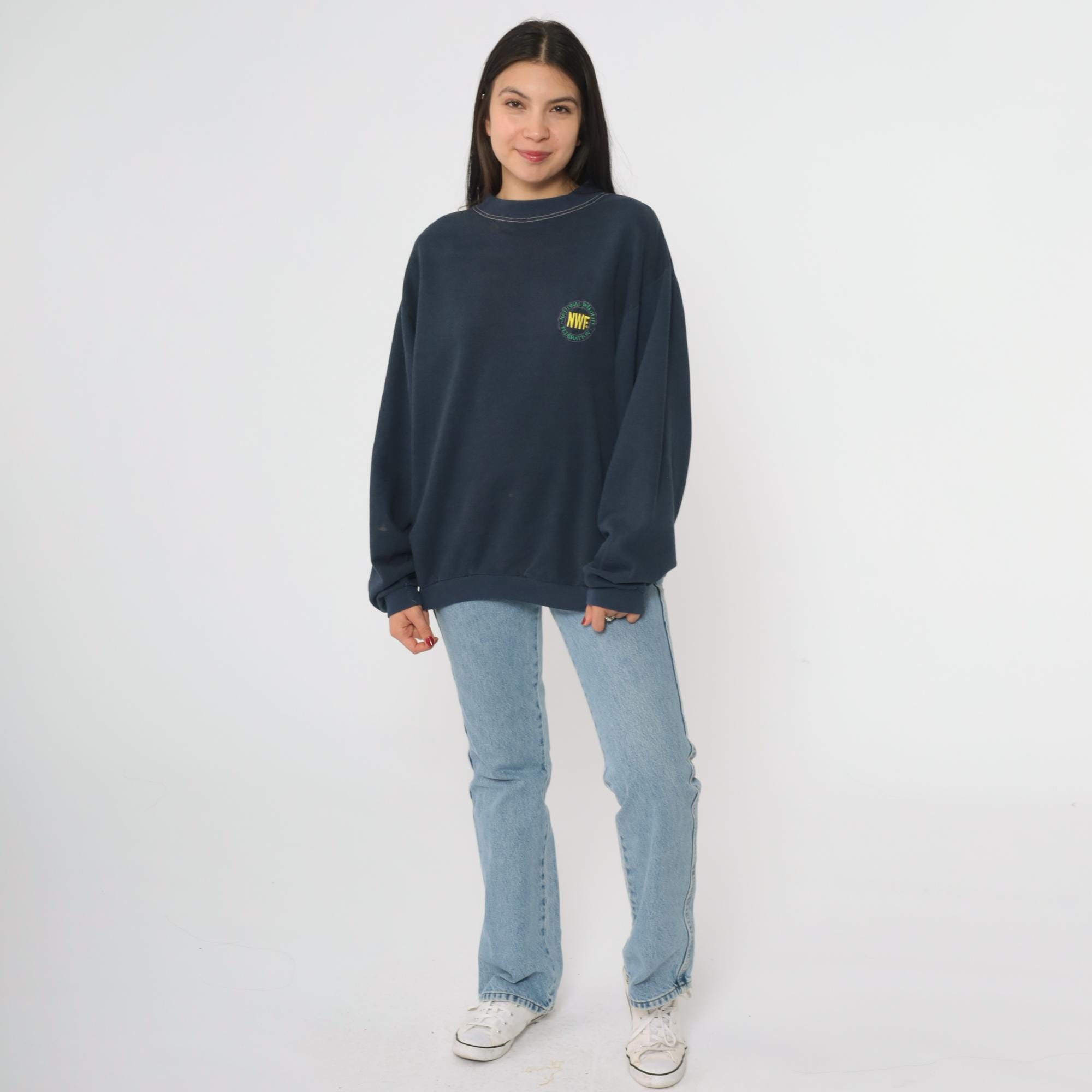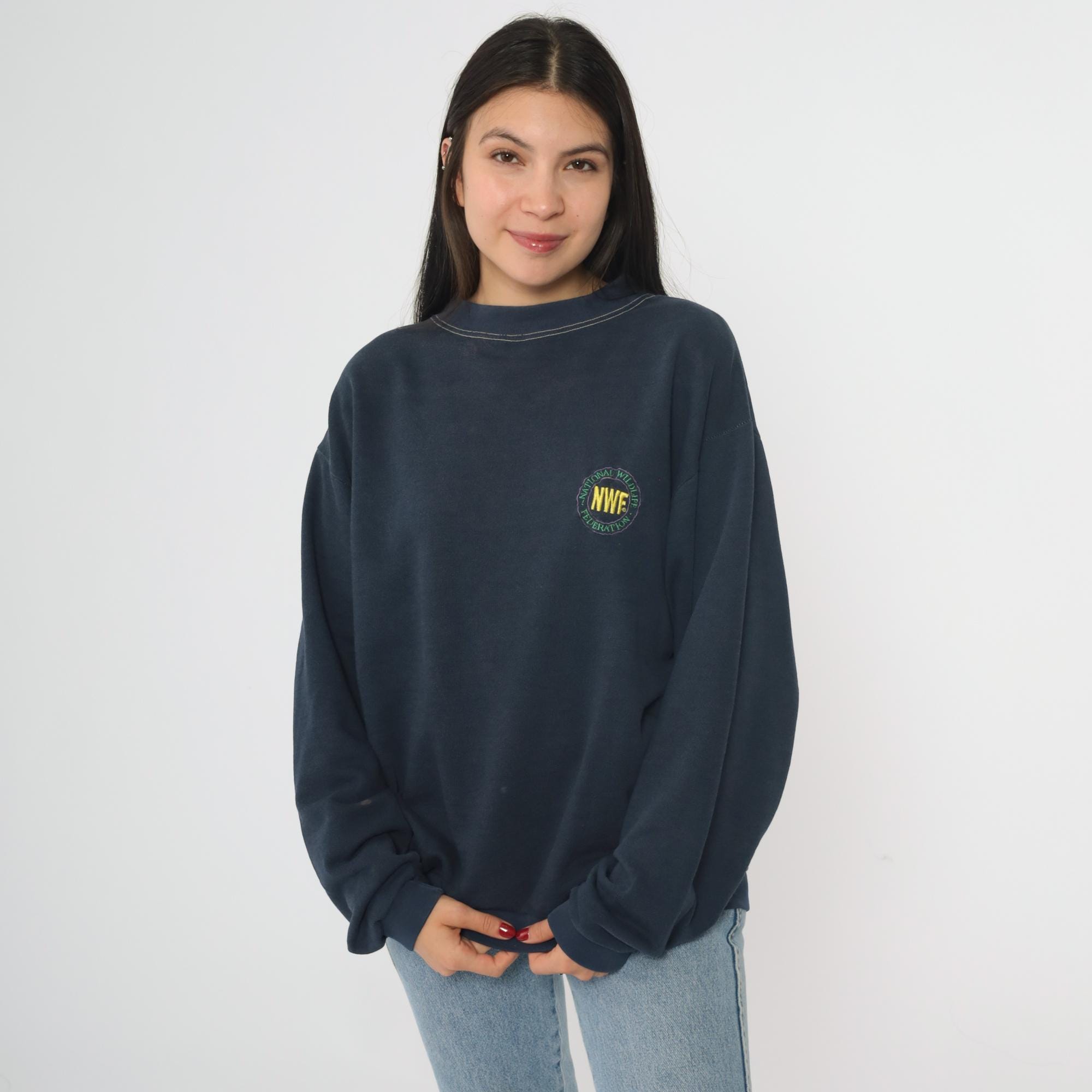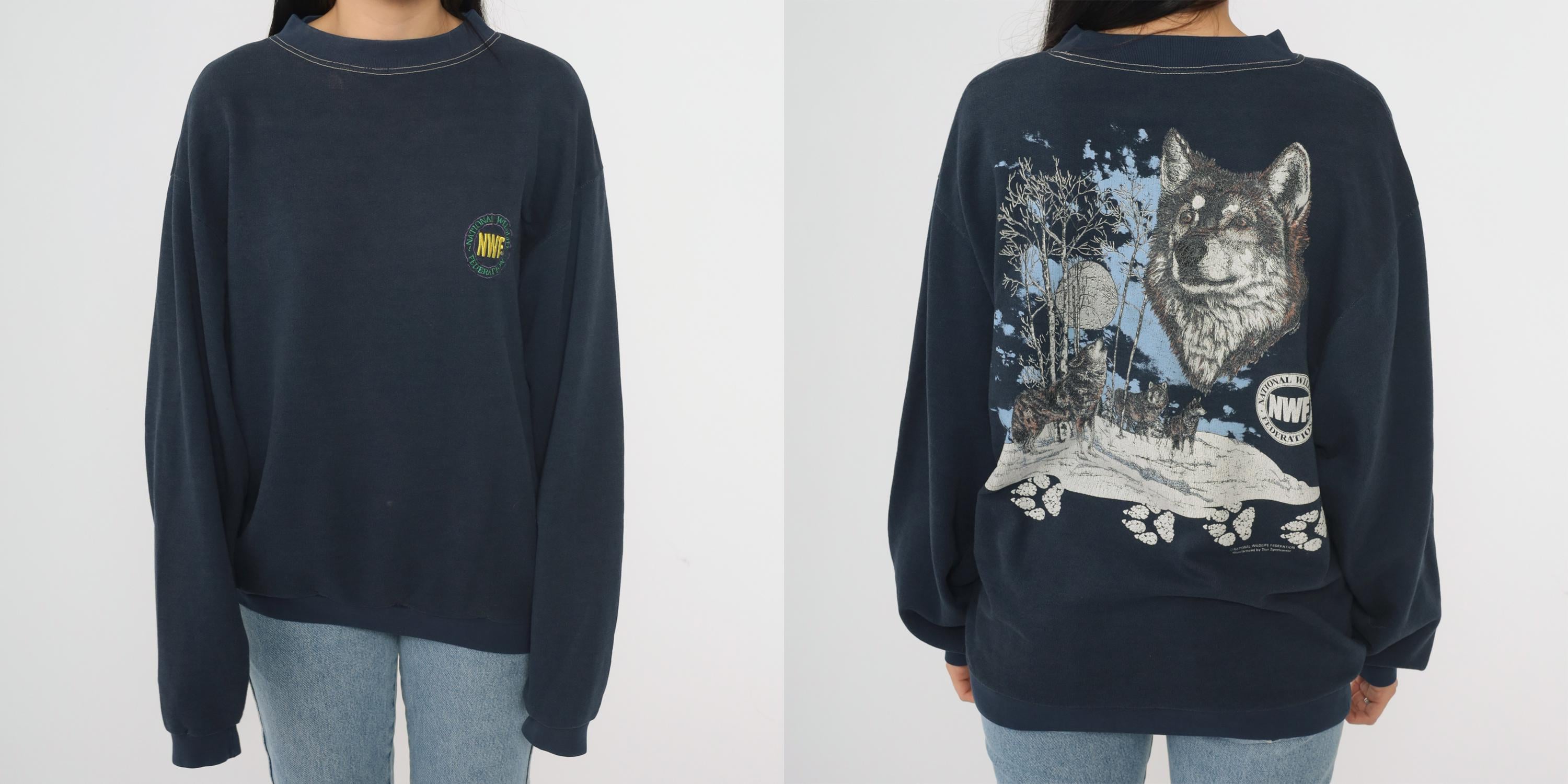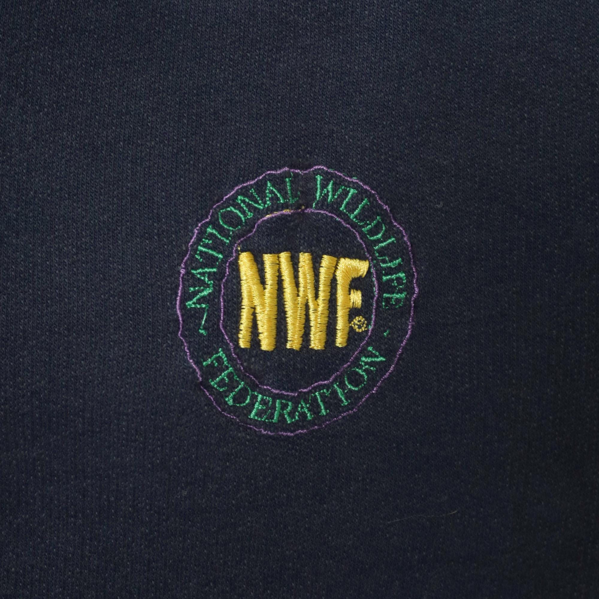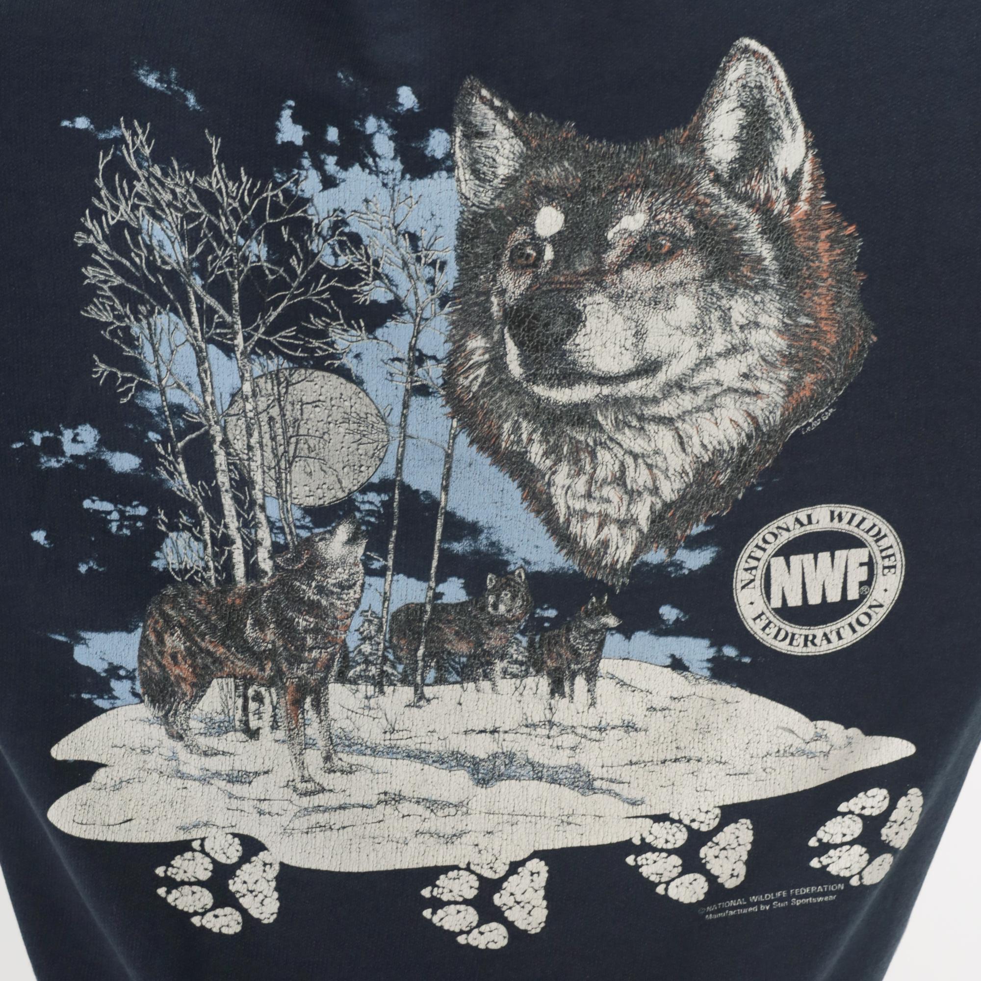 Vintage 90s sweatshirt in navy blue featuring a wolf and full moon wilderness scene graphic on the back with paw prints and forest details. The front includes a small NWF crest logo. Classic crewneck pullover design with ribbed cuffs and hem.