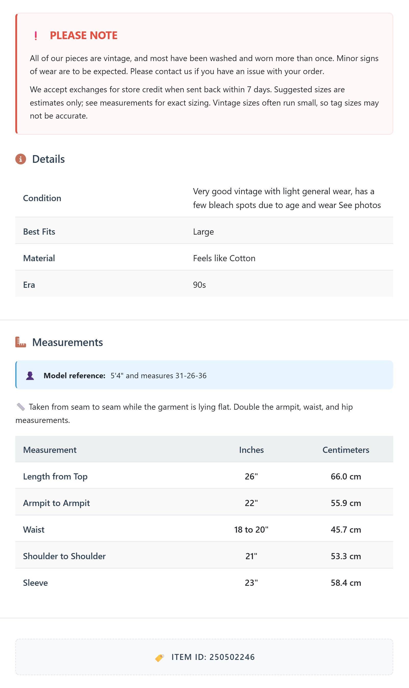 Suggested sizes are estimates only; see measurements for exact sizing. Vintage sizes often run small, so tag sizes may not be accurate.