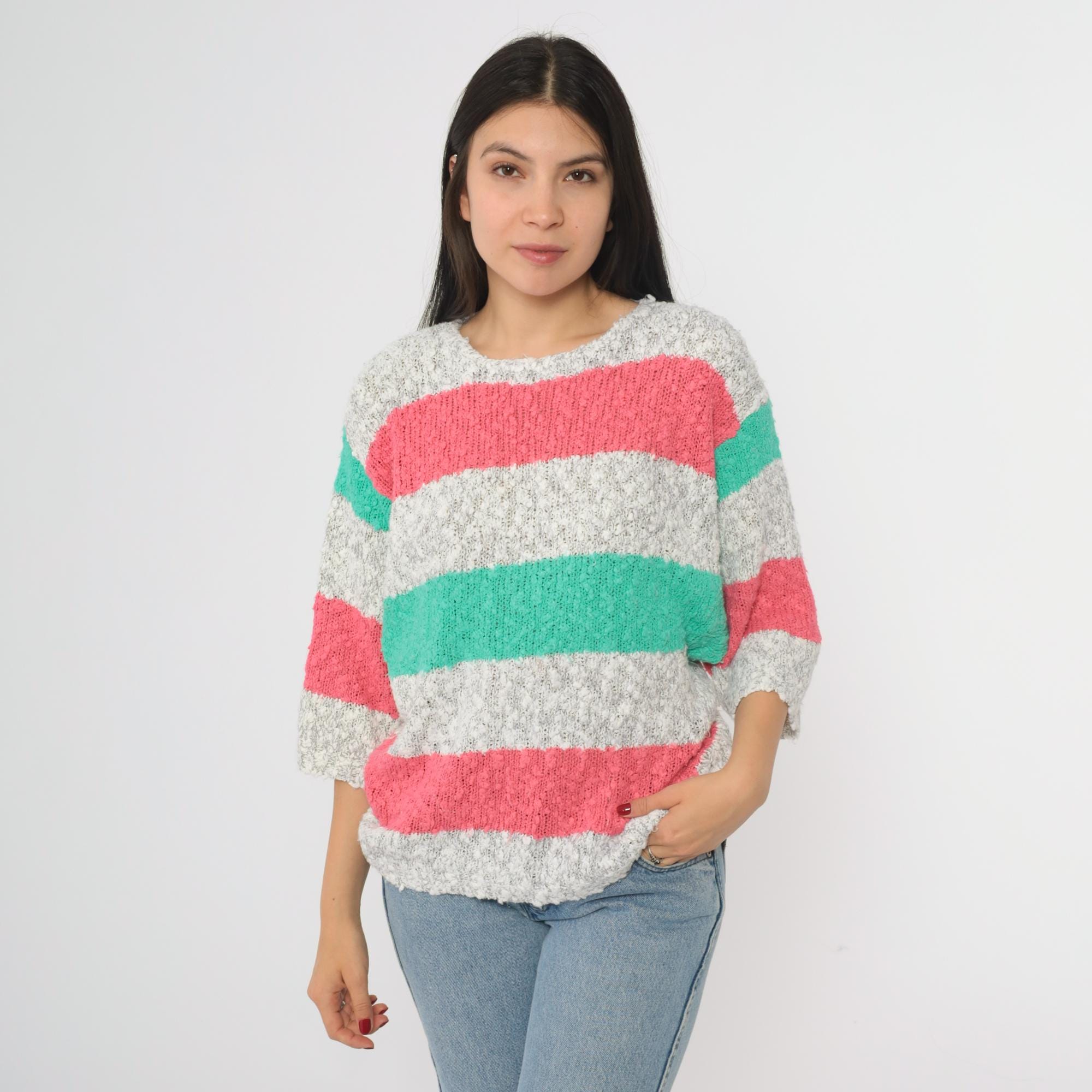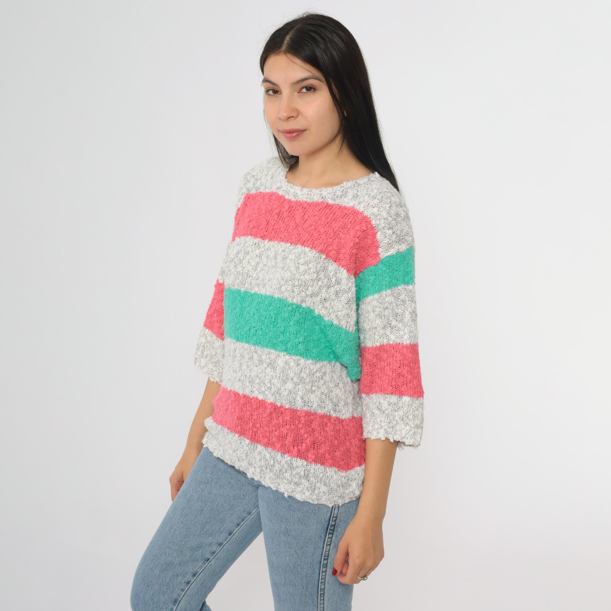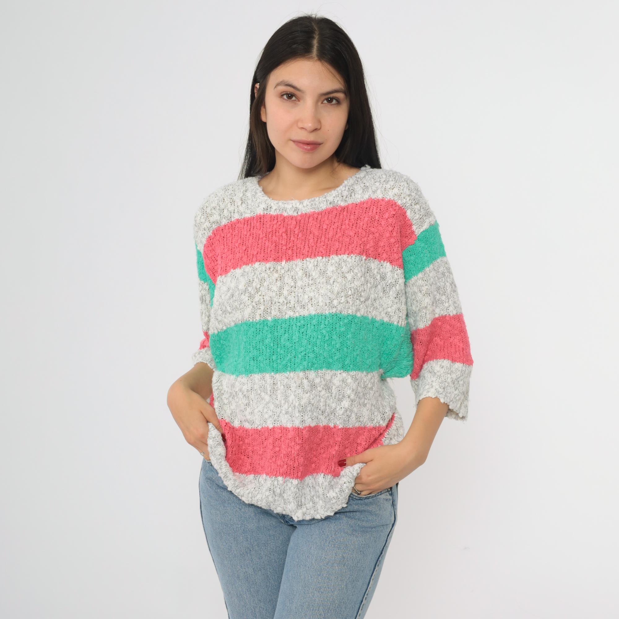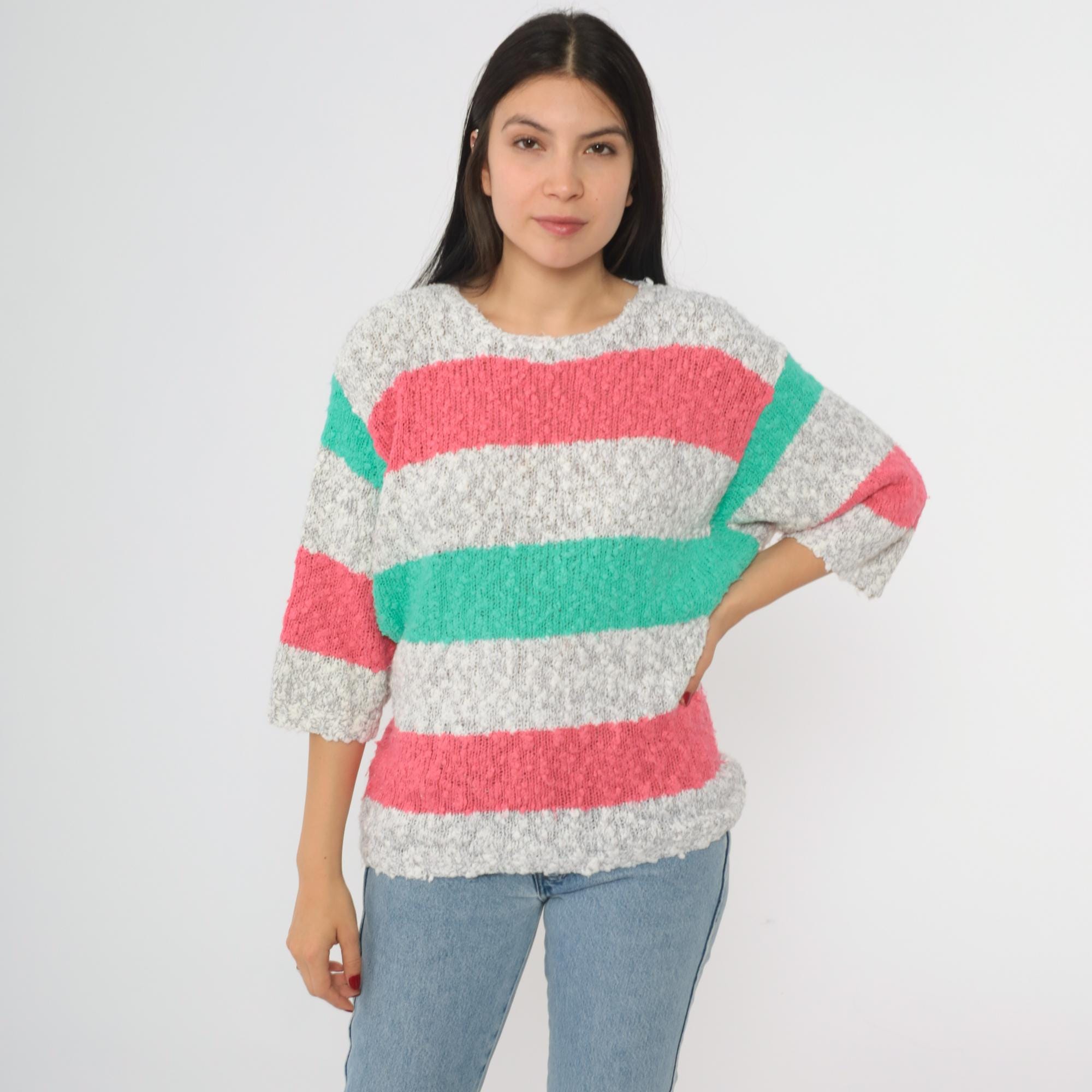 Vintage 80s striped sweater in a bold pink, green, and gray textured acrylic knit. Features a crew neckline, cropped short sleeves, and a pullover style.