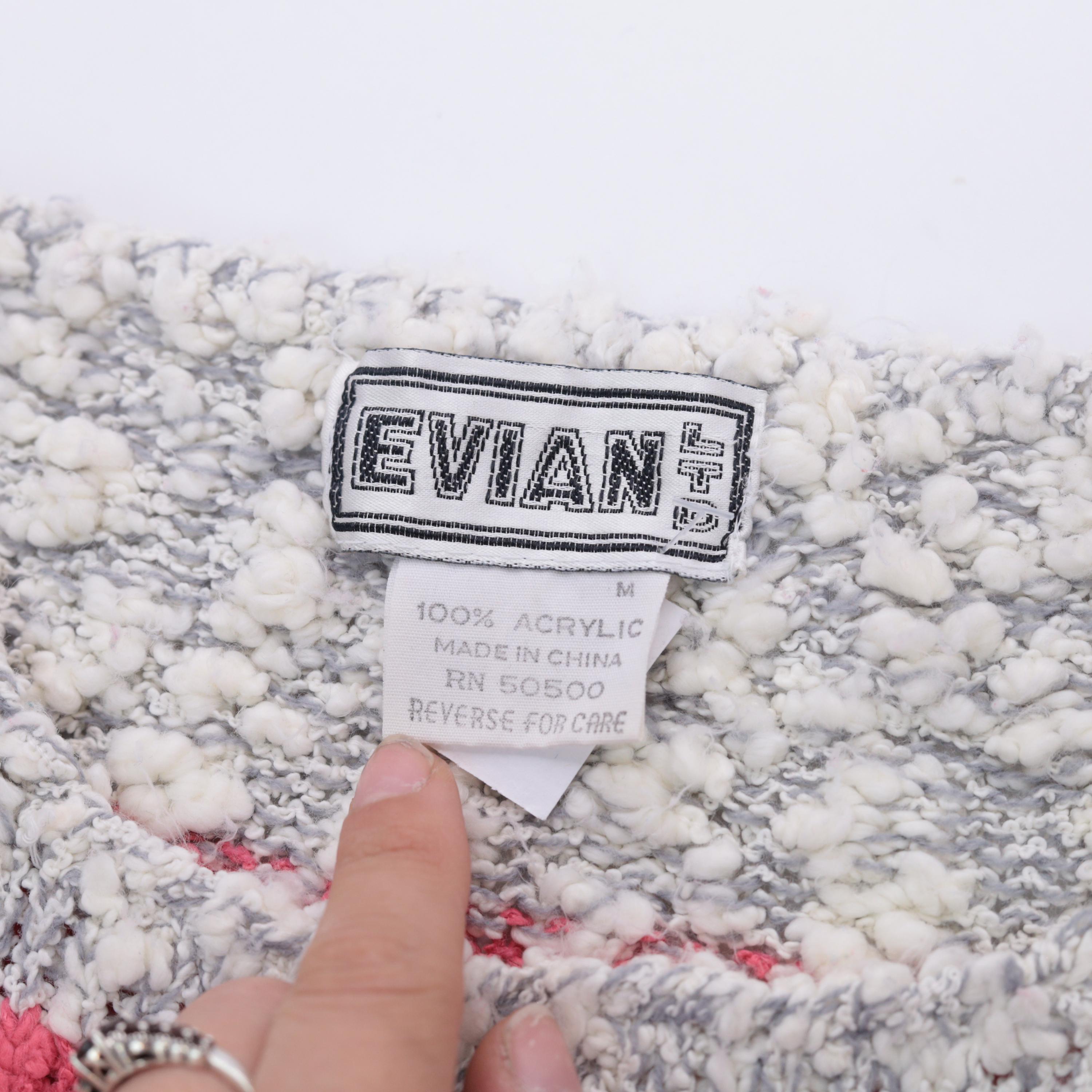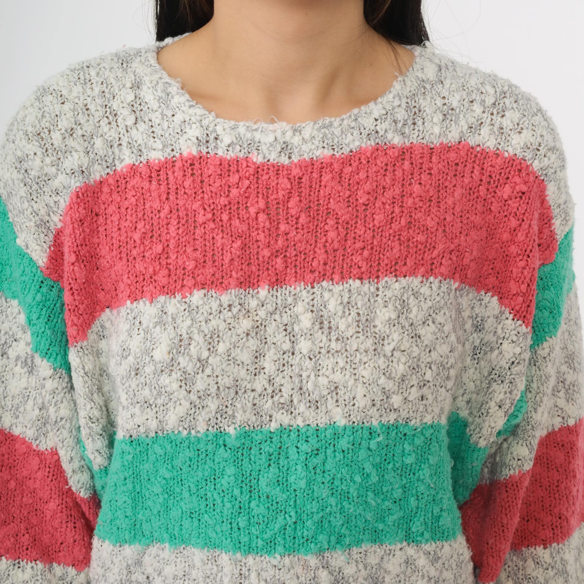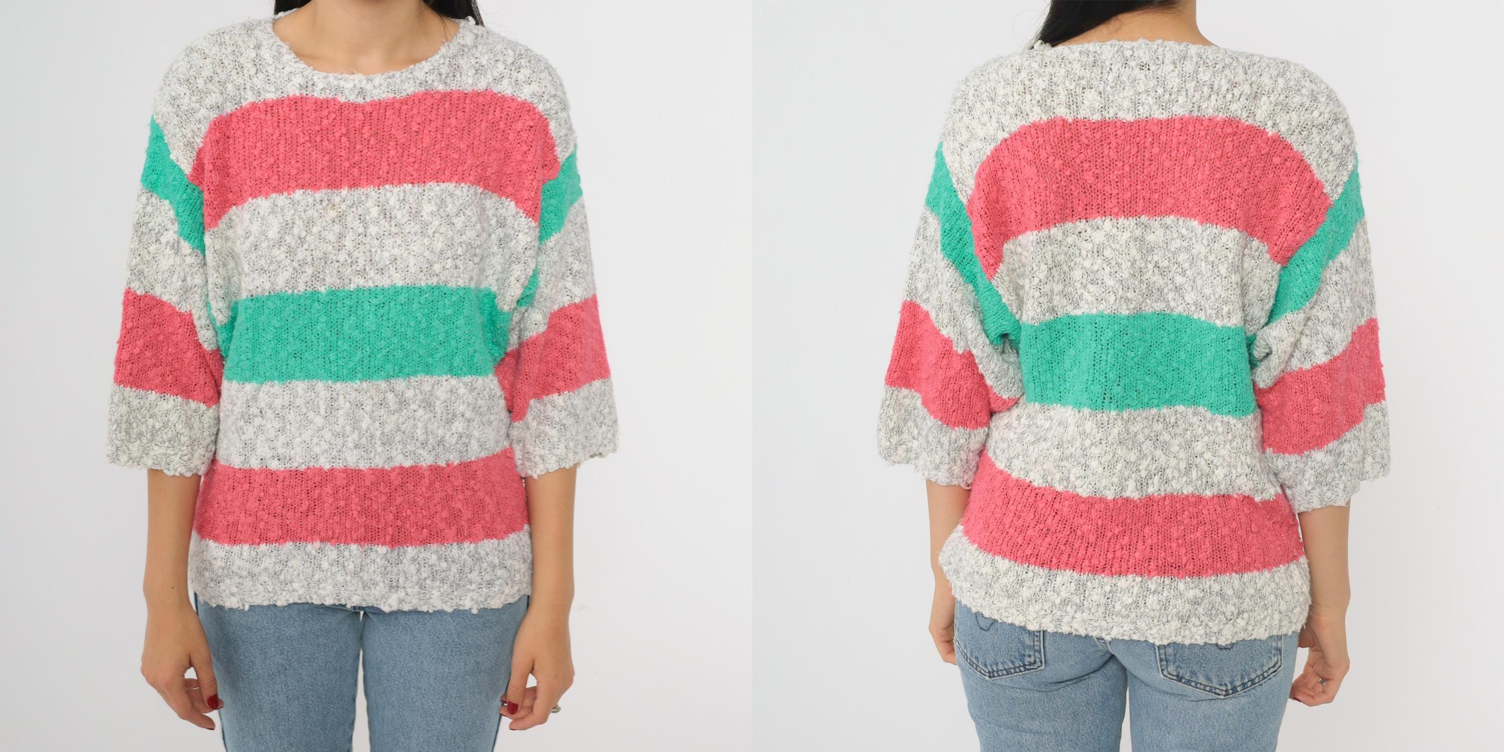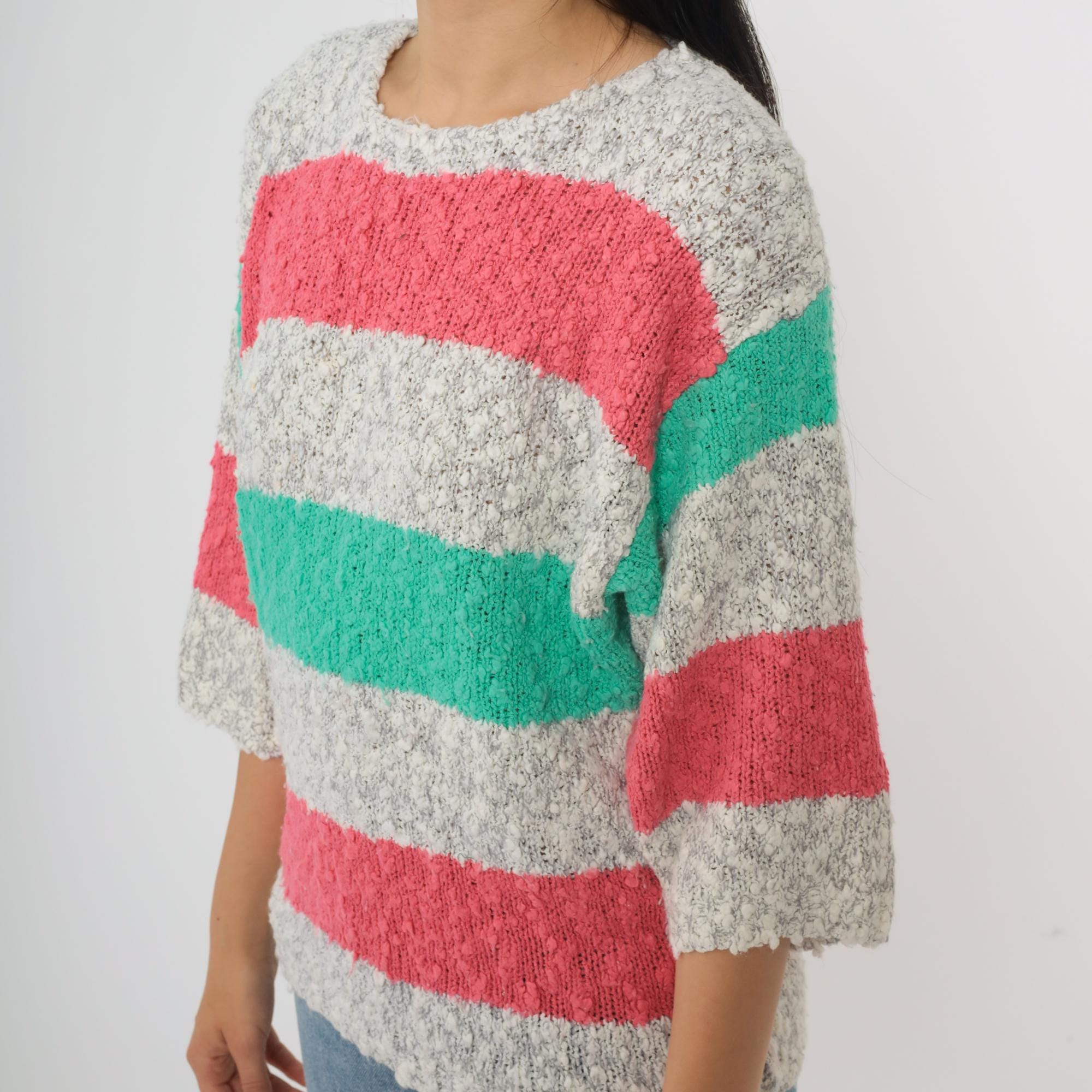 Vintage 80s striped sweater in a bold pink, green, and gray textured acrylic knit. Features a crew neckline, cropped short sleeves, and a pullover style.