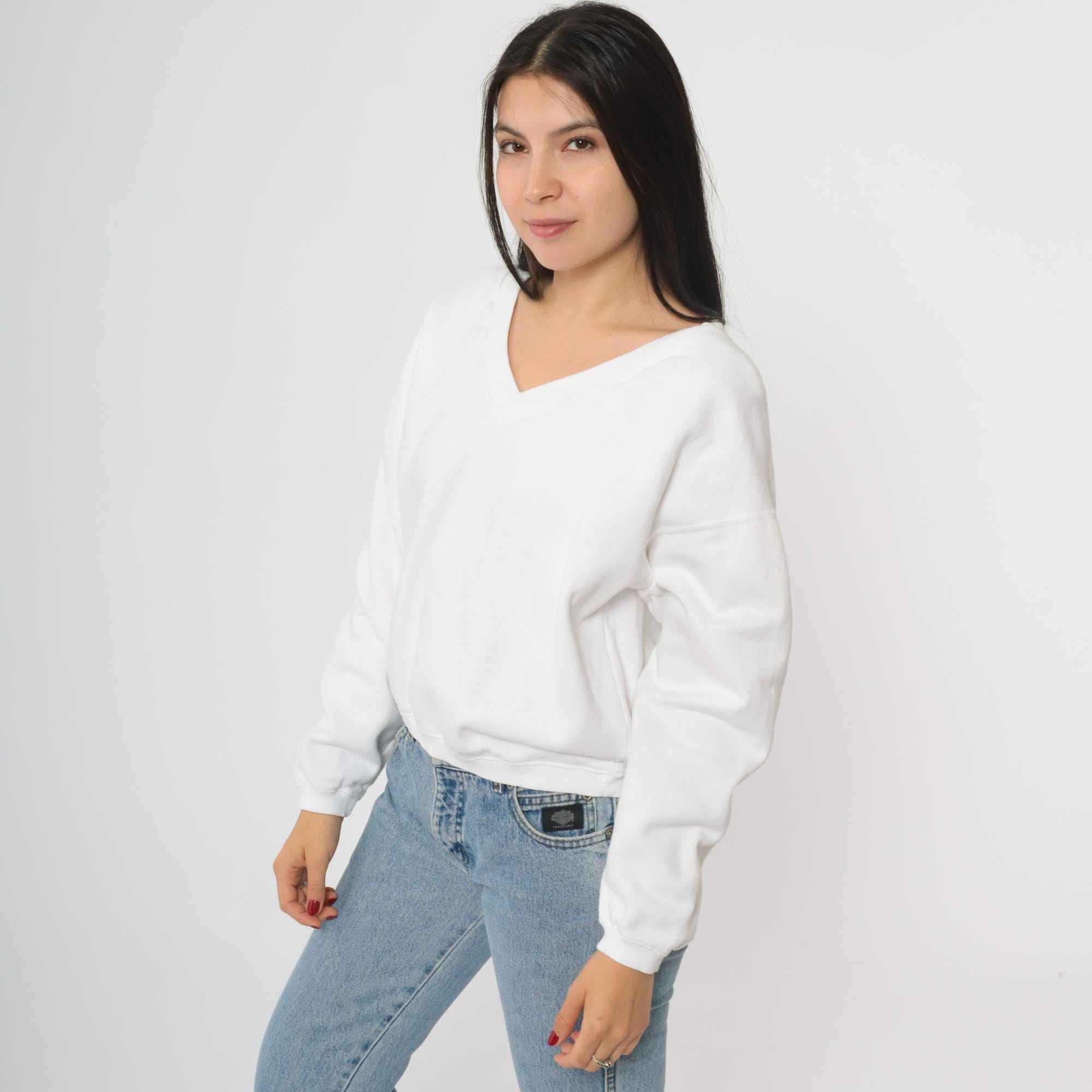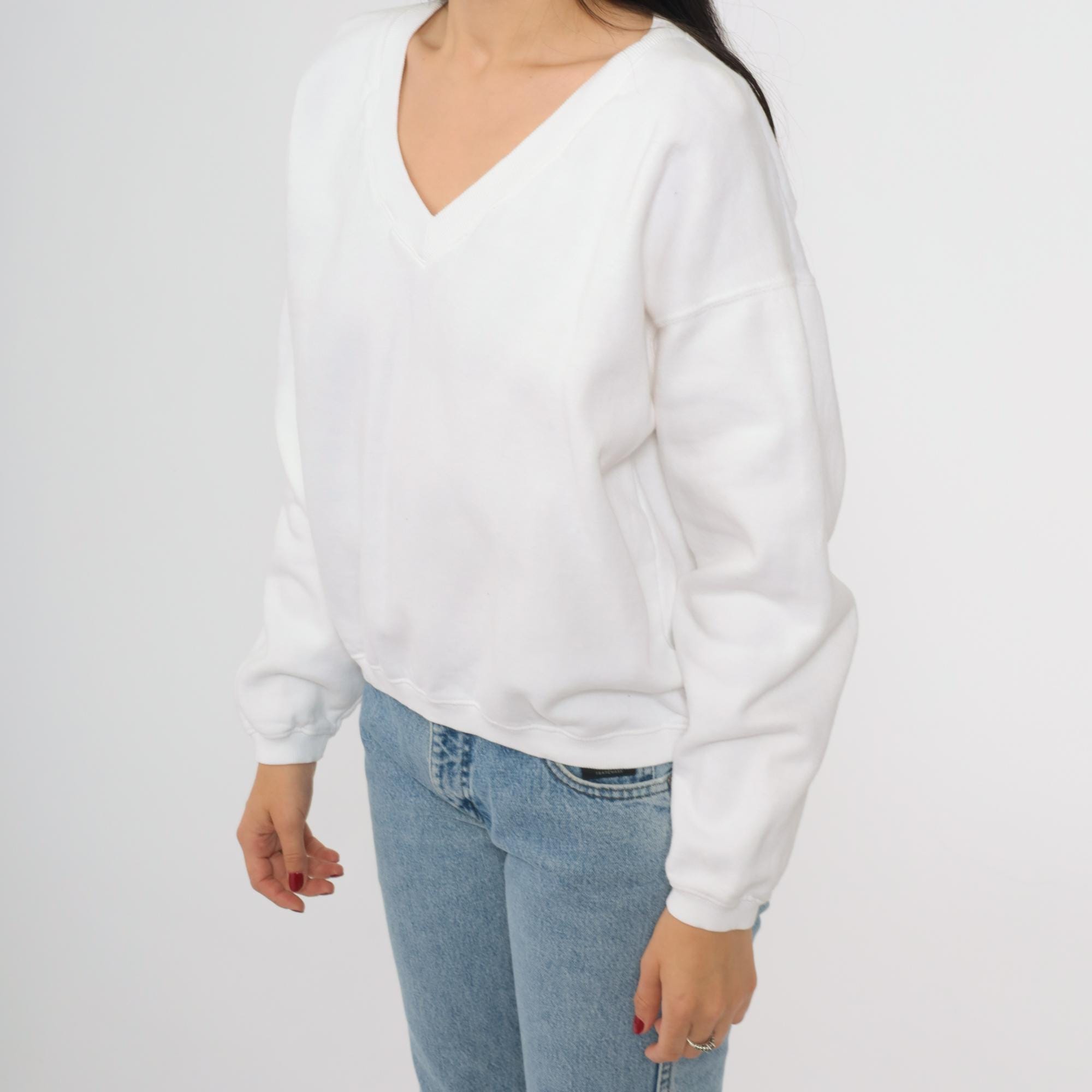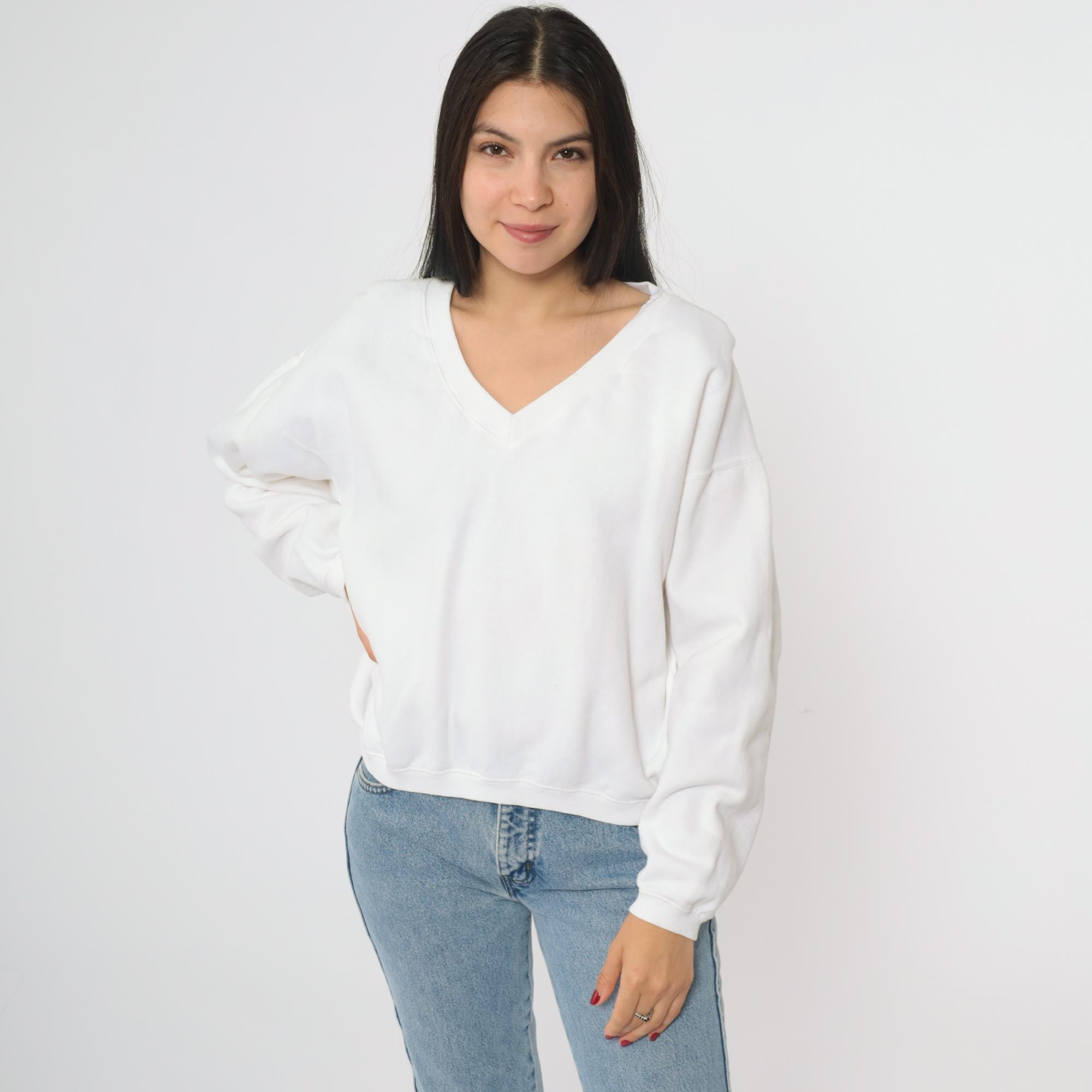 Vintage 90s white sweatshirt featuring a deep V neckline and slouchy drop shoulder fit. Made from 100% cotton with long sleeves, ribbed cuffs, and hem.