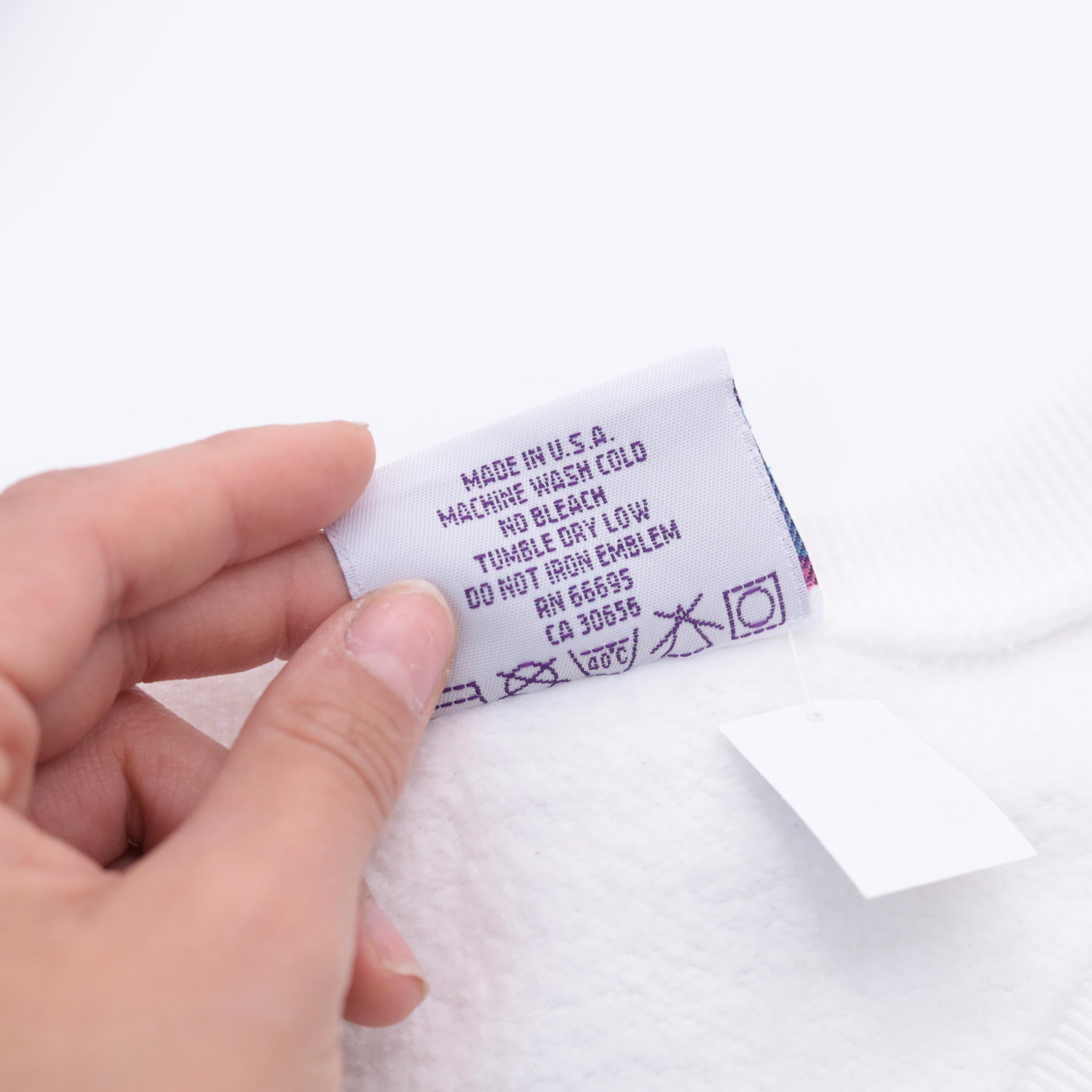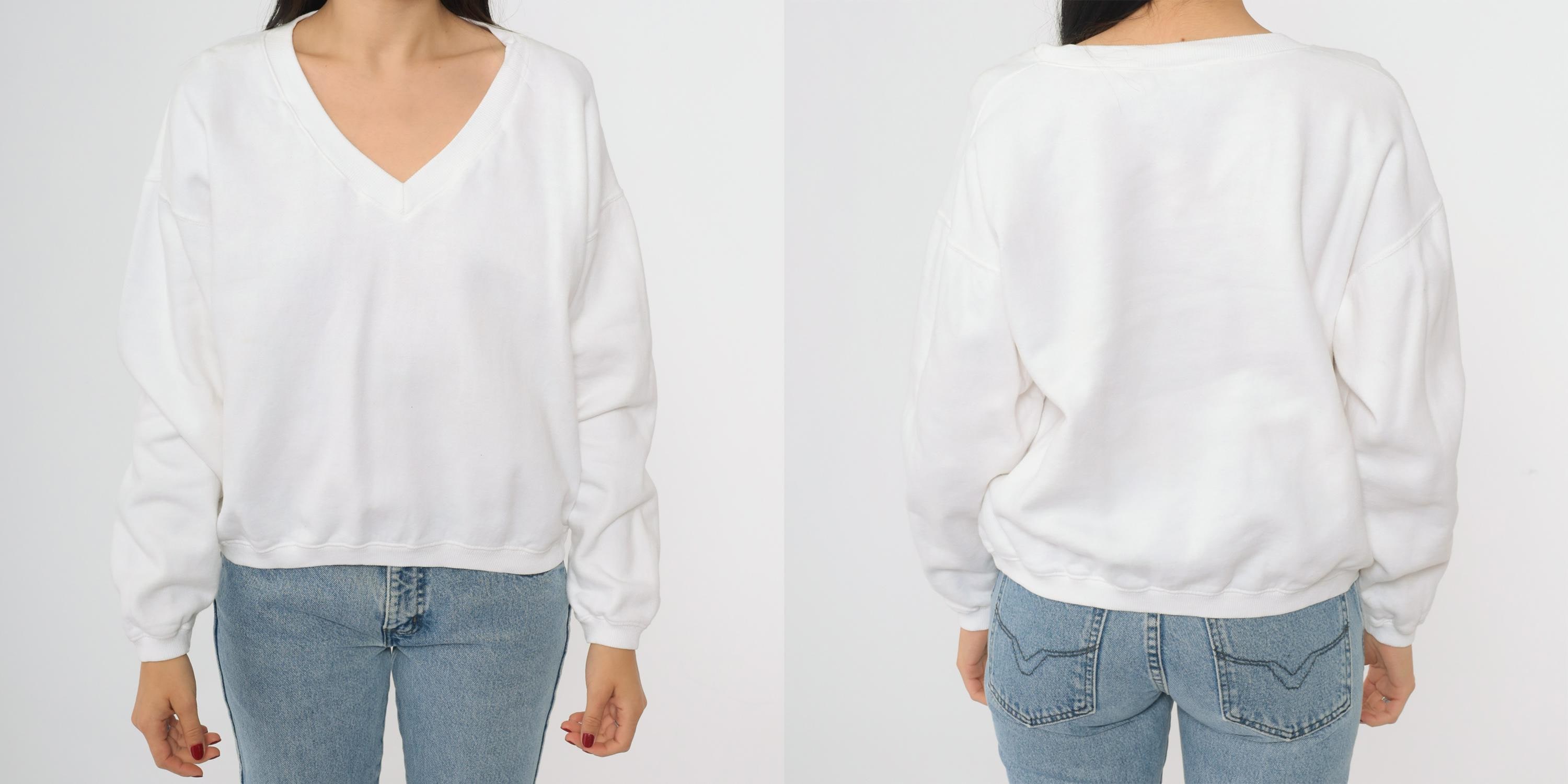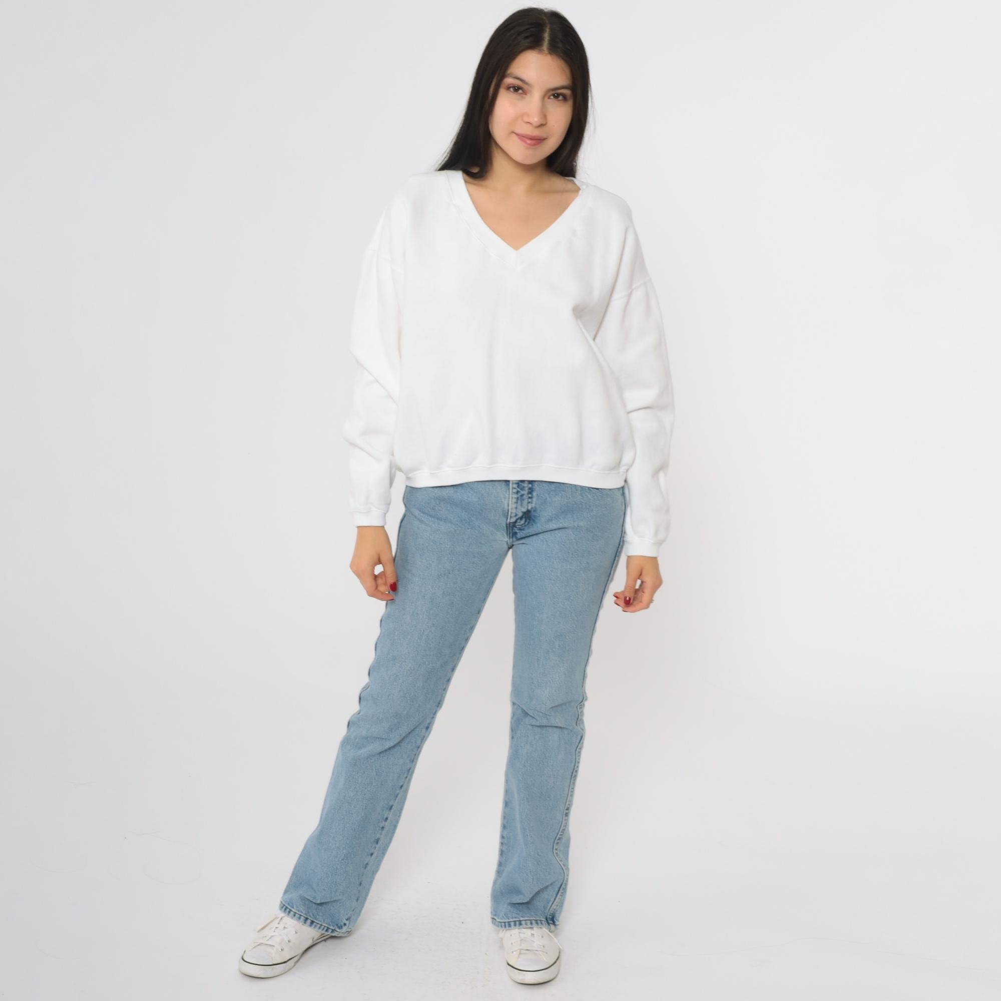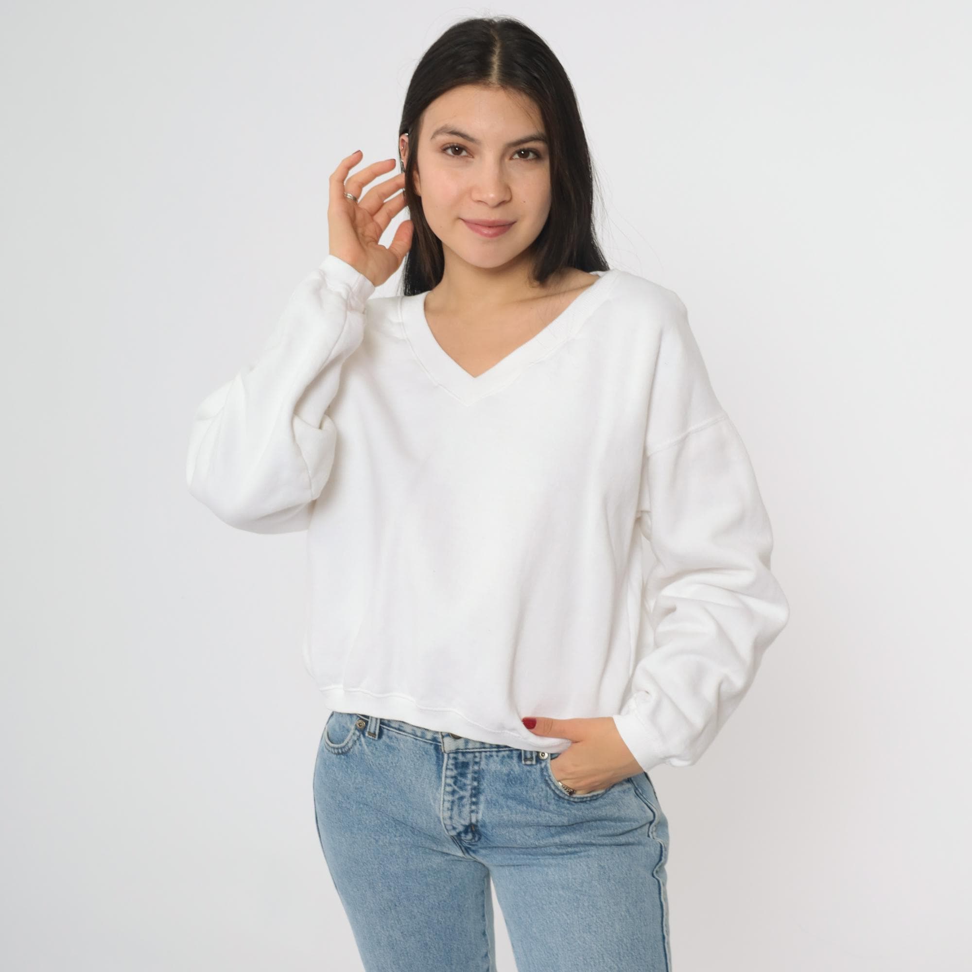 Vintage 90s white sweatshirt featuring a deep V neckline and slouchy drop shoulder fit. Made from 100% cotton with long sleeves, ribbed cuffs, and hem.
