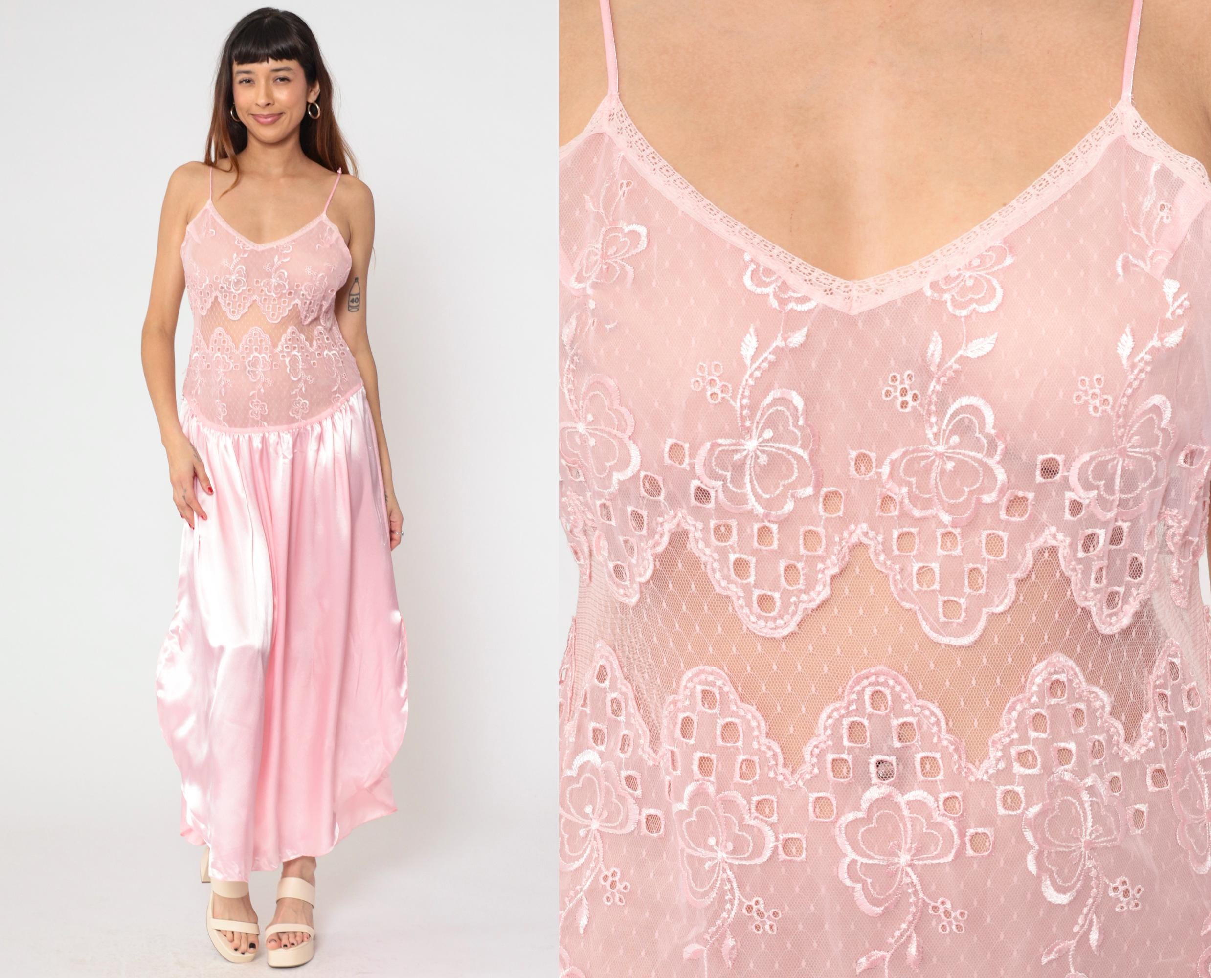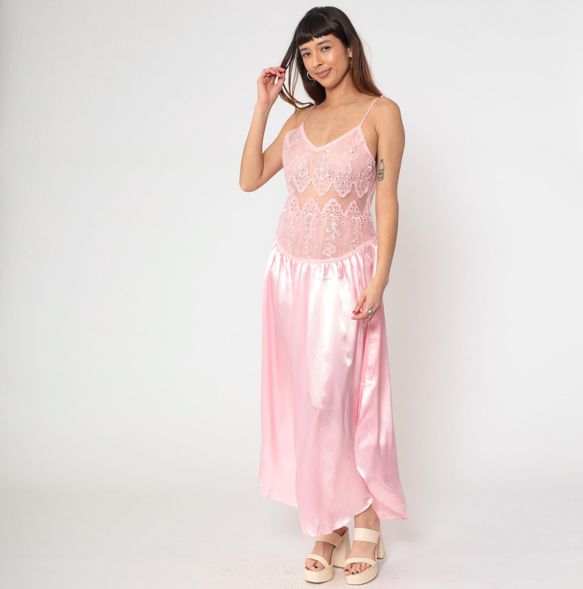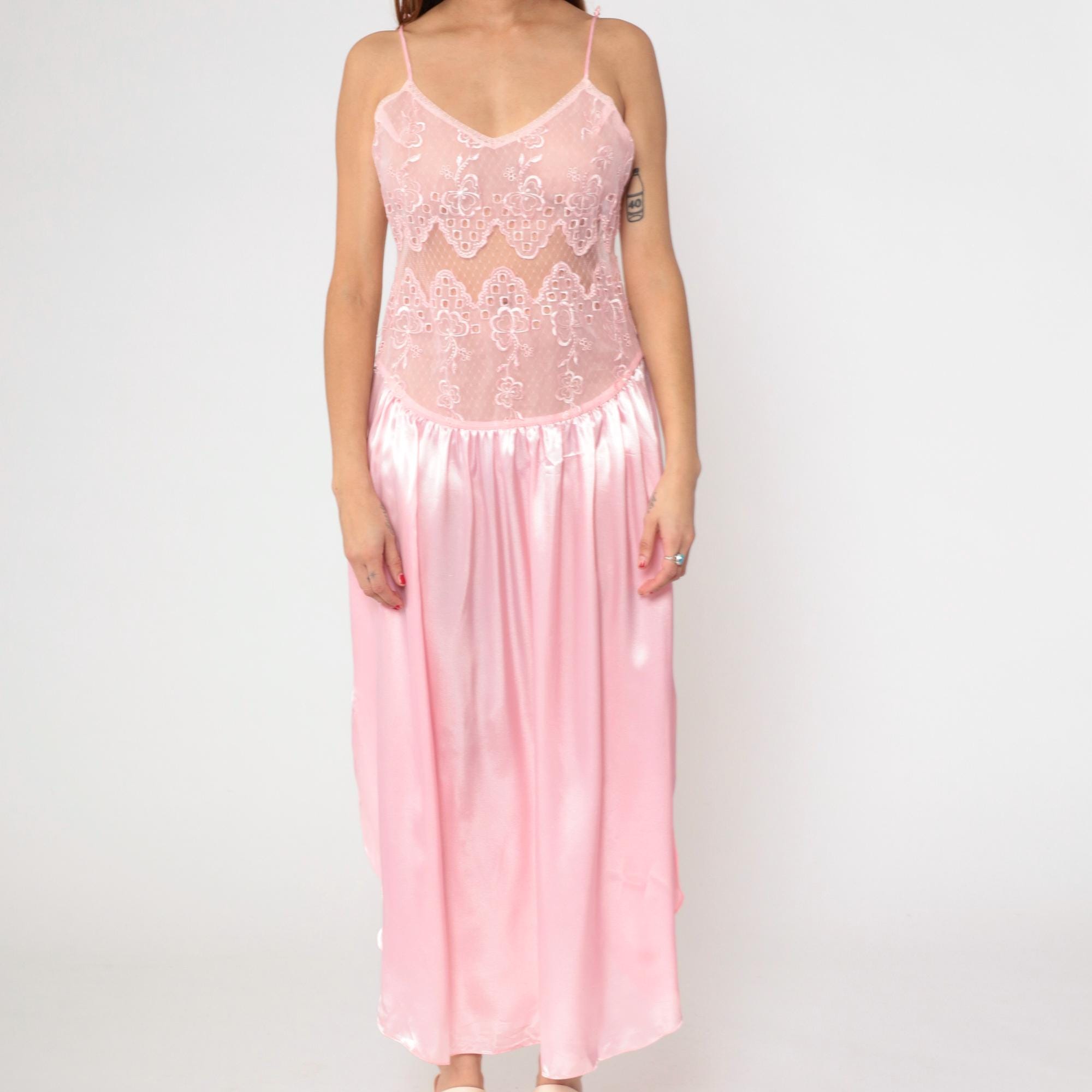 Vintage 1990s Gilligan O’Malley pink slip dress in polyester satin with sheer lace bodice. Features spaghetti straps, floral embroidery across the bodice, and a fitted top with flowing maxi-length skirt.