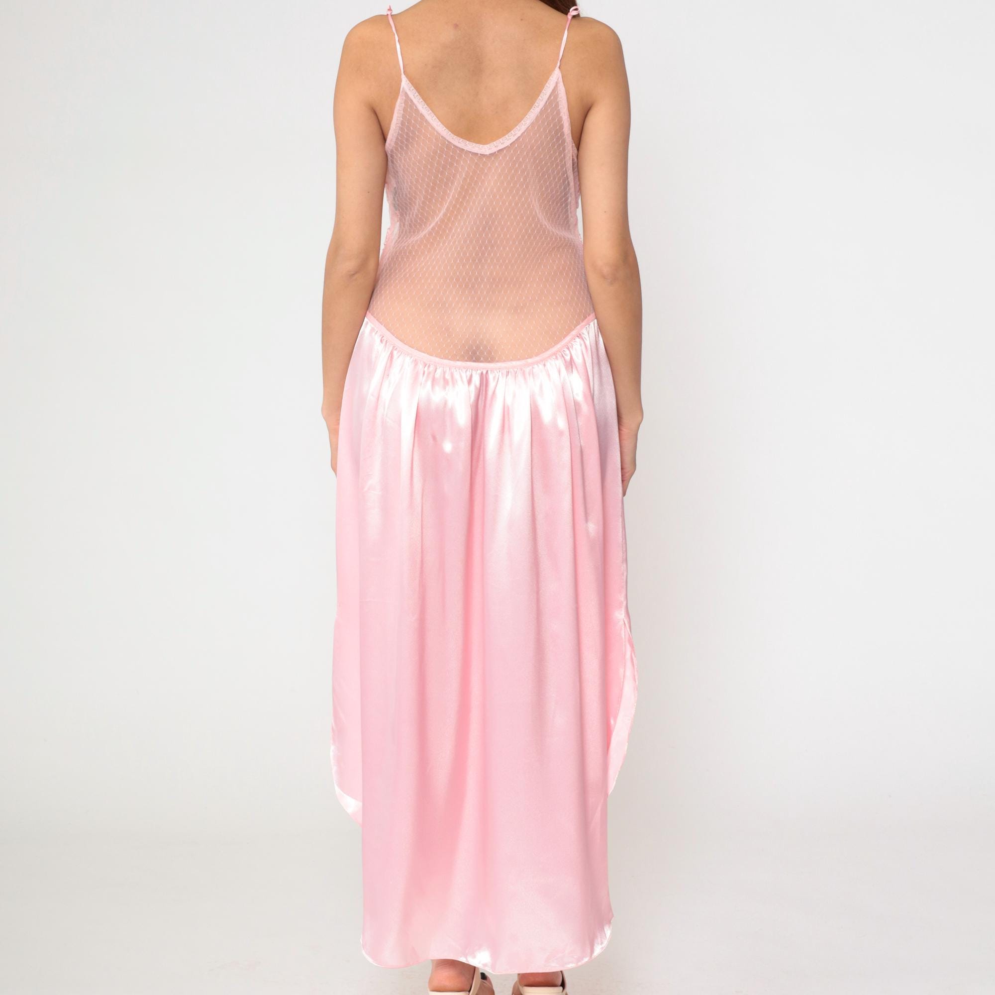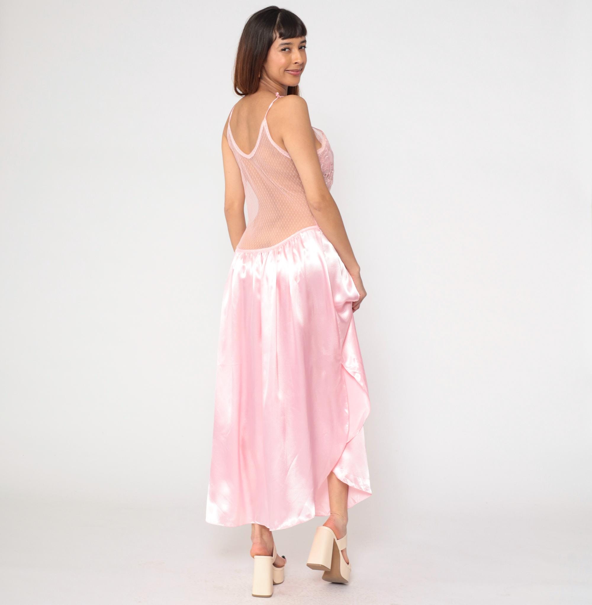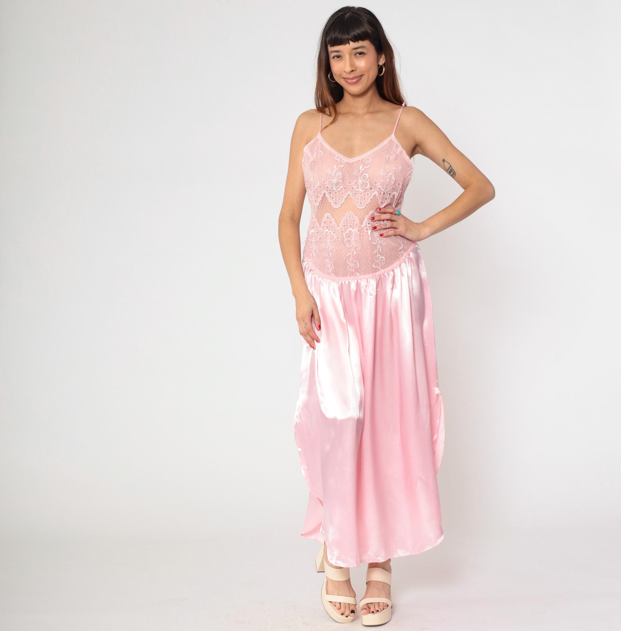 Vintage 1990s Gilligan O’Malley pink slip dress in polyester satin with sheer lace bodice. Features spaghetti straps, floral embroidery across the bodice, and a fitted top with flowing maxi-length skirt.
