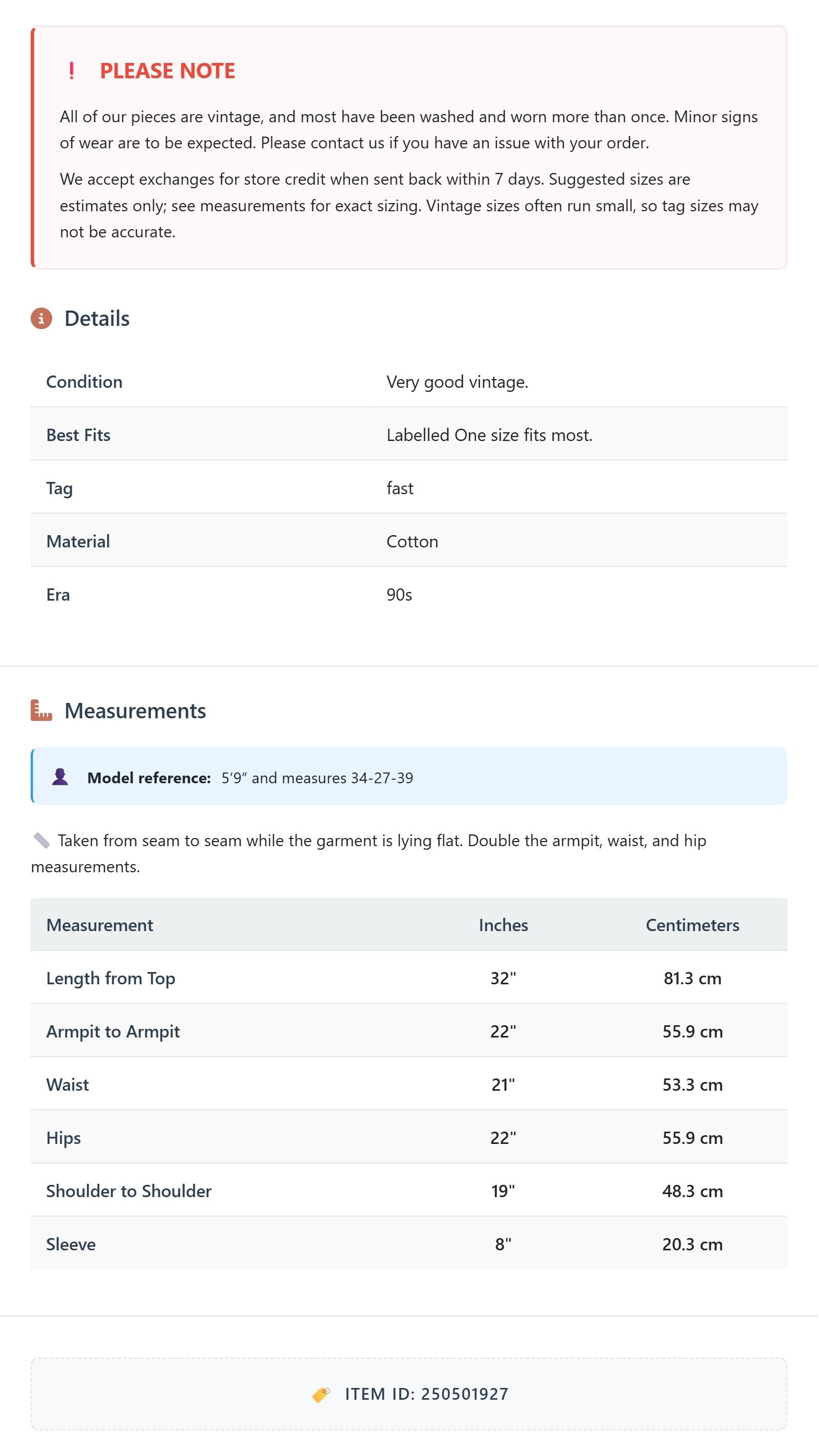 All of our pieces are vintage, and most have been washed and worn more than once. Minor signs of wear are to be expected. Please contact us if you have an issue with your order. We accept exchanges for store credit when sent back within 7 days.