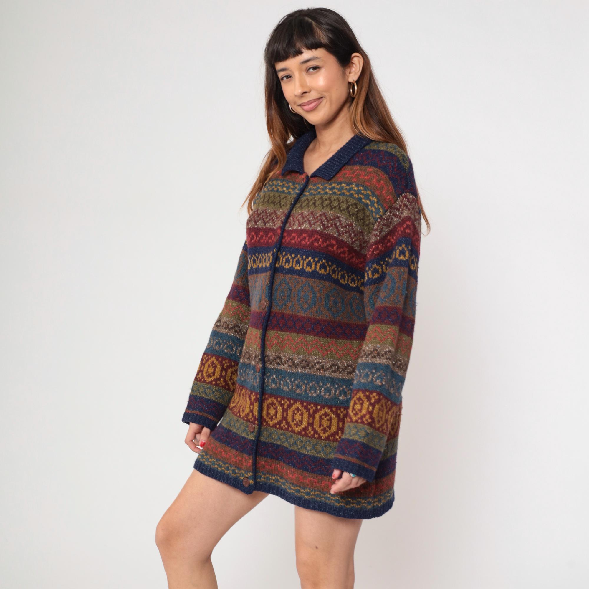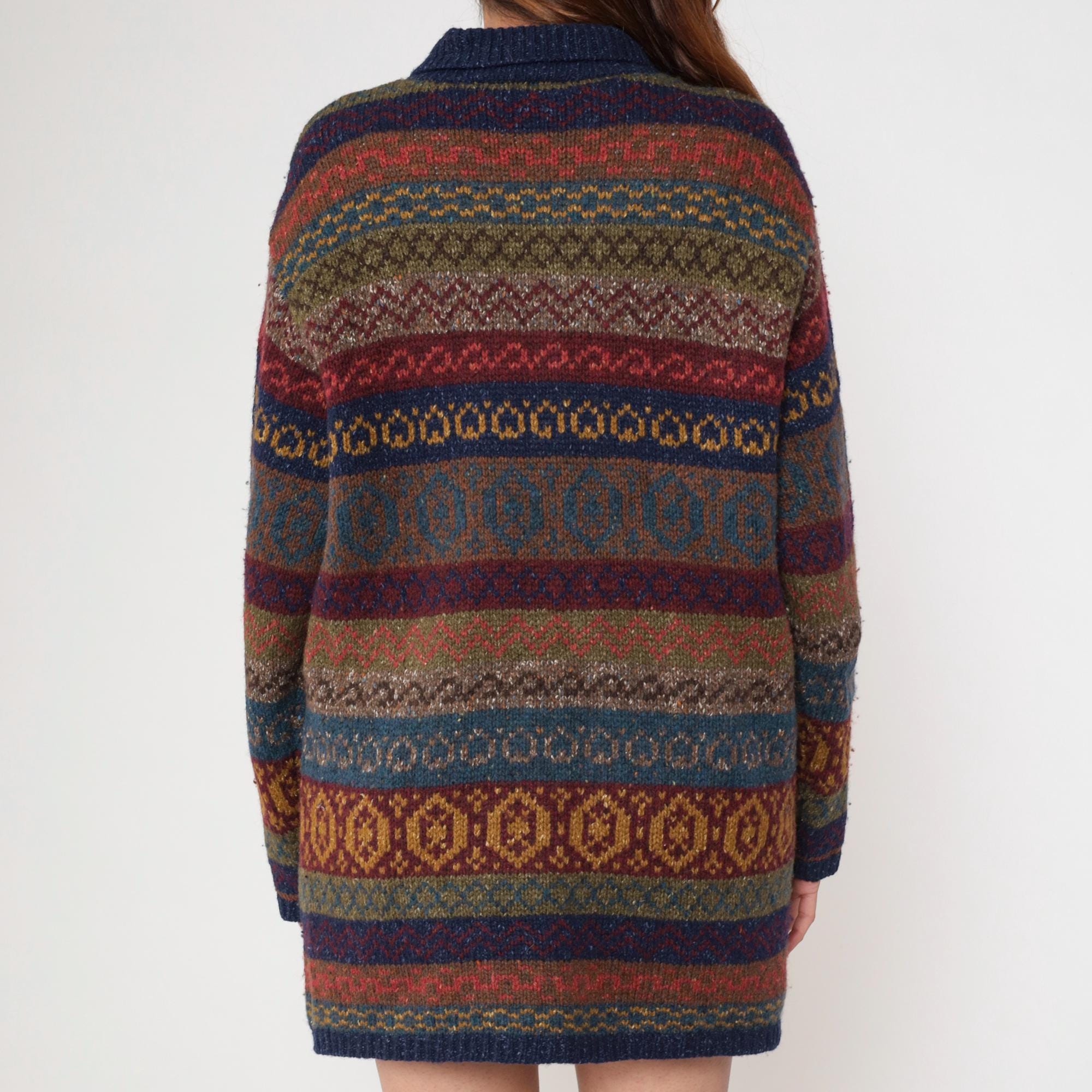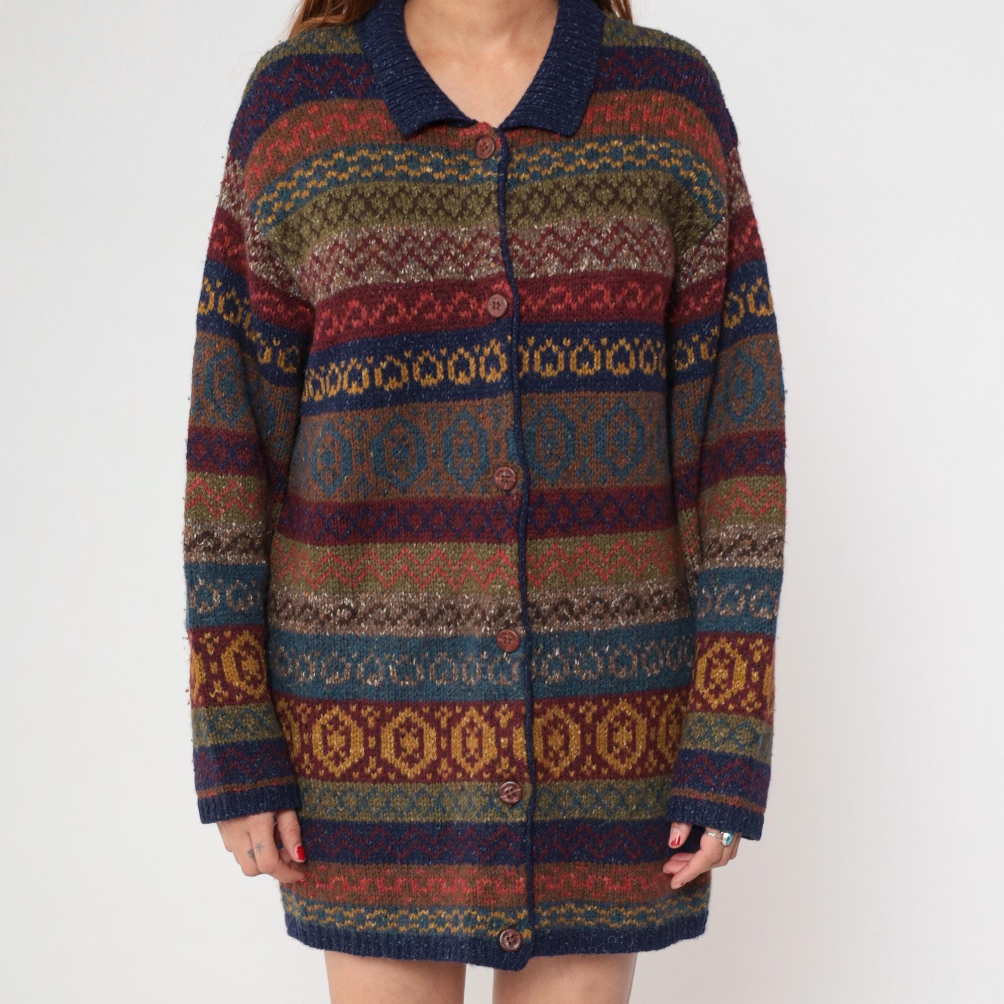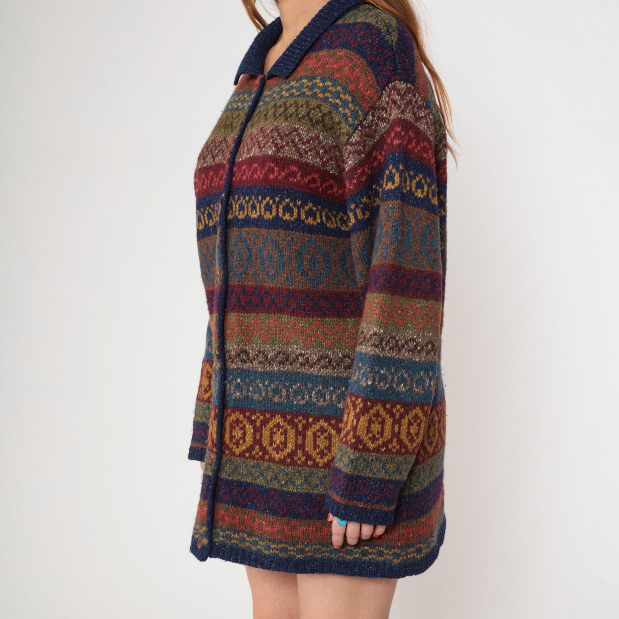 Vintage 90s Robert Scott wool and silk blend cardigan sweater featuring a multicolor abstract Fair Isle knit pattern in rich shades of navy, burgundy, olive, and mustard. Designed with a button front closure, collared neckline, and long sleeves.