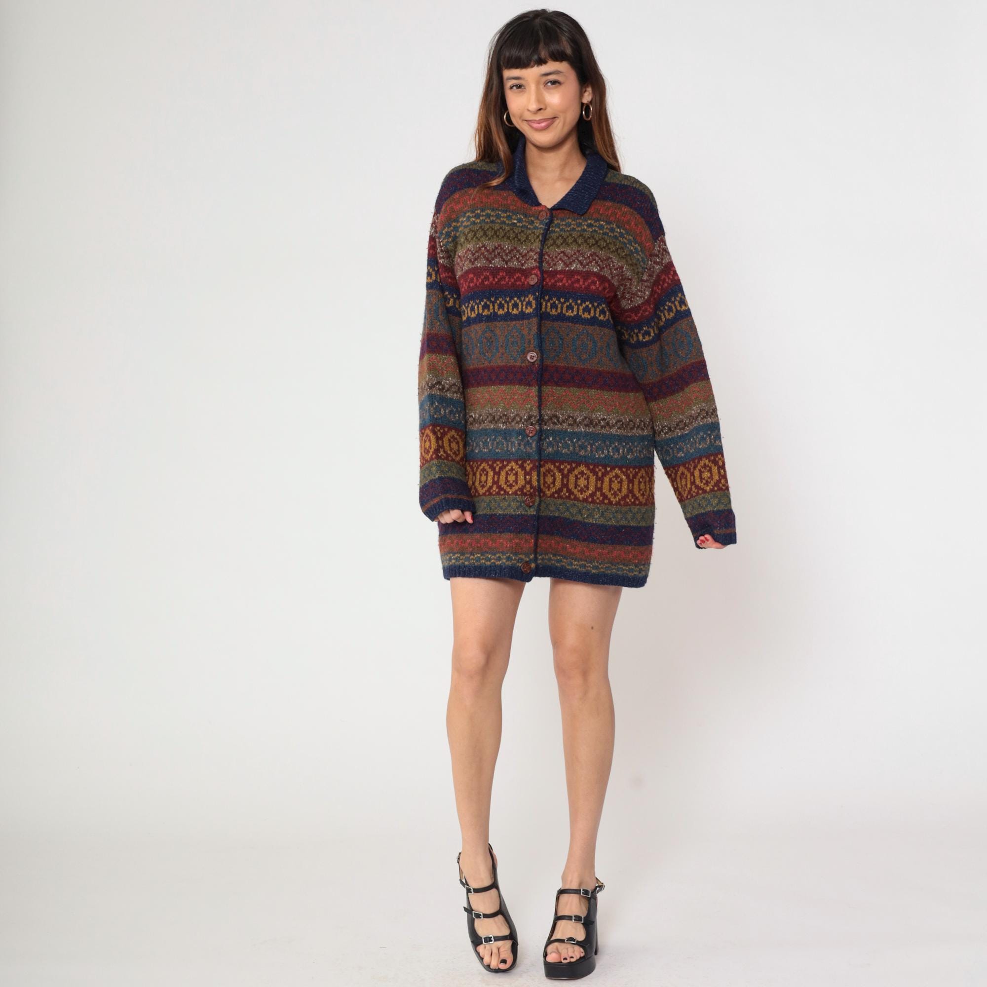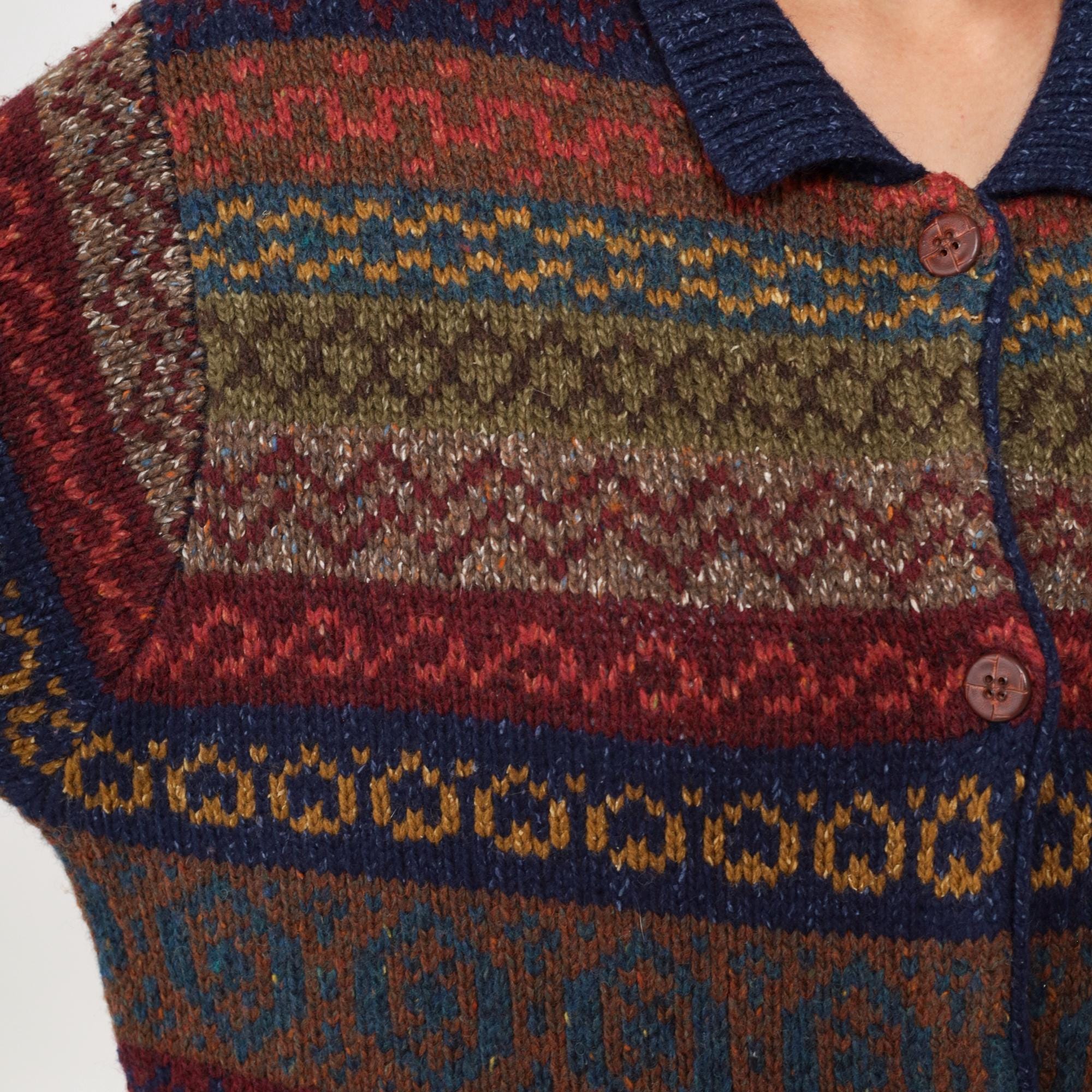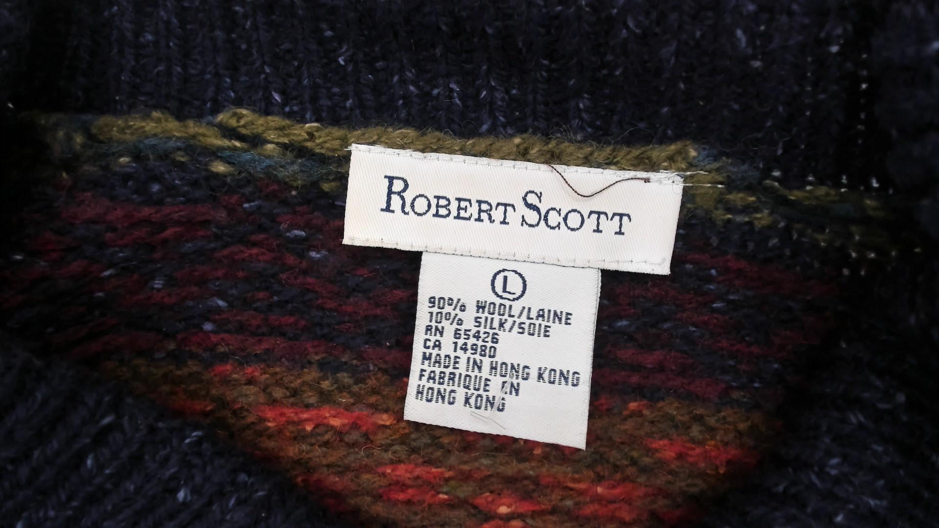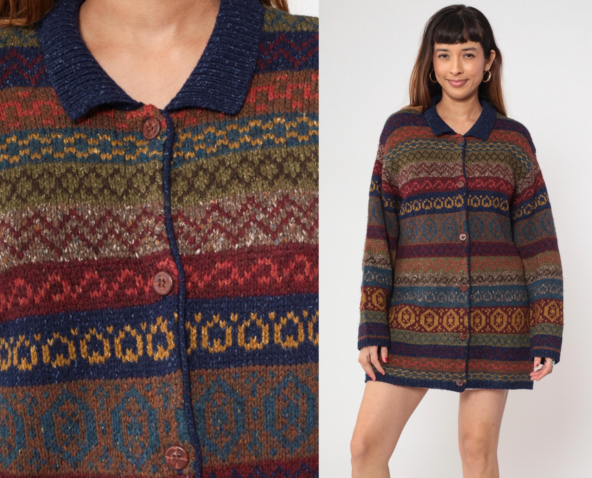 Vintage 90s Robert Scott wool and silk blend cardigan sweater featuring a multicolor abstract Fair Isle knit pattern in rich shades of navy, burgundy, olive, and mustard. Designed with a button front closure, collared neckline, and long sleeves.